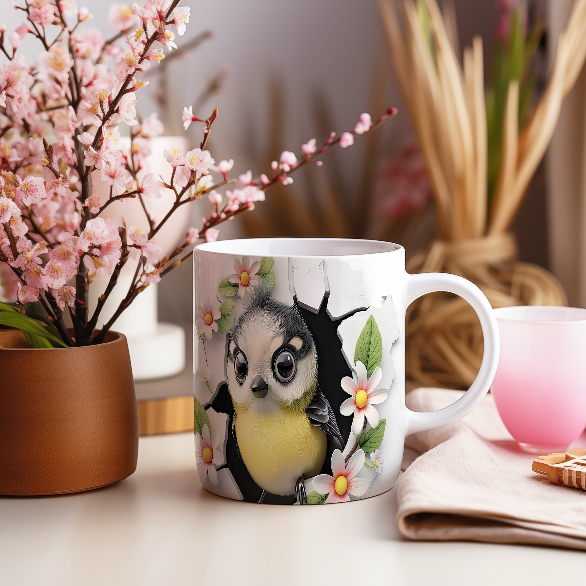 Hrnek s ptáčkem a květinami – jemnými detaily