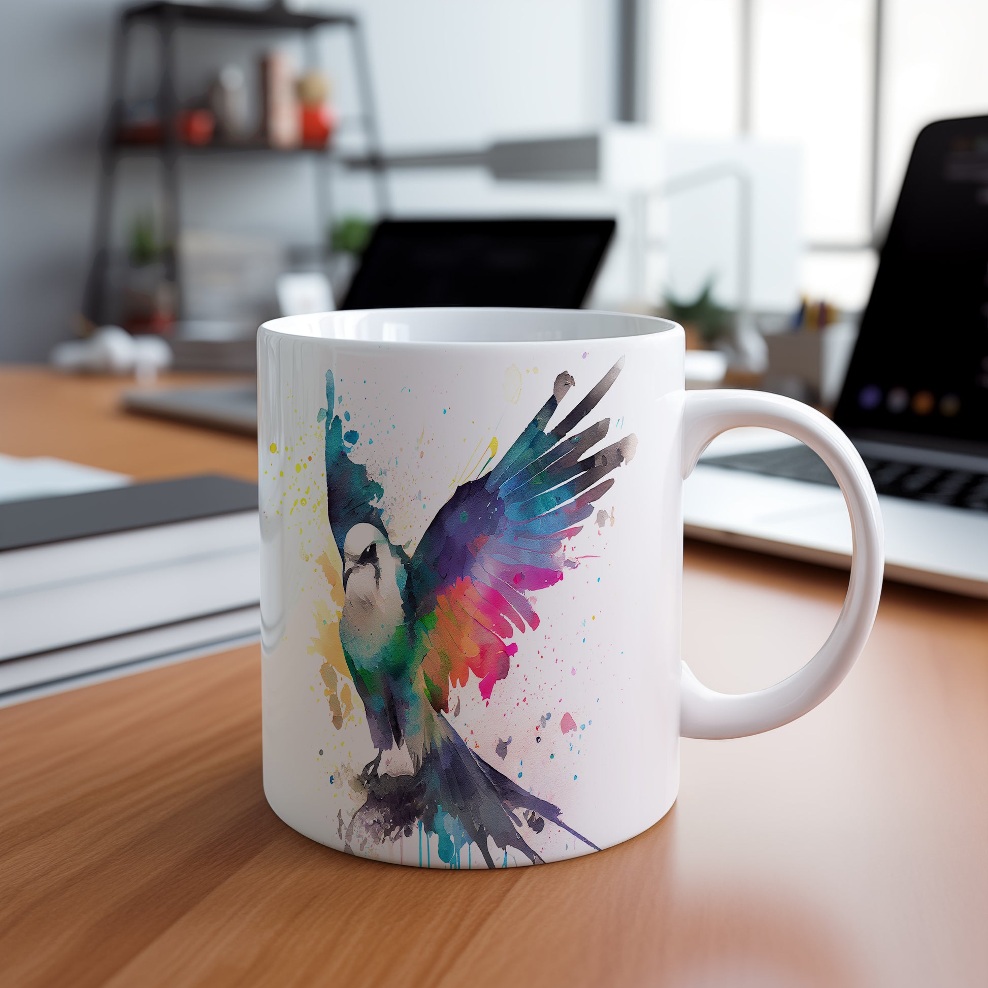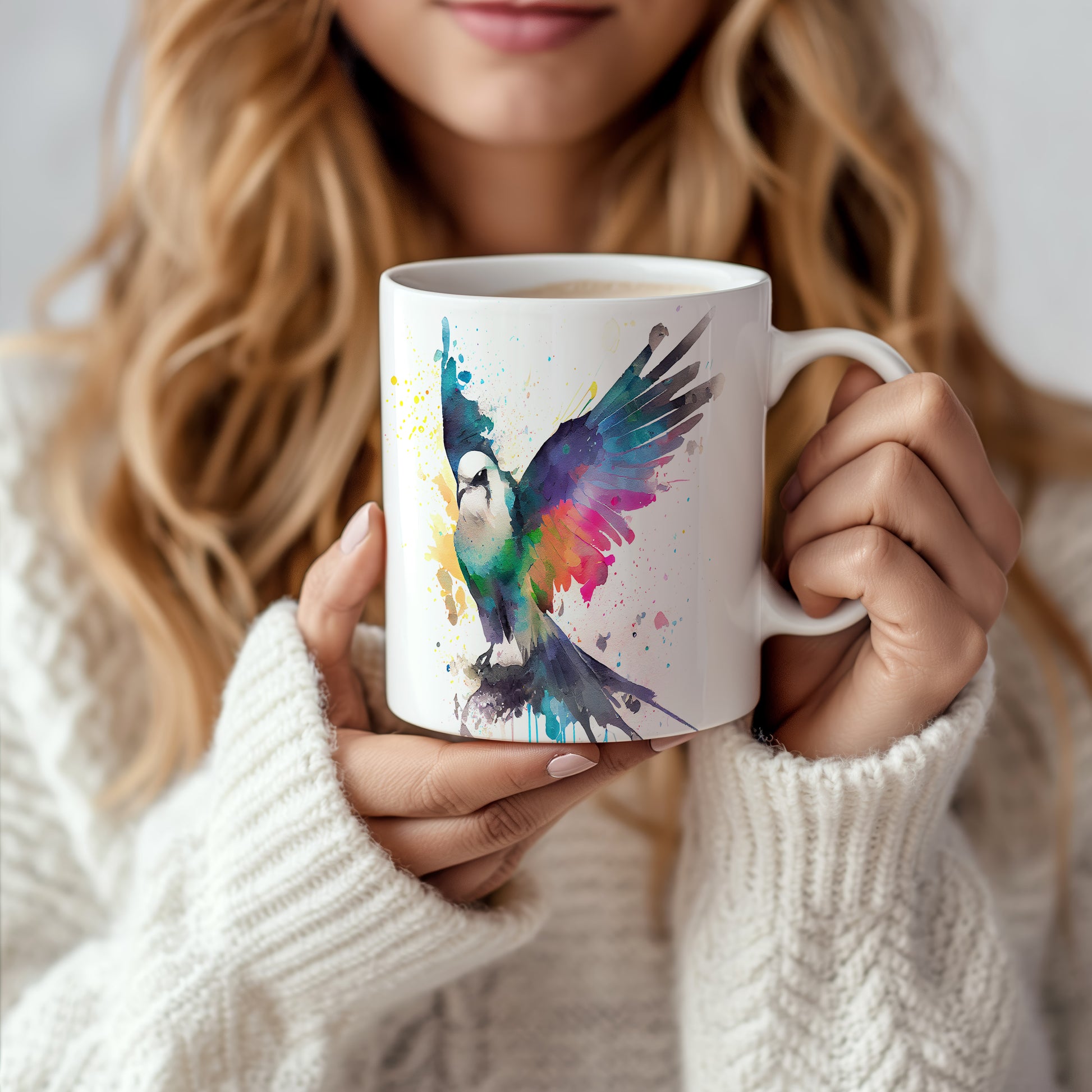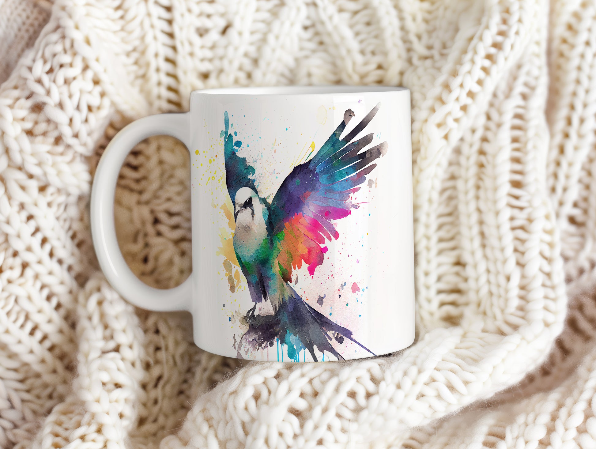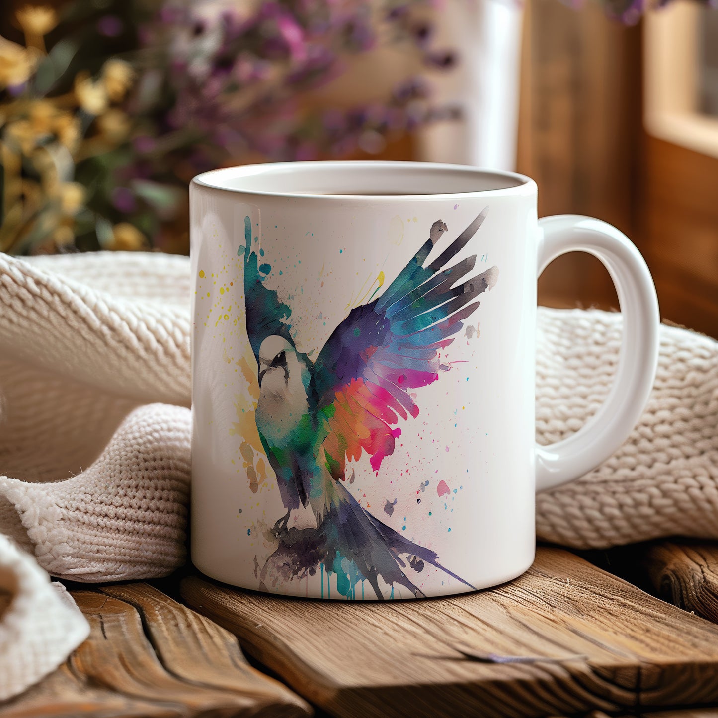 Hrnek s ptákem v akvarelovém stylu – akvarelovým motivem
