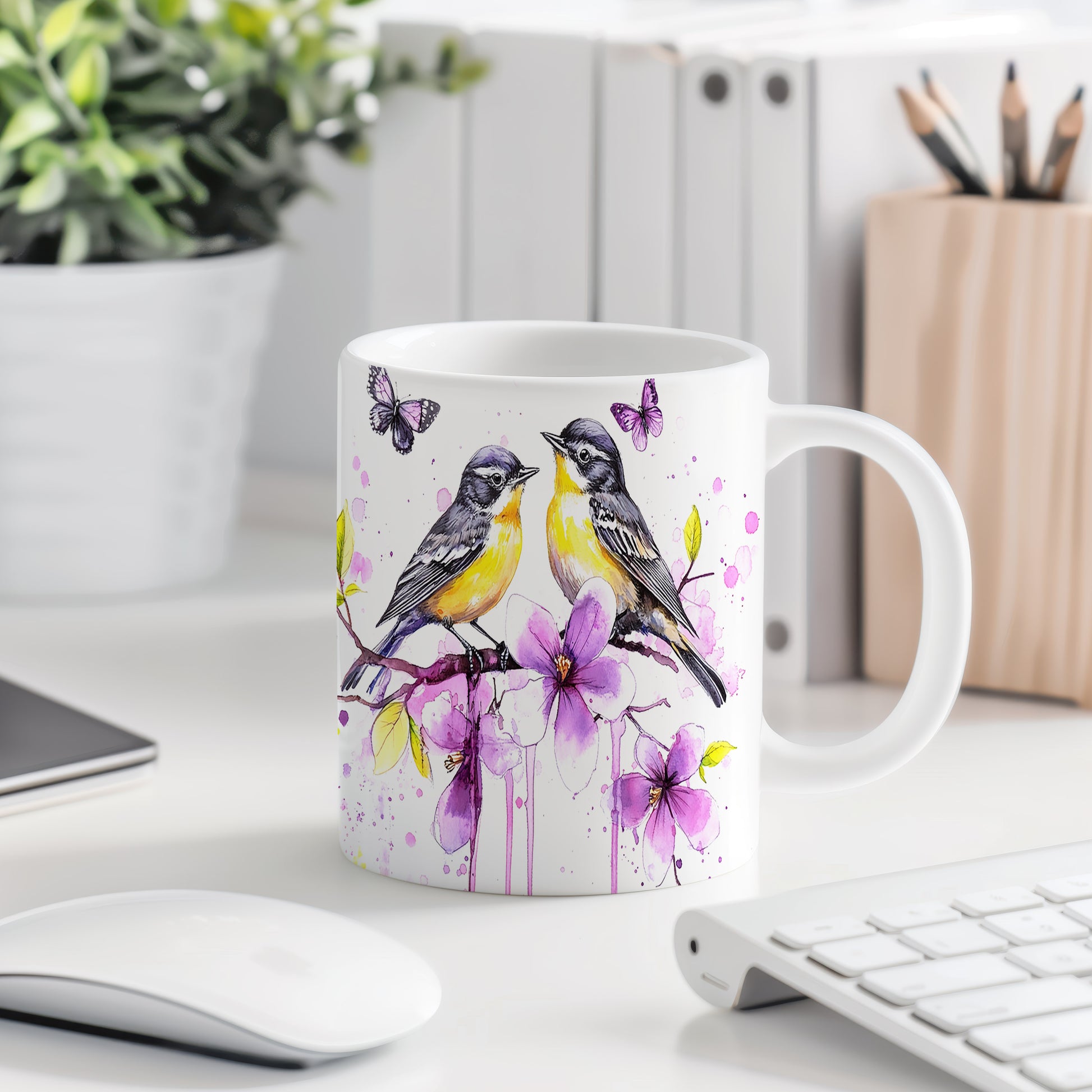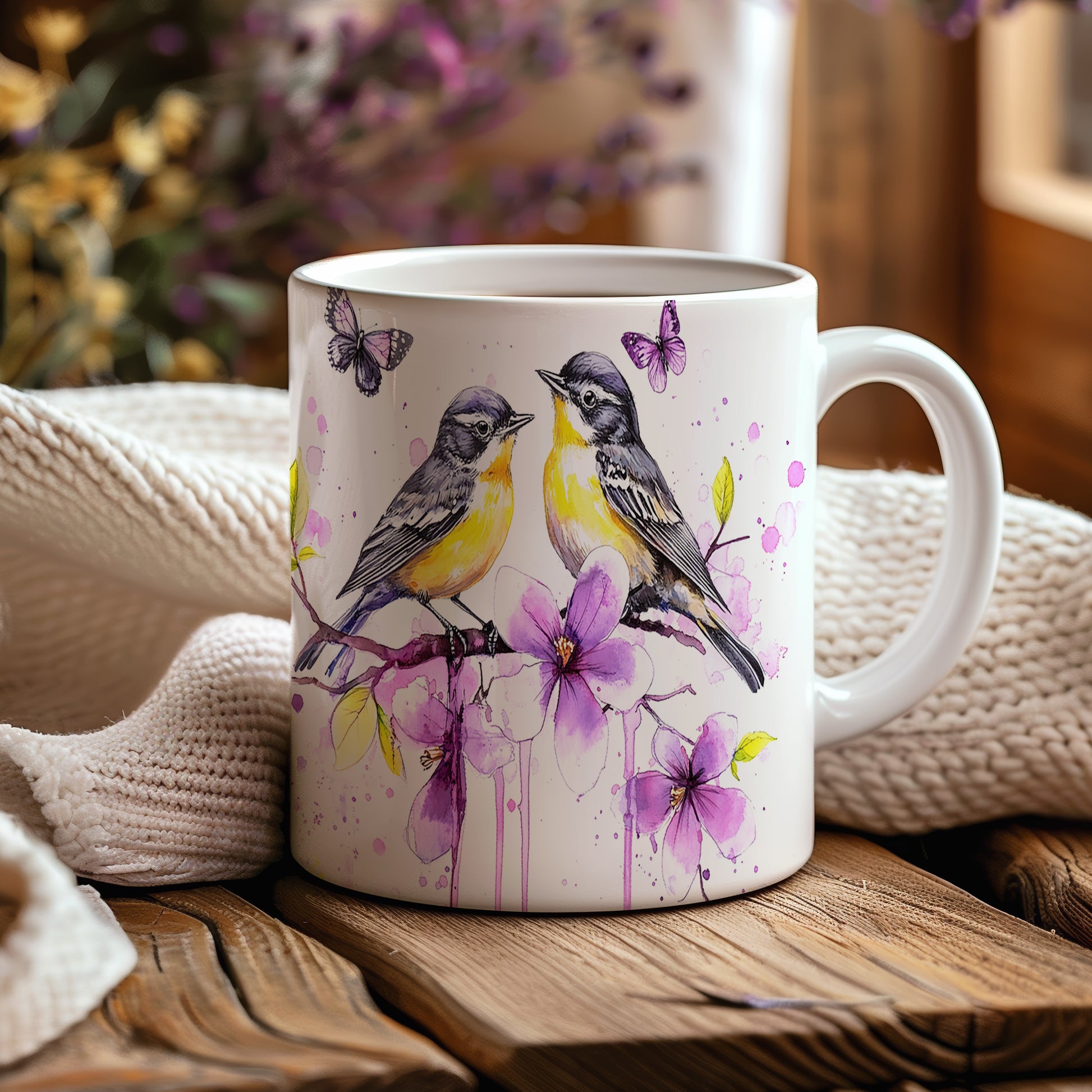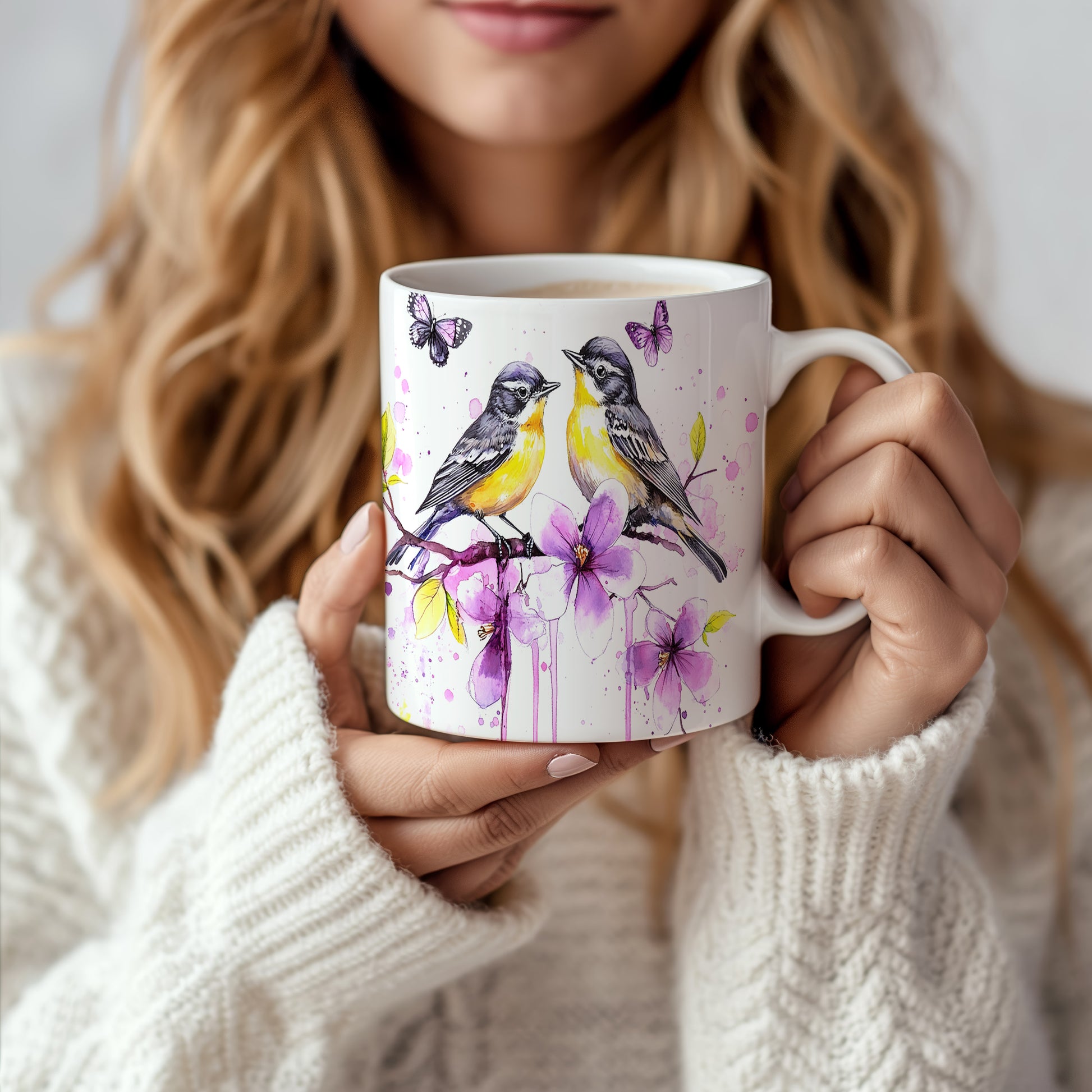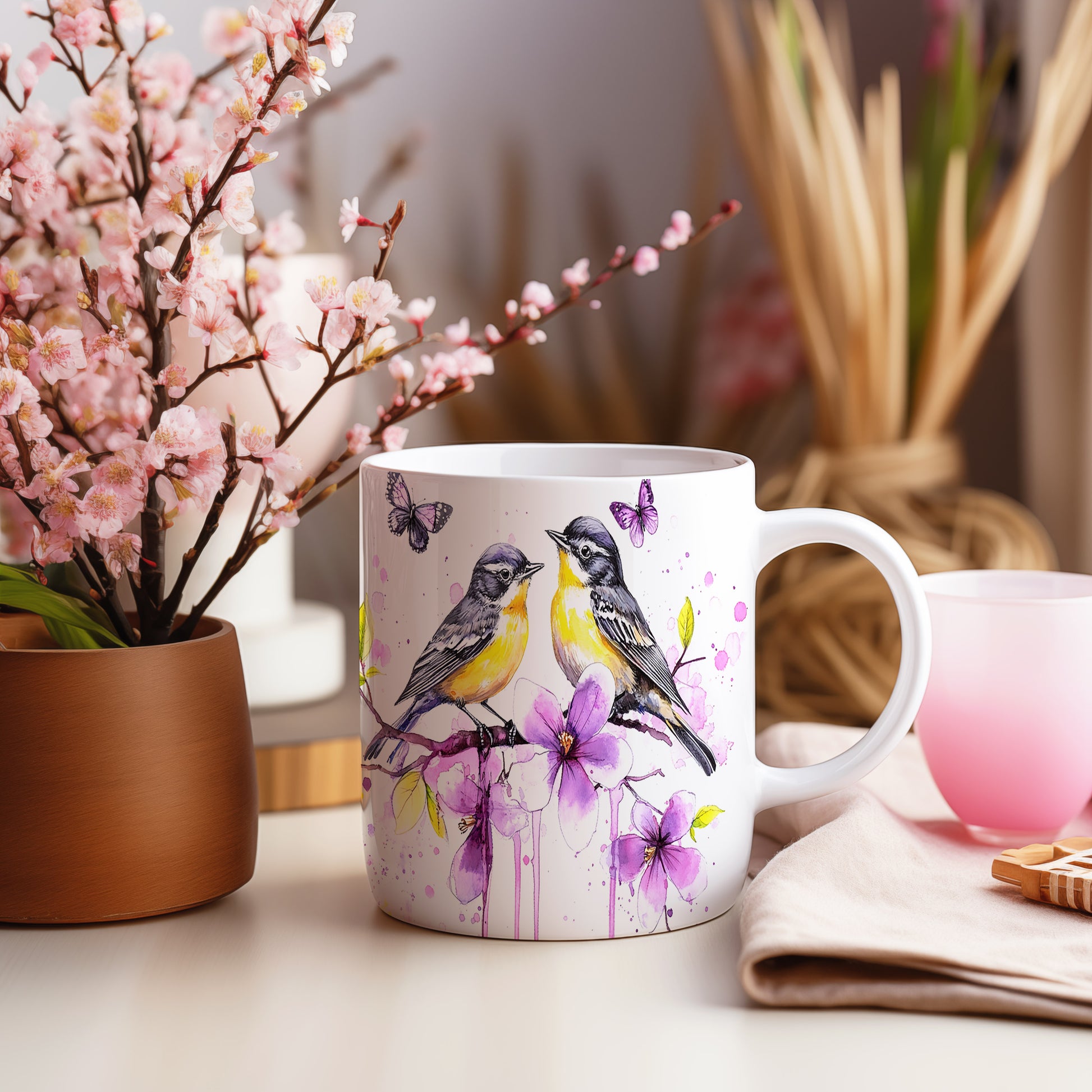 Hrnek s překrásnými ilustracemi ptáků na větvi obklopených květinami. Tento stylový hrnek je ideální pro milovníky přírody a skvělý tip na dárek pro každou příležitost. Materiál: keramika. Objem: 330 ml. Vhodné do myčky i mikrovlnky. Používání tohoto hrnku přináší radost z každého doušku.