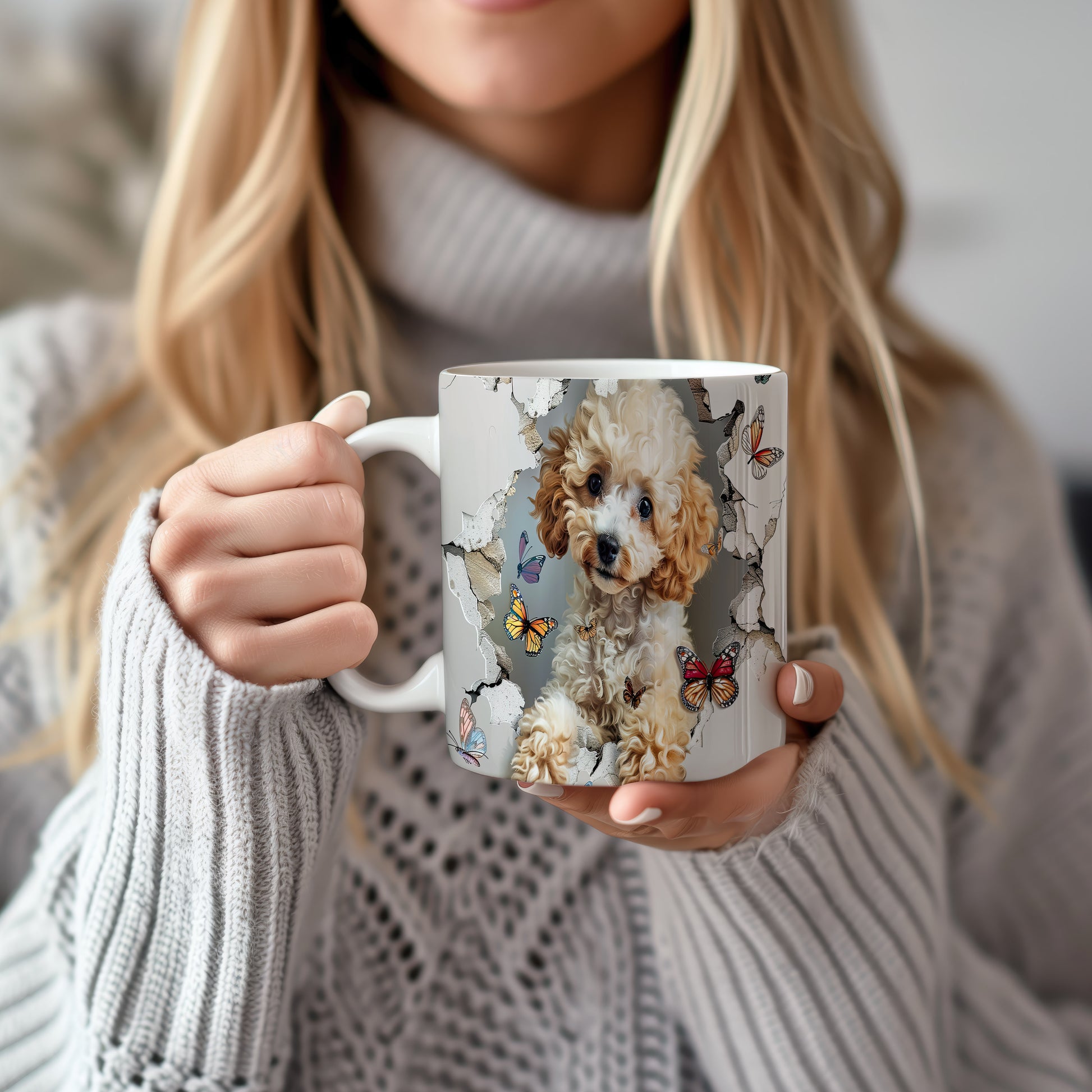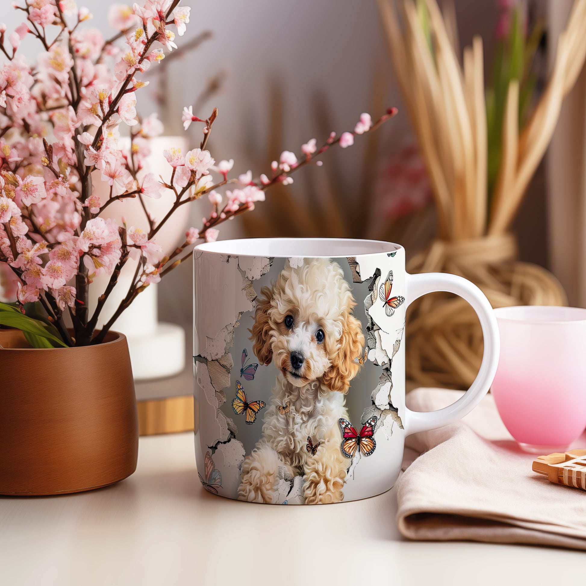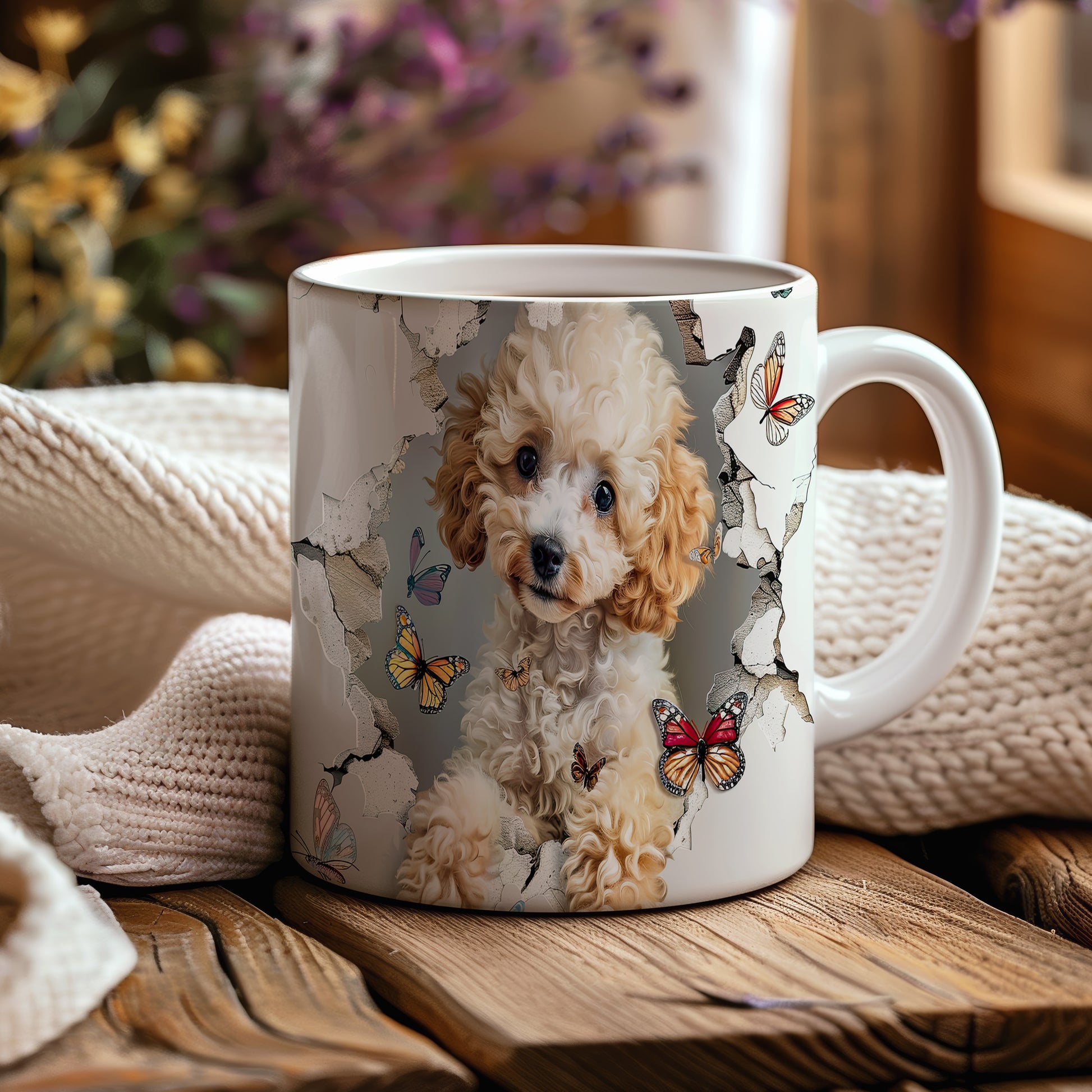 Na hrnku je zobrazen roztomilý pes s kudrnatou srstí, obklopený barevnými motýly. Tento hrnek je ideální pro milovníky zvířat a skvělým dárkem pro přátele či rodinu. Materiál: keramika. Objem: 330 ml. Vhodné do myčky i mikrovlnky. Užívejte si svůj oblíbený nápoj s tímto veselým motivem.