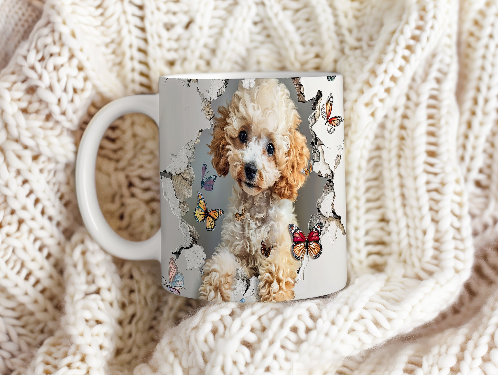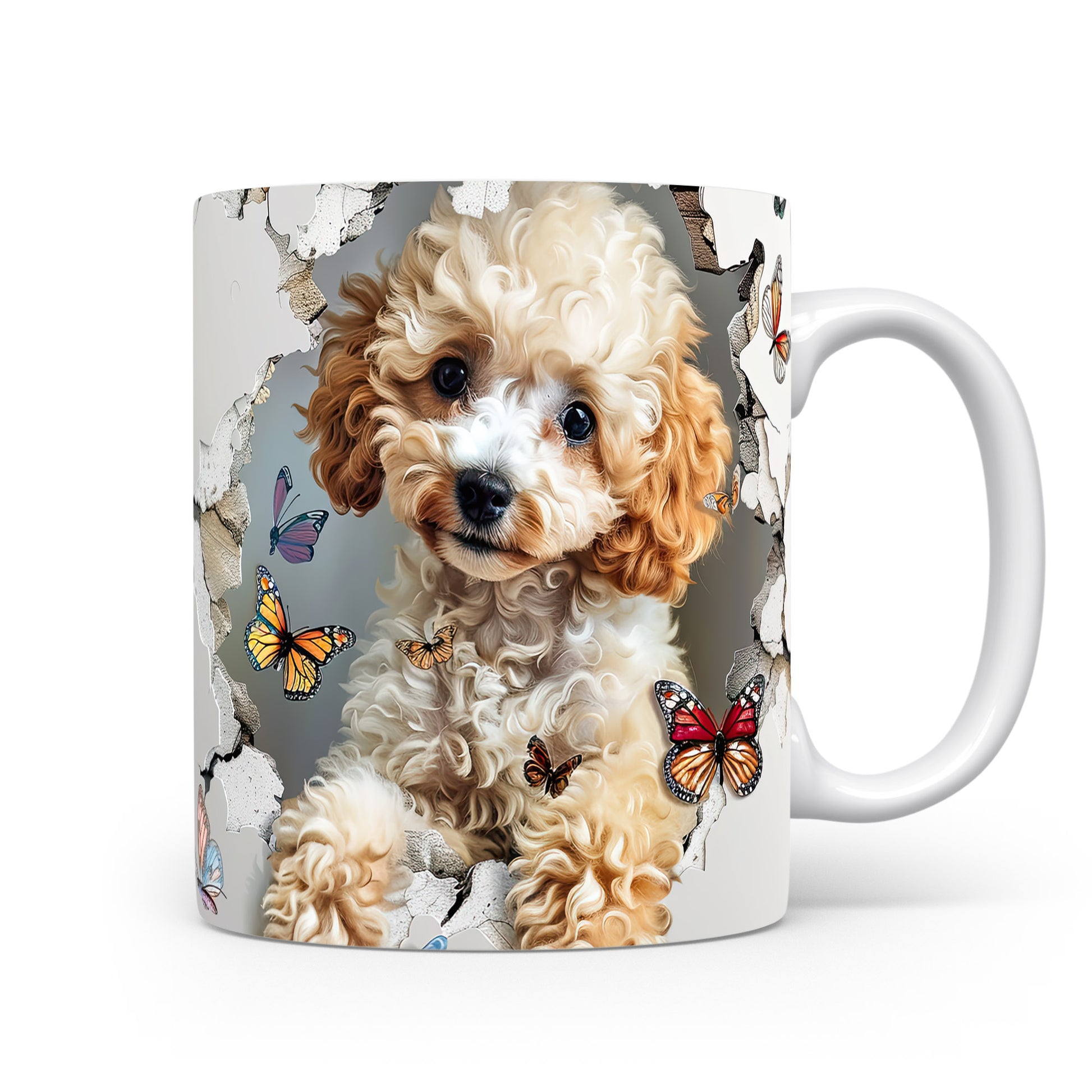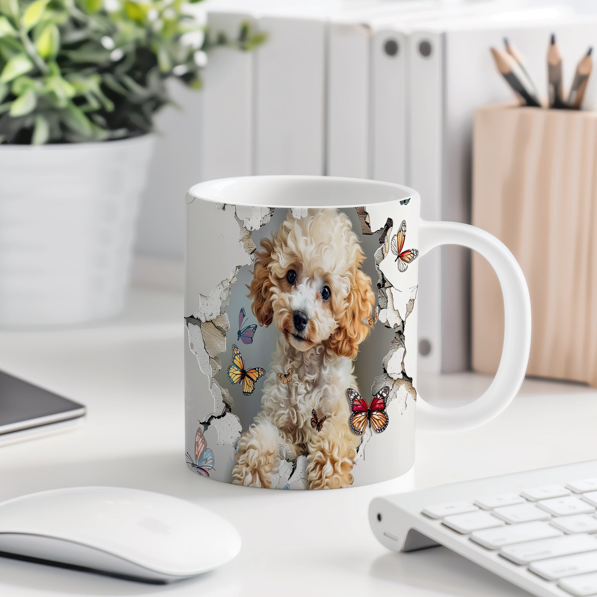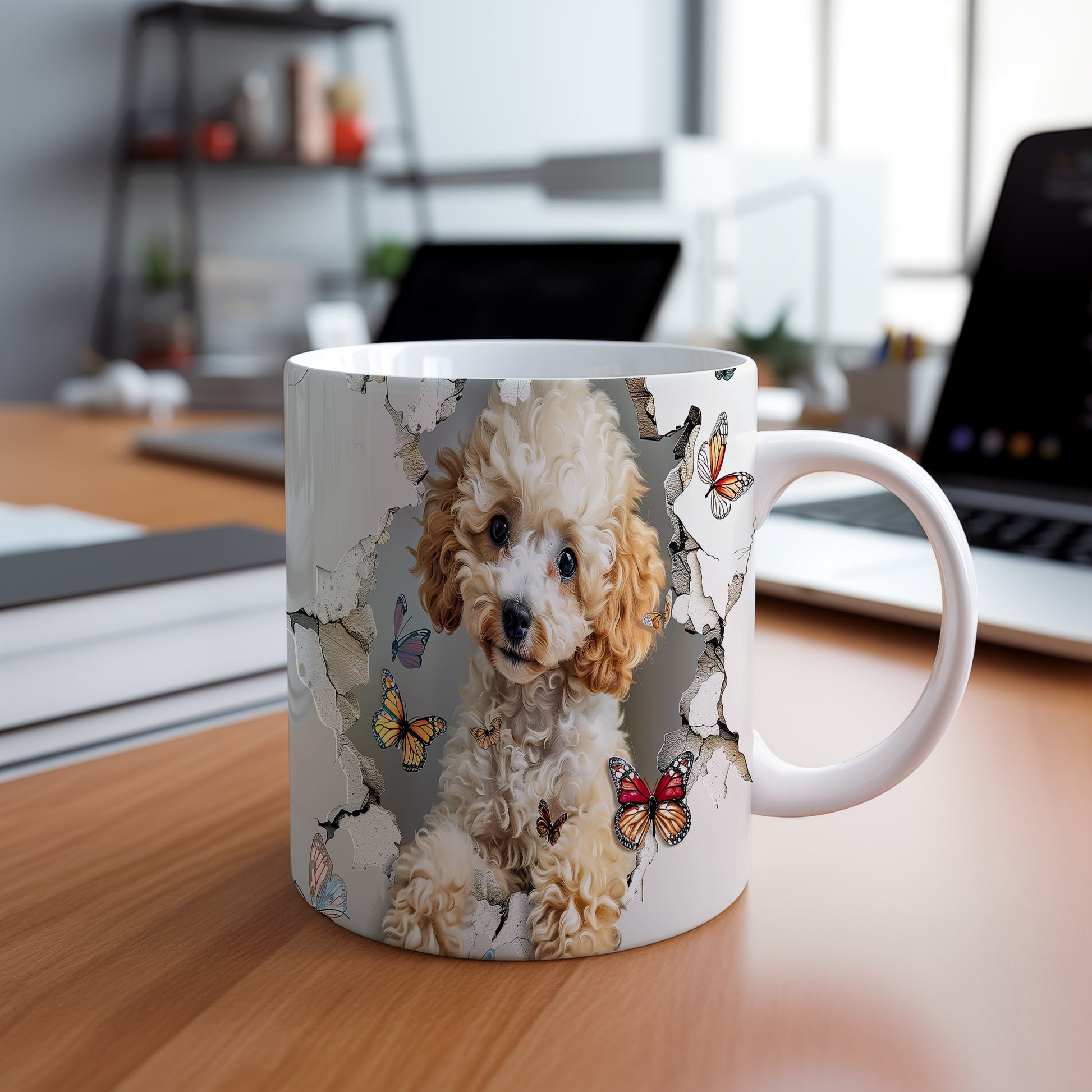 Na hrnku je zobrazen roztomilý pes s kudrnatou srstí, obklopený barevnými motýly. Tento hrnek je ideální pro milovníky zvířat a skvělým dárkem pro přátele či rodinu. Materiál: keramika. Objem: 330 ml. Vhodné do myčky i mikrovlnky. Užívejte si svůj oblíbený nápoj s tímto veselým motivem.