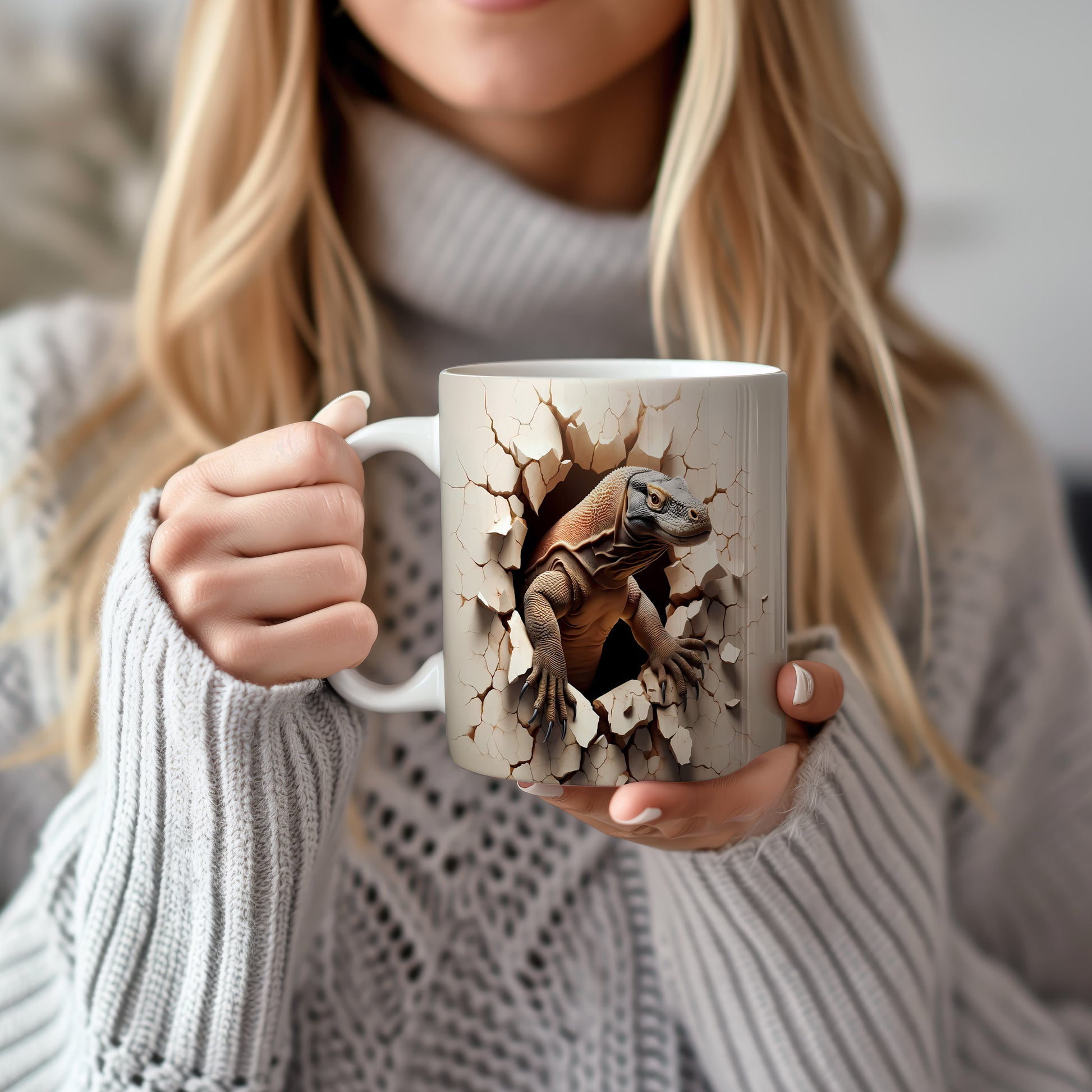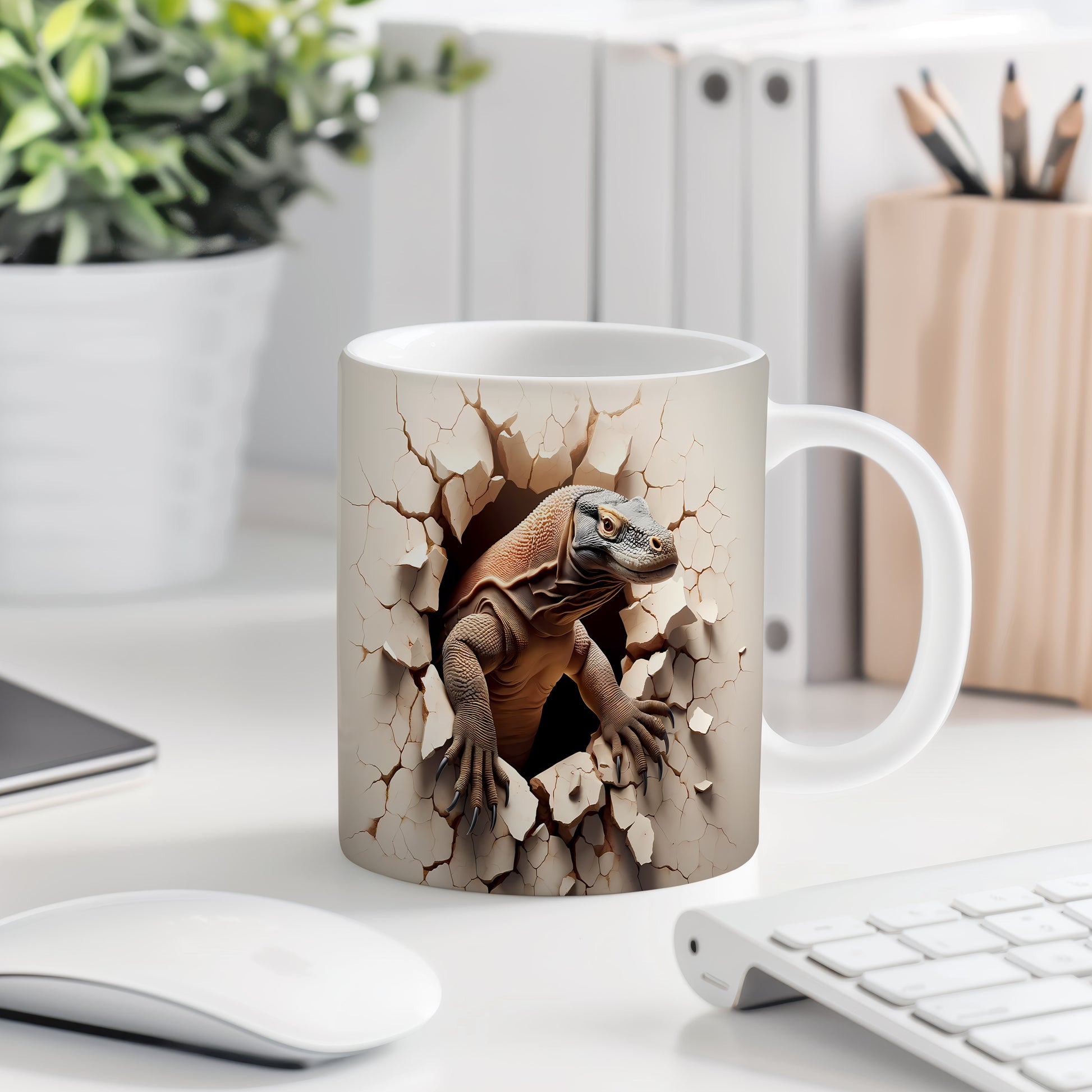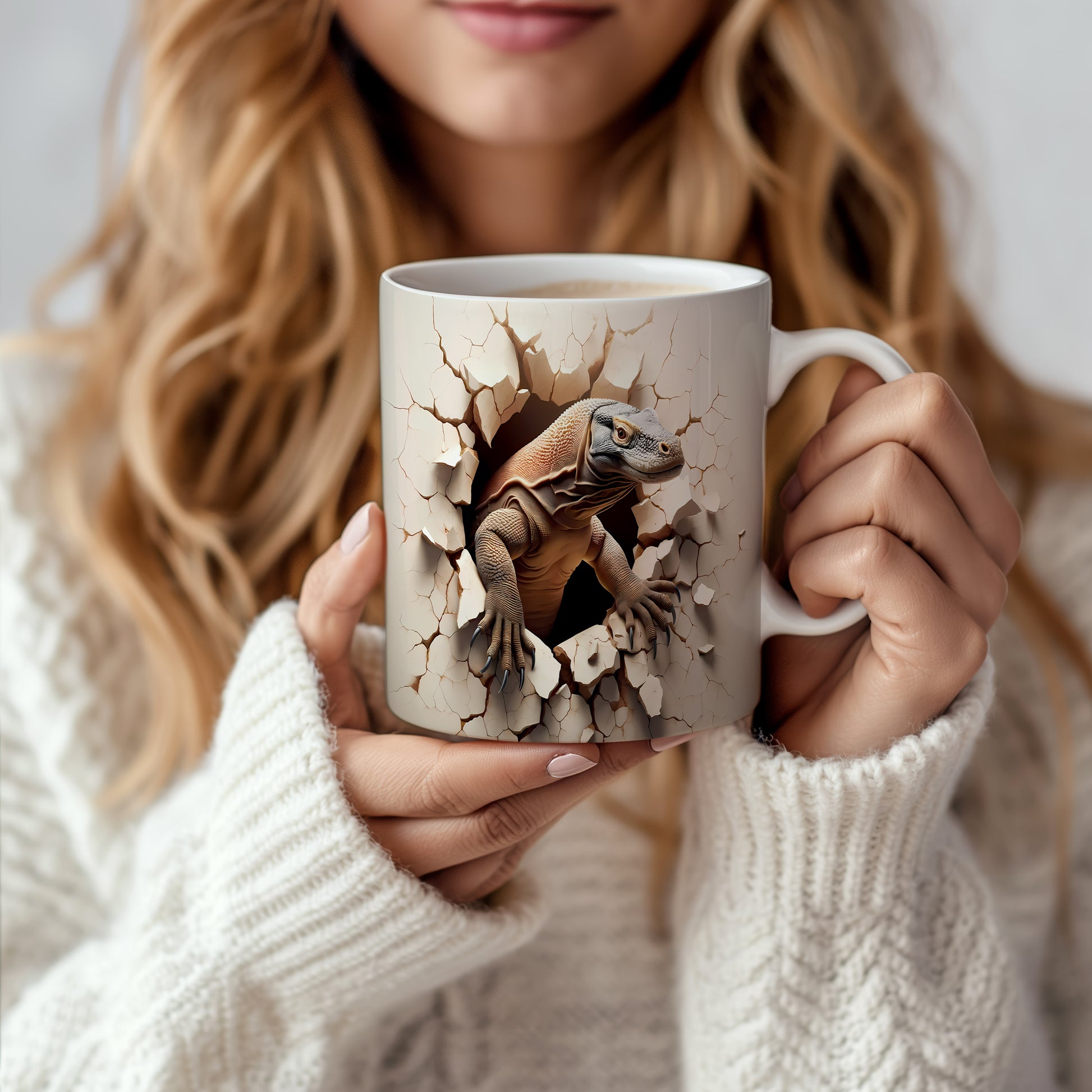Tento keramický hrnek zobrazuje realistickou ještěrku, která vytváří dojem, že se vynořuje z povrchu. Je ideální pro milovníky přírody a exotických zvířat, skvělý tip na dárek pro každého, kdo ocení originální design. Materiál: keramika. Objem: 330 ml. Vhodné do myčky i mikrovlnky. Díky svému jedinečnému vzhledu přinese do každodenního pití špetku dobrodružství.