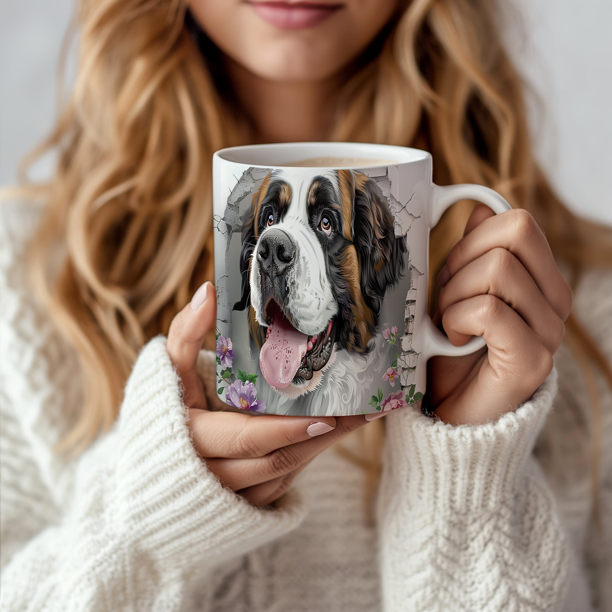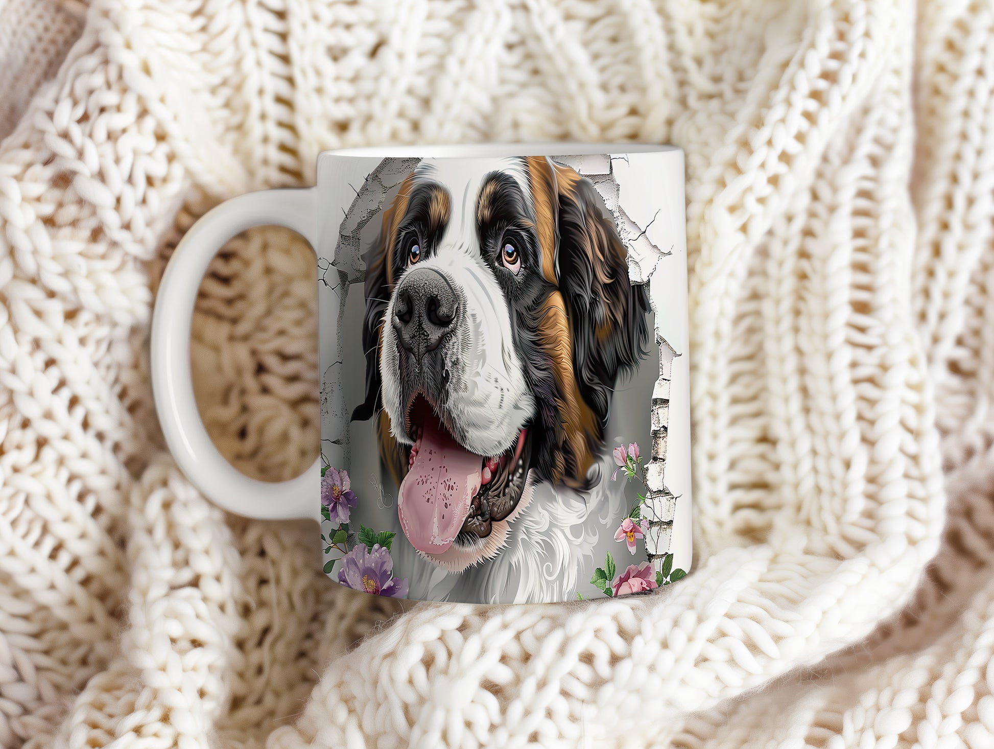 Hrnek s realistickým motivem hlavy psa plemene St. Bernard, který má veselý výraz a je obklopen květinami. Tento hrnek je ideálním dárkem pro milovníky psů a přírody. Materiál: keramika. Objem: 330 ml. Vhodné do myčky i mikrovlnky. Používání tohoto hrnku přináší radost a útulnost do každého dne.