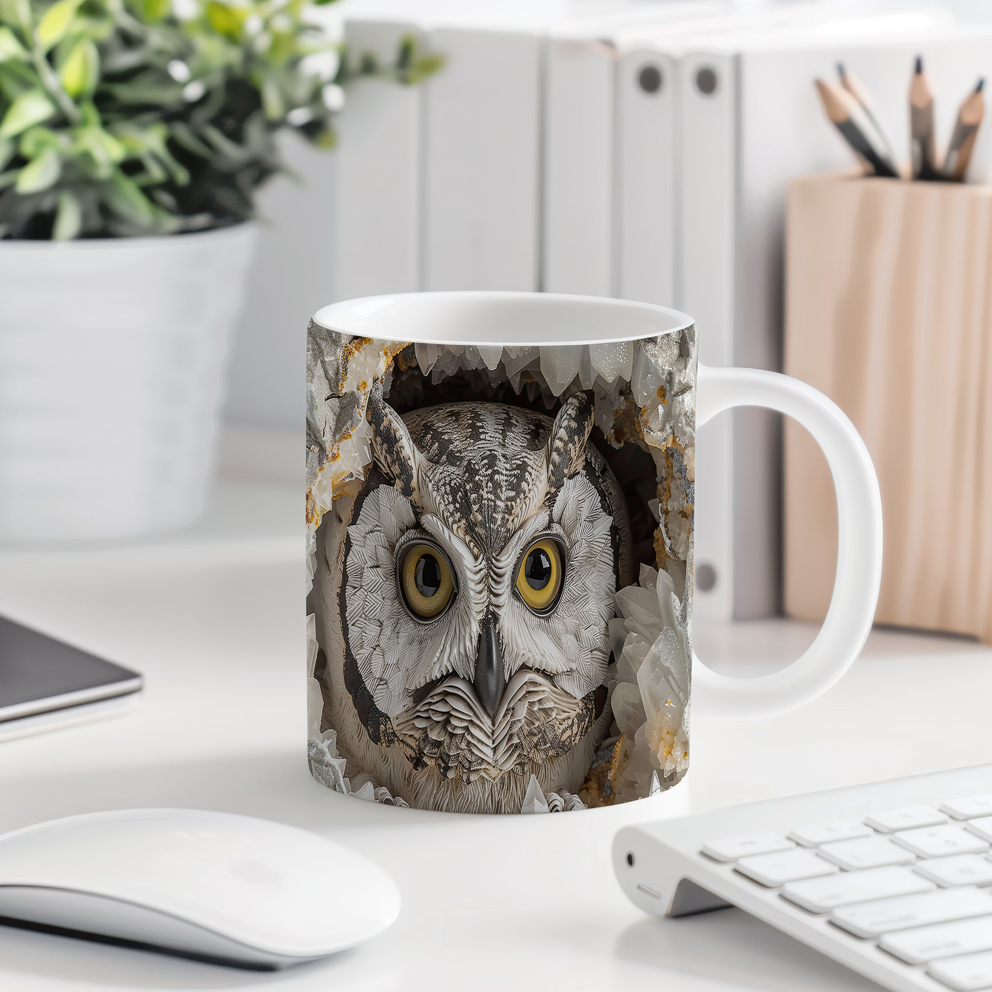 Tento keramický hrnek zobrazuje detailní realistický motiv sovy, který potěší každého milovníka přírody a zvířat. Skvělý tip na dárek pro přátele nebo rodinu, kteří ocení jedinečný design. Materiál: keramika. Objem: 330 ml. Vhodné do myčky i mikrovlnky. Používání tohoto hrnku přináší radost z pití oblíbeného nápoje.