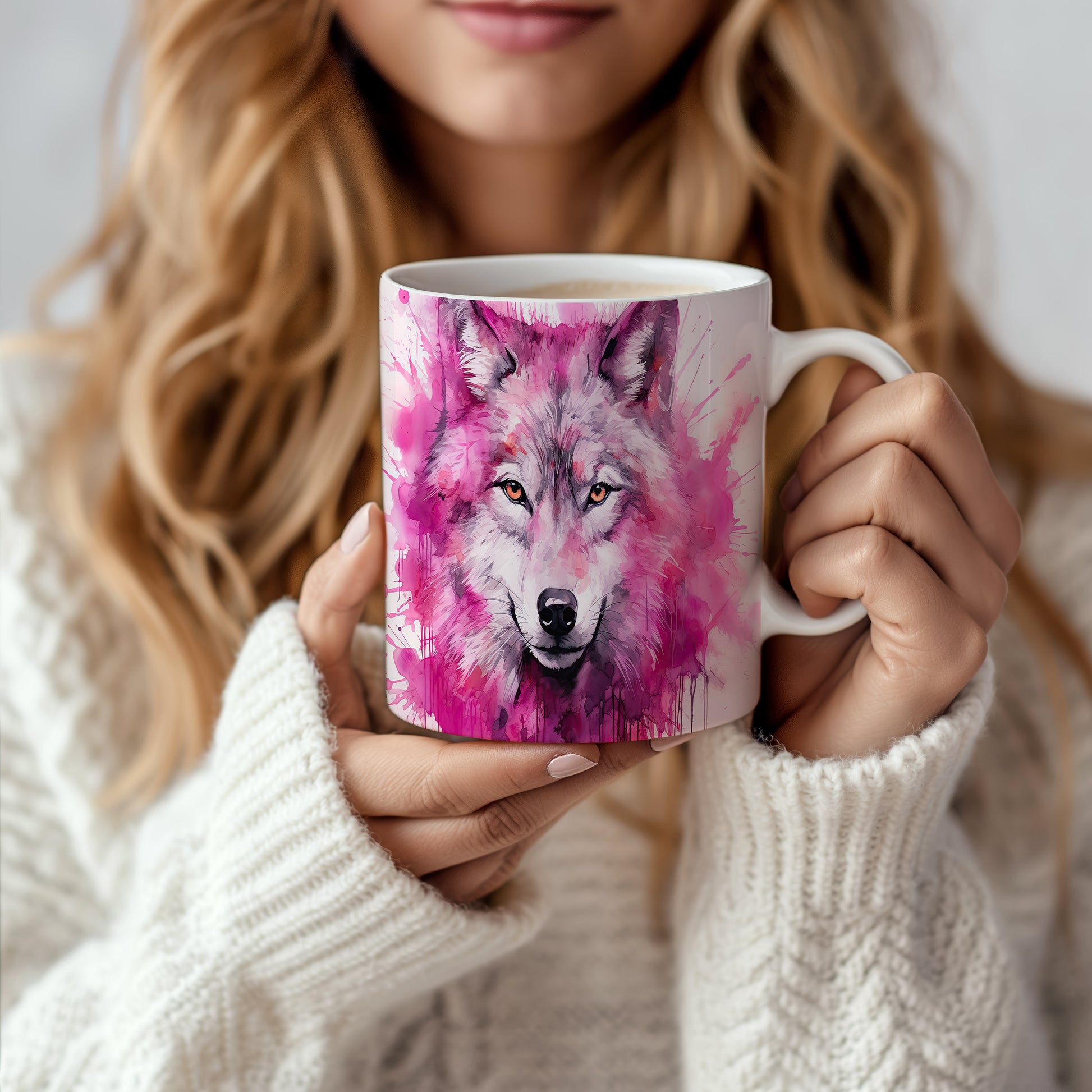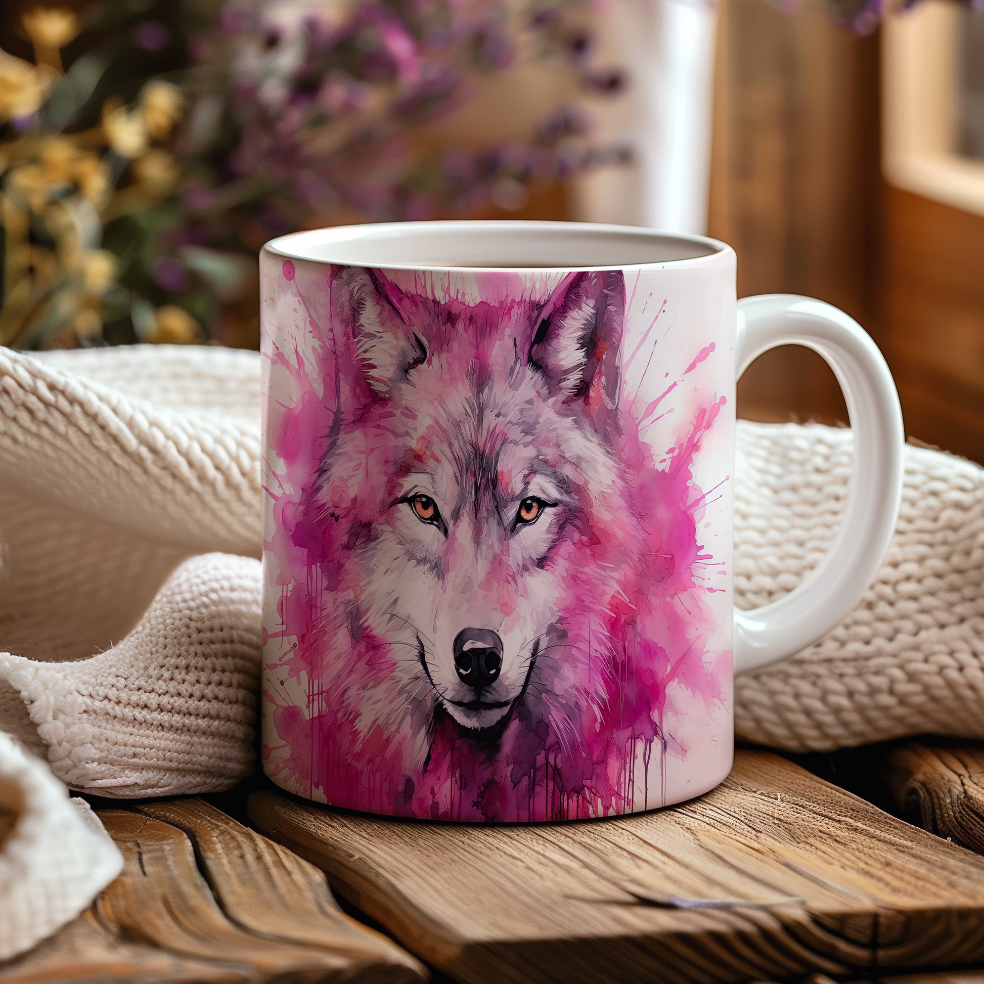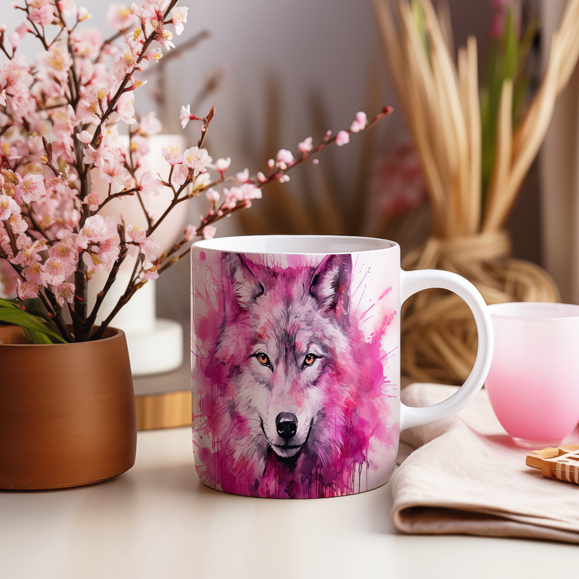 Hrnek s realistickým motivem vlka v růžových tónech
