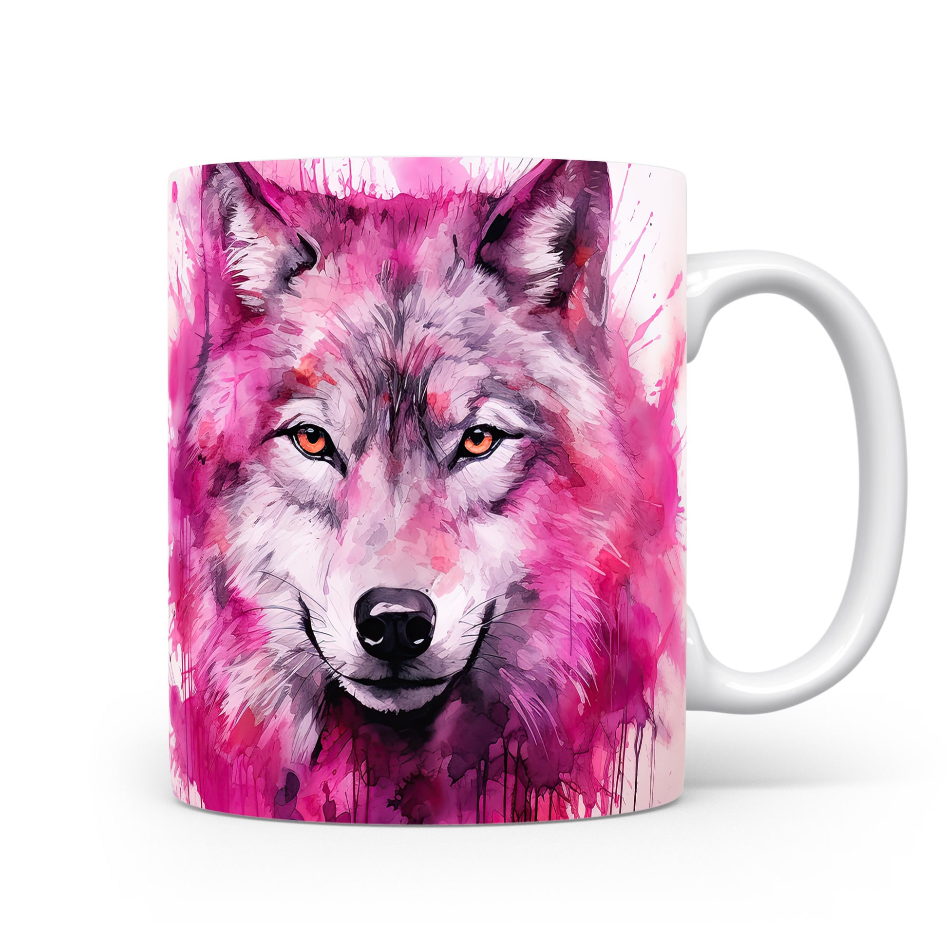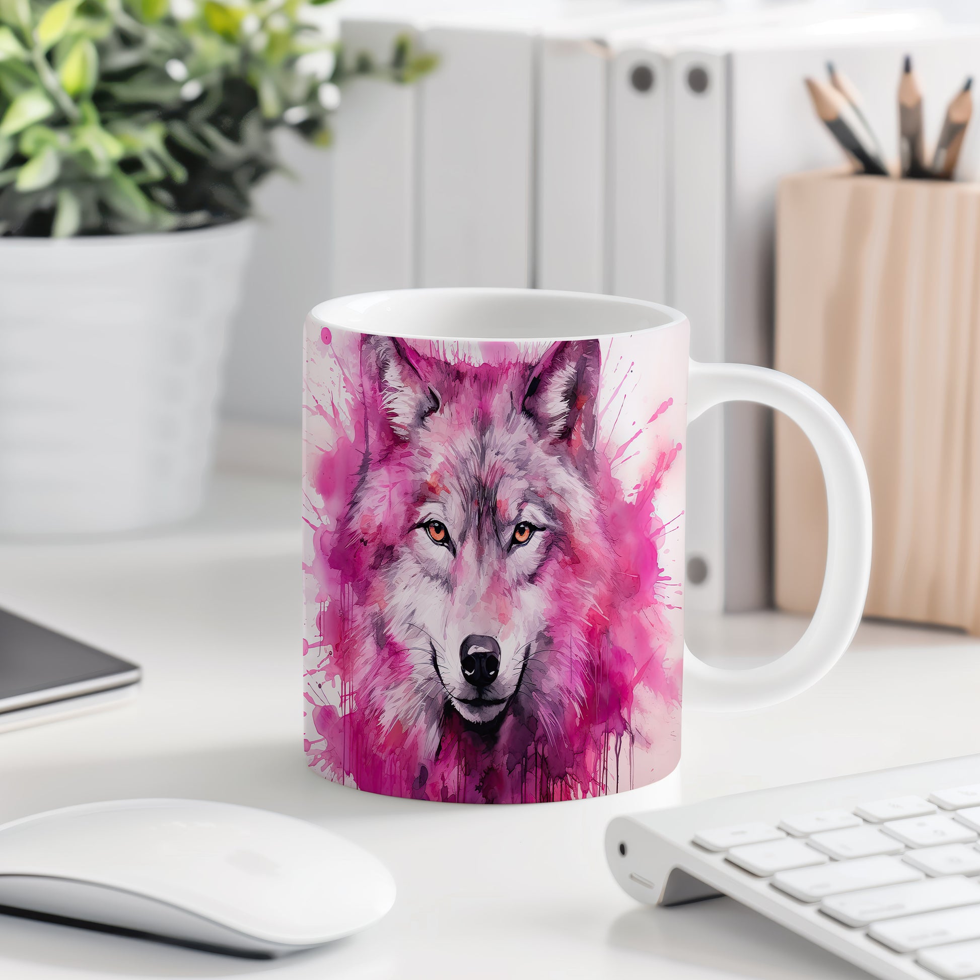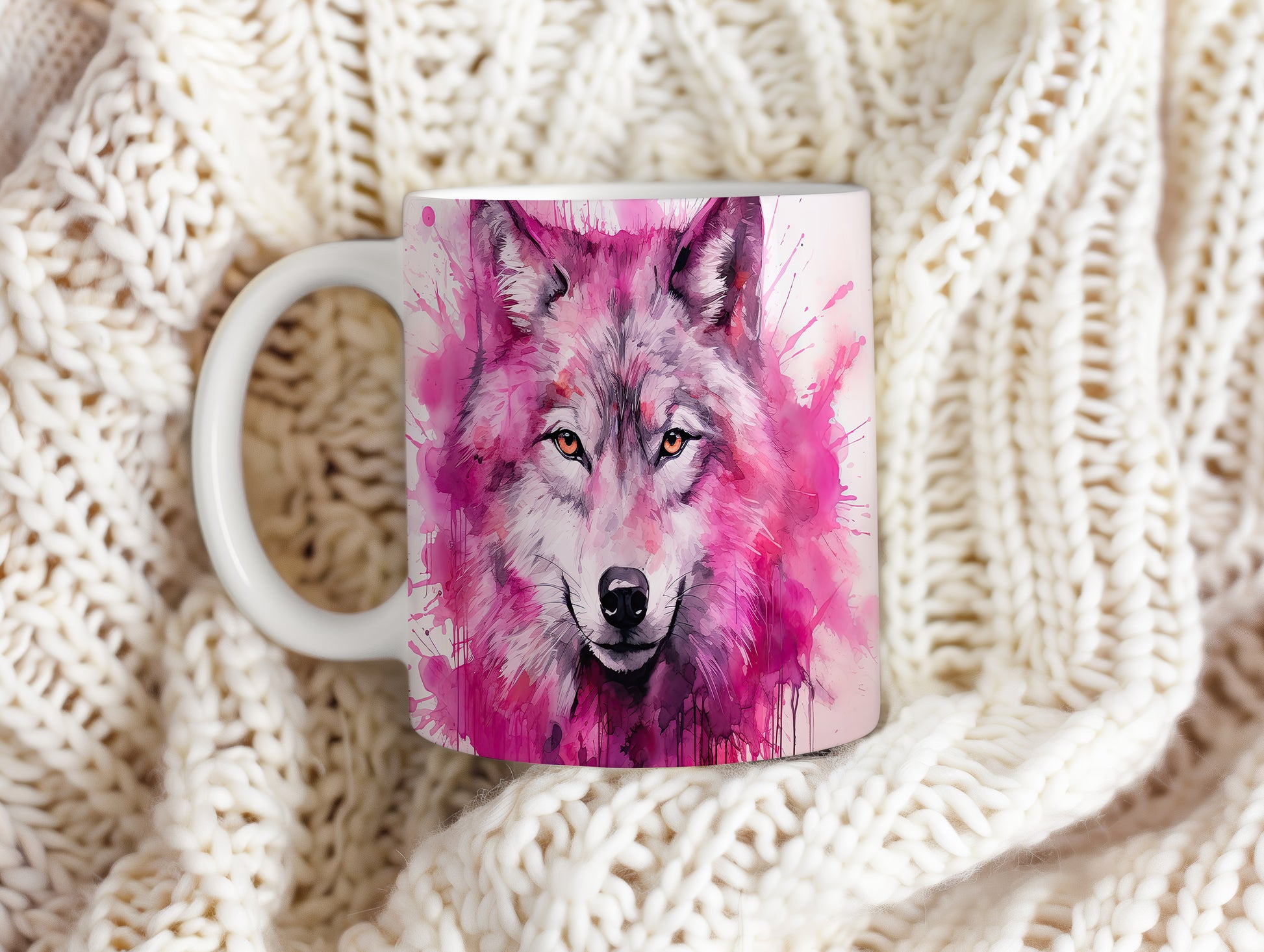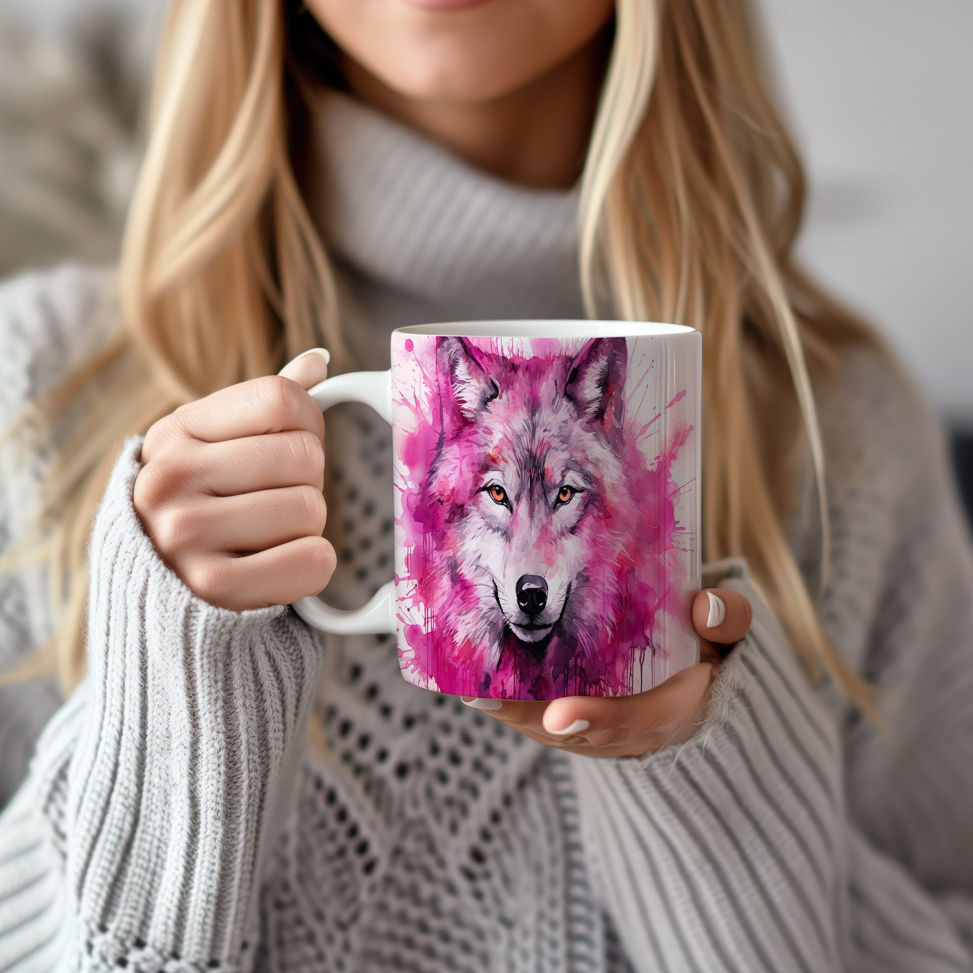 Hrnek s realistickým motivem vlka v růžových tónech