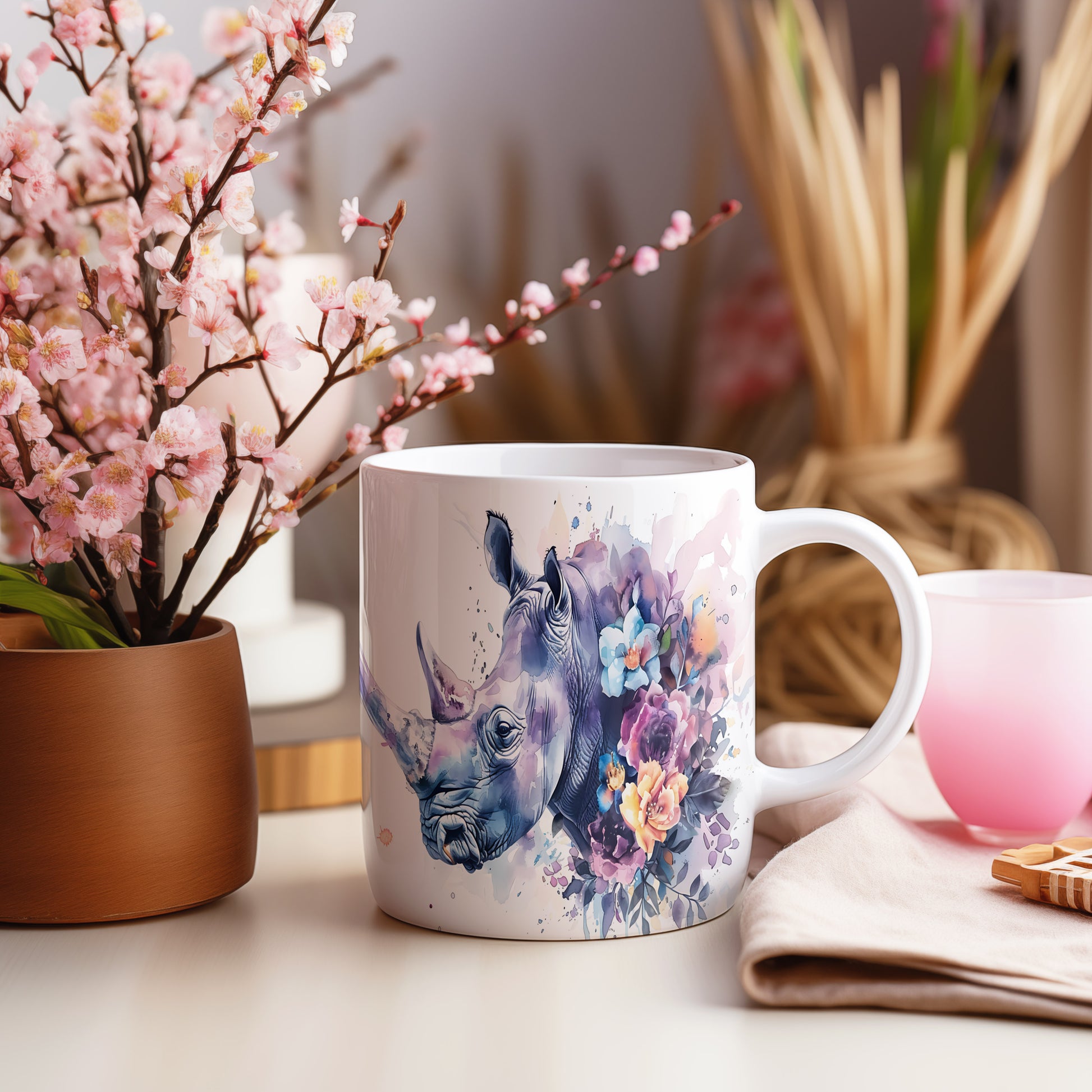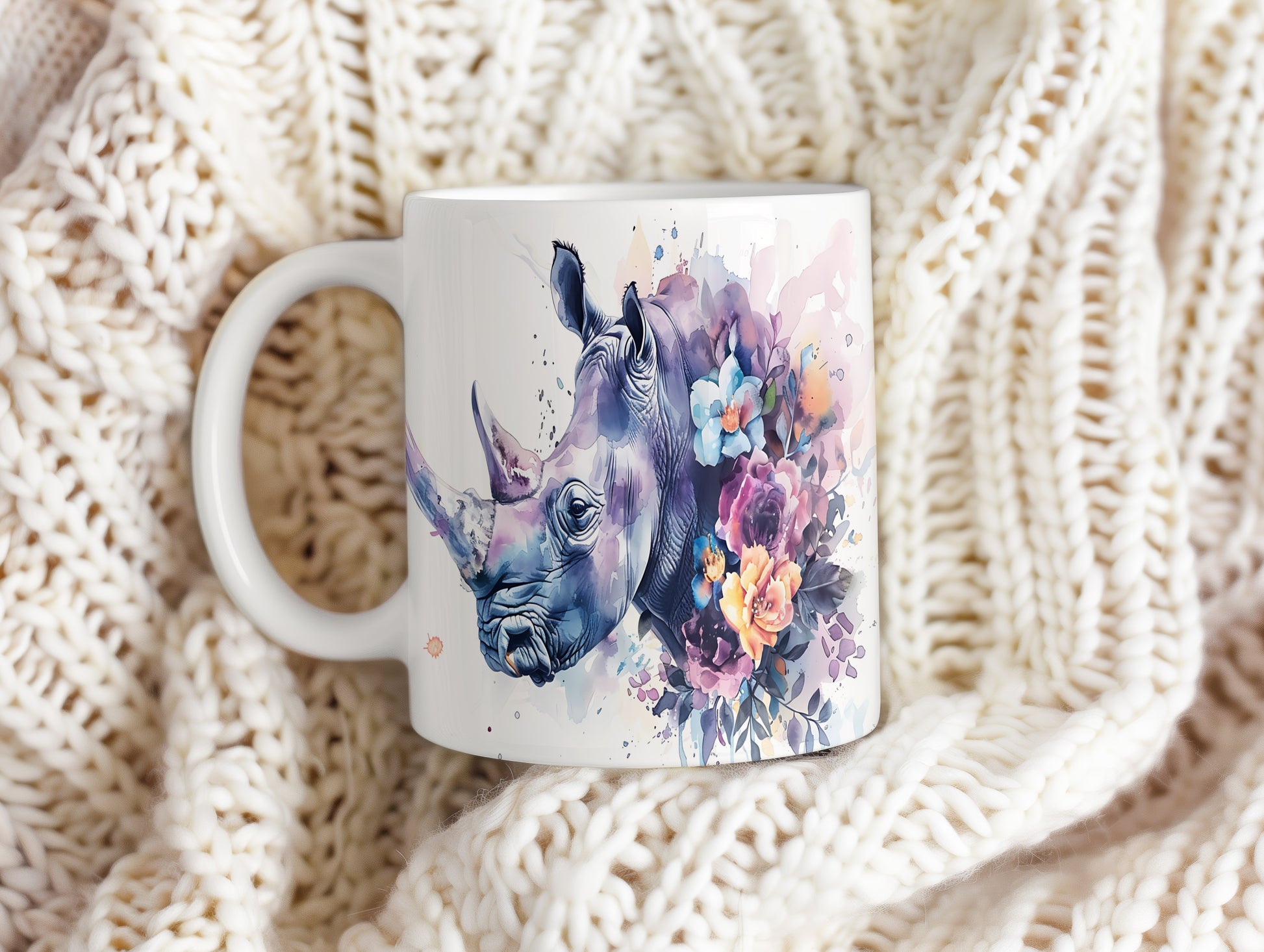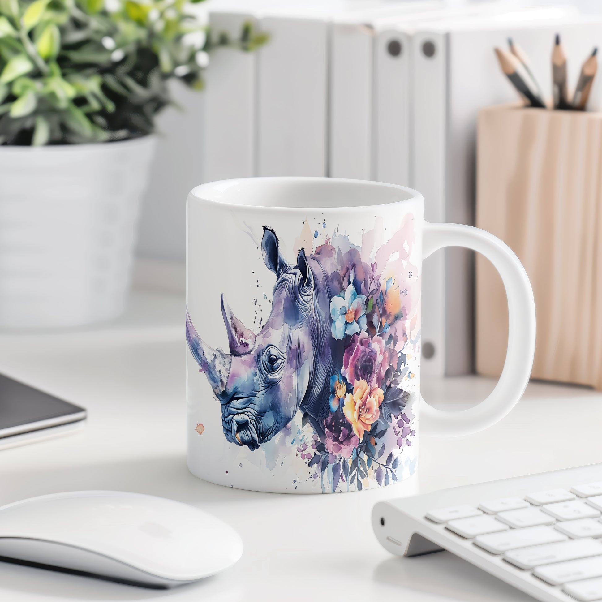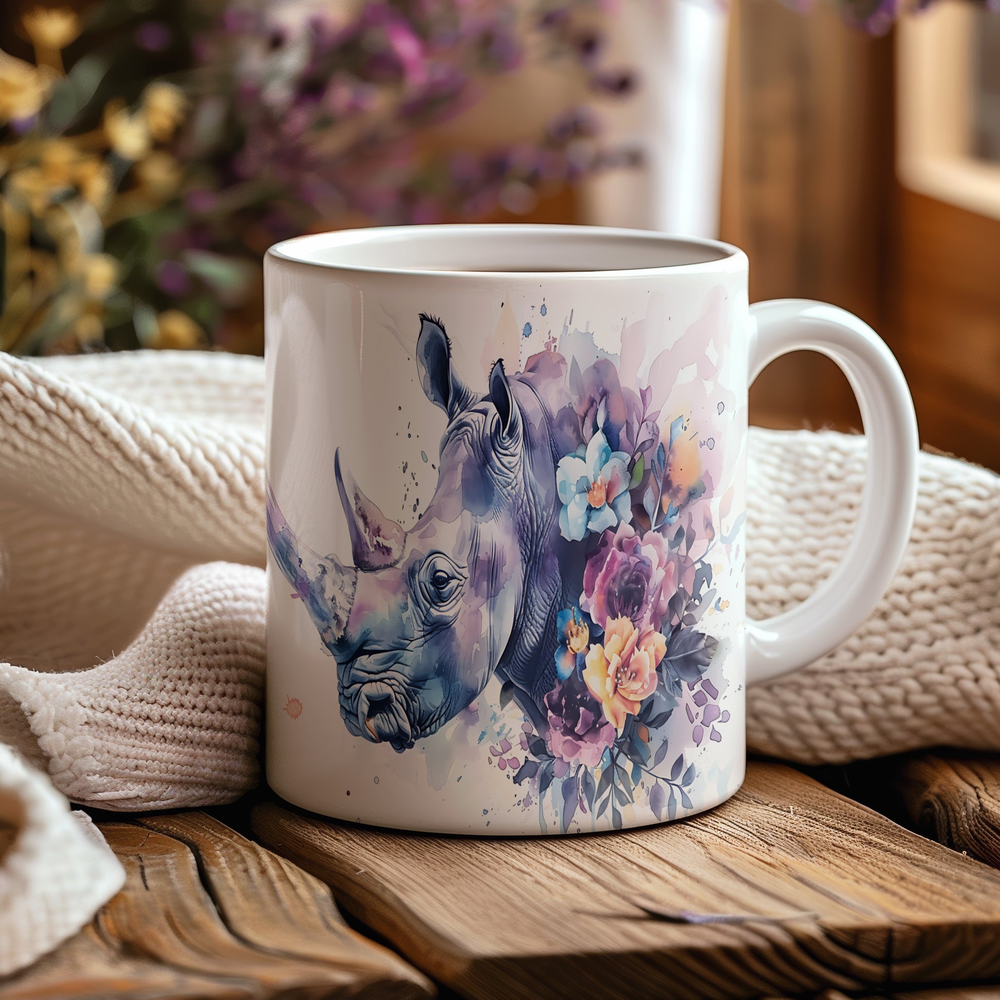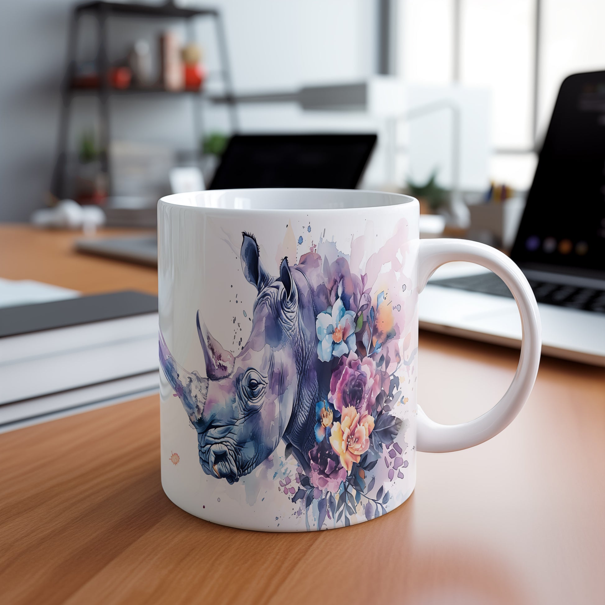 Tento hrnek zaujme realistickým motivem nosorožce, který je doplněn o barevné květiny. Je ideální pro milovníky přírody a zvířat, skvělý tip na dárek pro každého, kdo ocení jedinečný design. Materiál: keramika. Objem: 330 ml. Vhodné do myčky i mikrovlnky. Používání tohoto hrnku přináší radost z každého doušku.