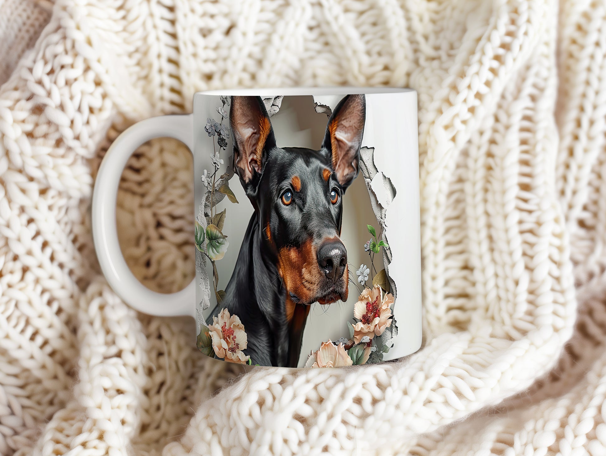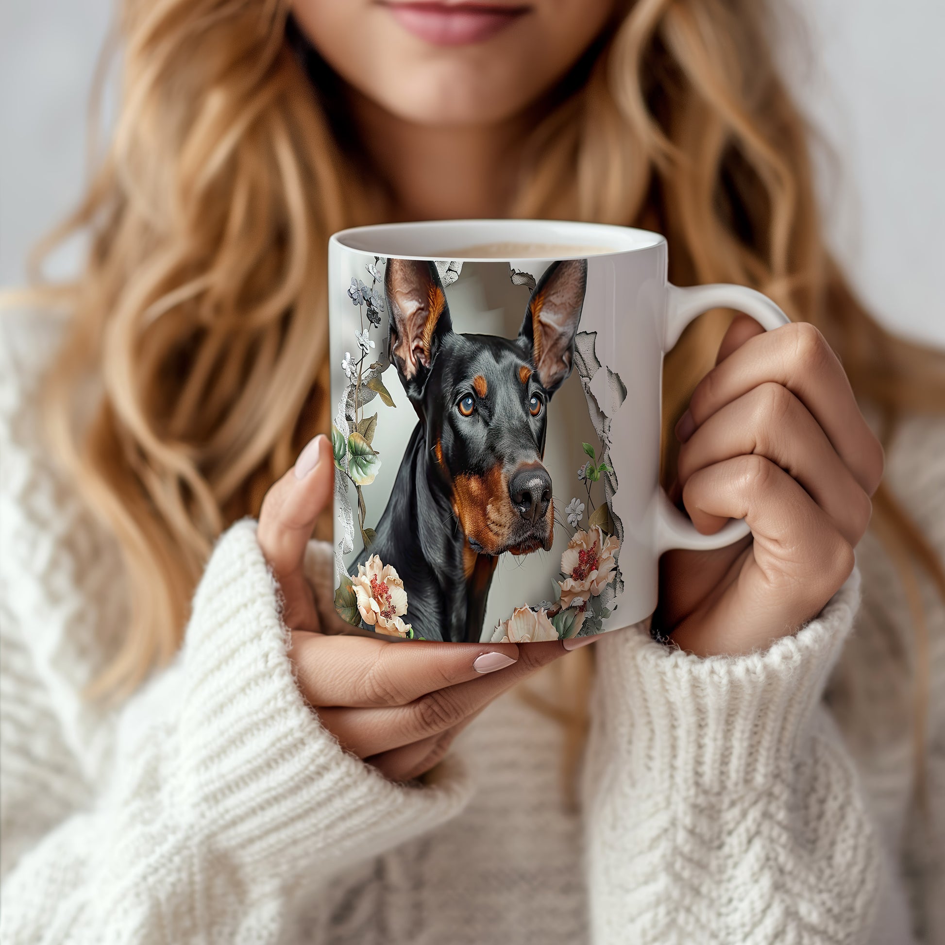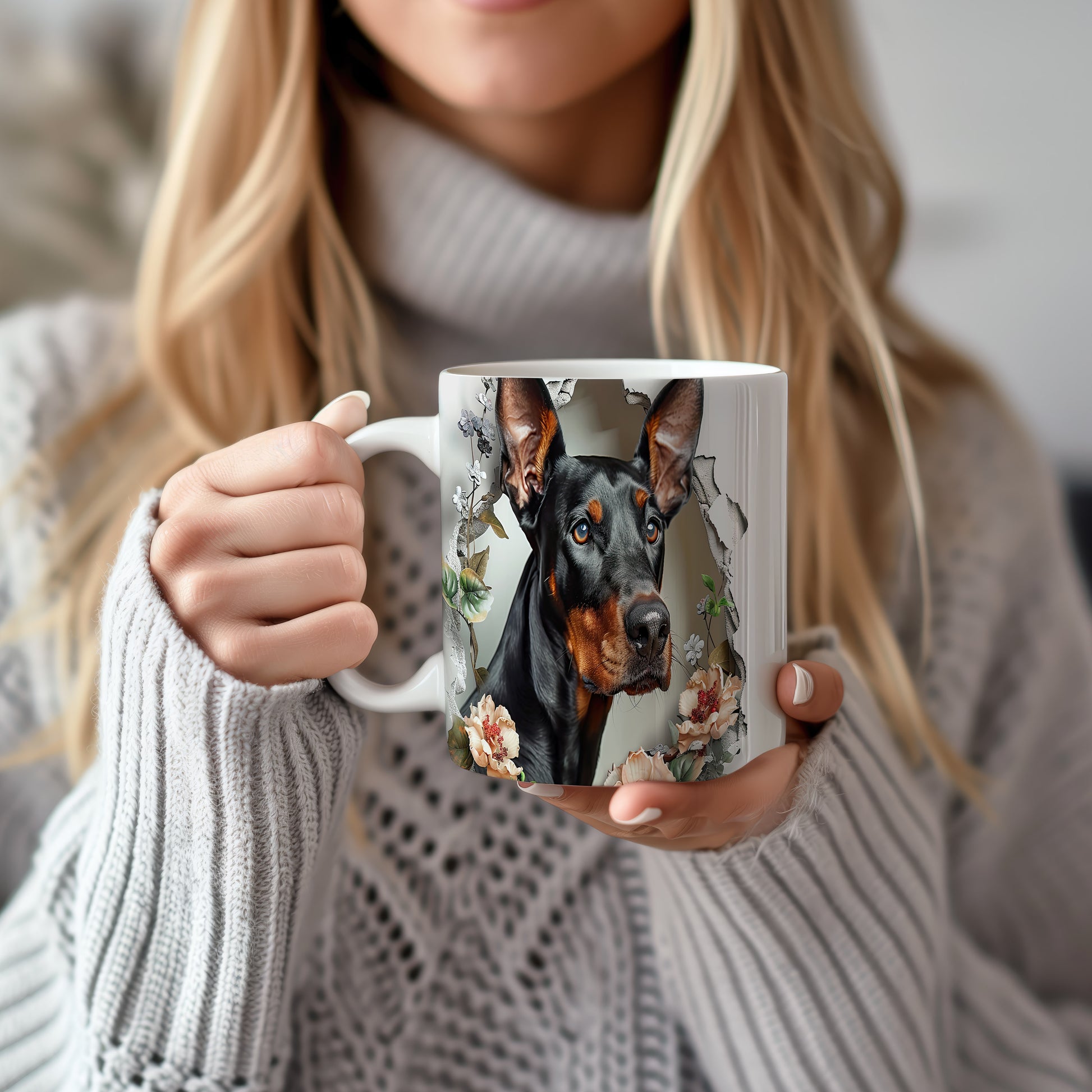 Tento keramický hrnek zobrazuje realistickou podobiznu dobermana, obklopeného květinovým motivem. Je ideální pro milovníky psů a romantické duše, skvělý tip na dárek pro každého, kdo má rád zvířata. Materiál: keramika. Objem: 330 ml. Vhodné do myčky i mikrovlnky. Používání tohoto hrnku přináší radost a útulnost do každého dne.