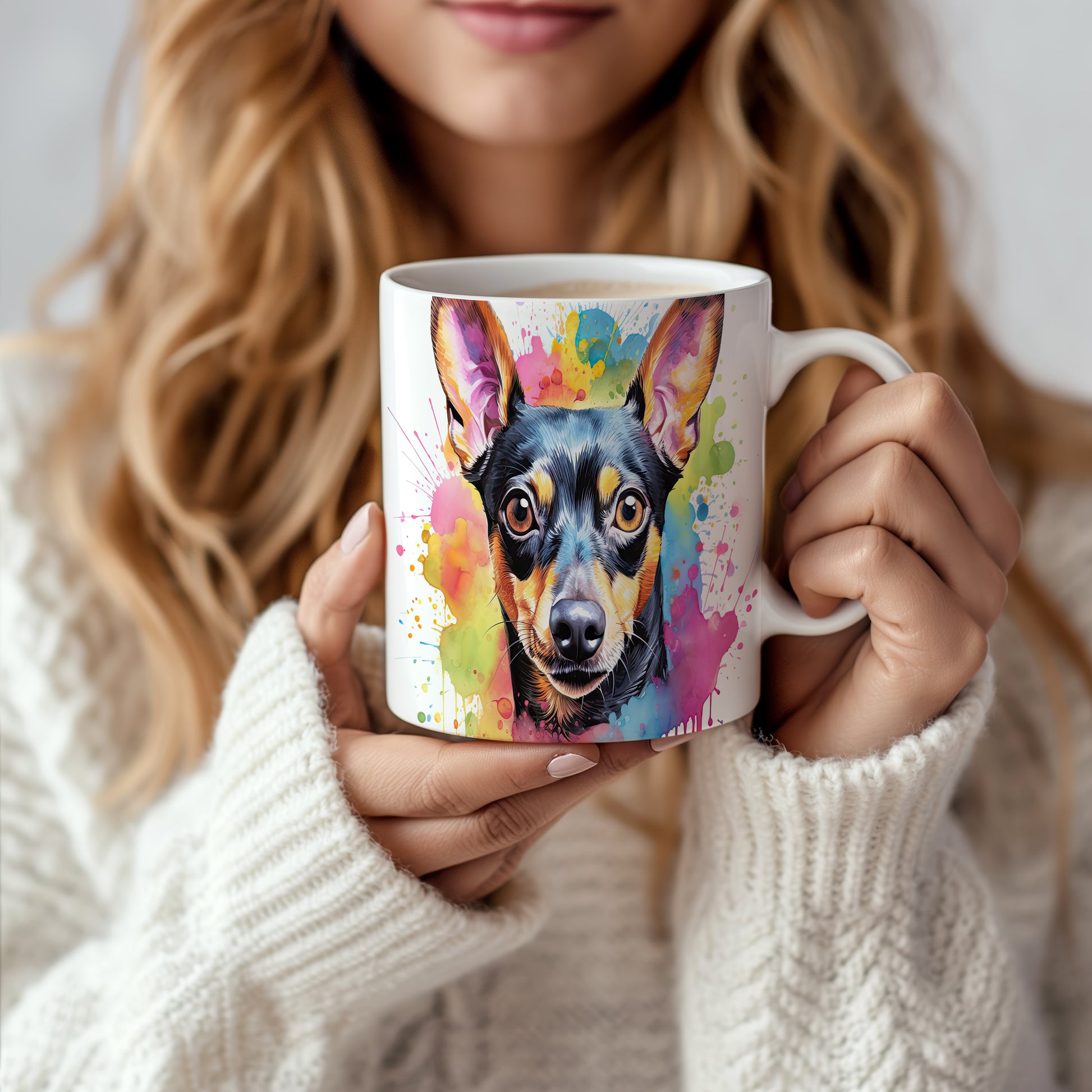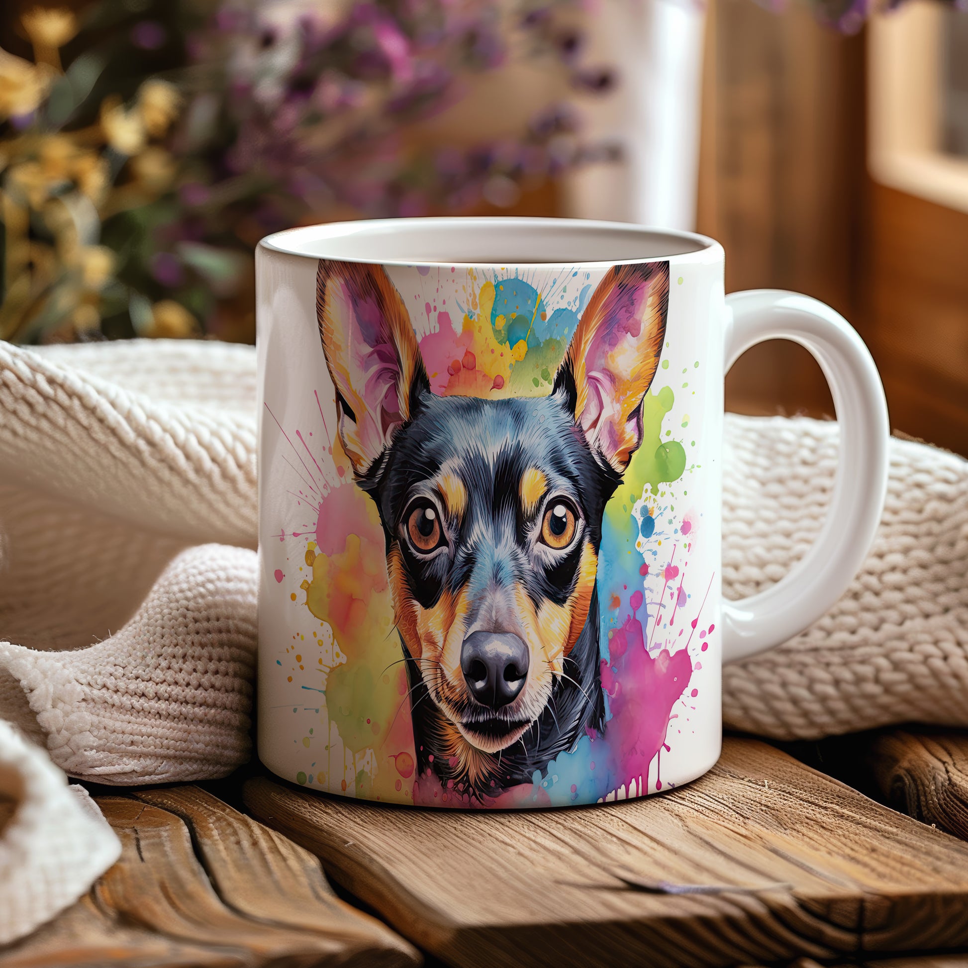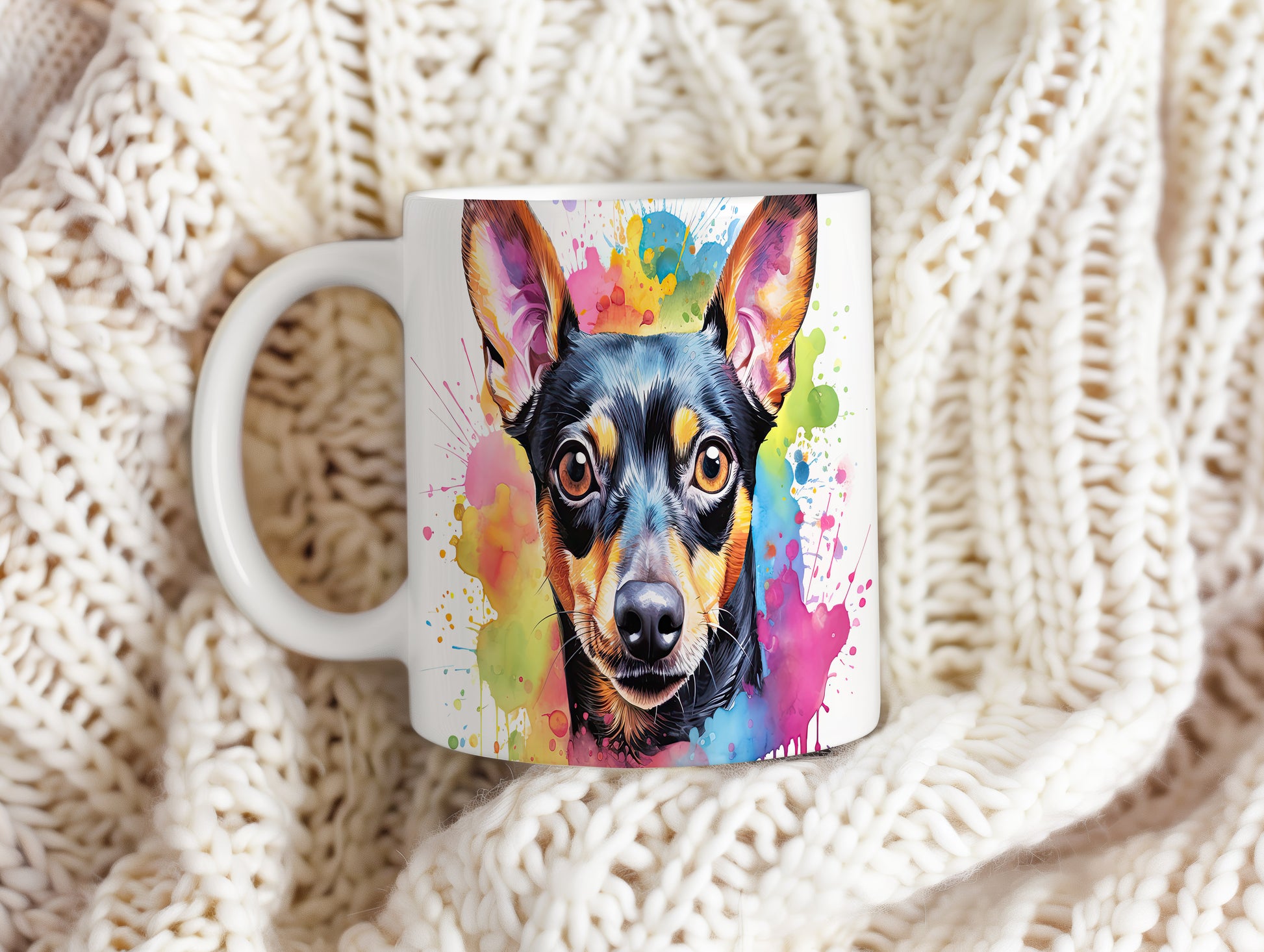 Hrnek s realistickým portrétem psa v barevných tónech