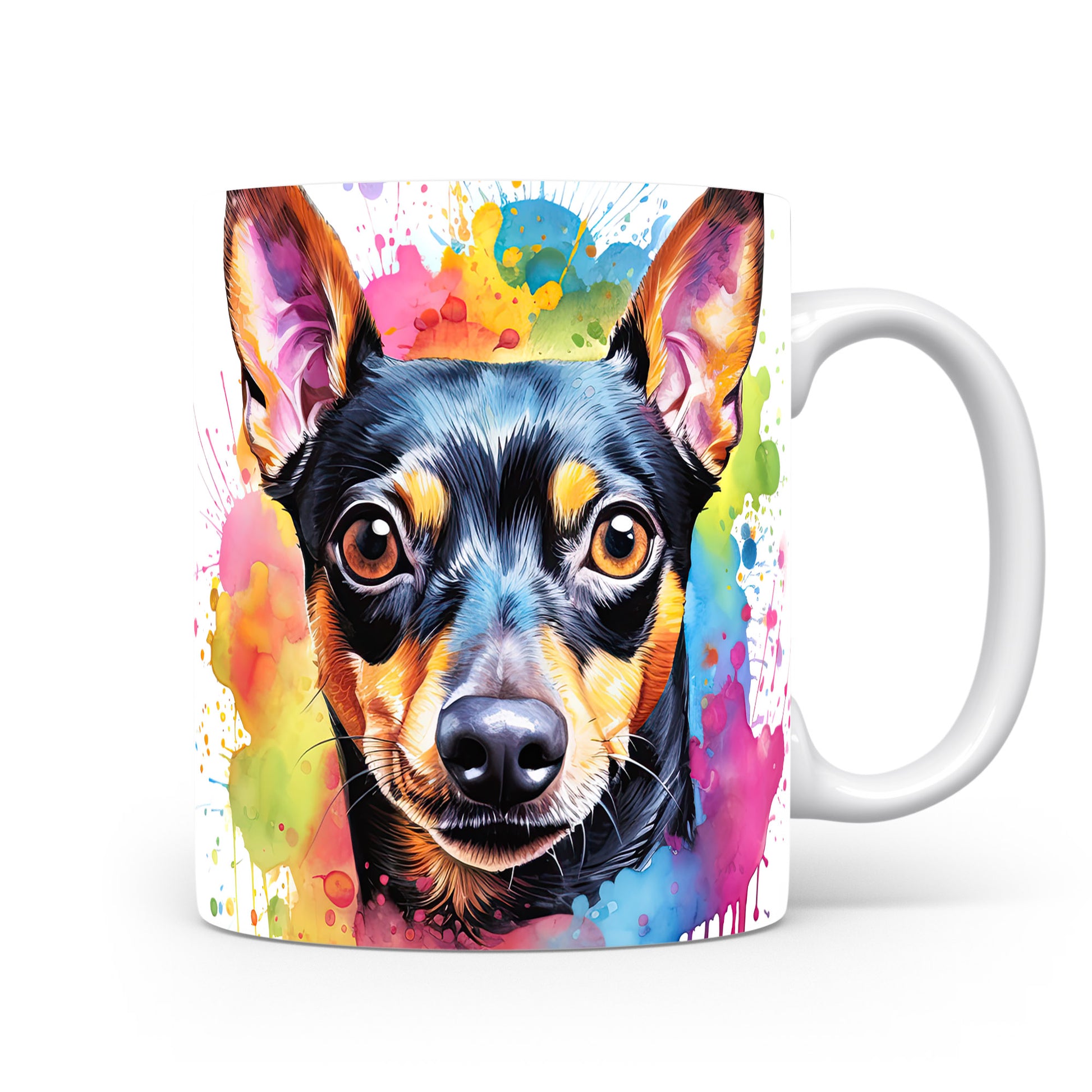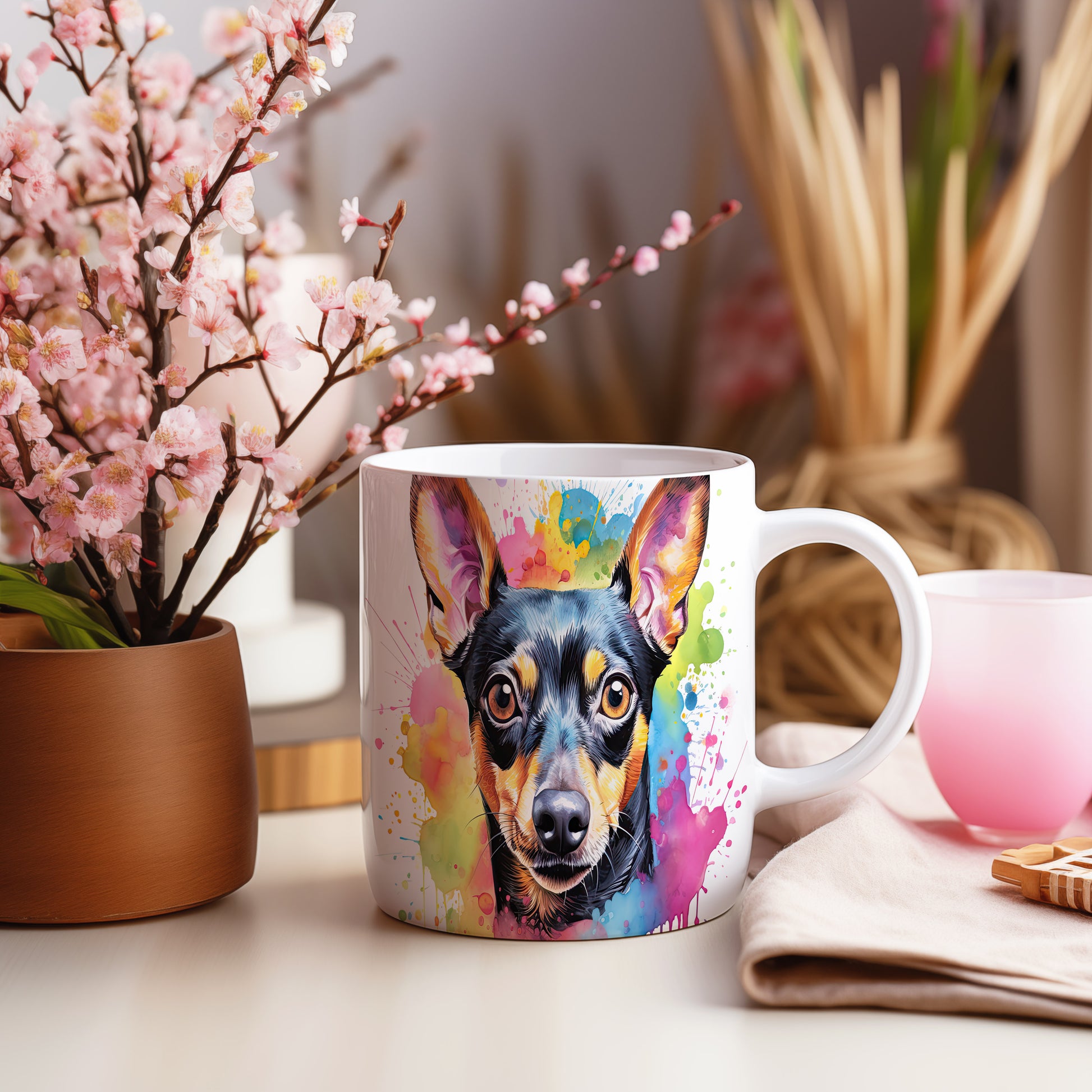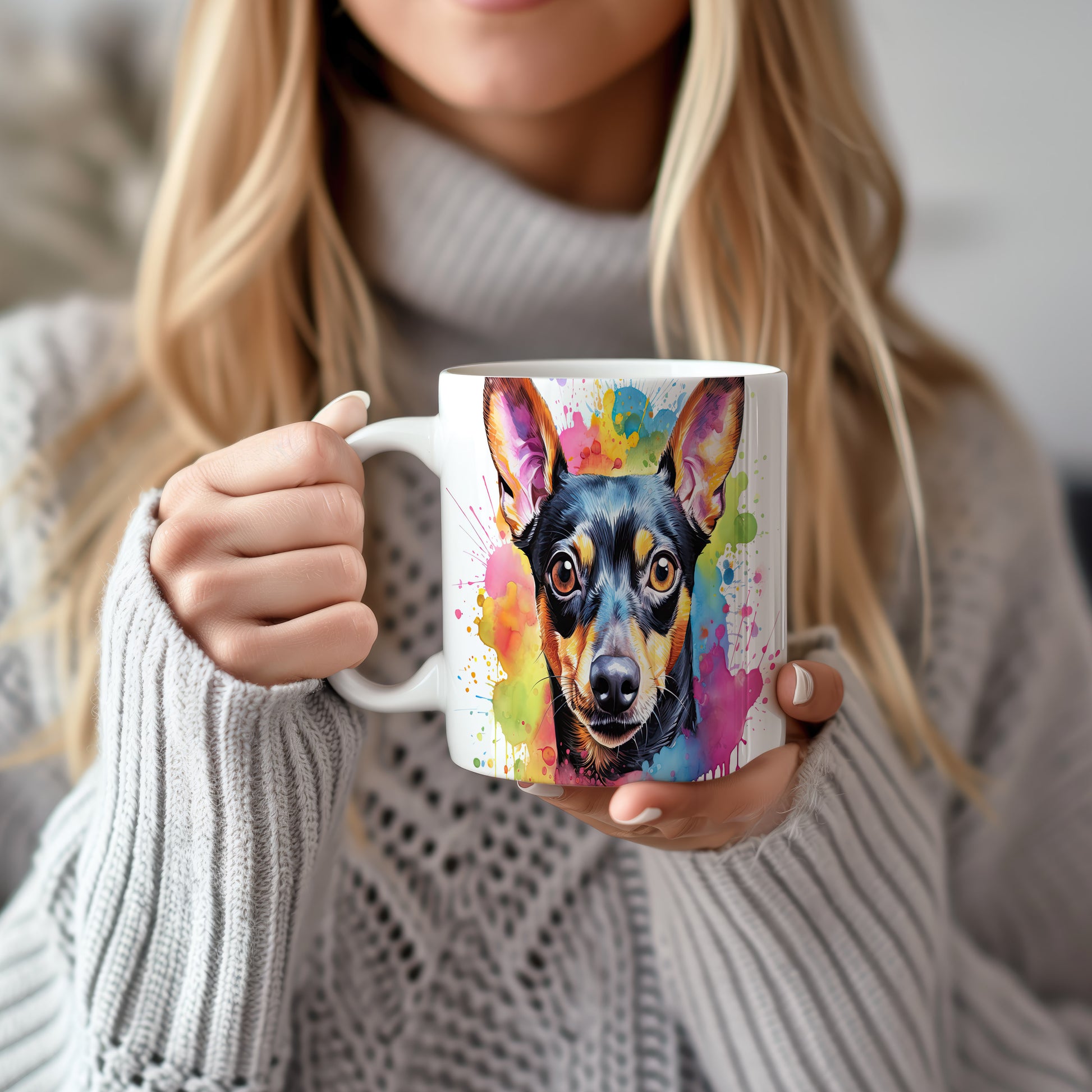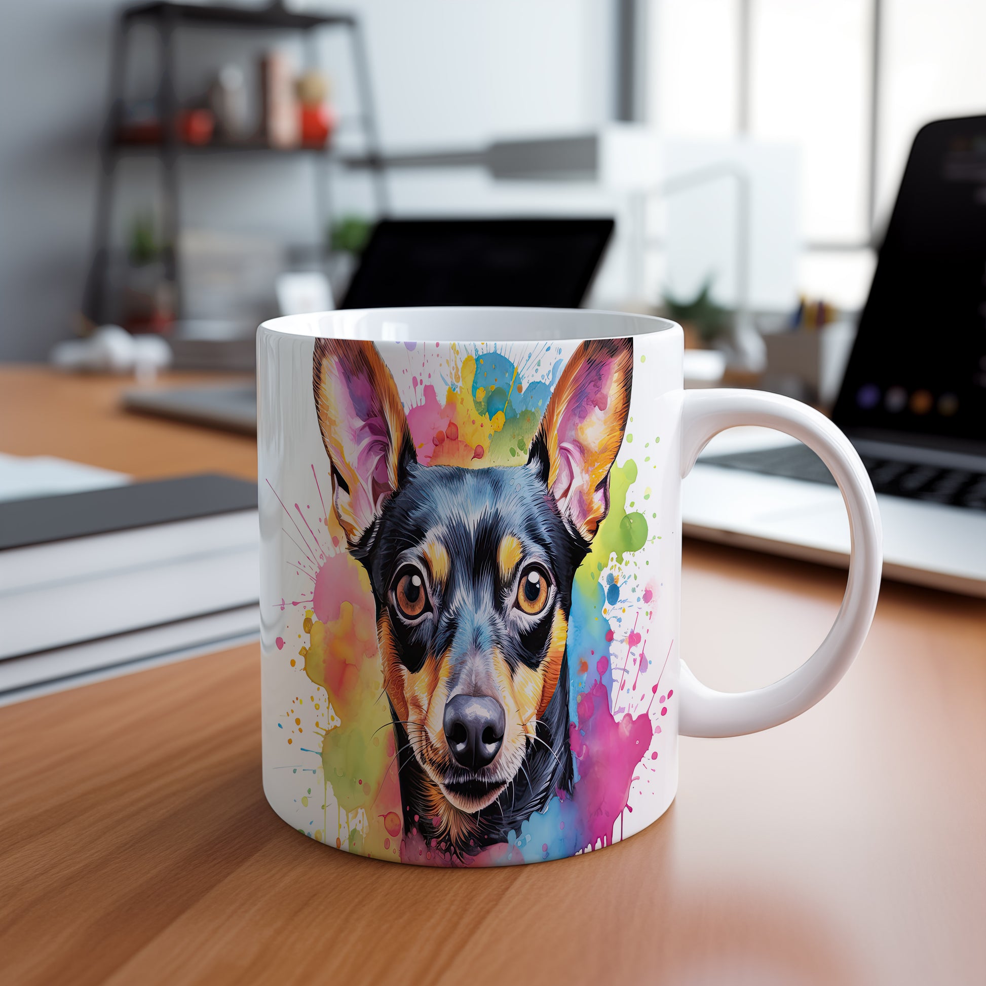 Hrnek s realistickým portrétem psa v barevných tónech