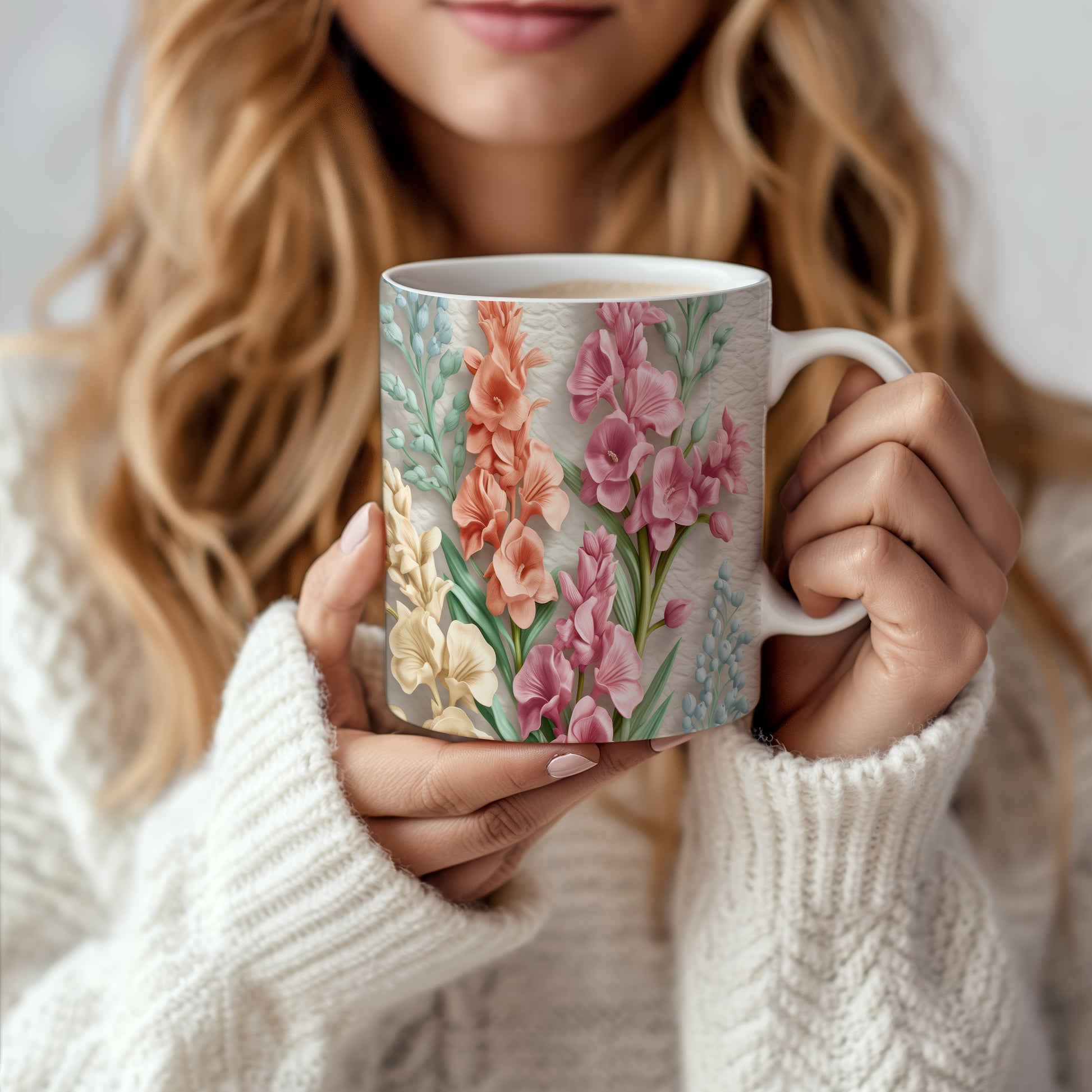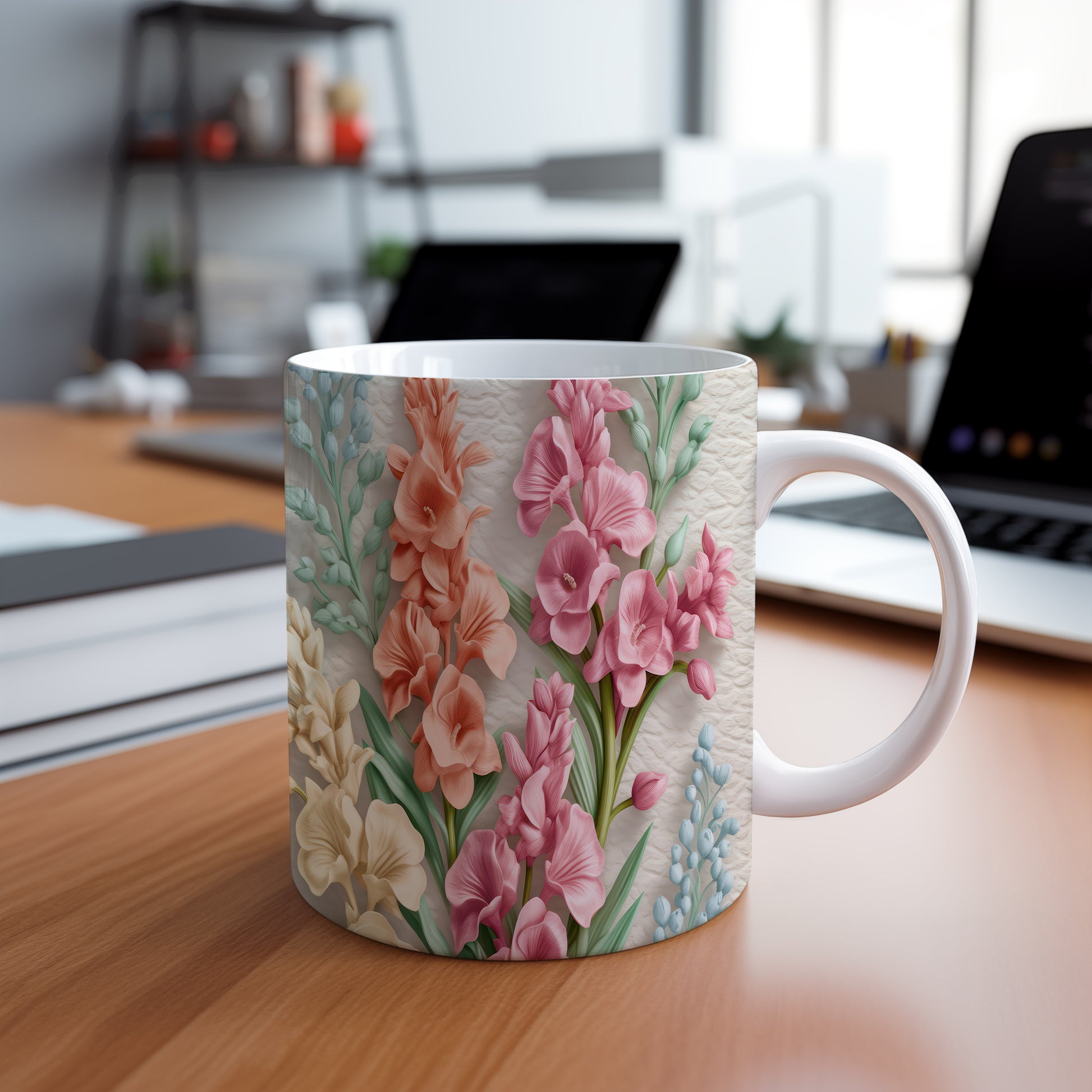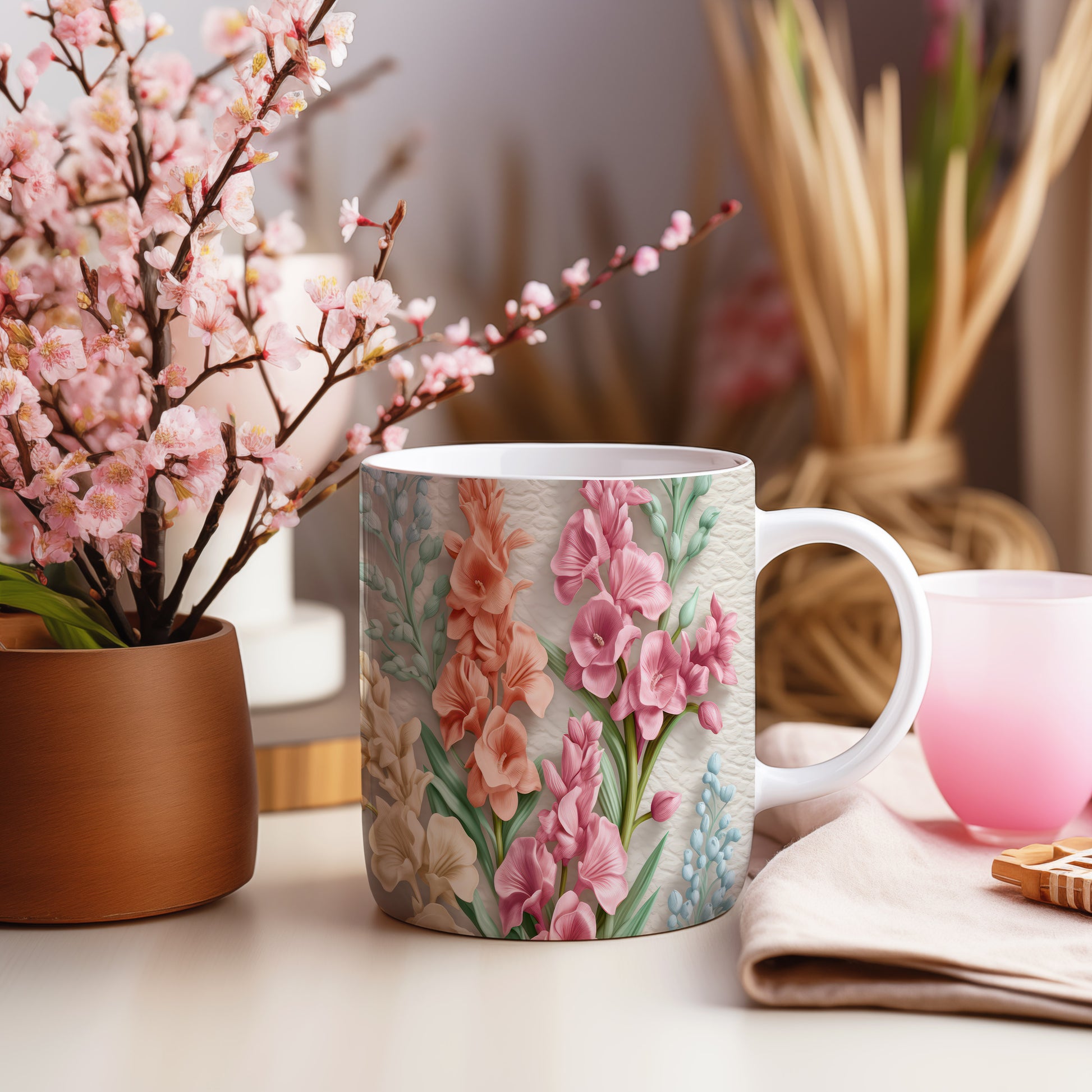 Hrnek s realistickými květinami v růžových tónech