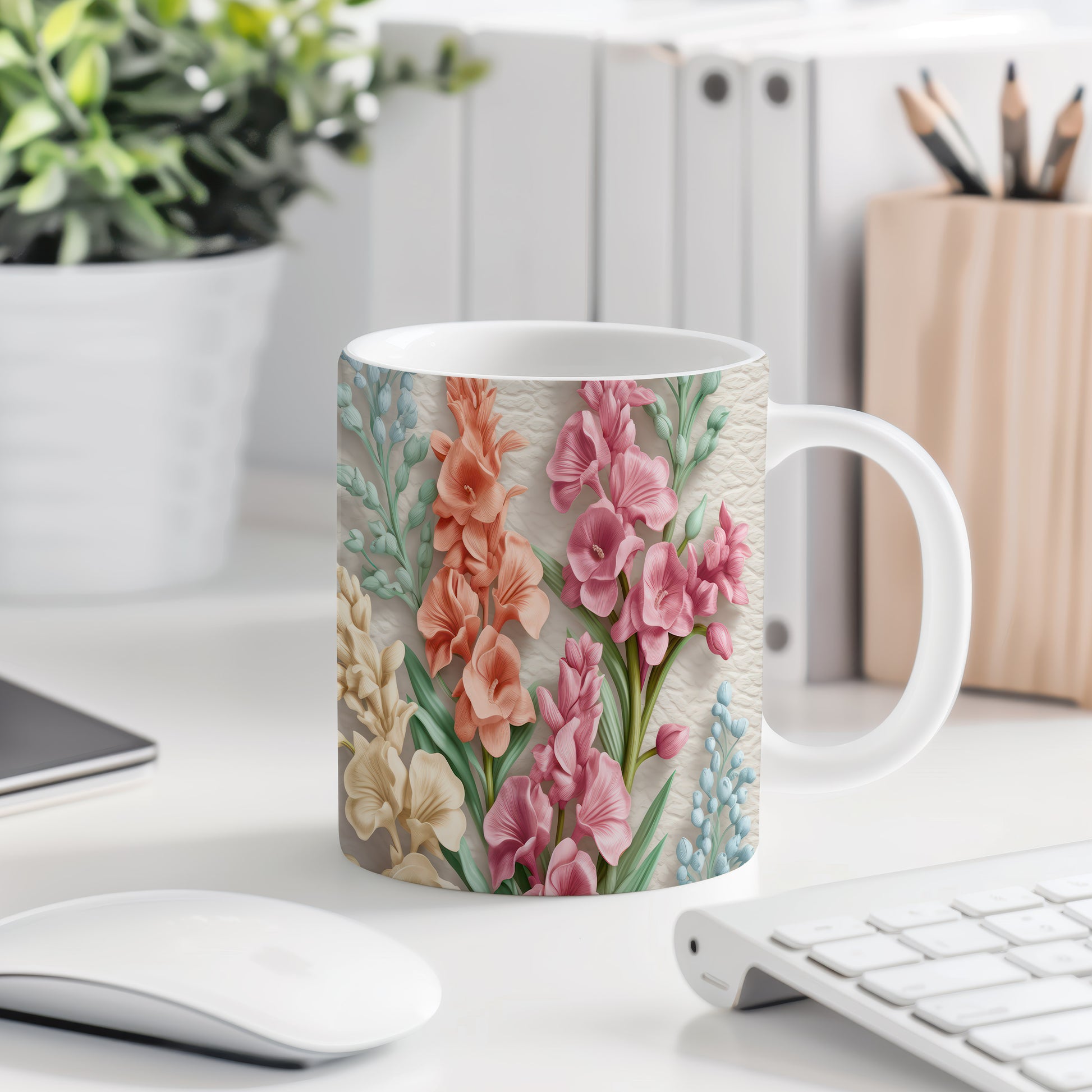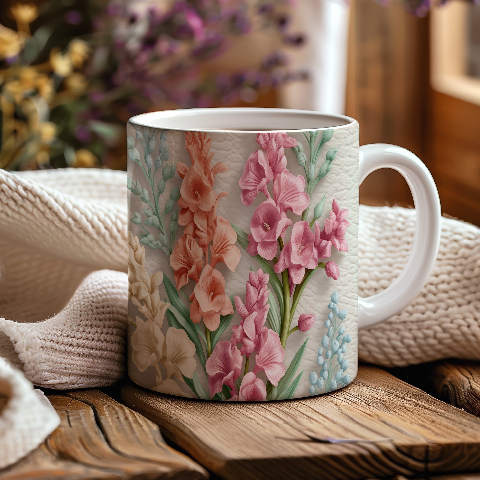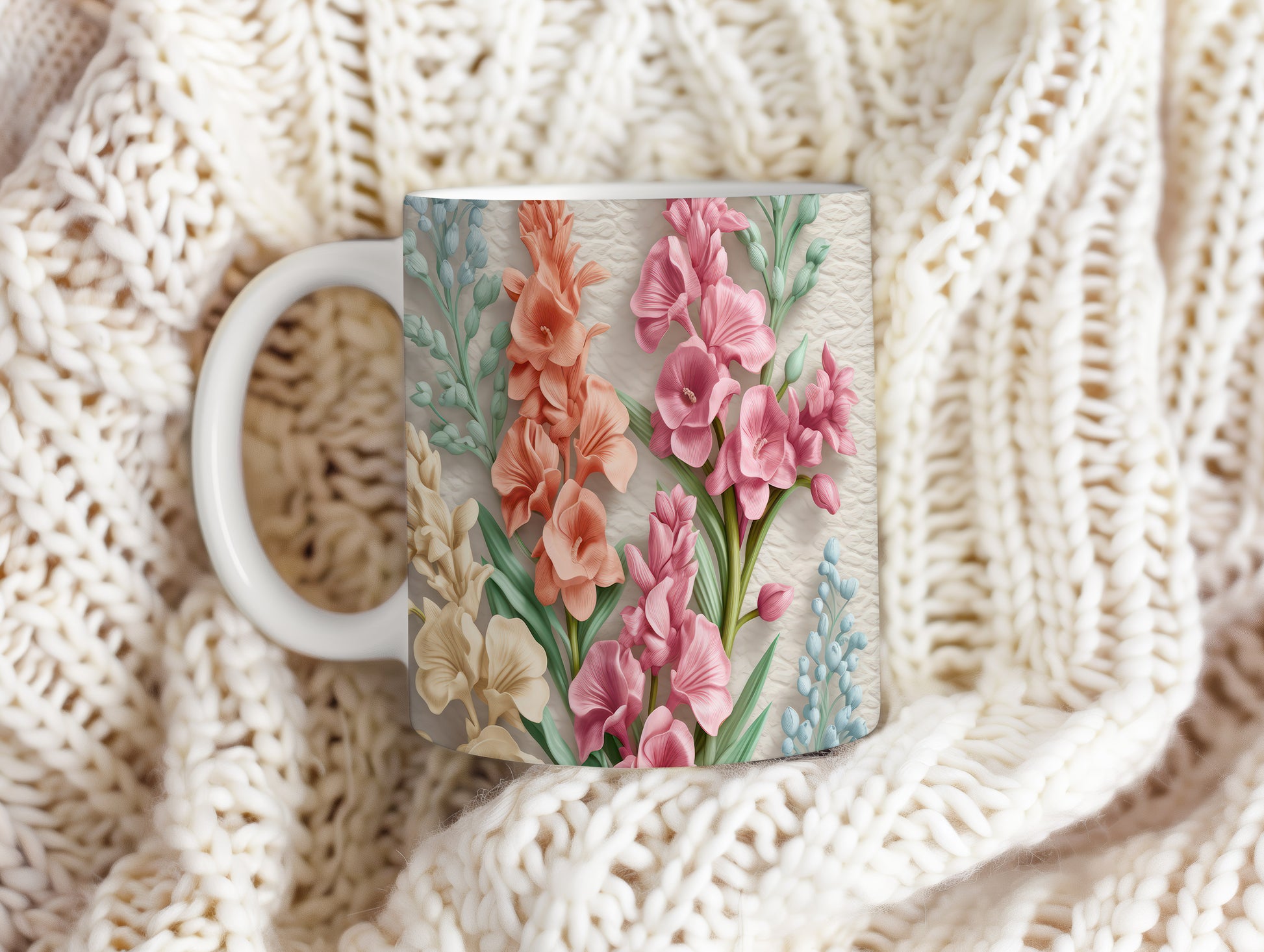 Hrnek s realistickými květinami v růžových tónech