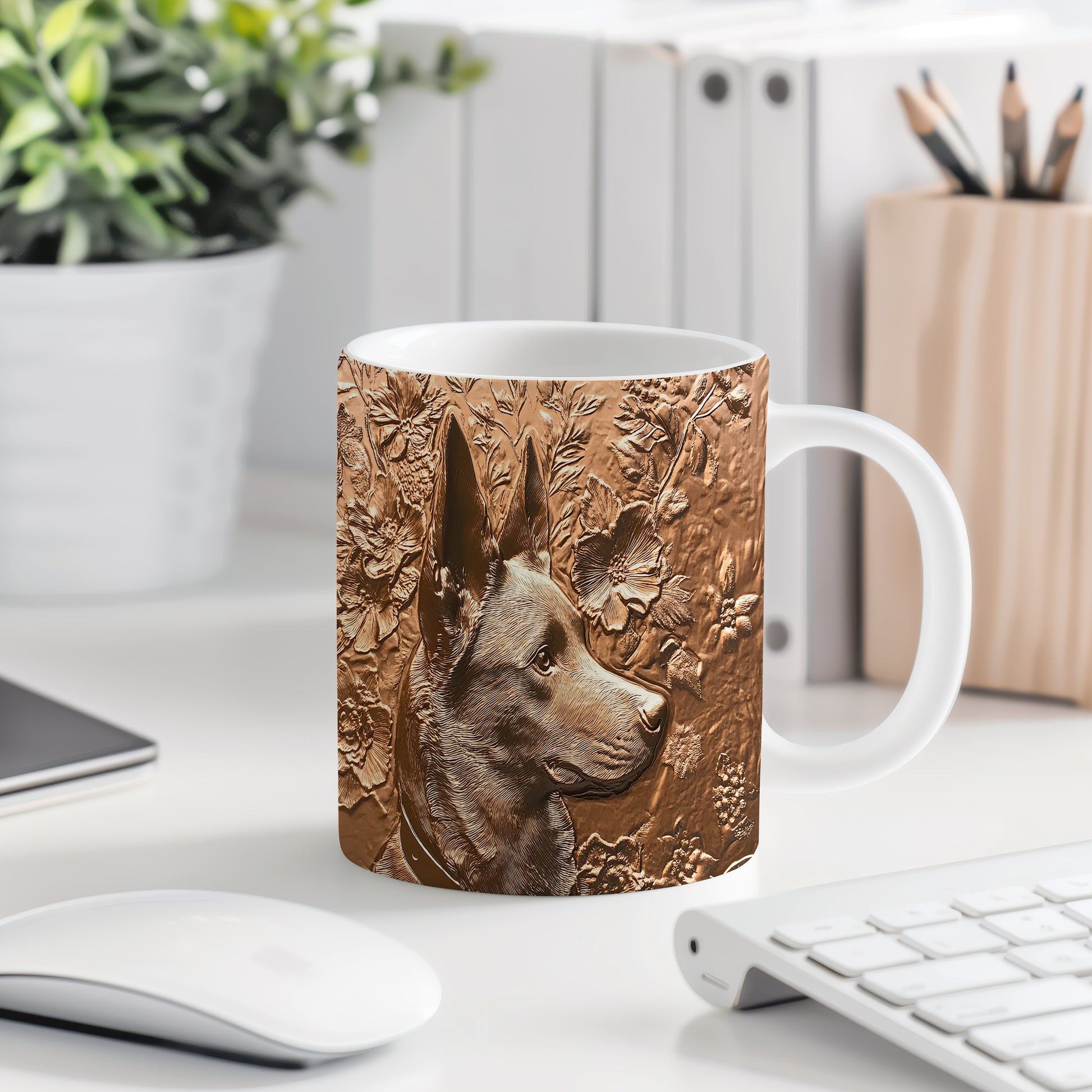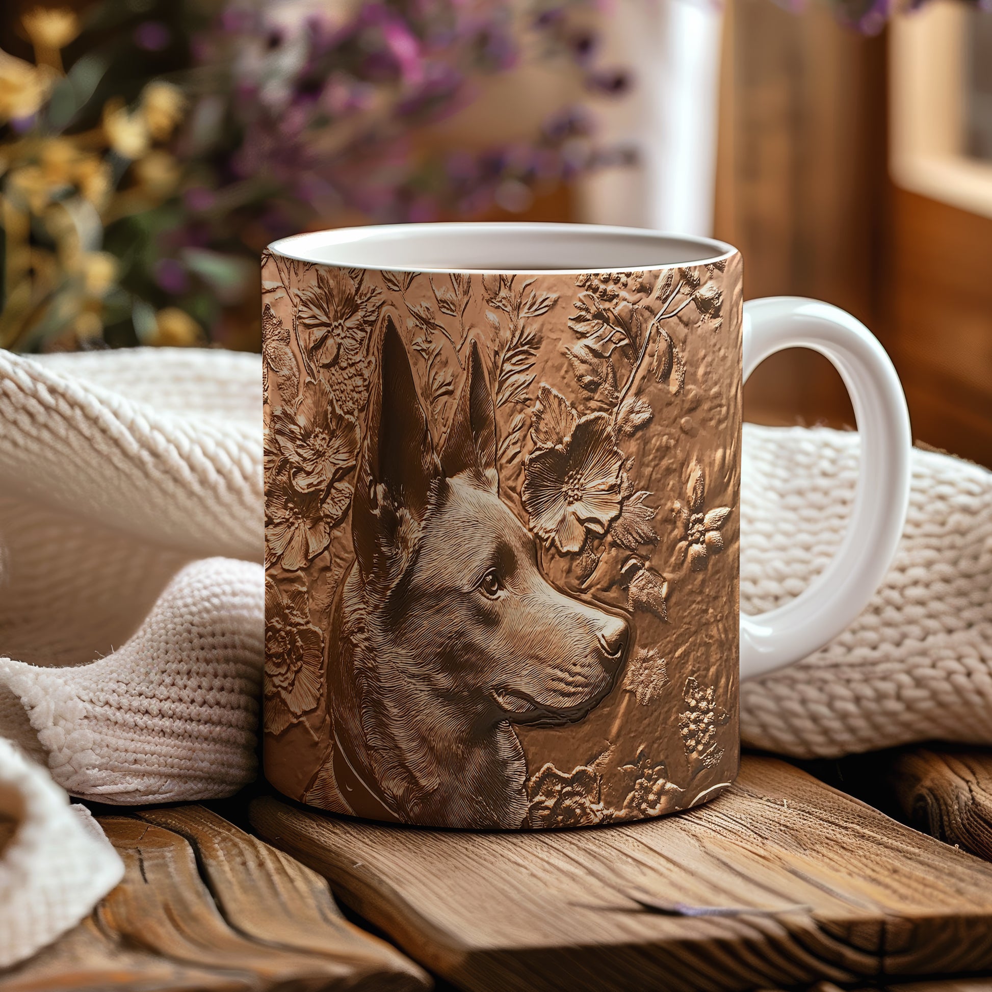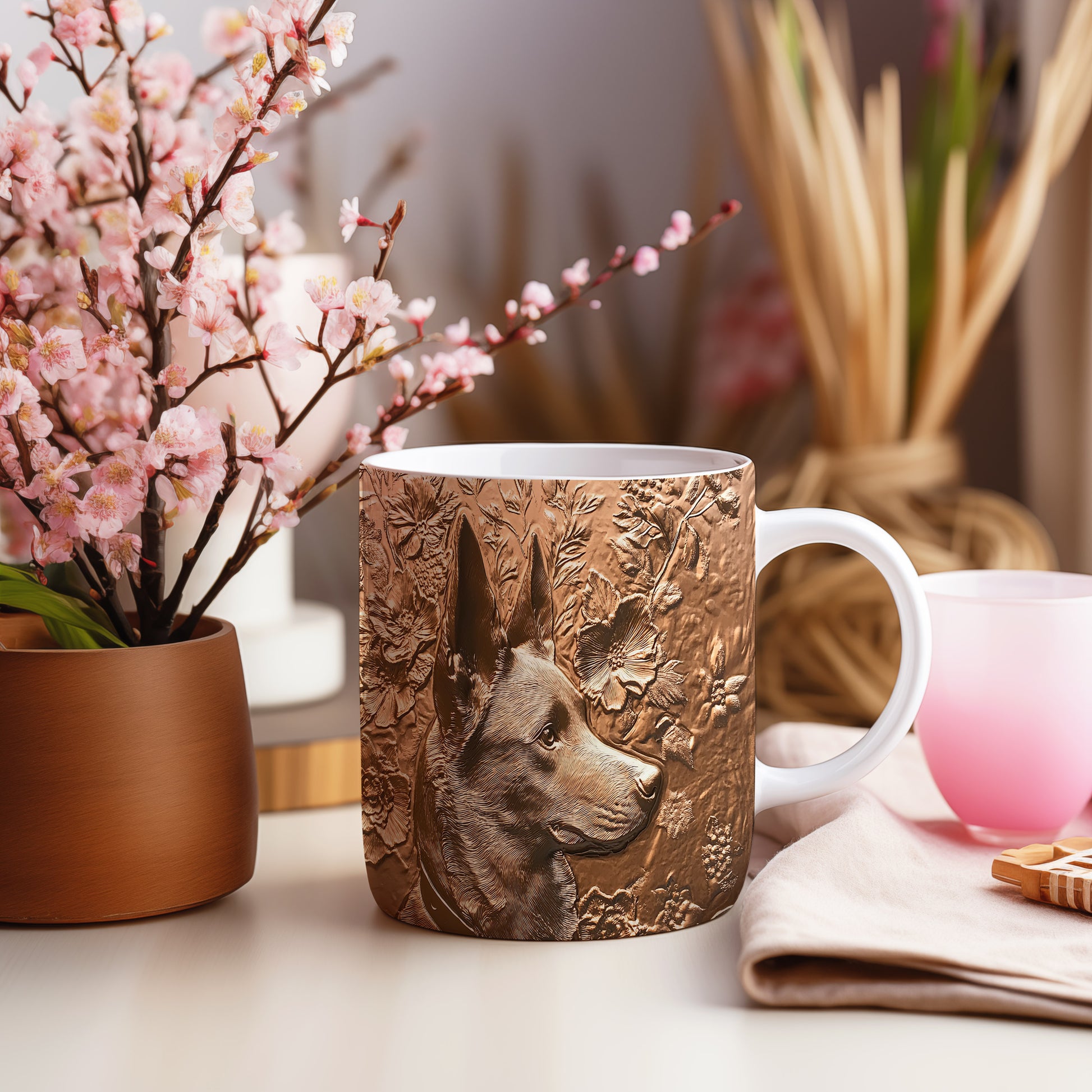 Hrnek s elegantním reliéfem psa obklopeného květinami a listy je skvělým kouskem pro milovníky zvířat. Tento keramický hrnek je ideální jako dárek pro přátele či rodinu, kteří mají rádi přírodu. Materiál: keramika. Objem: 330 ml. Vhodné do myčky i mikrovlnky. Užívejte si svůj oblíbený nápoj s tímto stylovým hrnkem, který přináší radost do každého dne.