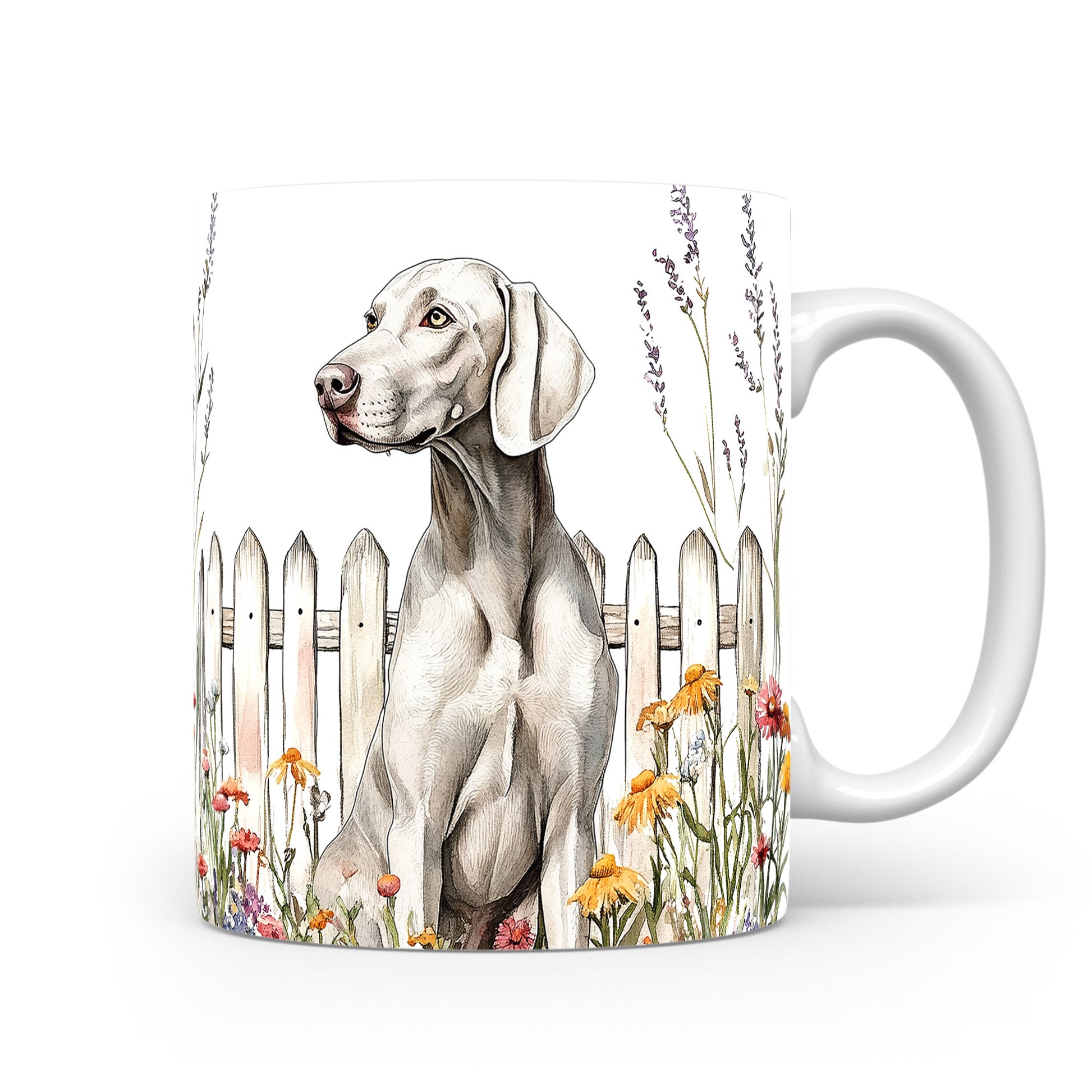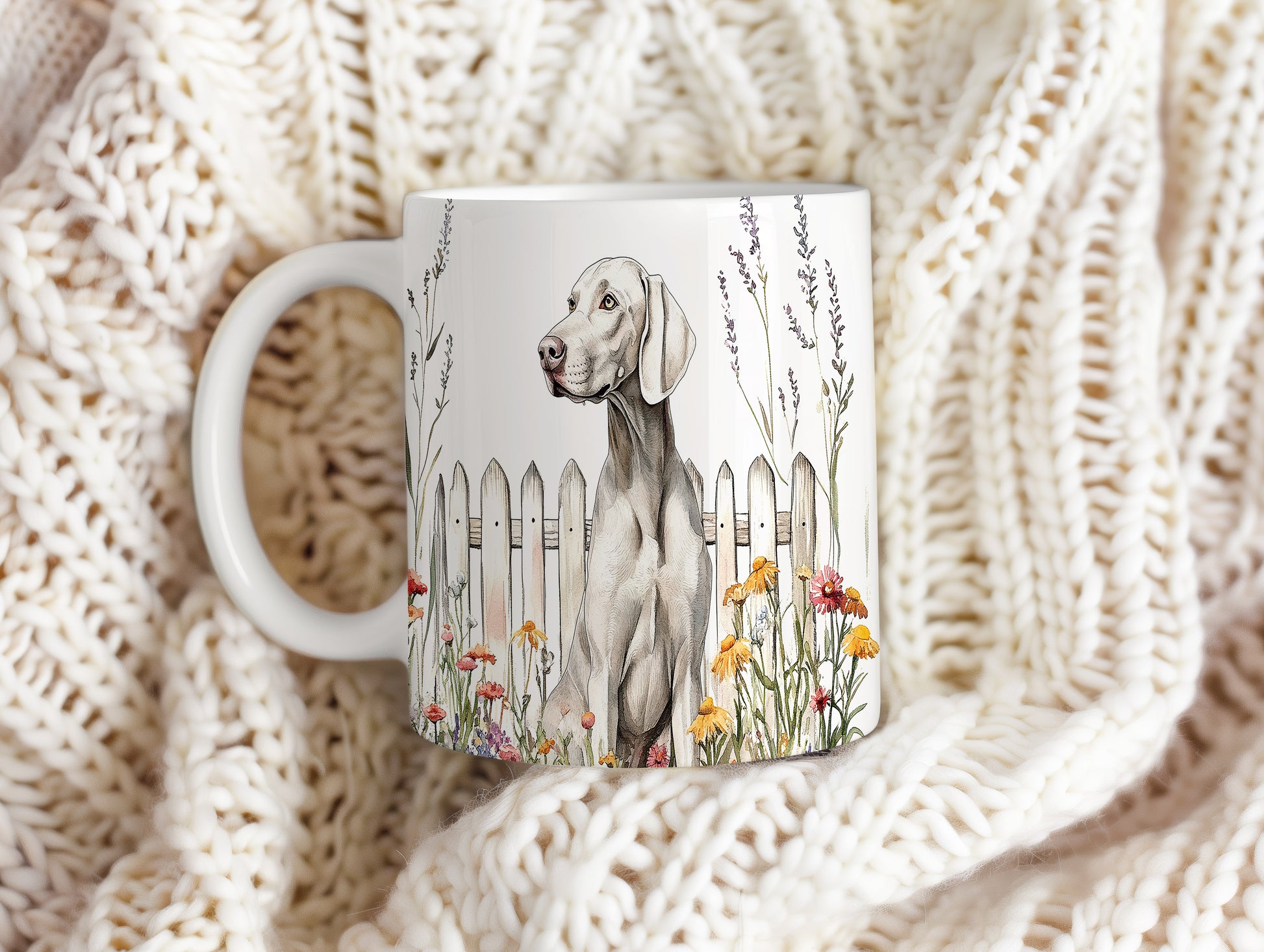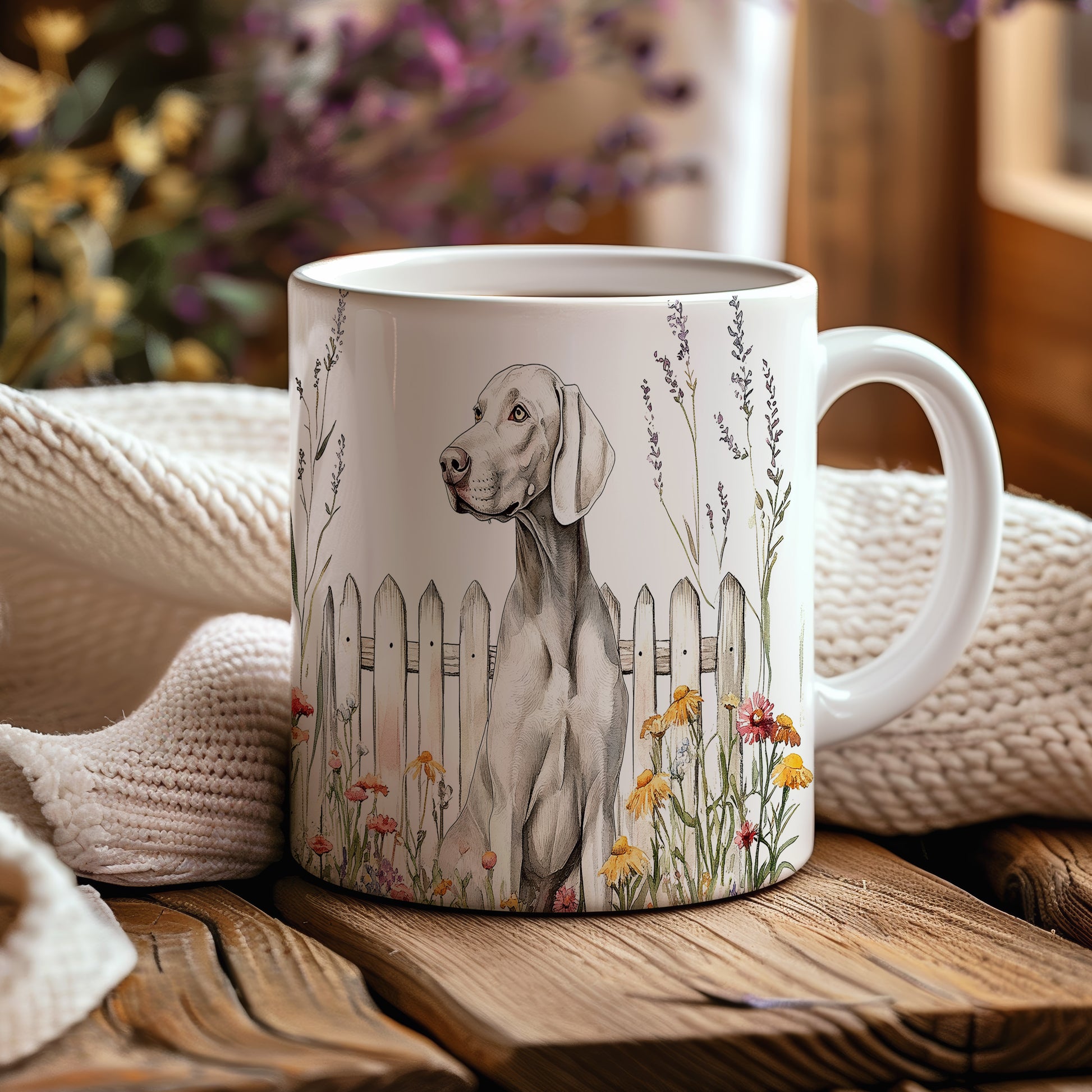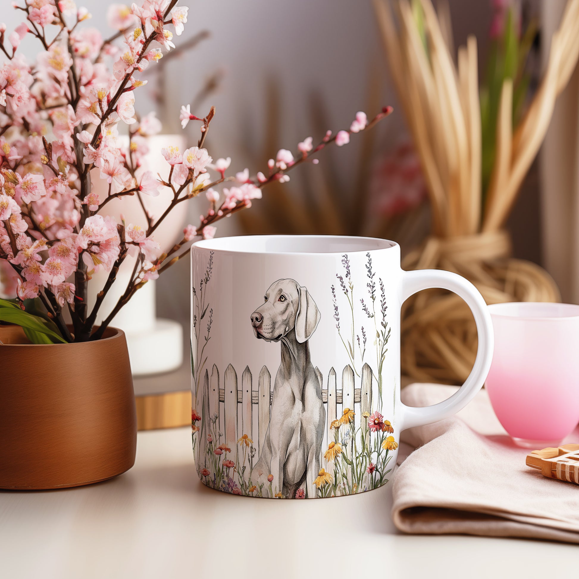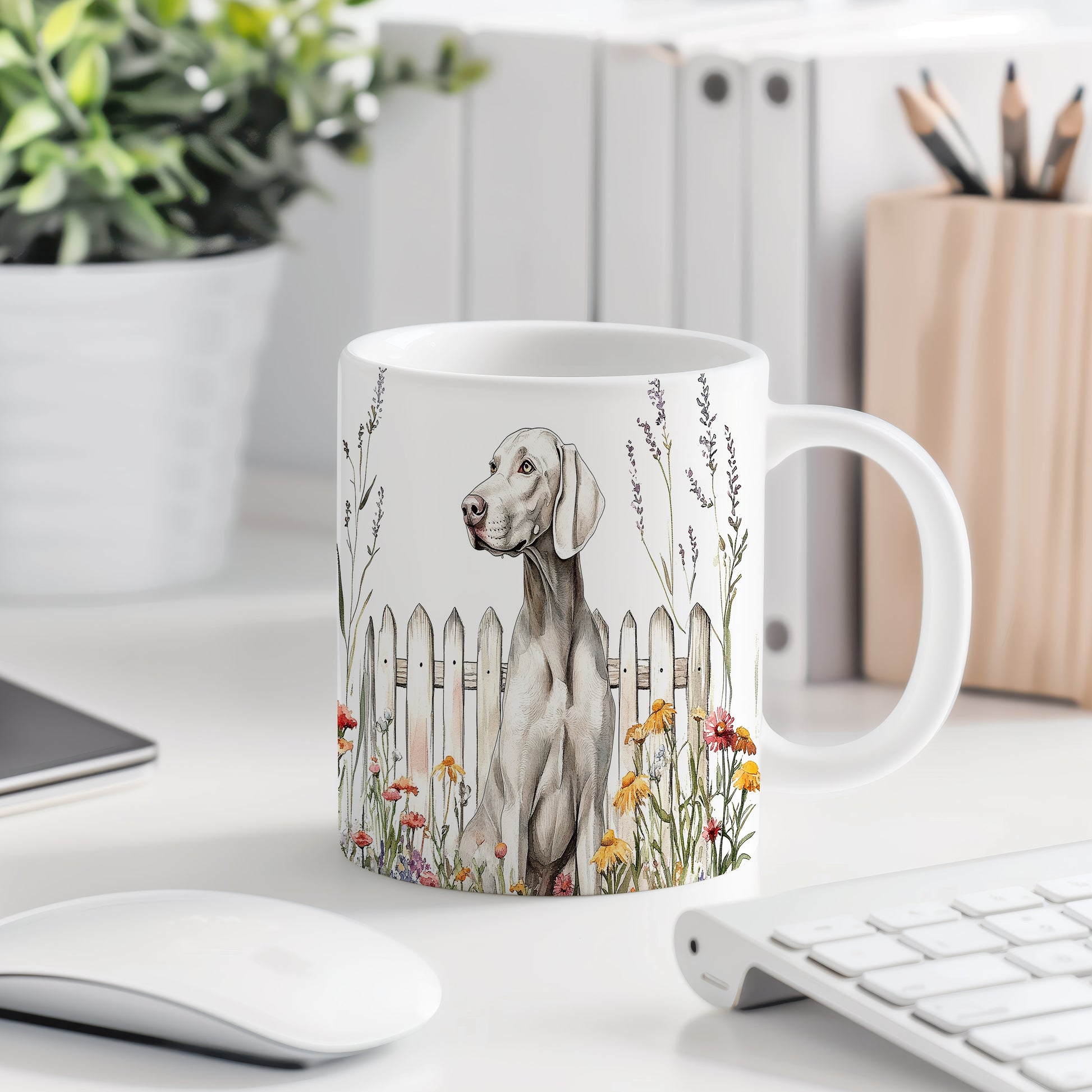 Hrnek s Výmařským ohařem a květinami u plotu