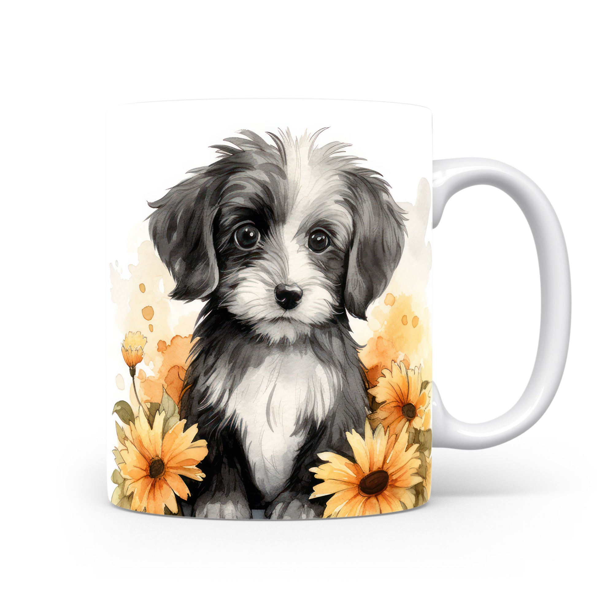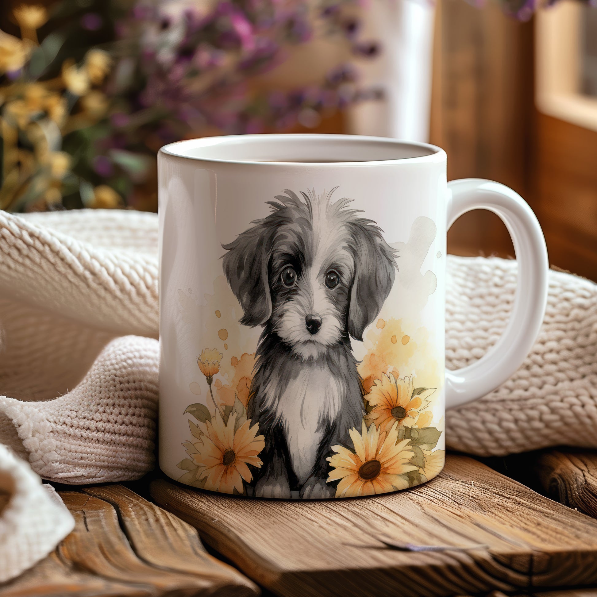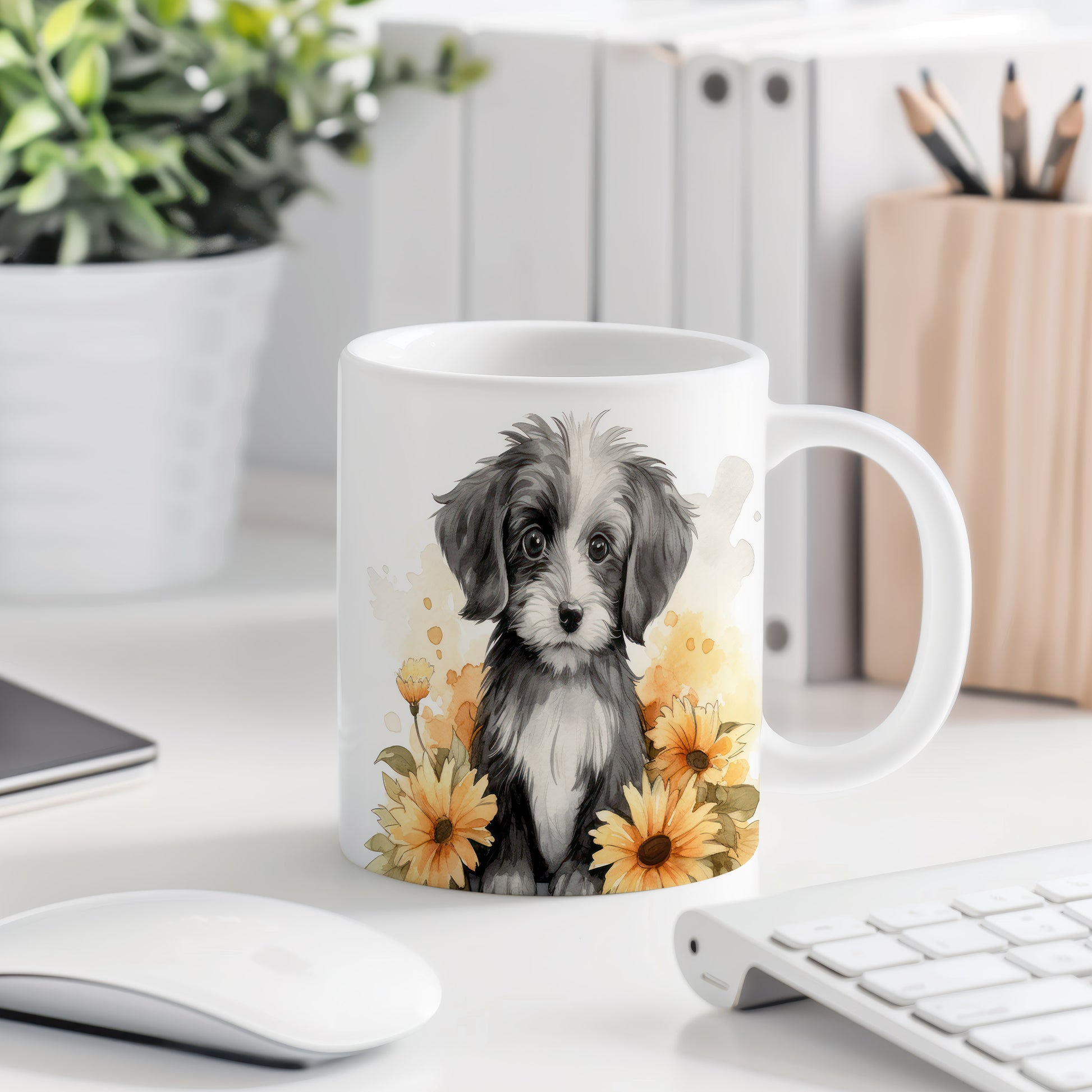 Tento hrnek zobrazuje roztomilé štěně obklopené květinami. Je ideální pro milovníky psů a skvělým dárkem pro každého, kdo má rád zvířata. Materiál: keramika. Objem: 330 ml. Vhodné do myčky i mikrovlnky. Používání tohoto hrnku vám přinese radost při každém doušku vašeho oblíbeného nápoje.