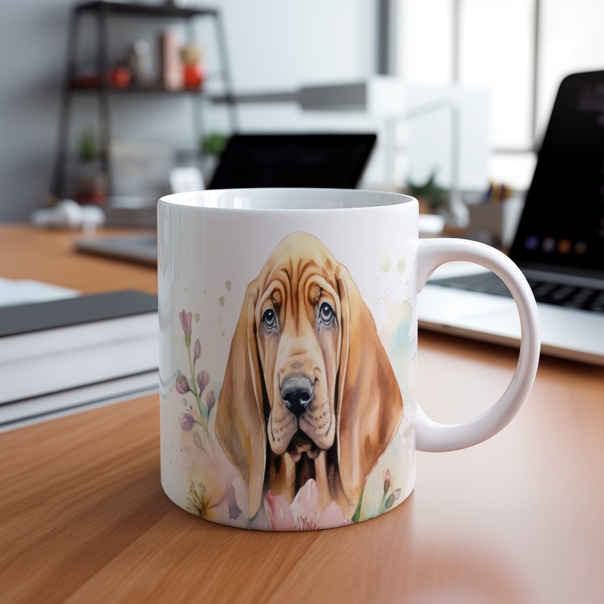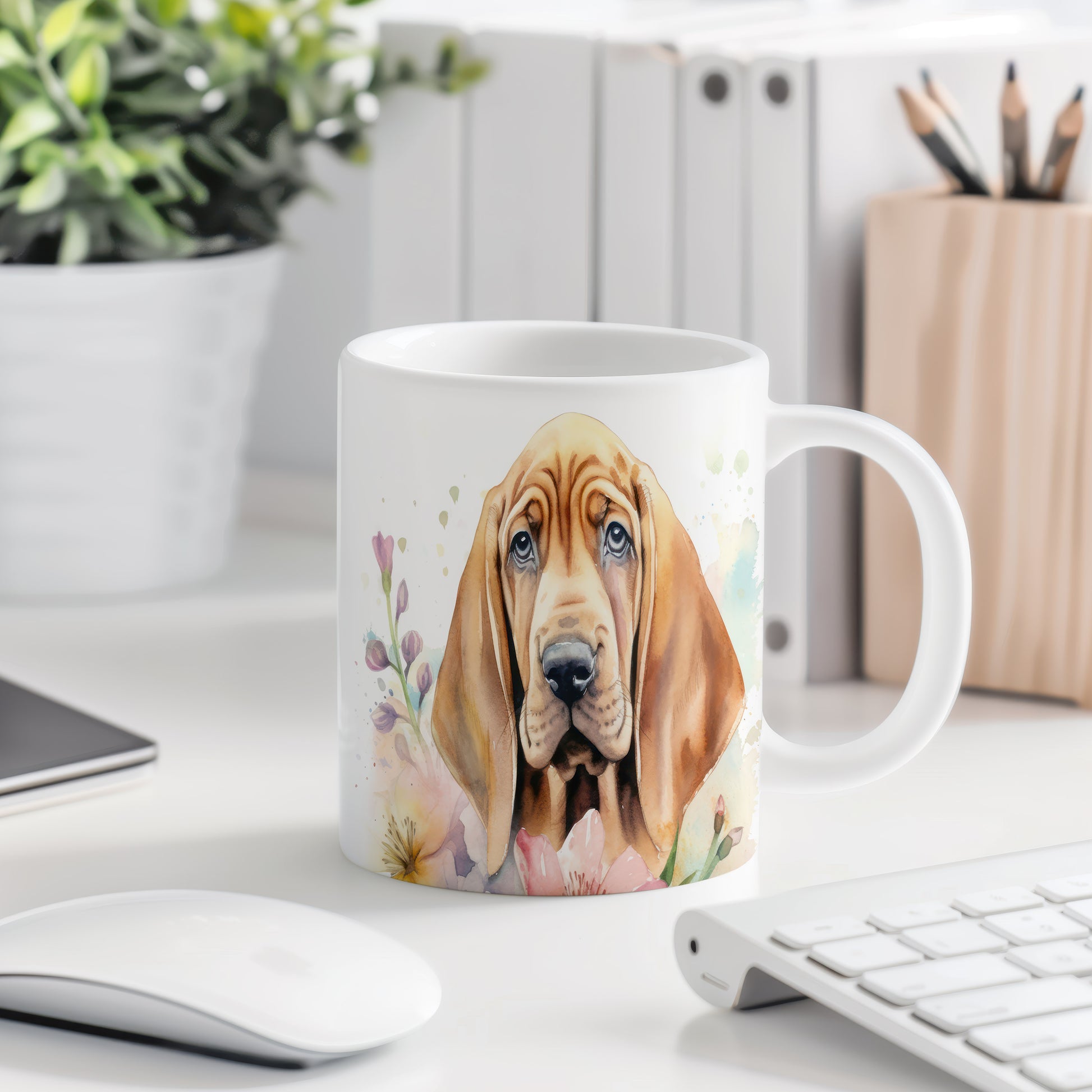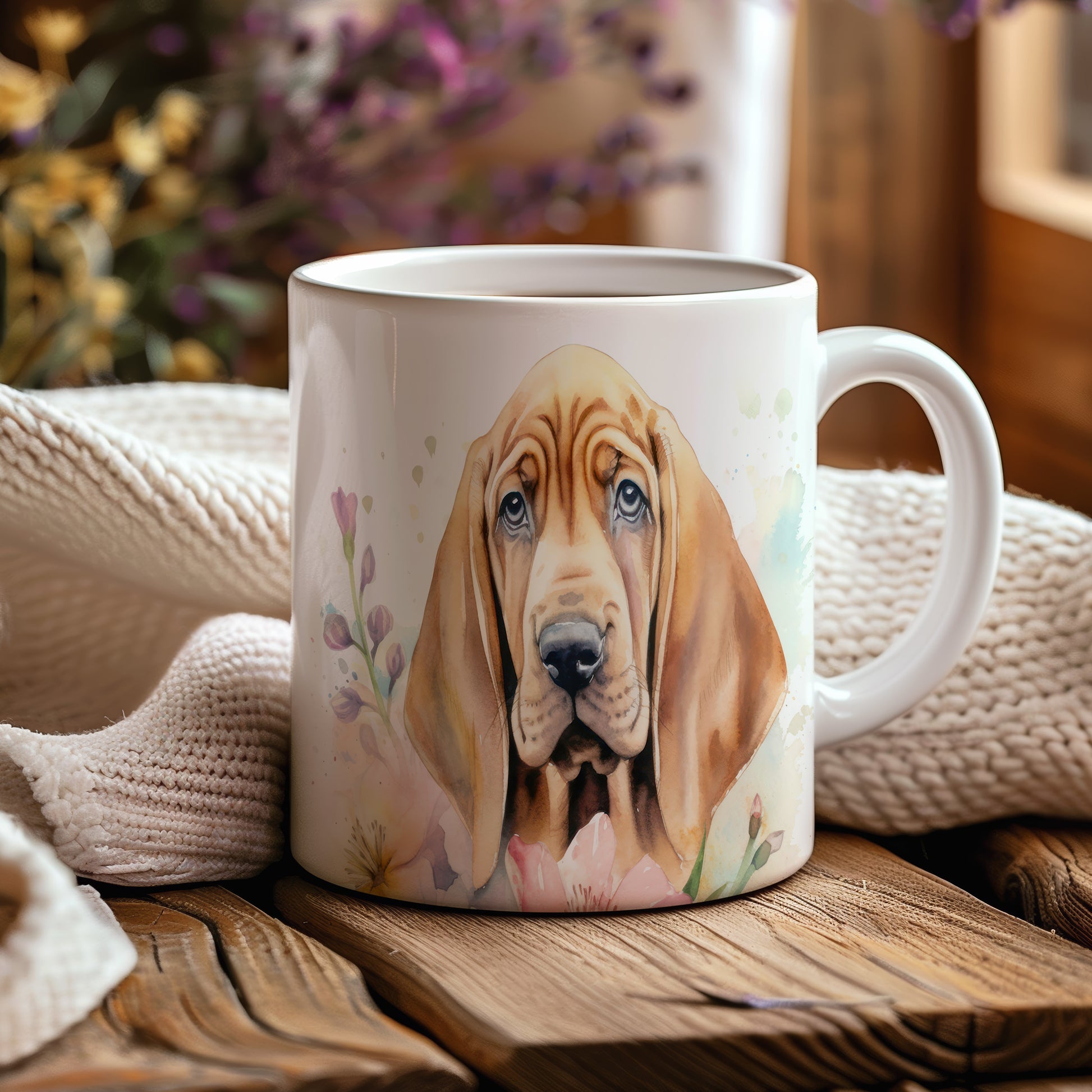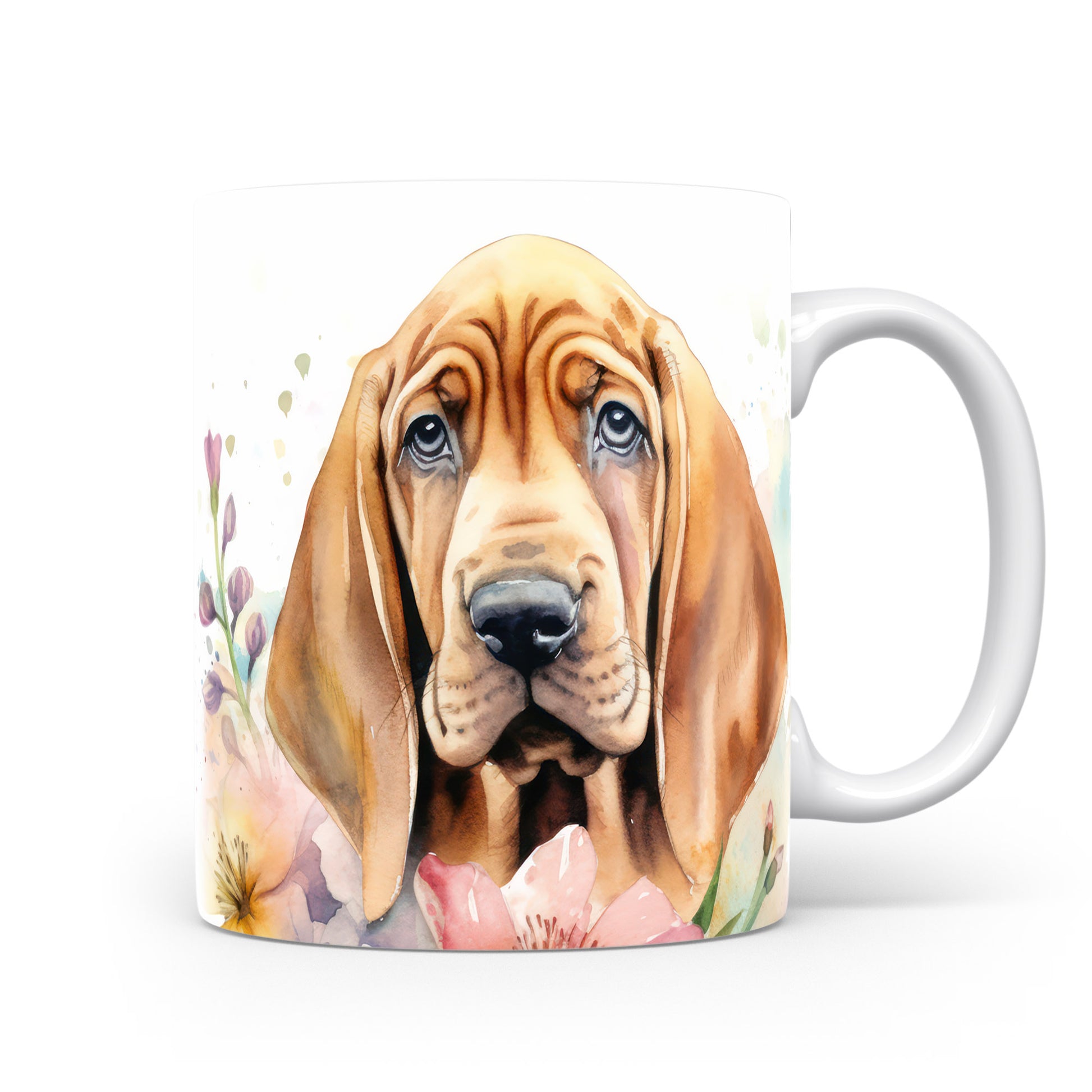 Hrnek s bloodhound štěnětem a květinami v akvarelu