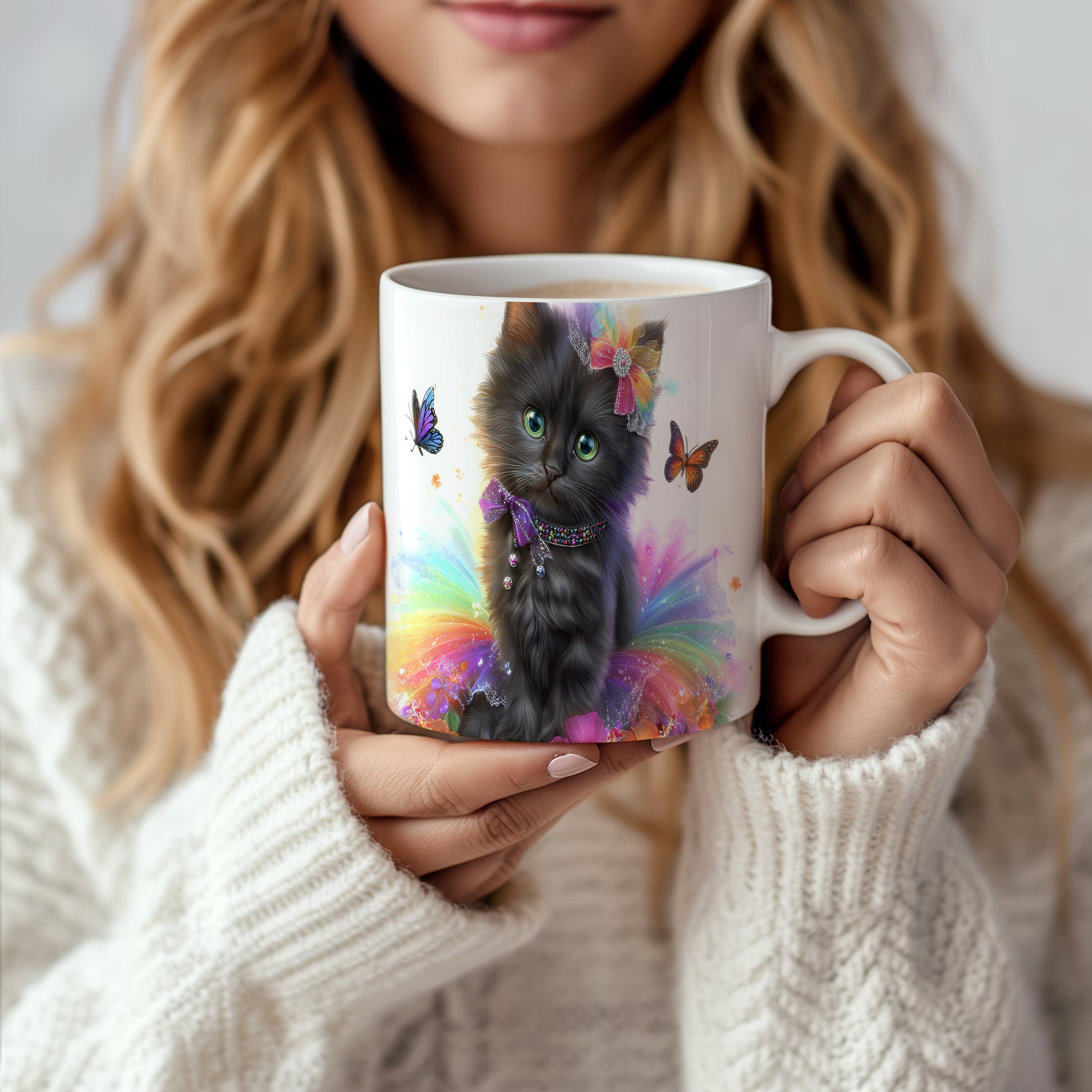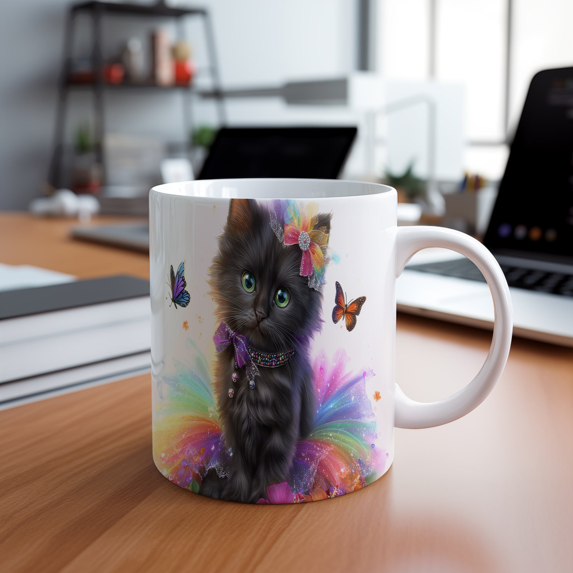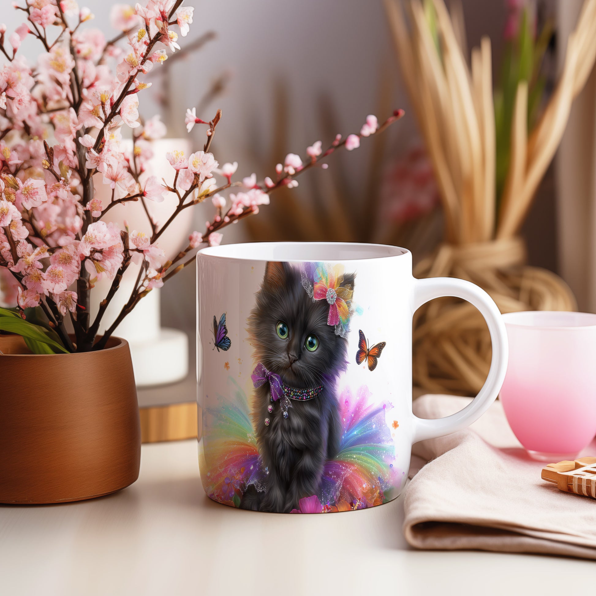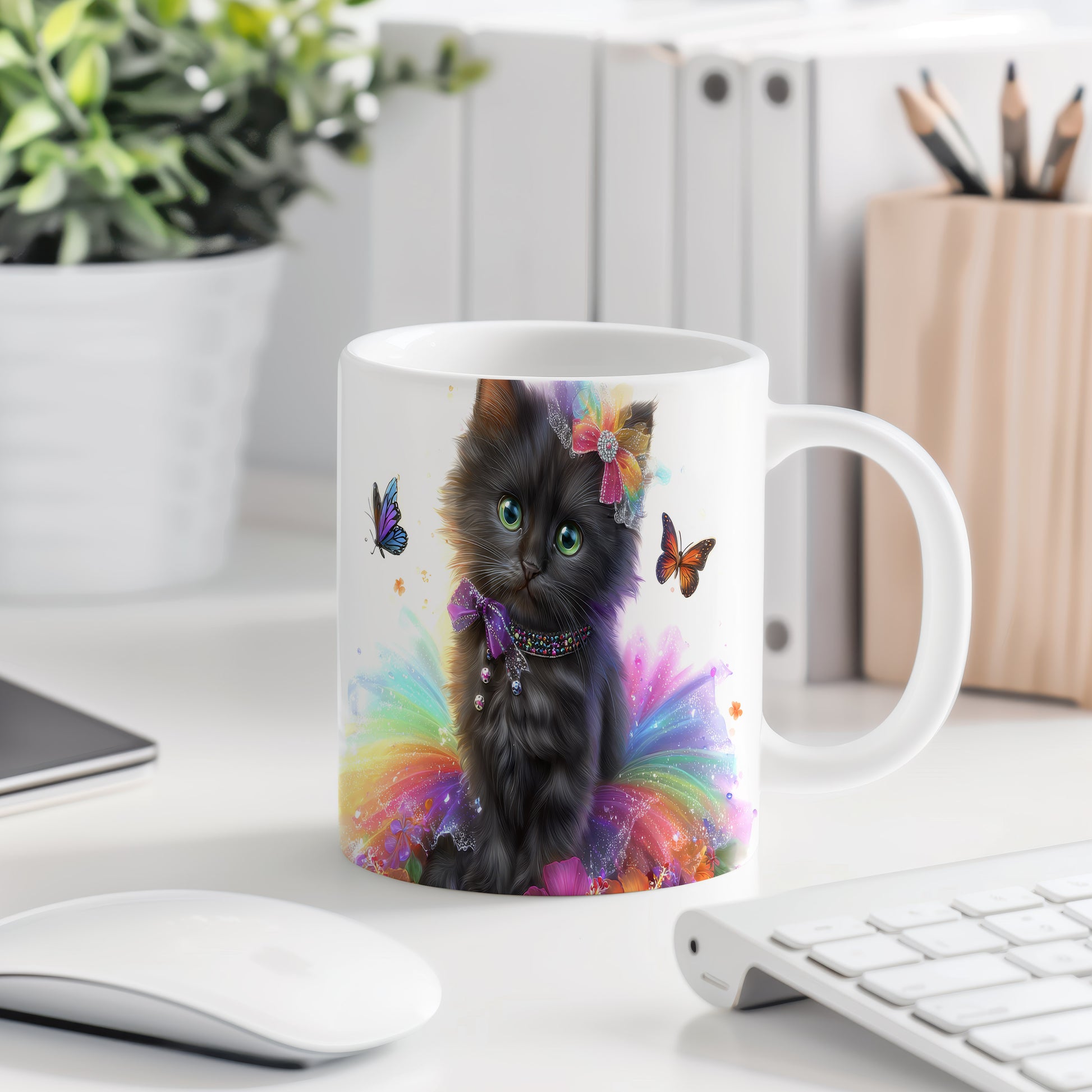 Hrnek s roztomilou černou kočičkou a barevnými mašlemi je ideální pro všechny milovníky těchto mazlíčků. Tento hrnek potěší nejen vás, ale i jako skvělý dárek pro vaše blízké. Materiál: keramika. Objem: 330 ml. Vhodné do myčky i mikrovlnky. Užívejte si svůj oblíbený nápoj s tímto hrnkem, který přináší radost a útulnost do každého dne.