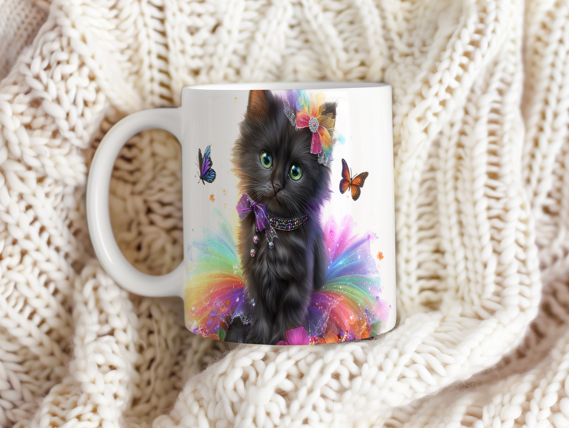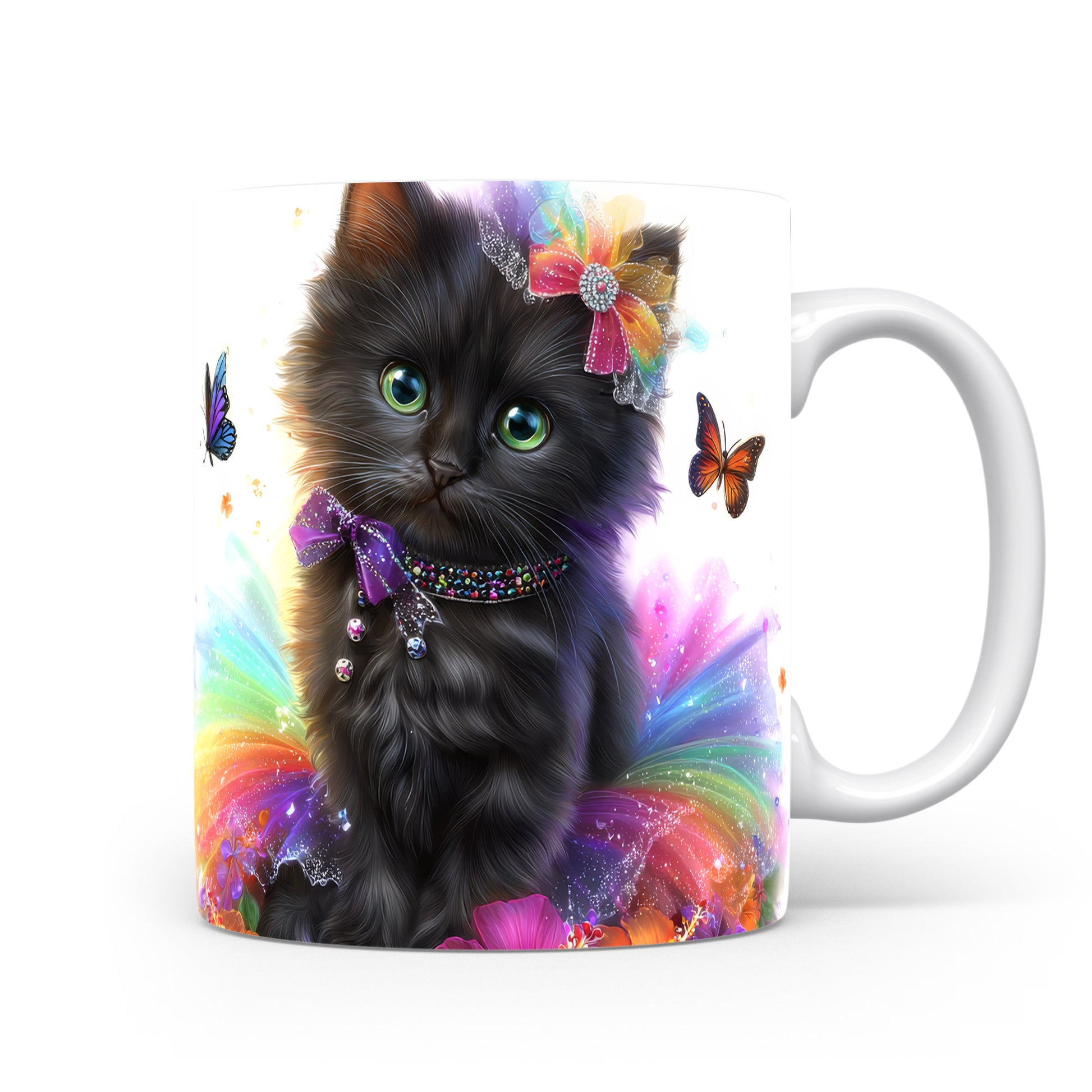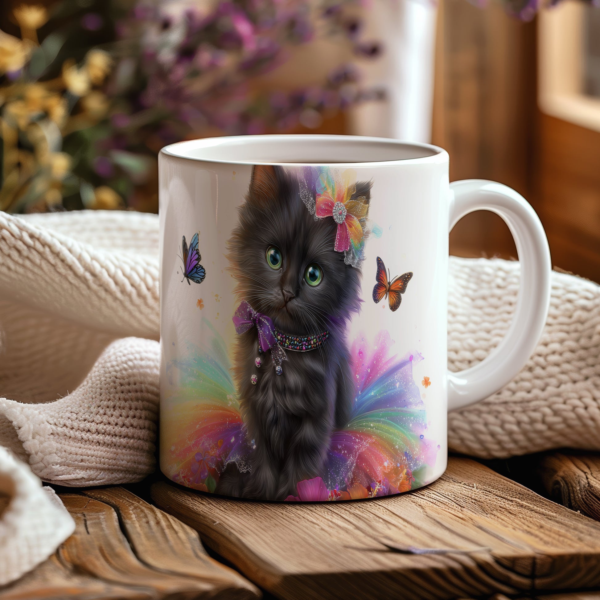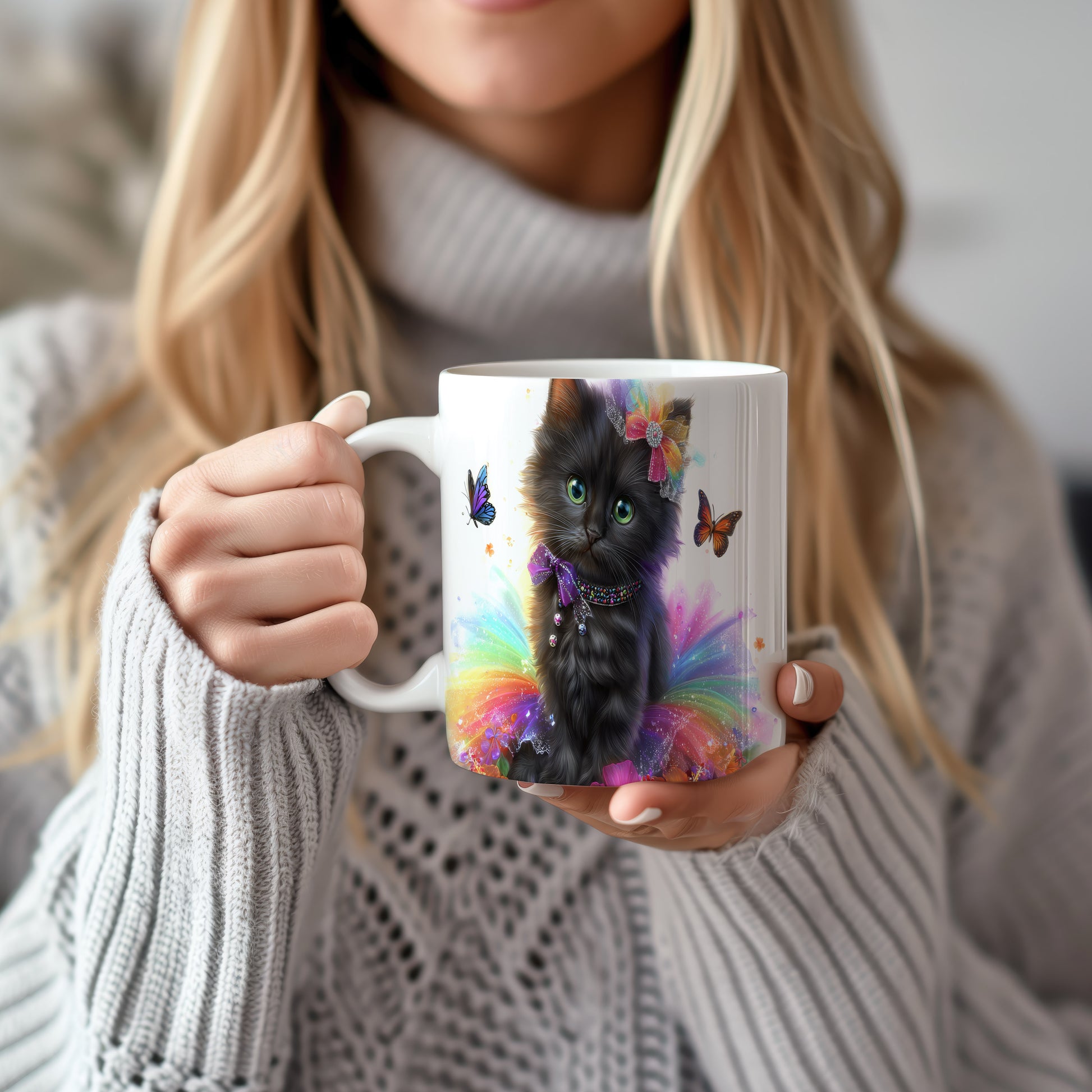 Hrnek s roztomilou černou kočičkou a barevnými mašlemi je ideální pro všechny milovníky těchto mazlíčků. Tento hrnek potěší nejen vás, ale i jako skvělý dárek pro vaše blízké. Materiál: keramika. Objem: 330 ml. Vhodné do myčky i mikrovlnky. Užívejte si svůj oblíbený nápoj s tímto hrnkem, který přináší radost a útulnost do každého dne.