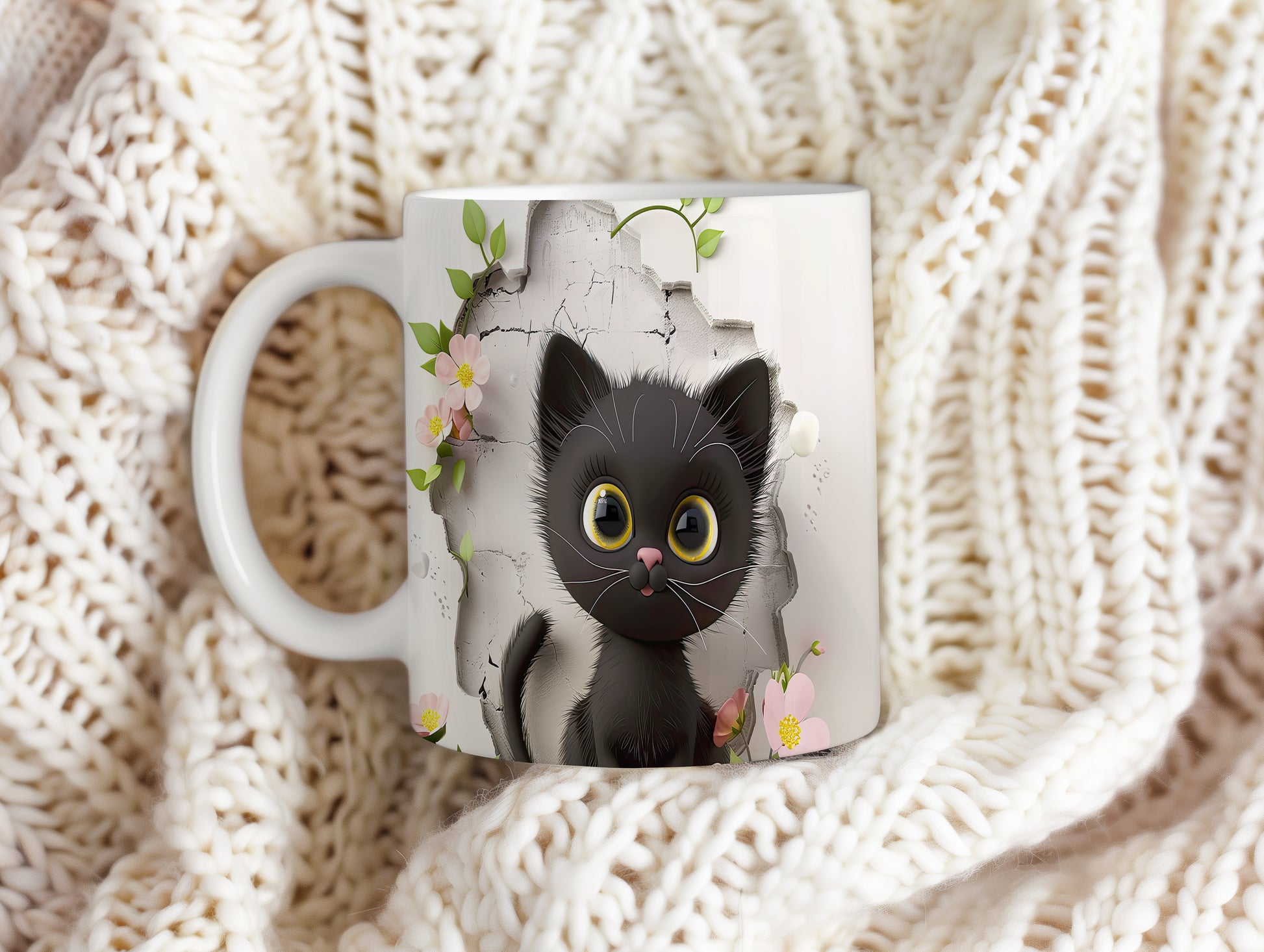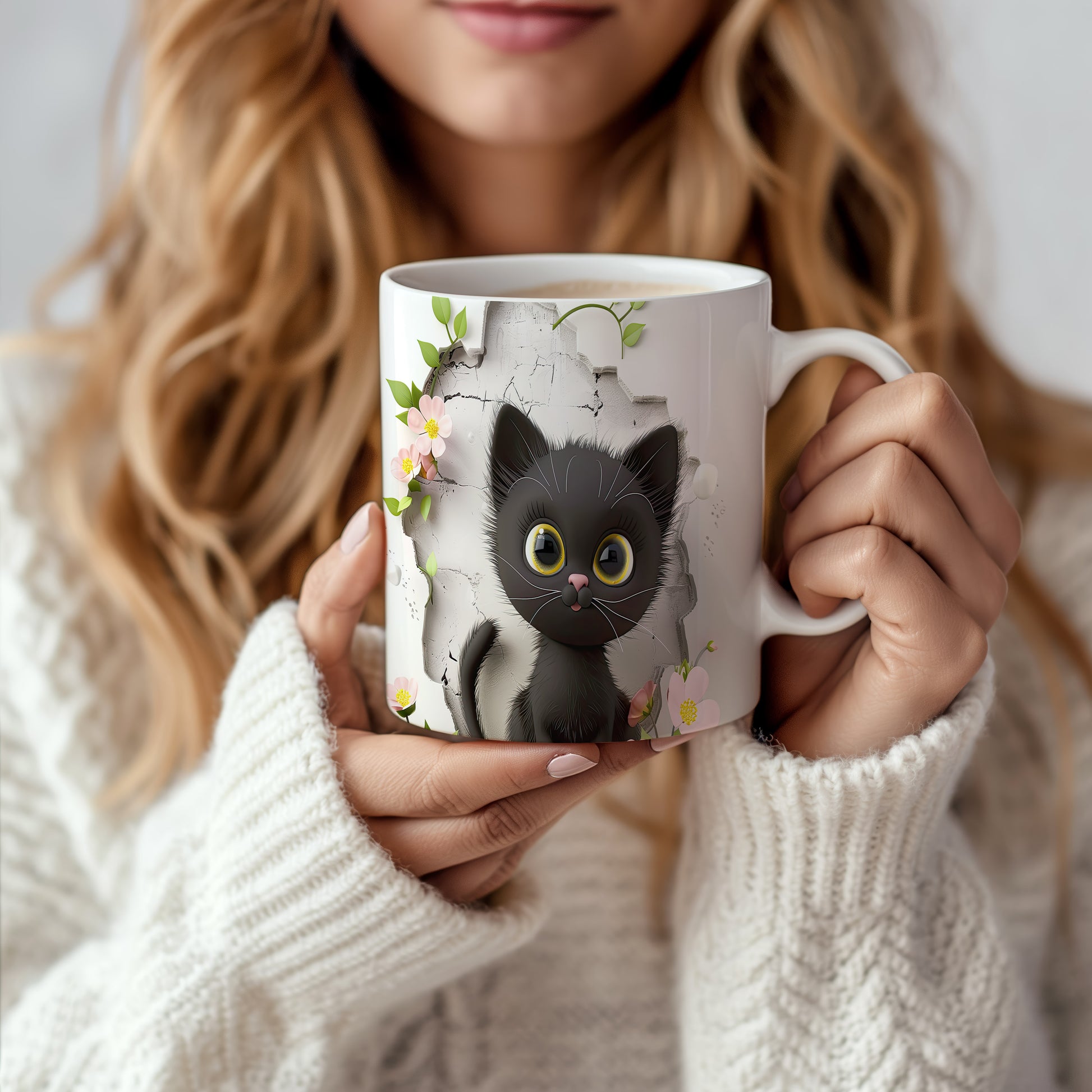 Hrnek s roztomilou černou kočičkou – velkýma očima