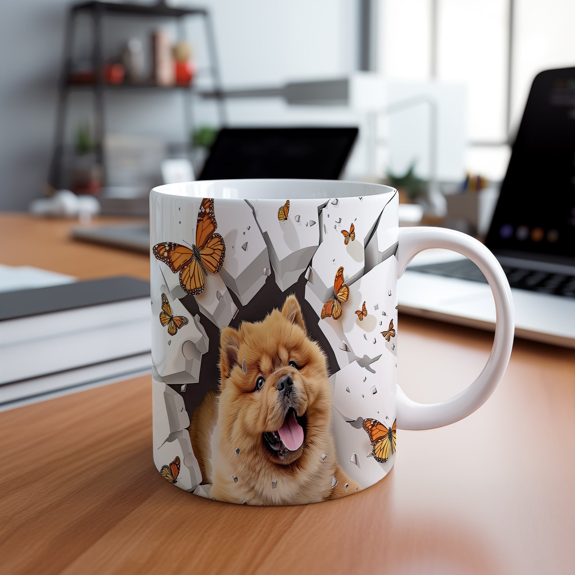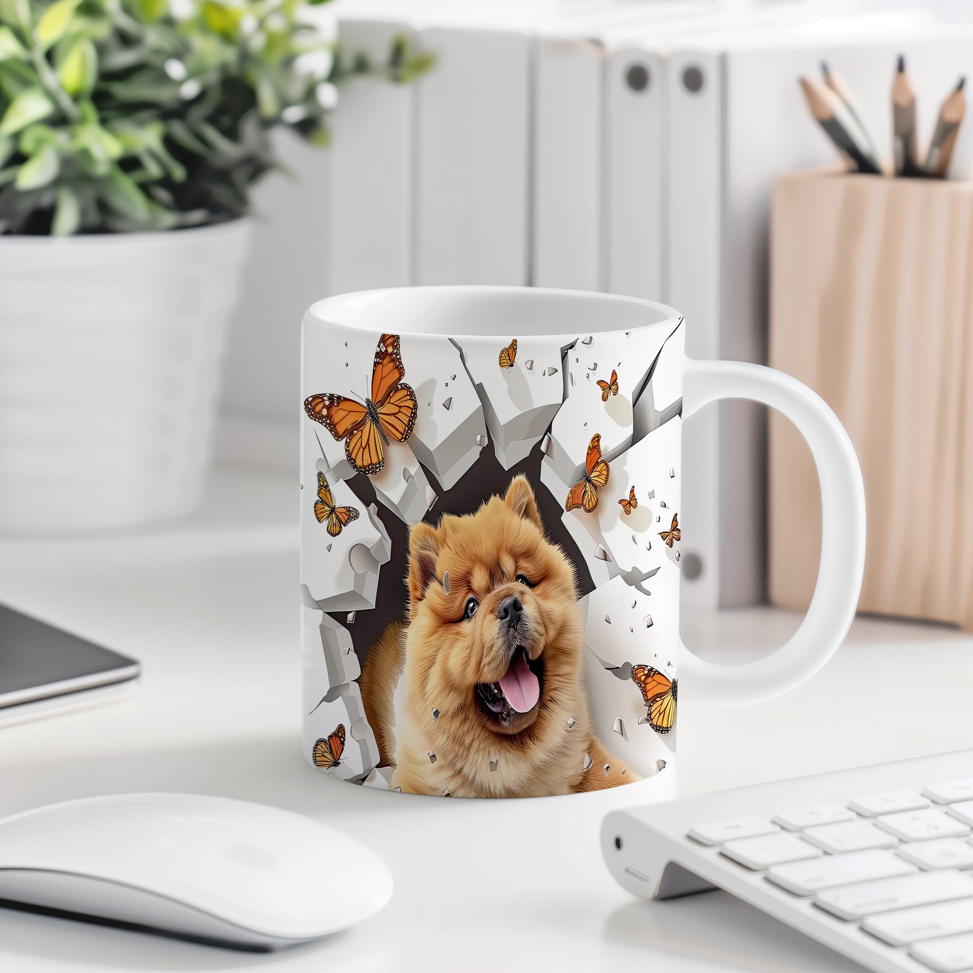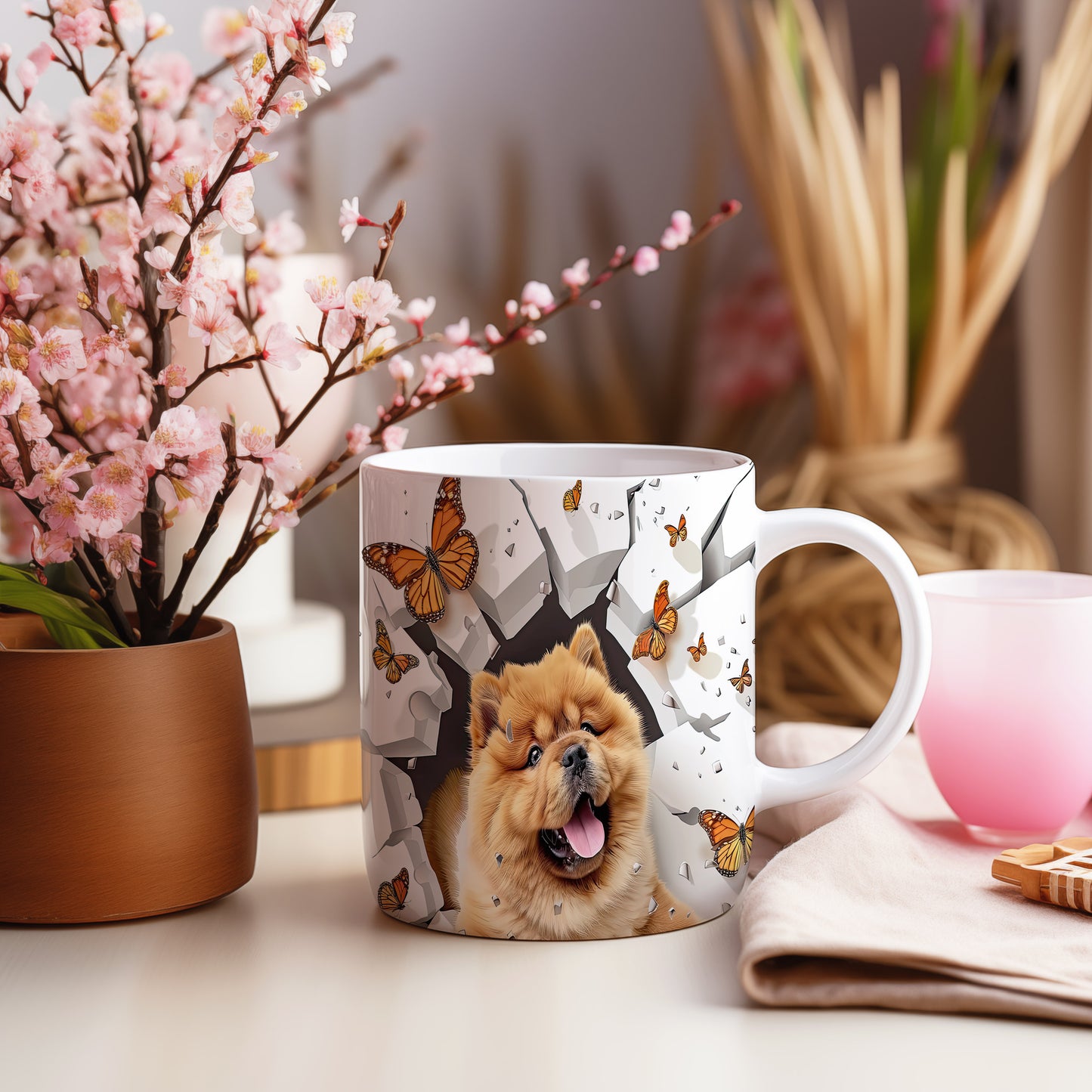 Tento keramický hrnek zobrazuje veseloého chow chow obklopeného barevnými motýly. Je ideální pro milovníky psů a skvělým dárkem pro každého, kdo si rád vychutná ranní kávu nebo čaj. Materiál: keramika. Objem: 330 ml. Vhodné do myčky i mikrovlnky. Díky svému designu přináší radost do každého dne.