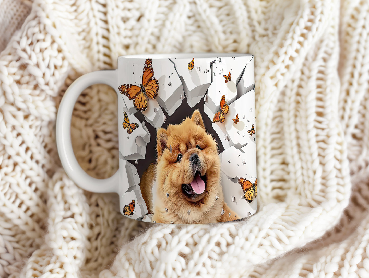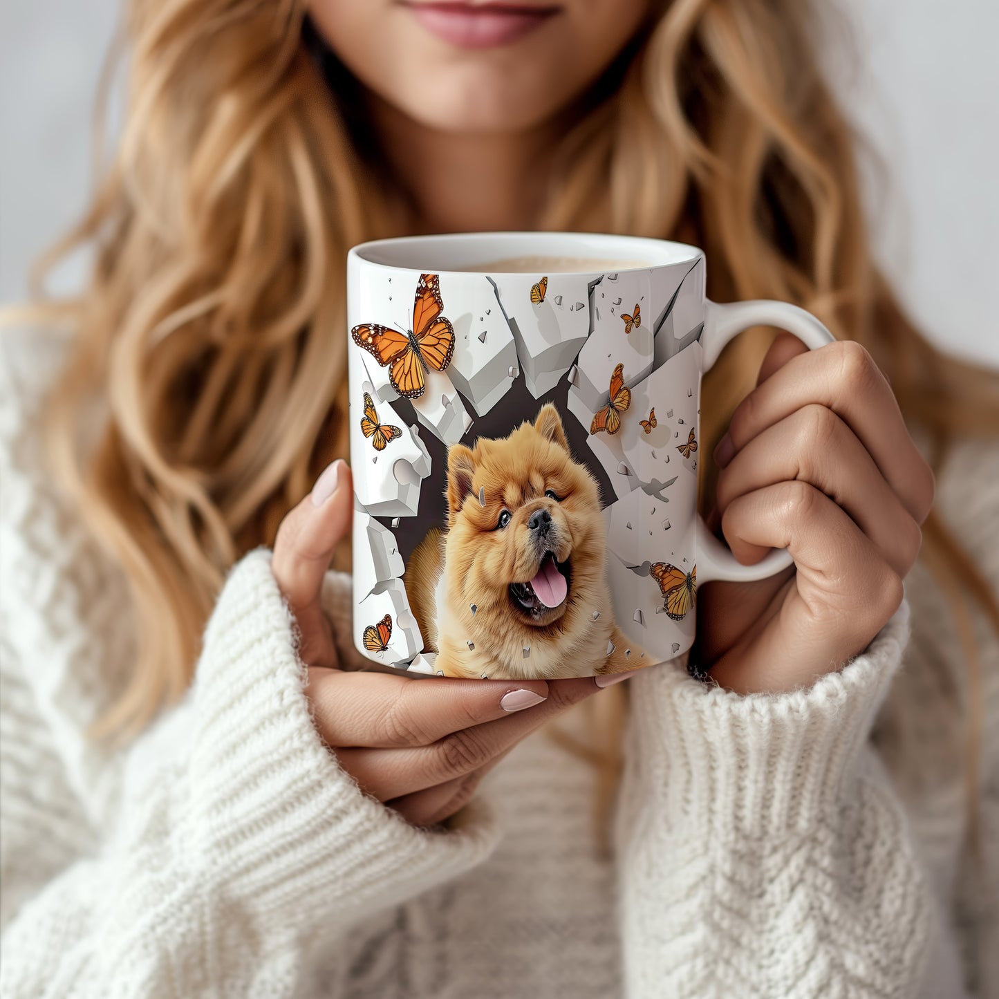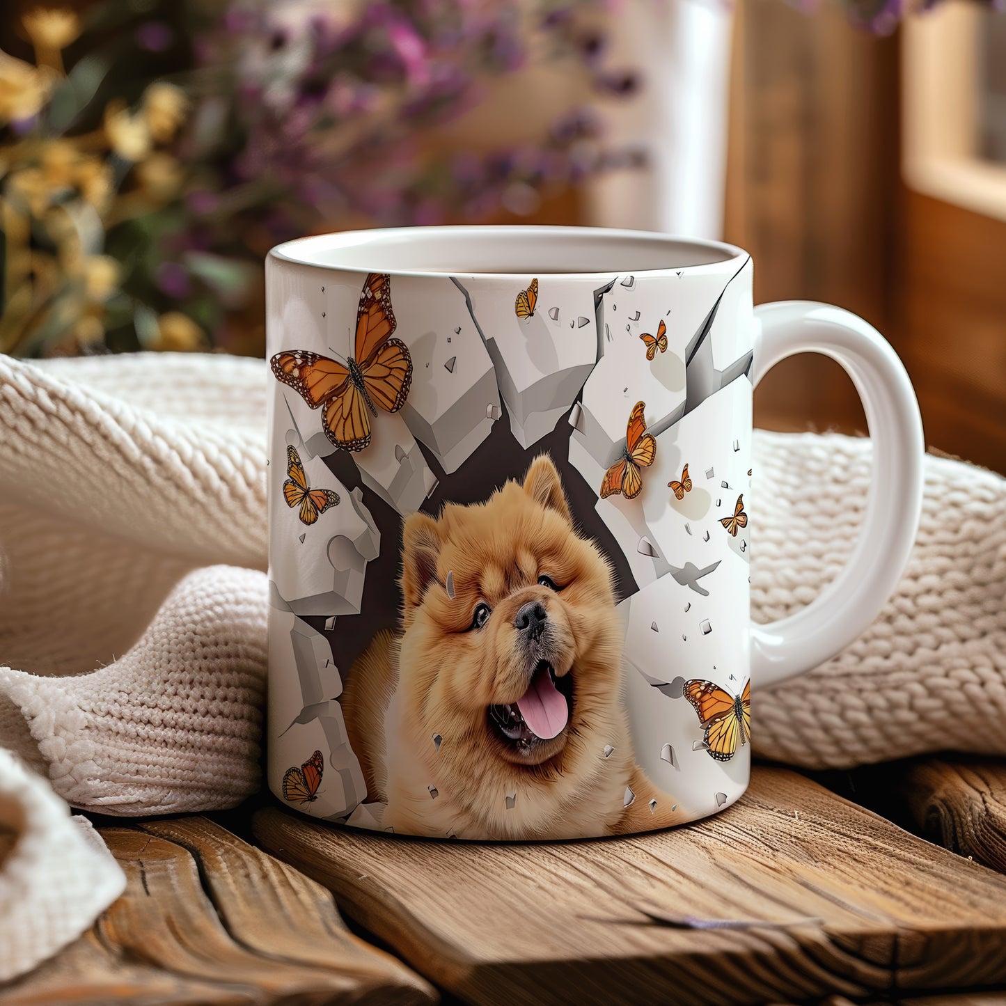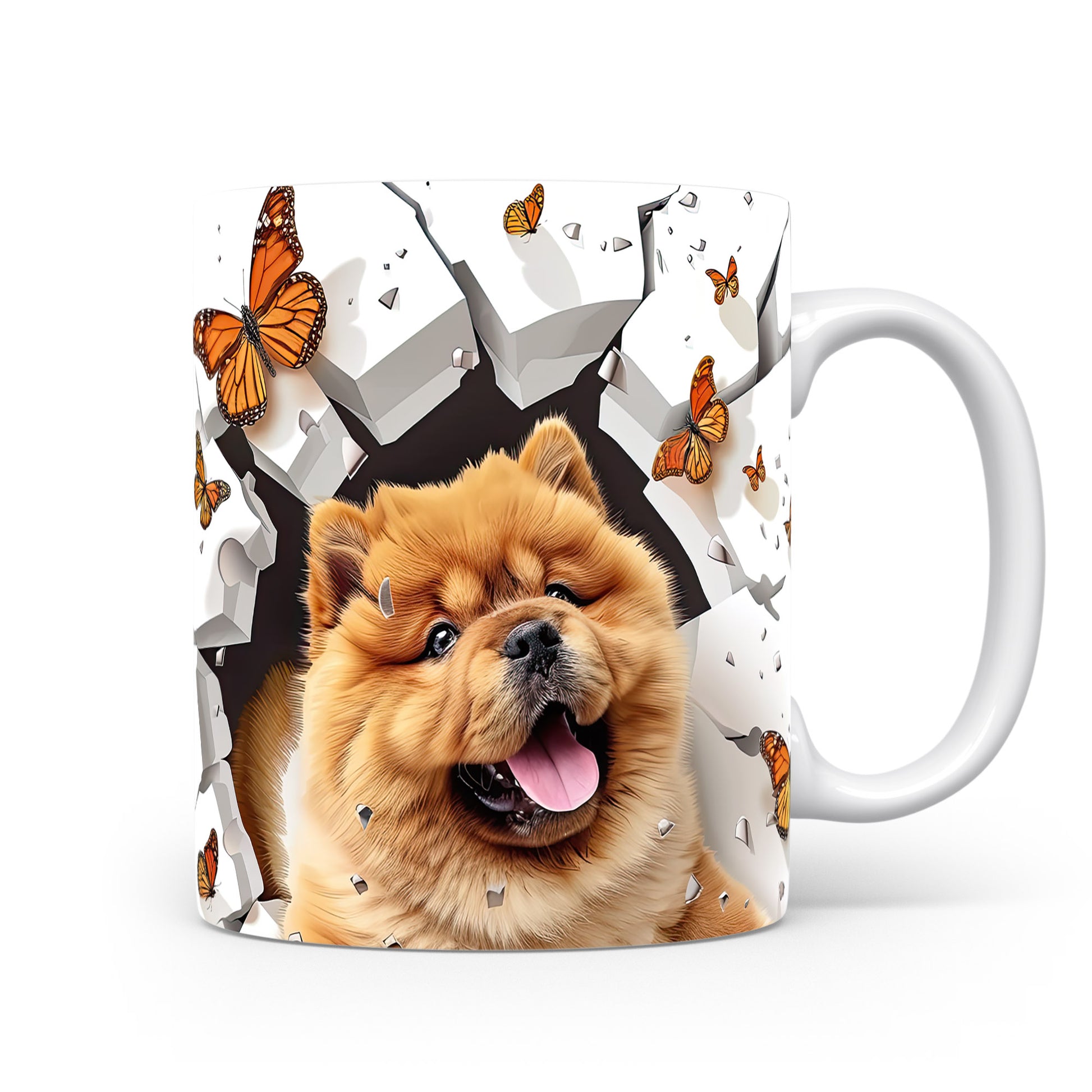Tento keramický hrnek zobrazuje veseloého chow chow obklopeného barevnými motýly. Je ideální pro milovníky psů a skvělým dárkem pro každého, kdo si rád vychutná ranní kávu nebo čaj. Materiál: keramika. Objem: 330 ml. Vhodné do myčky i mikrovlnky. Díky svému designu přináší radost do každého dne.