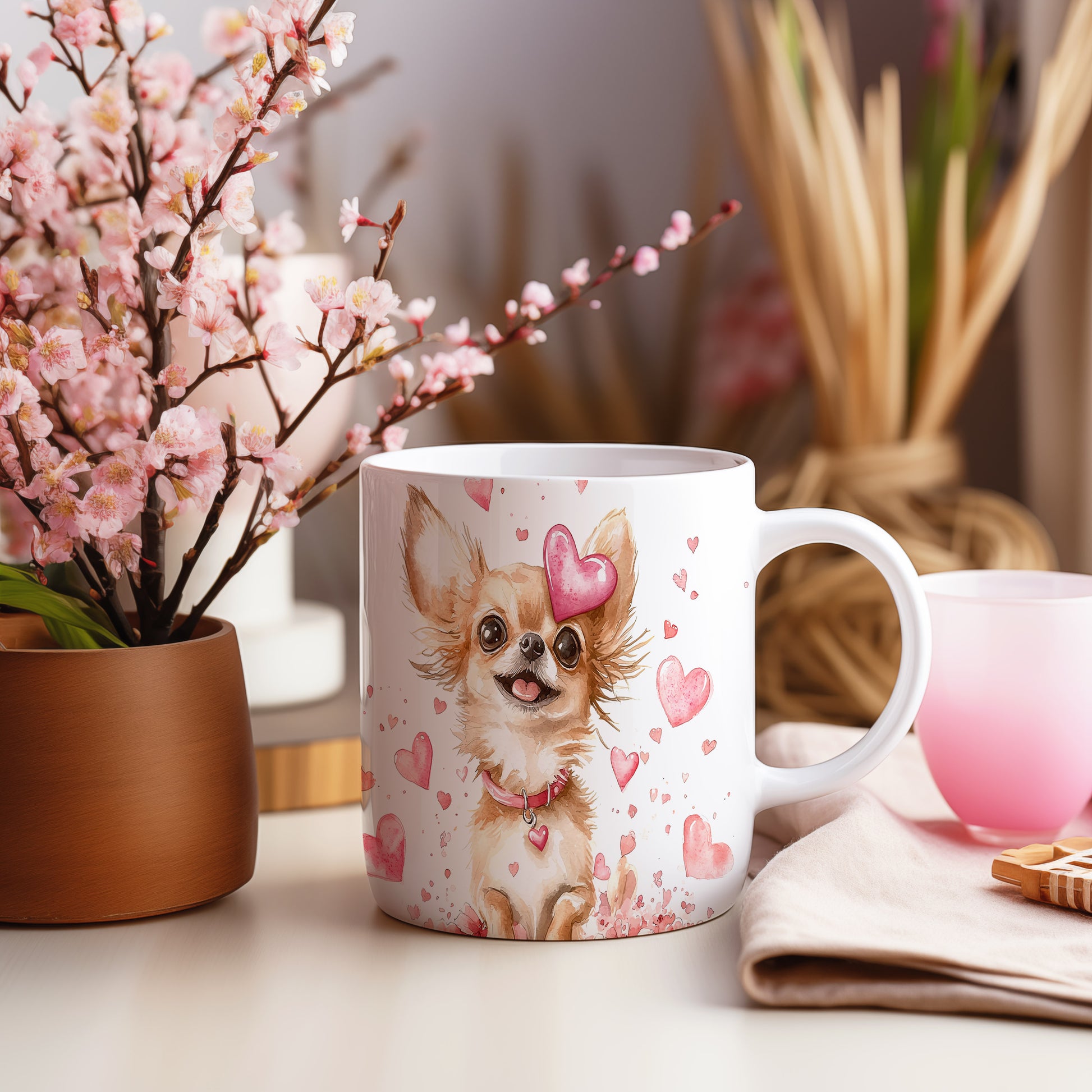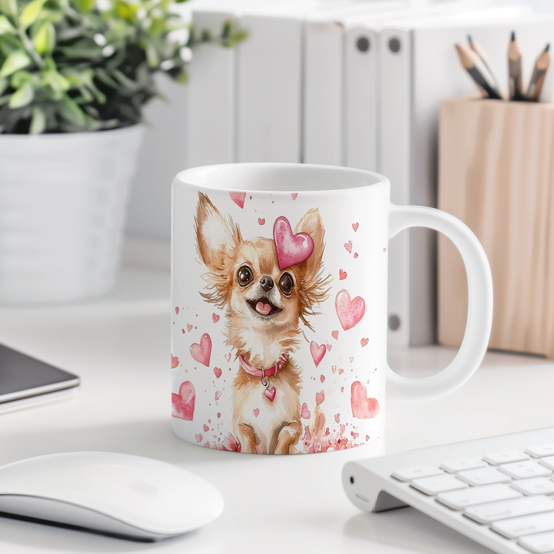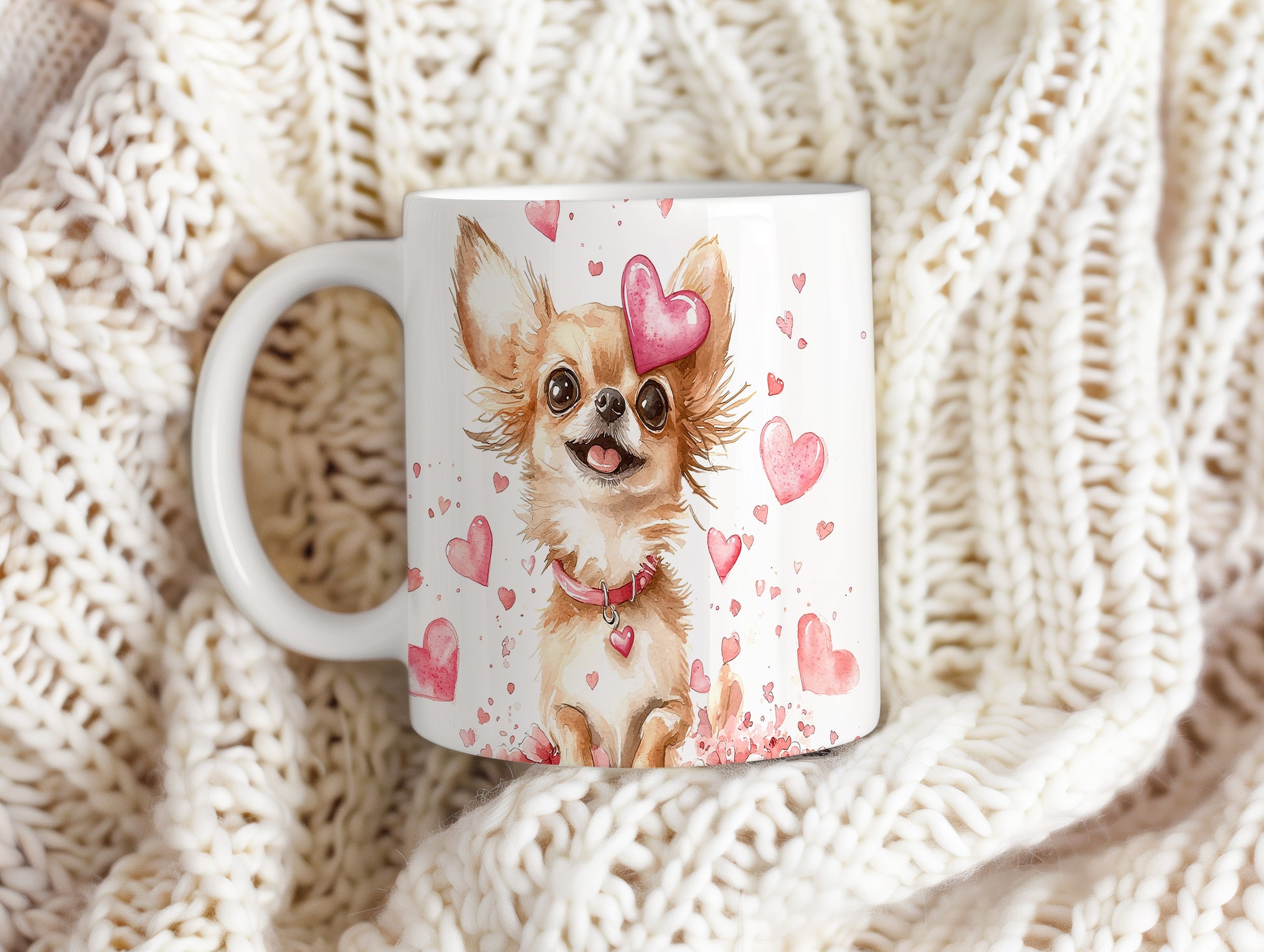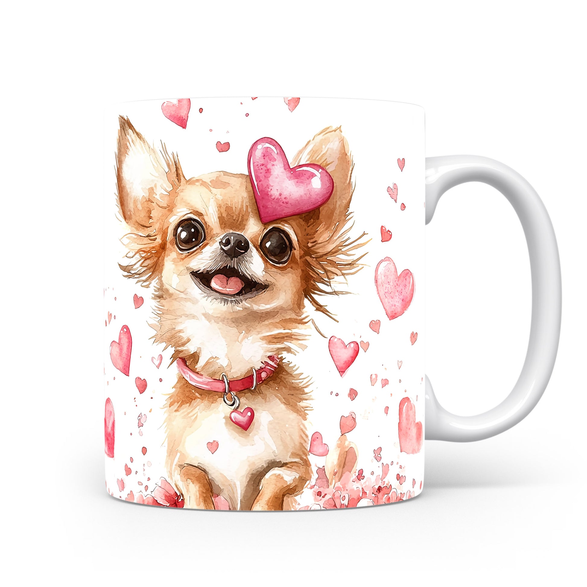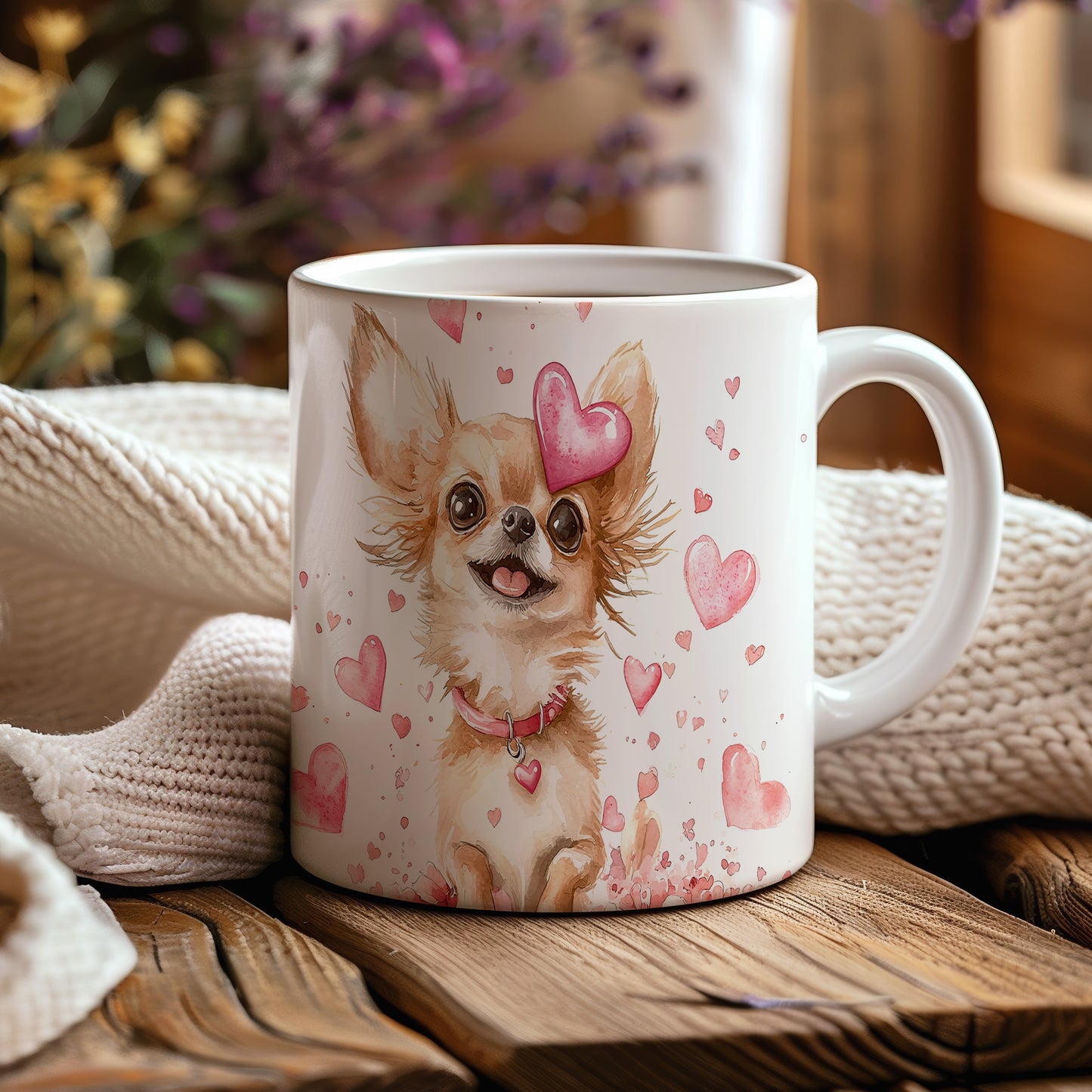 Tento hrnek zobrazuje roztomilou čivavu s velkým růžovým srdíčkem na hlavě, obklopenou malými srdíčky. Je ideální pro milovníky psů a skvělým dárkem pro každého, kdo má rád mazlíčky. Materiál: keramika. Objem: 330 ml. Vhodné do myčky i mikrovlnky. Tento hrnek vám přinese radost při každém doušku vašeho oblíbeného nápoje.