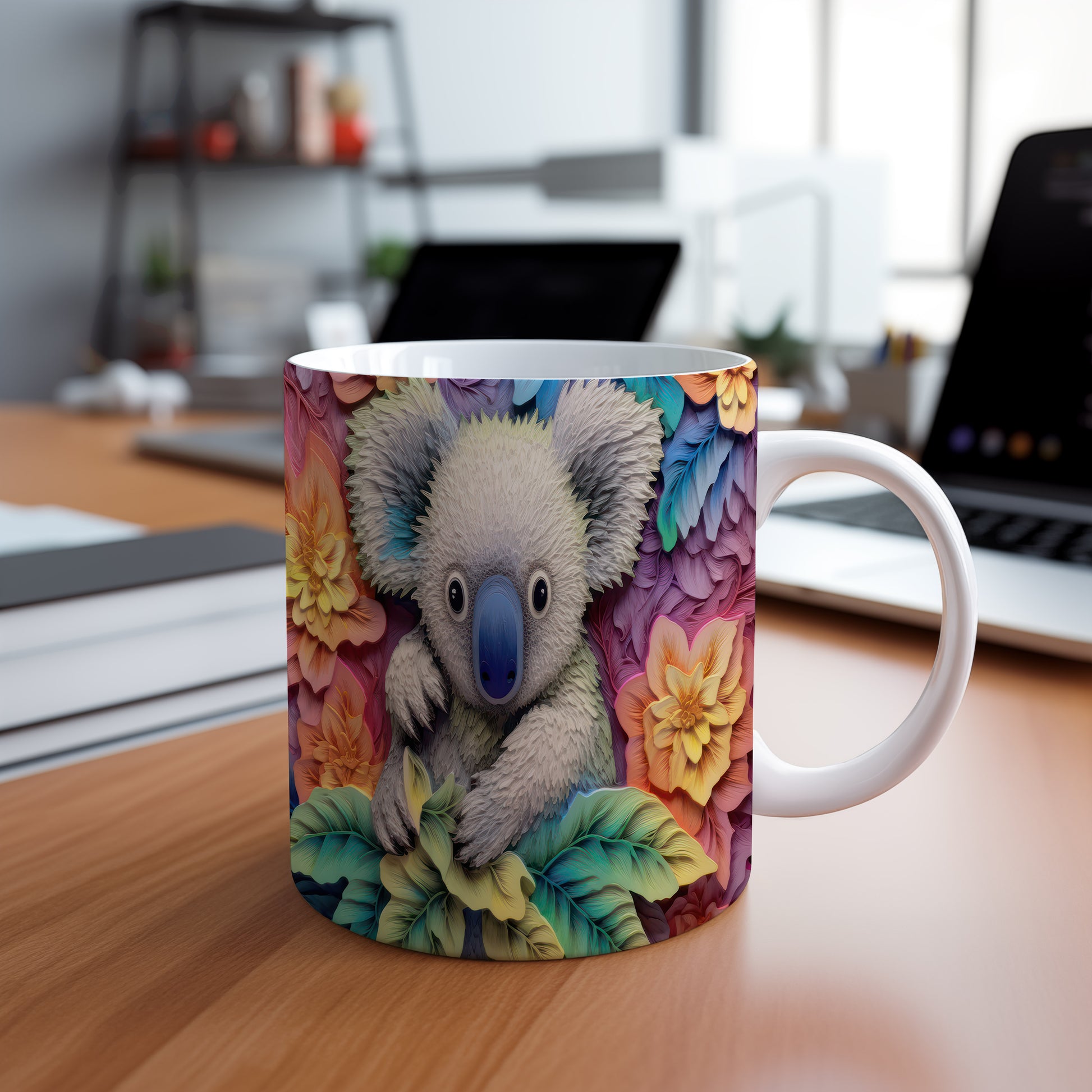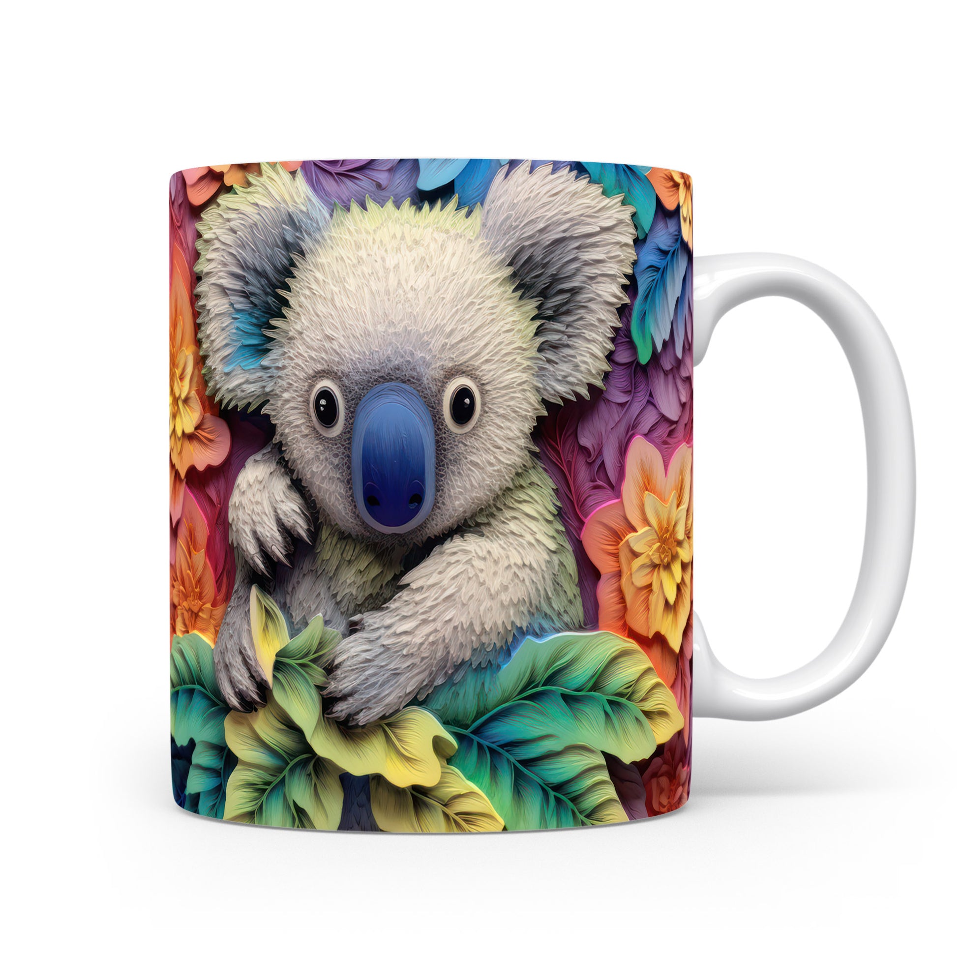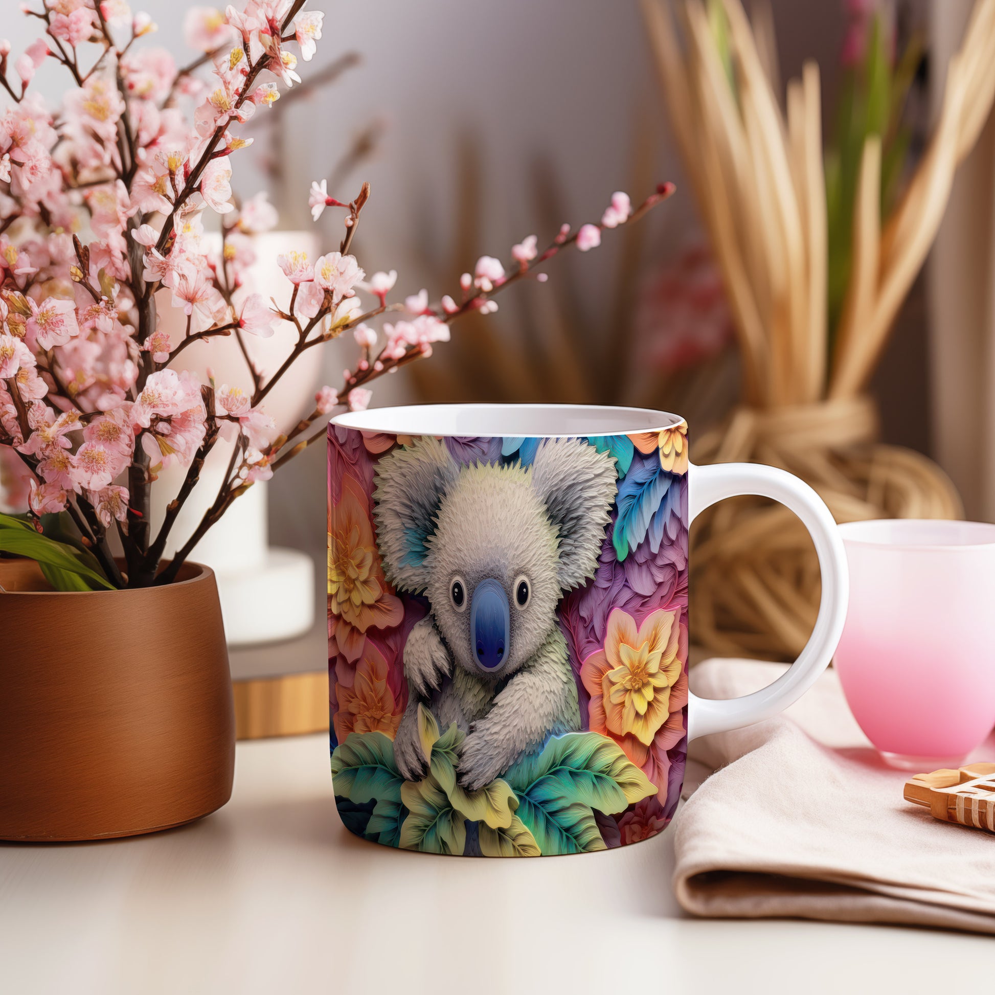 Keramický hrnek s motivem roztomilé koaly obklopené květinami. Tento hrnek je ideální pro milovníky přírody a zvířat, skvělý tip na dárek pro každého, kdo má rád originální design. Materiál: keramika. Objem: 330 ml. Vhodné do myčky i mikrovlnky. Používání tohoto hrnku přináší radost a oživí každé pití.