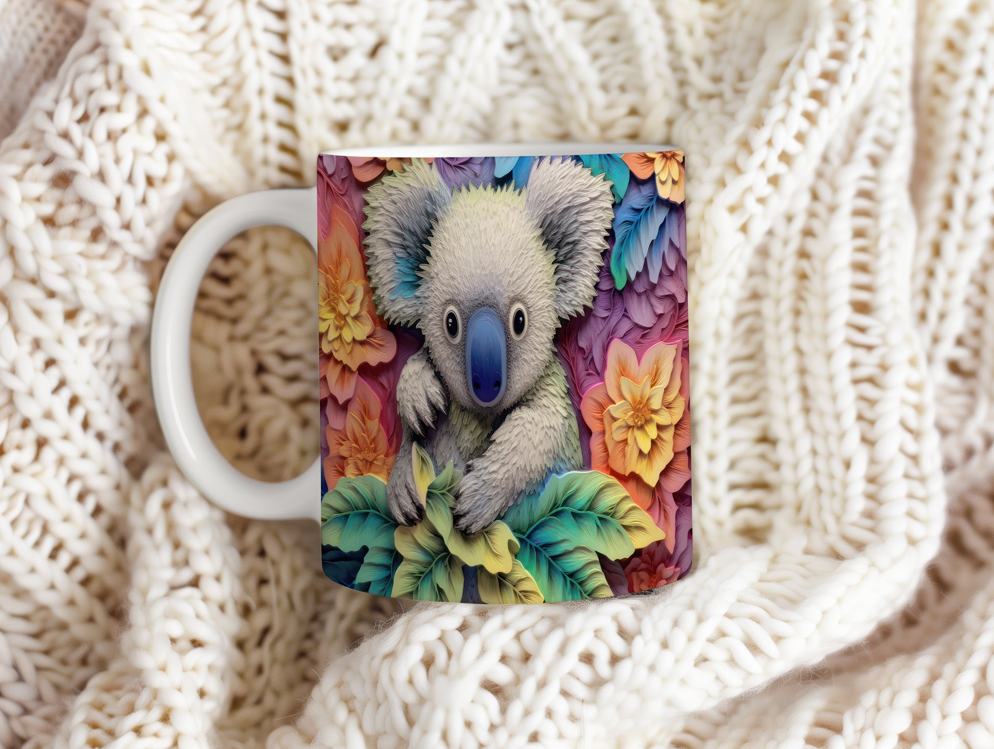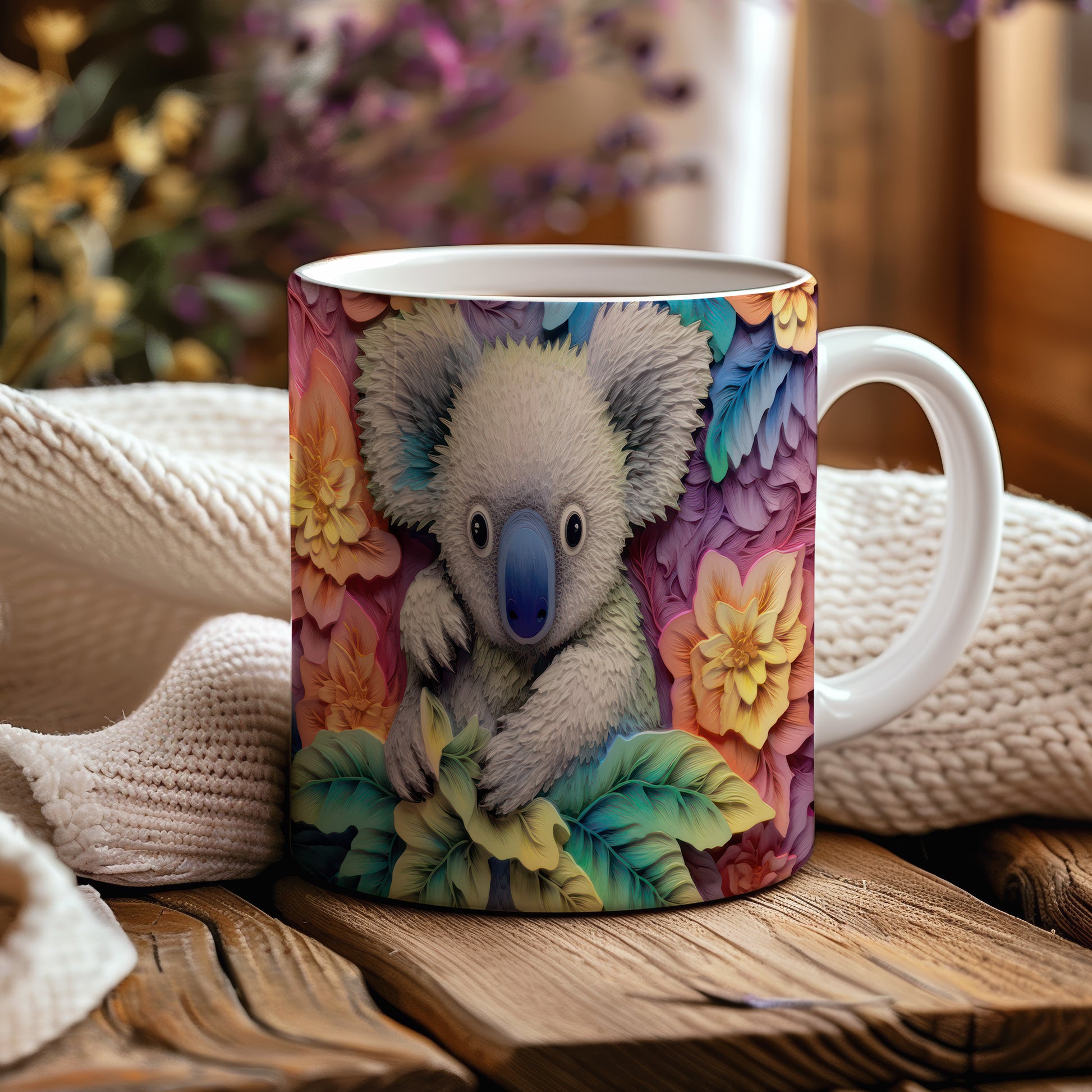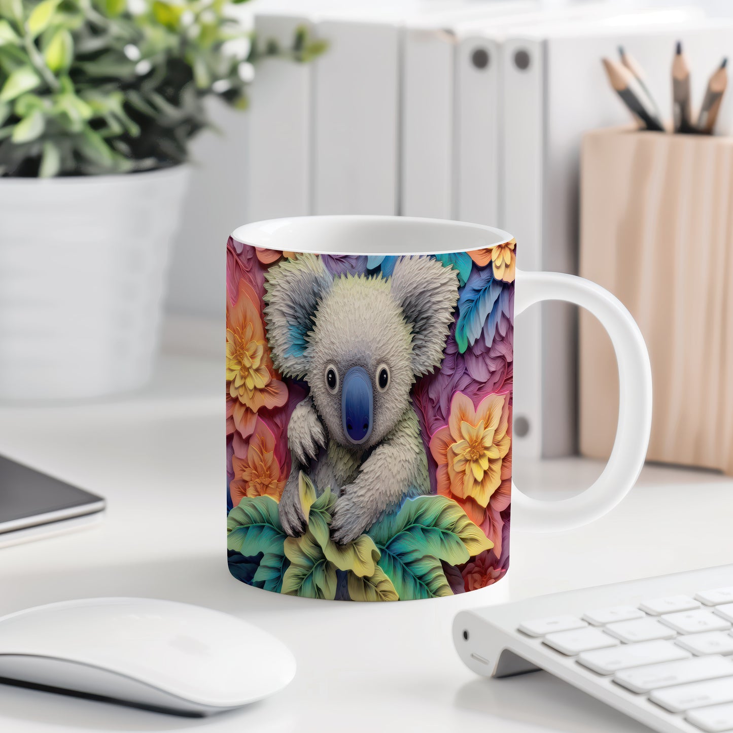 Keramický hrnek s motivem roztomilé koaly obklopené květinami. Tento hrnek je ideální pro milovníky přírody a zvířat, skvělý tip na dárek pro každého, kdo má rád originální design. Materiál: keramika. Objem: 330 ml. Vhodné do myčky i mikrovlnky. Používání tohoto hrnku přináší radost a oživí každé pití.