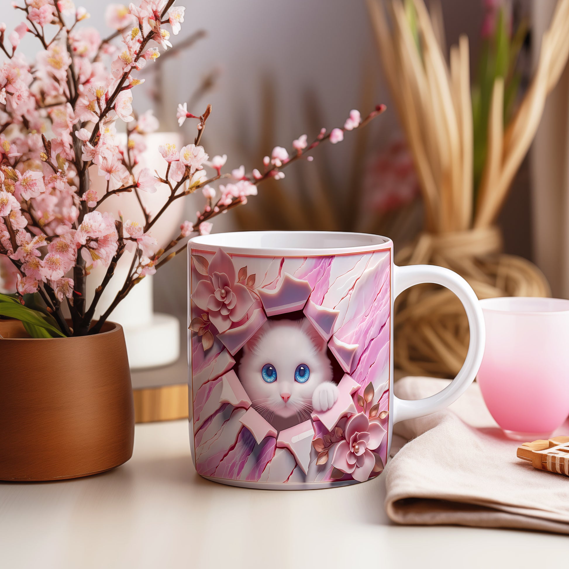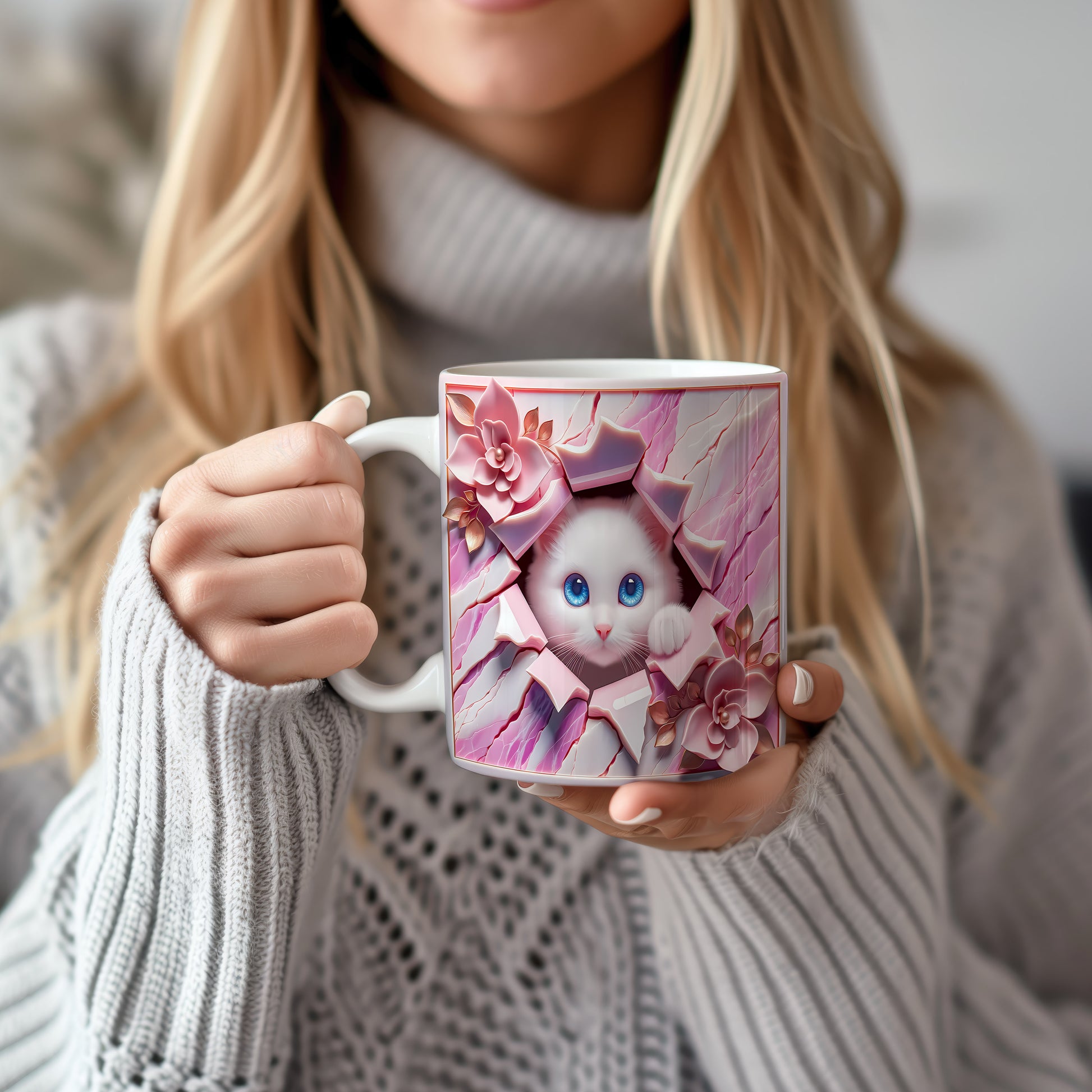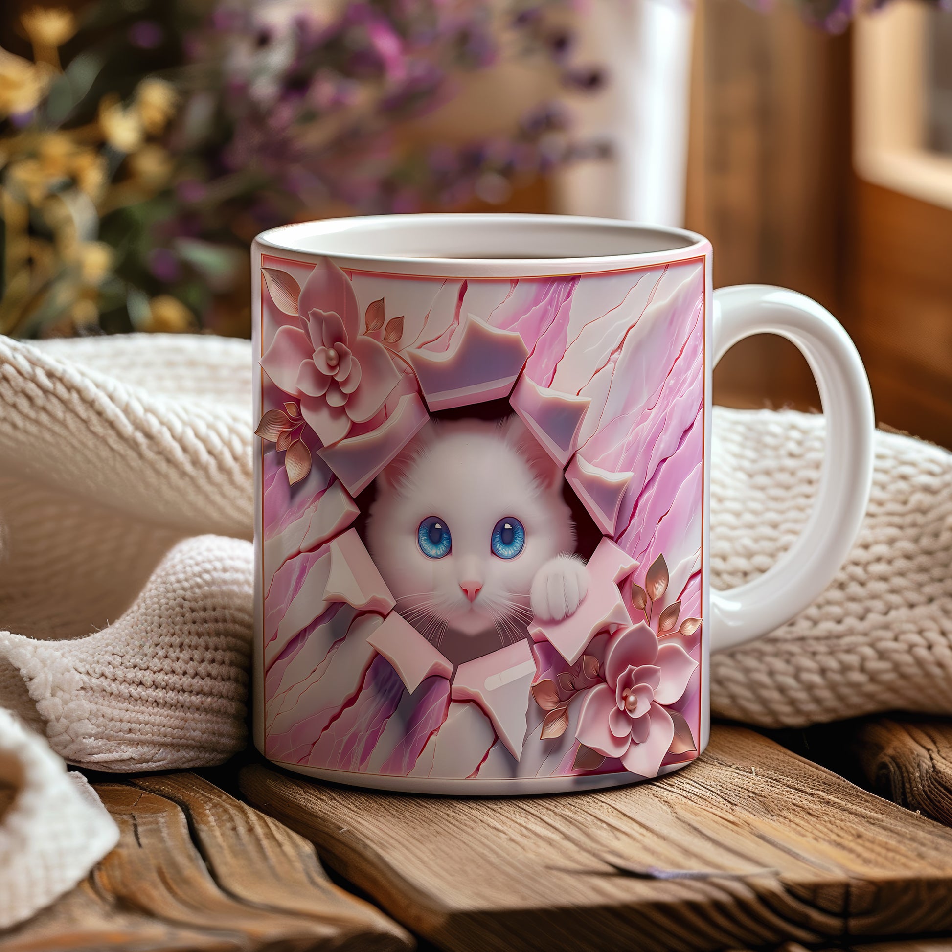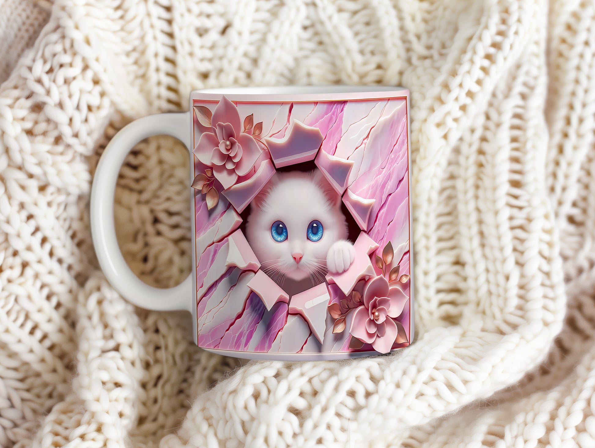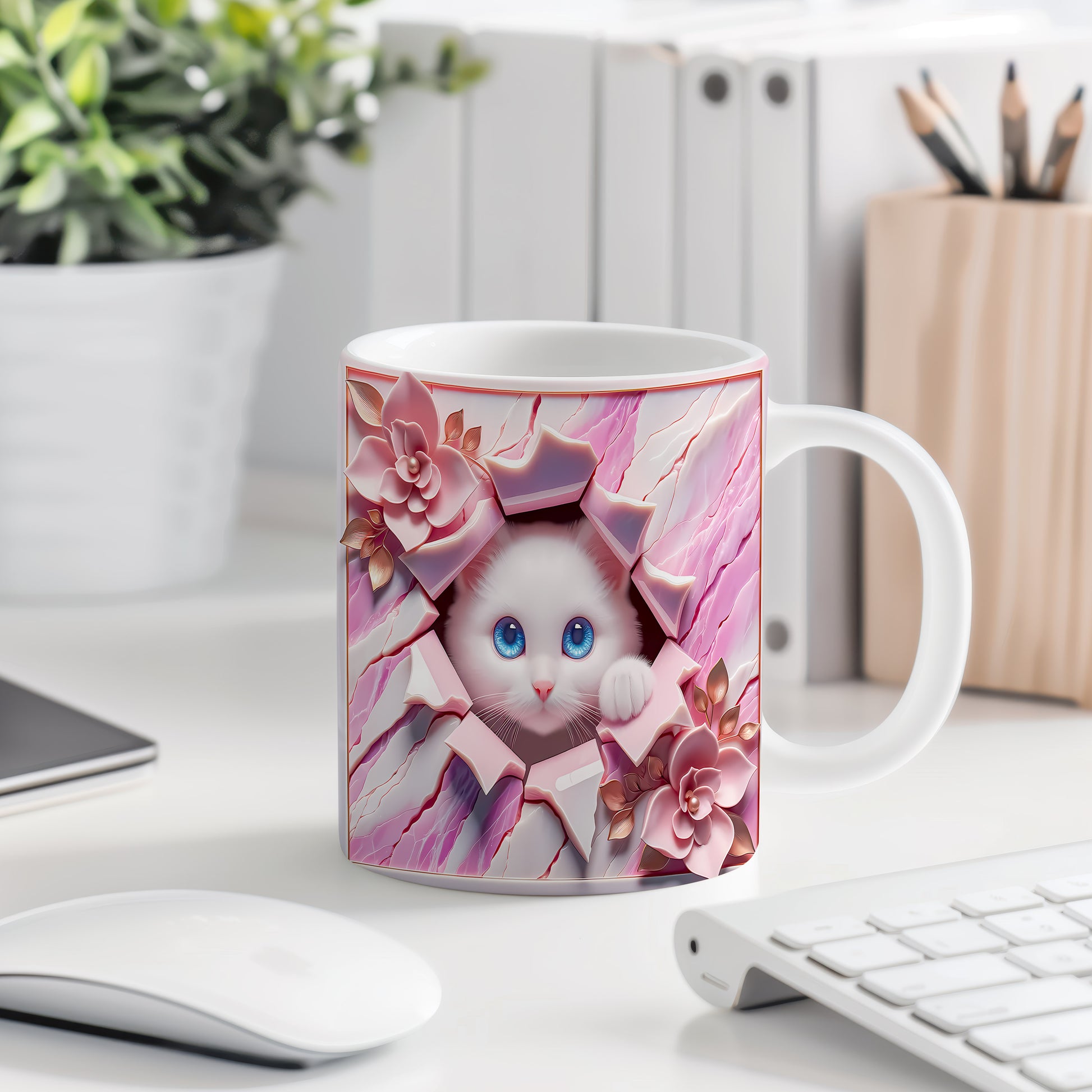 Na hrnku je zobrazená roztomilá bílá kočička s modrýma očima, která vypadá, jako by vykukovala 3D efekt. Tento hrnek je ideálním dárkem pro milovníky koček a domácích mazlíčků. Materiál: keramika. Objem: 330 ml. Vhodné do myčky i mikrovlnky. Používání tohoto hrnku přináší radost a oživí každé pití.