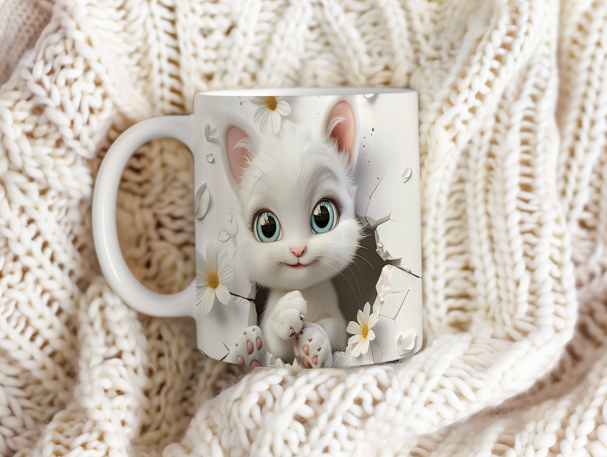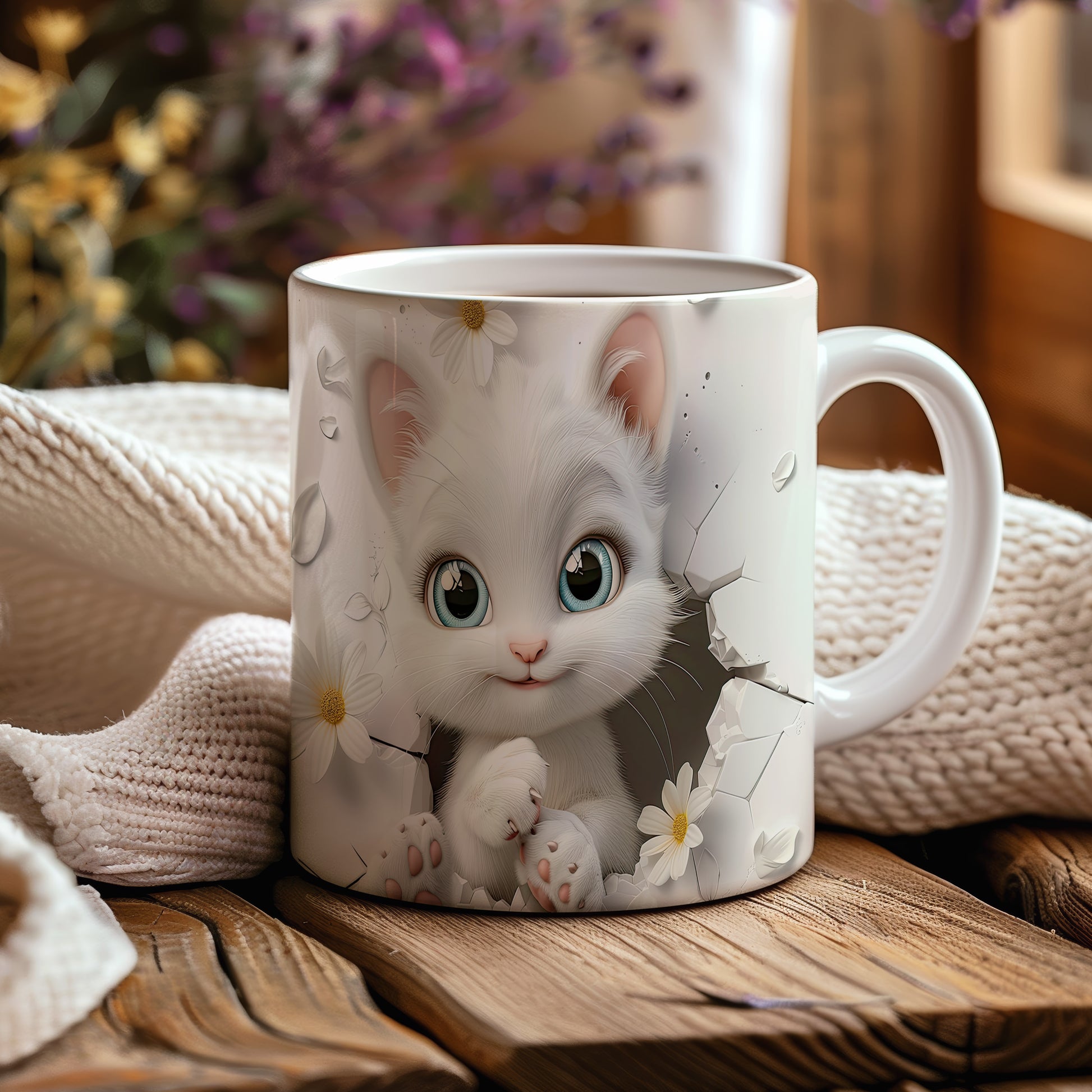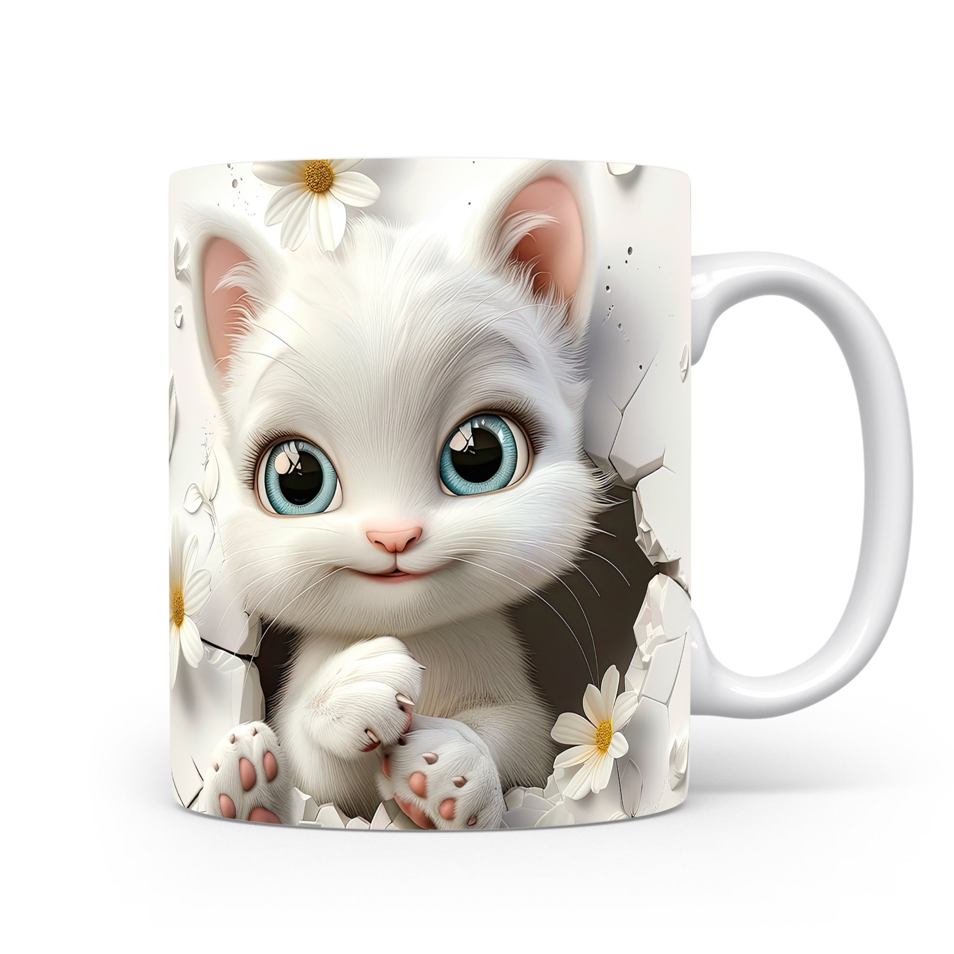 Tento hrnek zobrazuje roztomilou bílou kočičku s velkýma očima, která vykukuje z 3D efektu. Je ideální pro milovníky koček a skvělým dárkem pro přátele či rodinu. Materiál: keramika. Objem: 330 ml. Vhodné do myčky i mikrovlnky. Používání tohoto hrnku přináší radost a oživí každé pití.