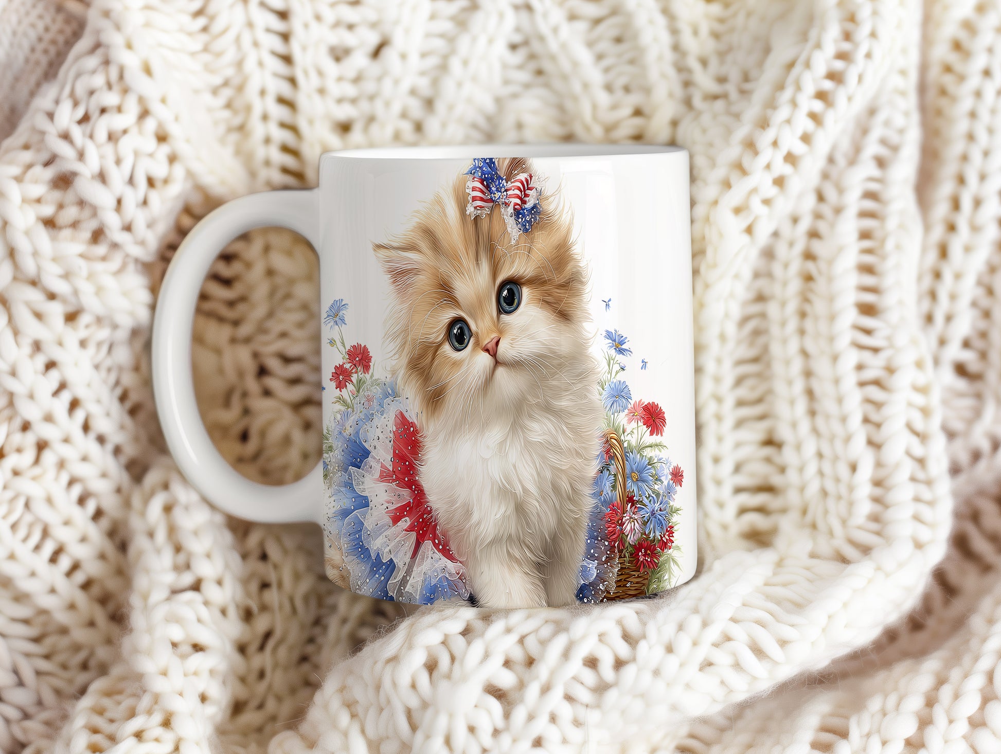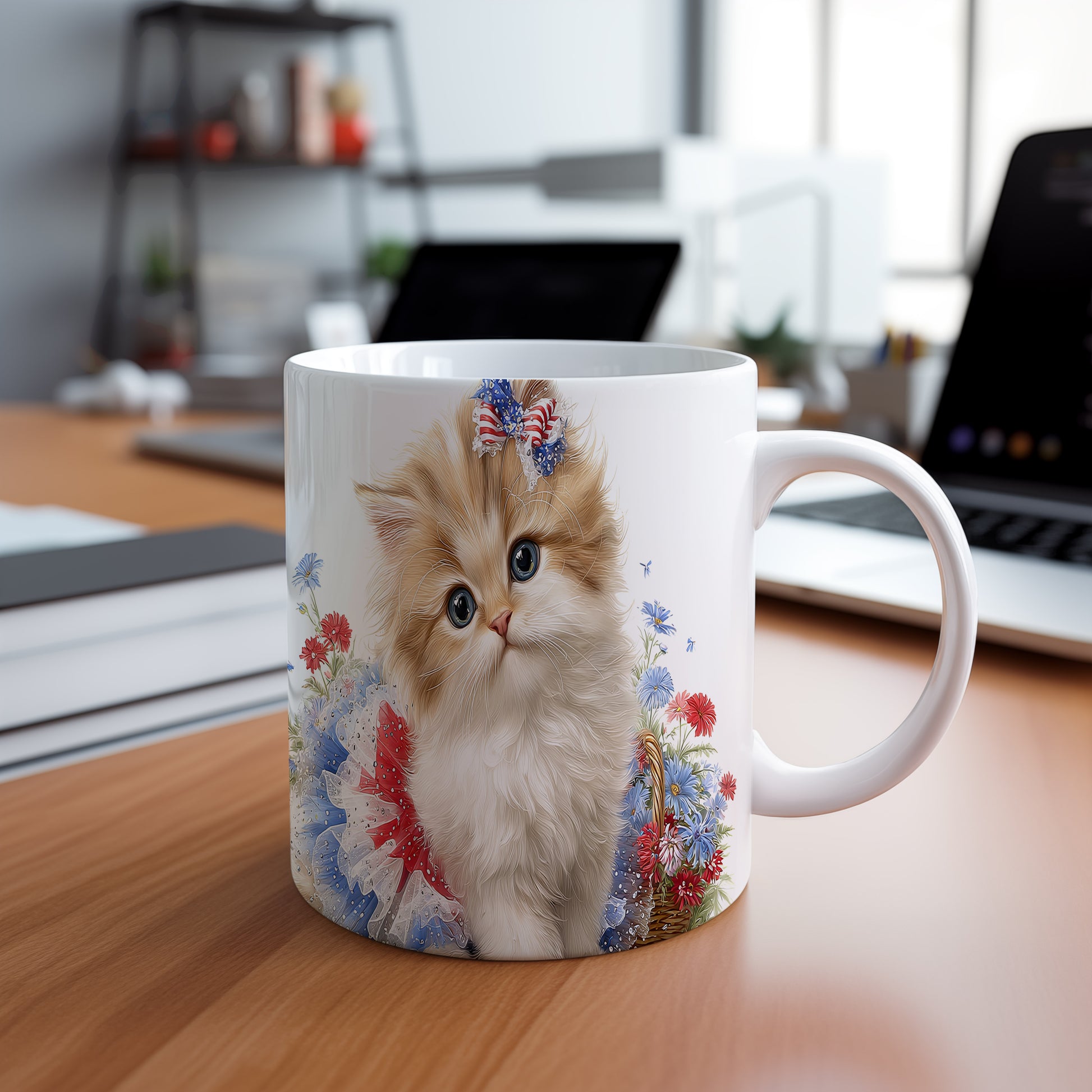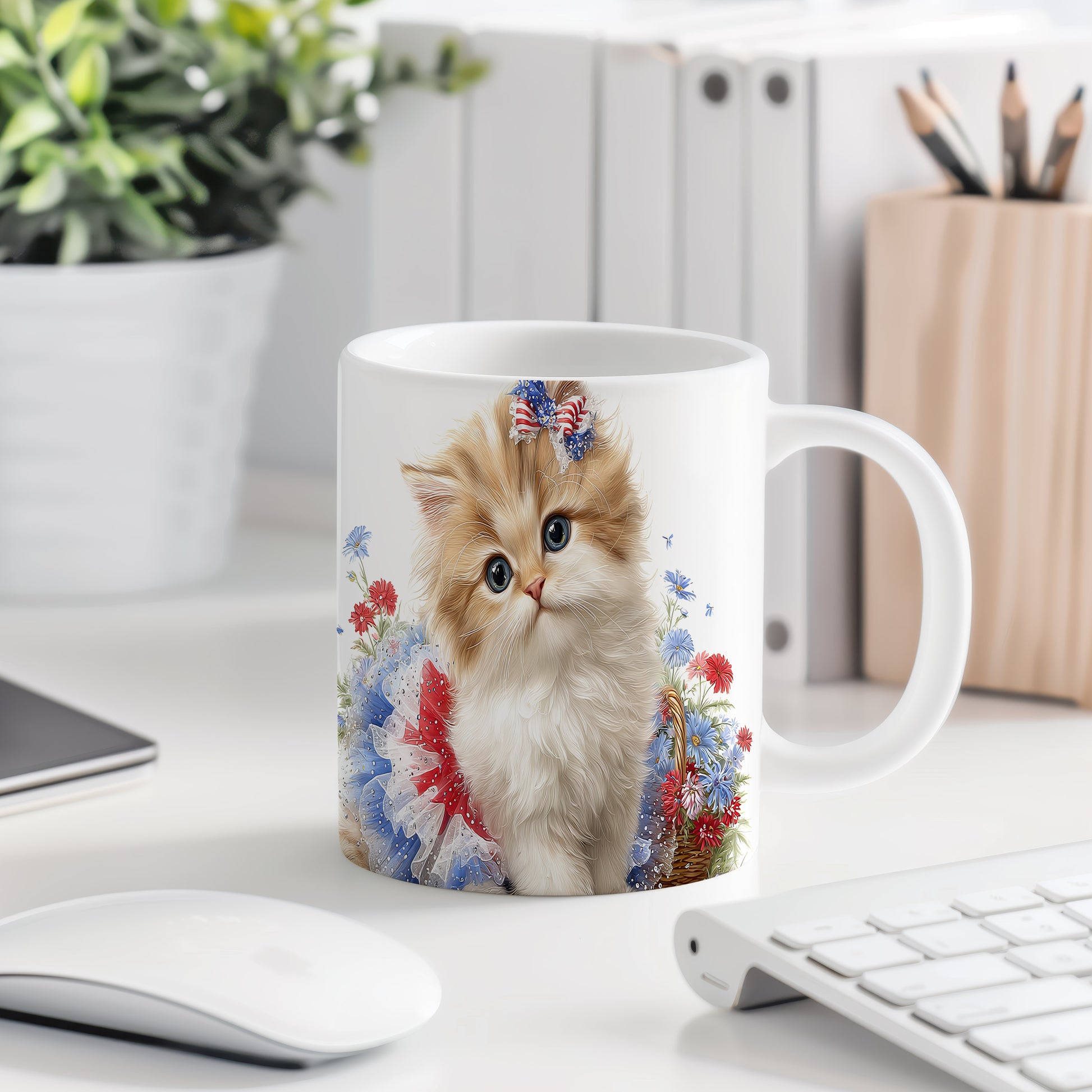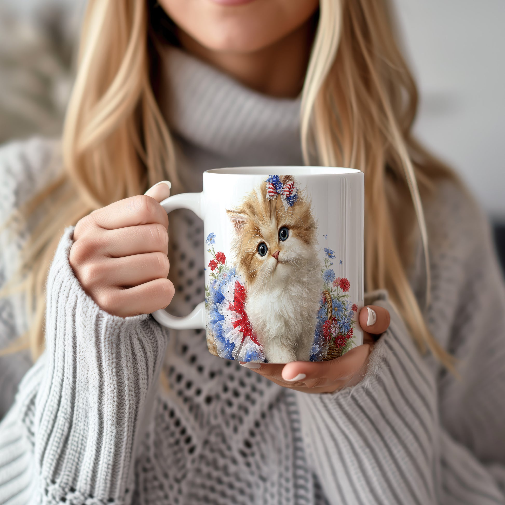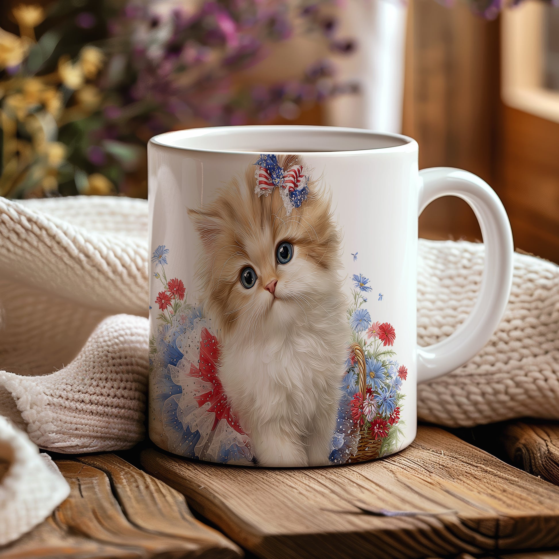 Hrnek s roztomilou kočičkou a květinami v béžových tónech