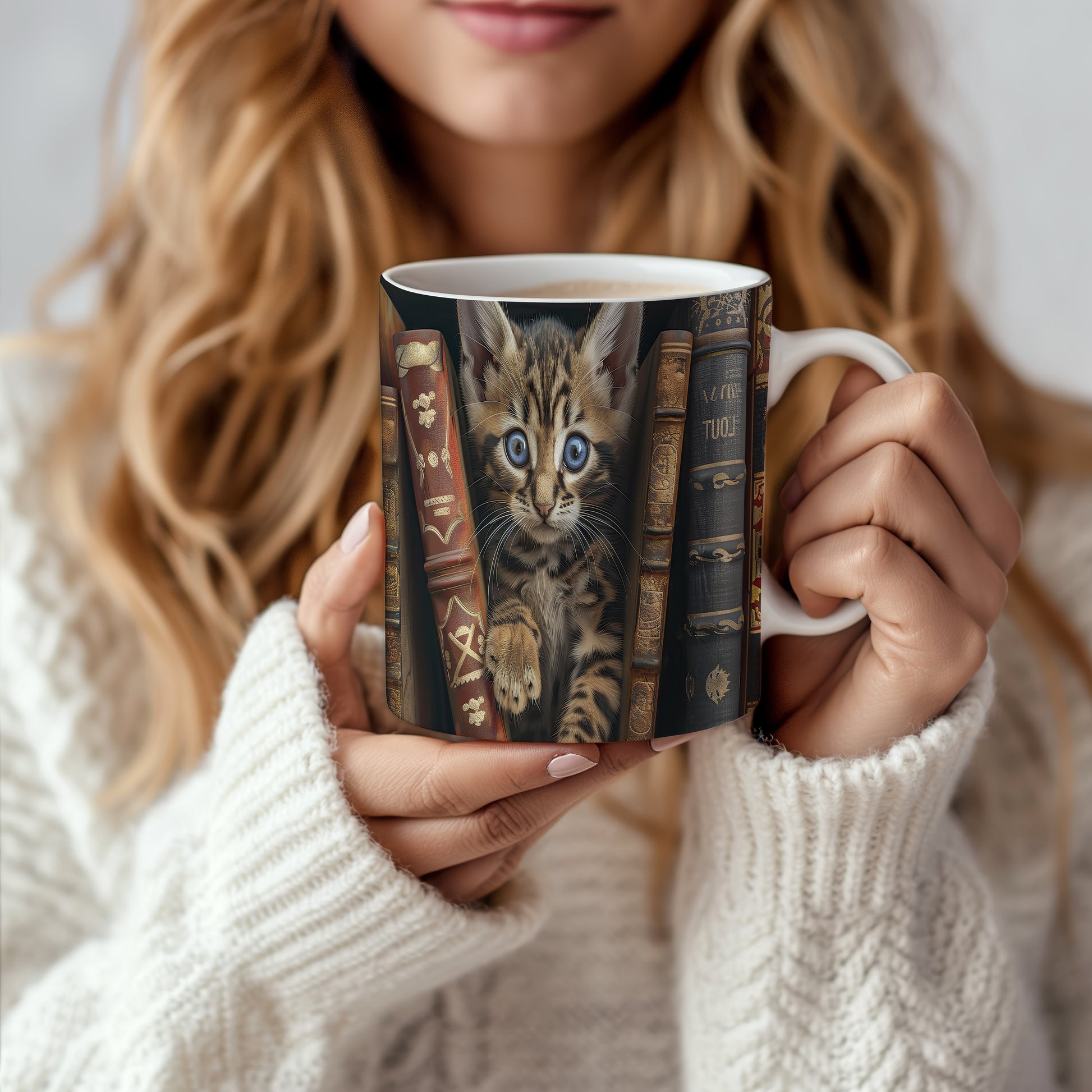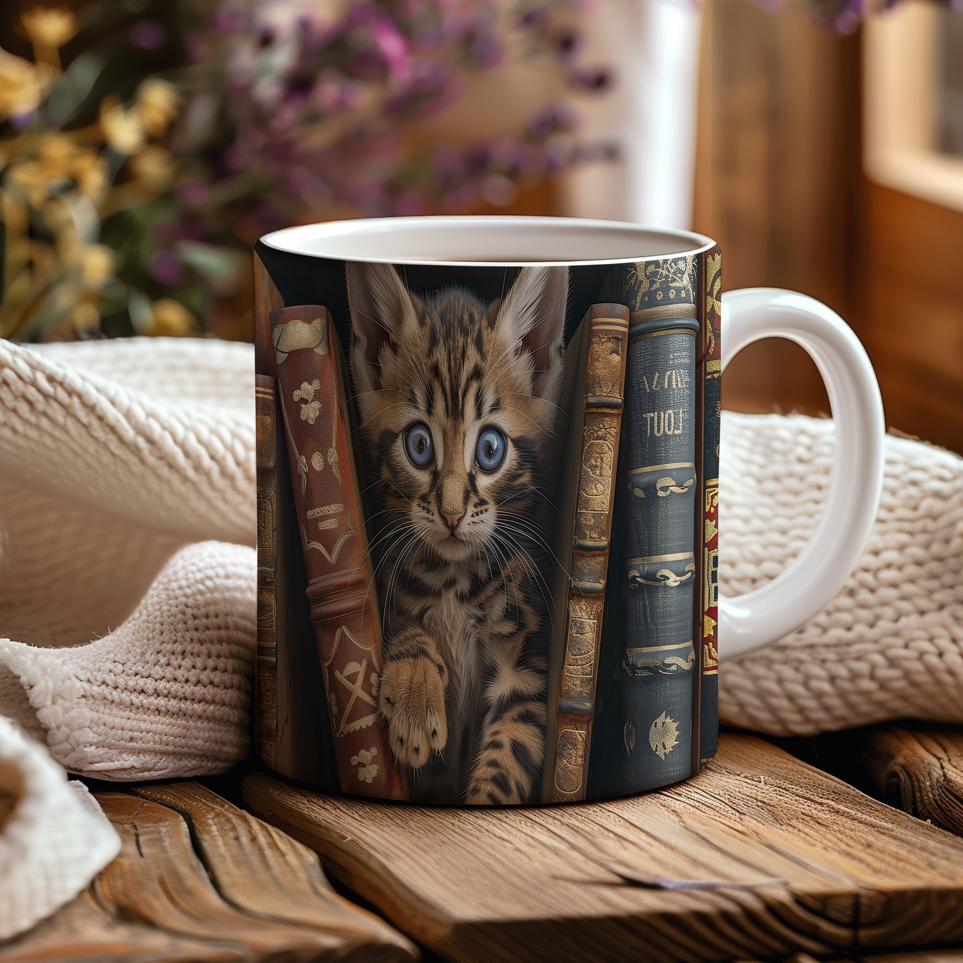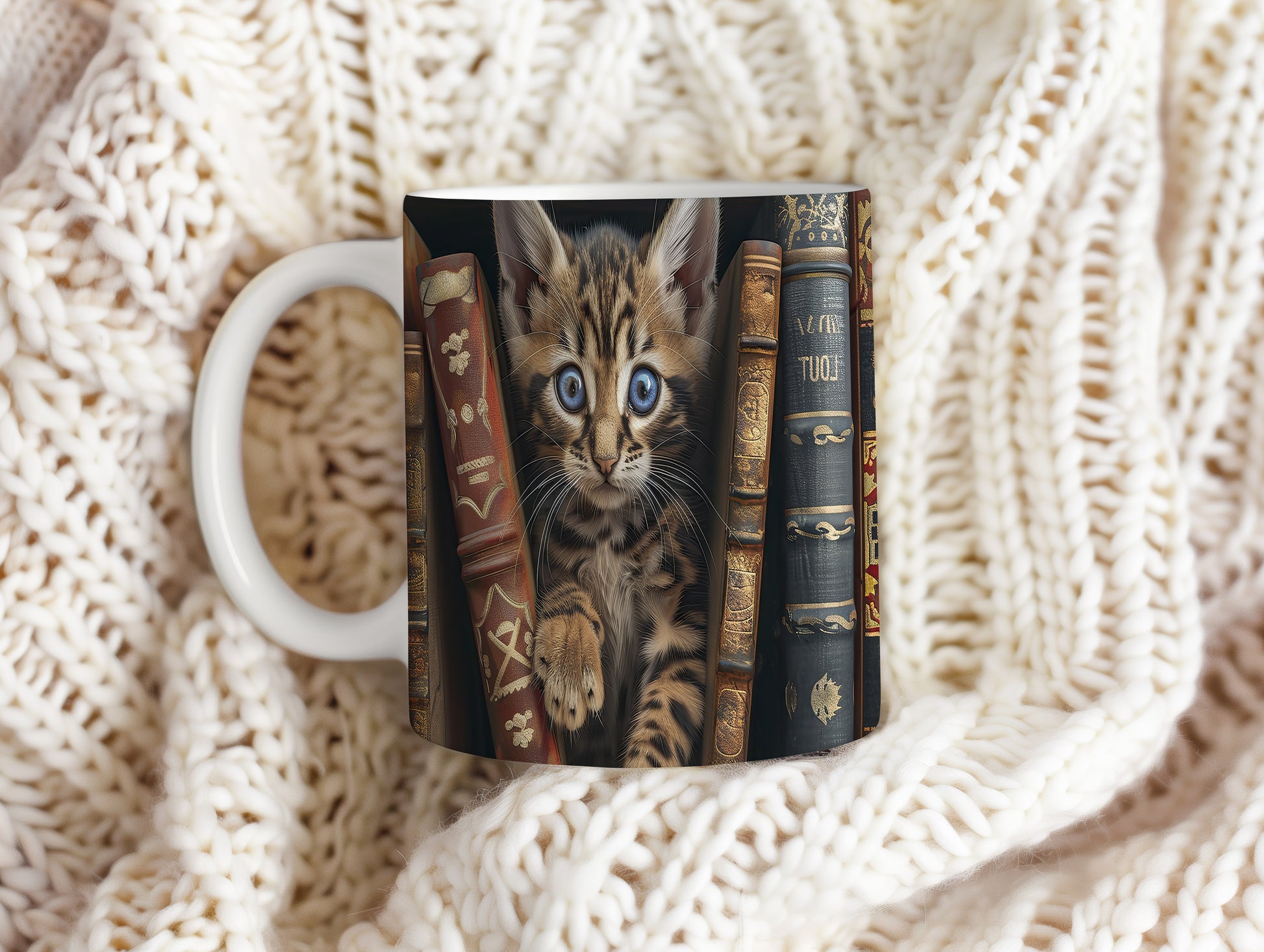 Hrnek s roztomilou kočičkou mezi knihami