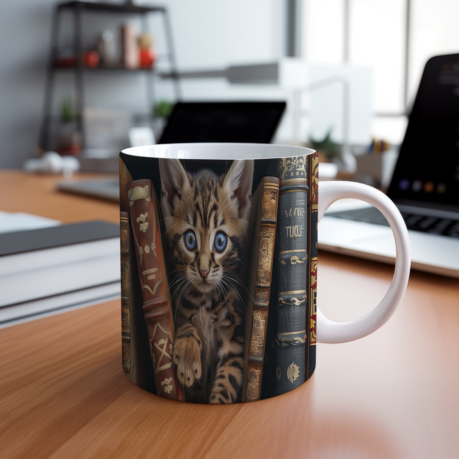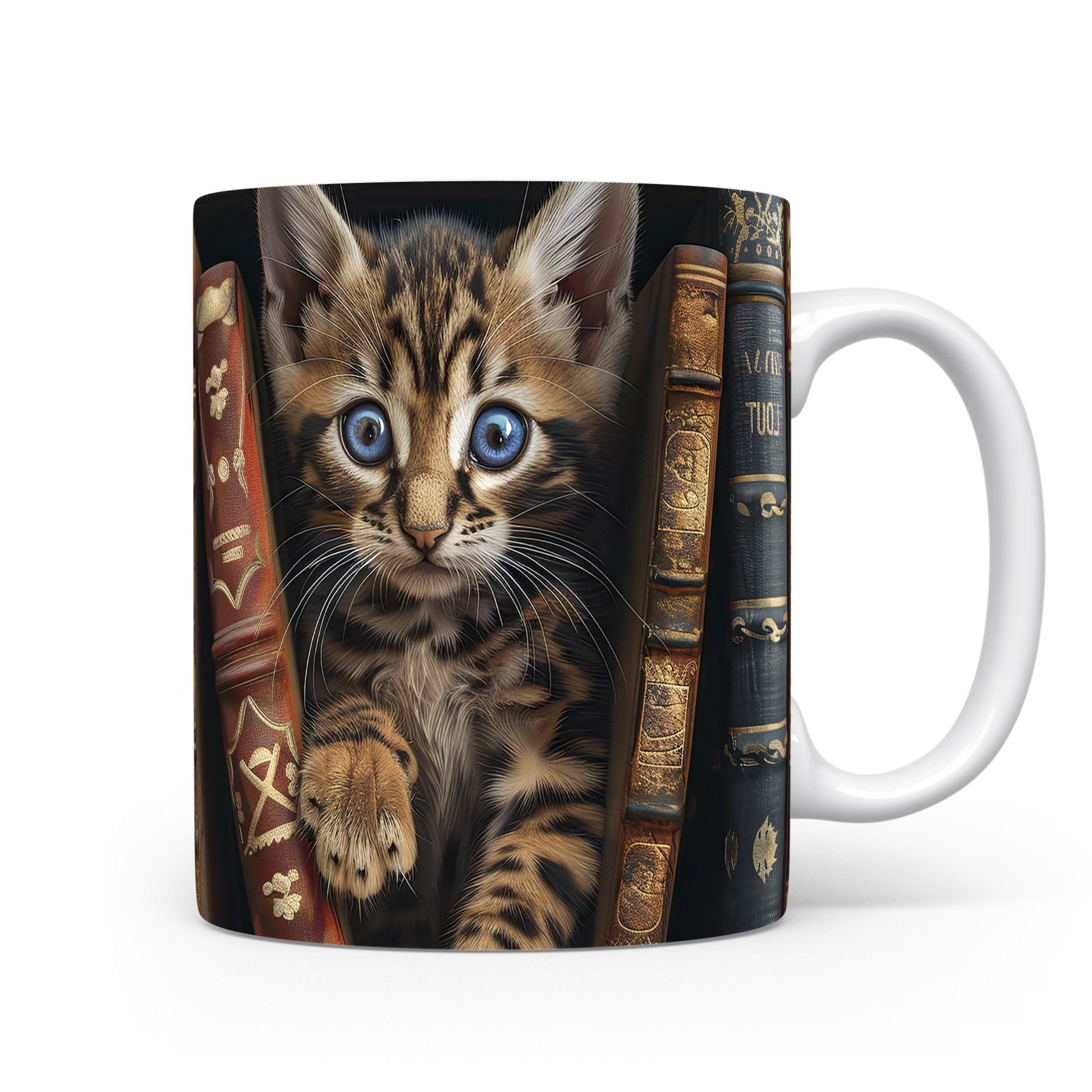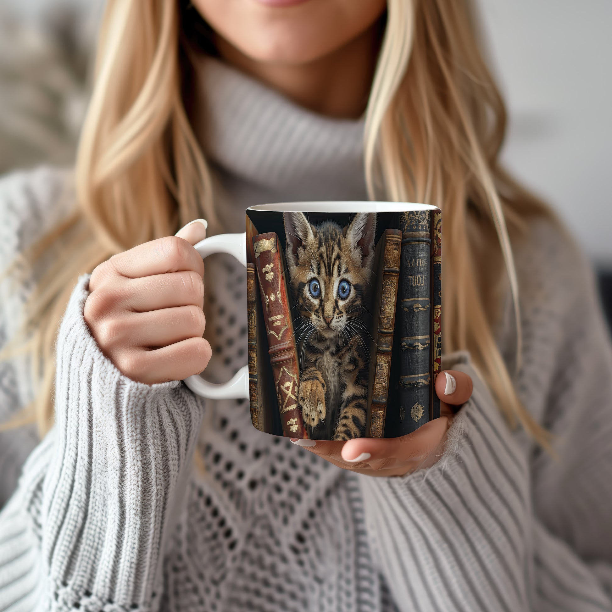 Hrnek s roztomilou kočičkou mezi knihami