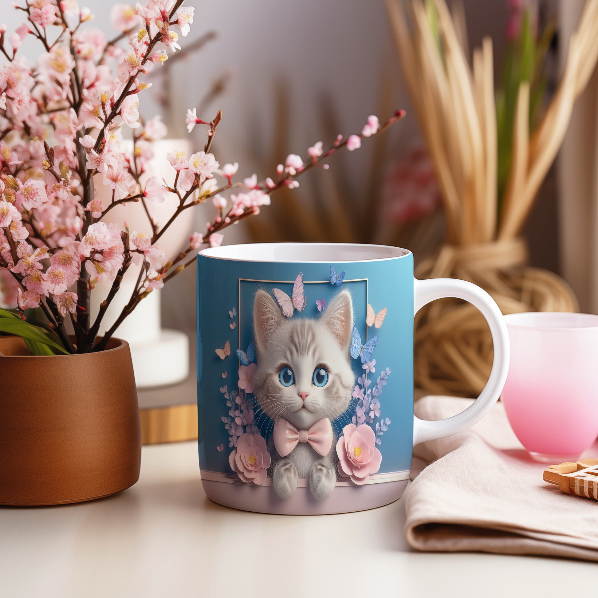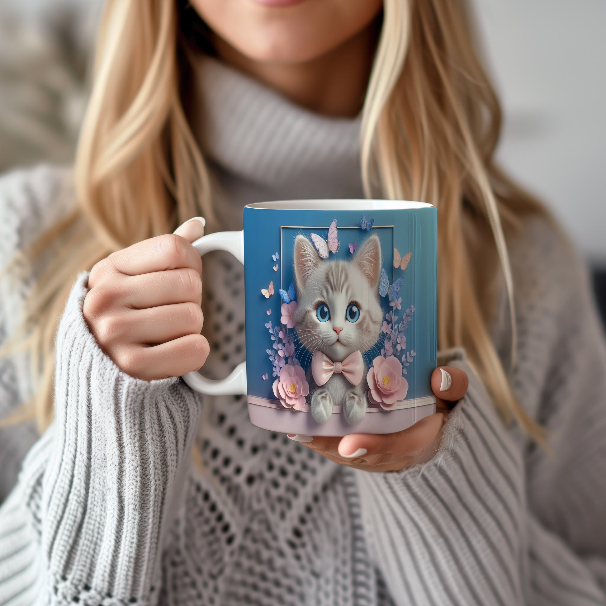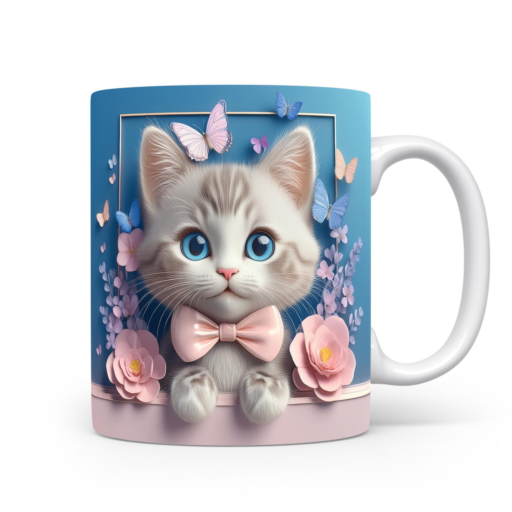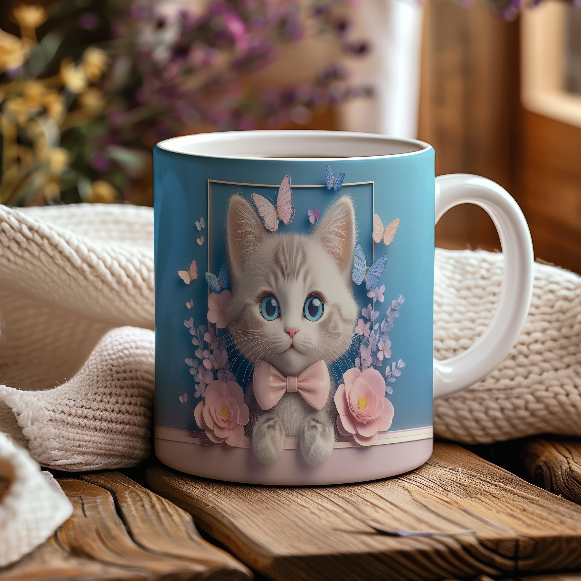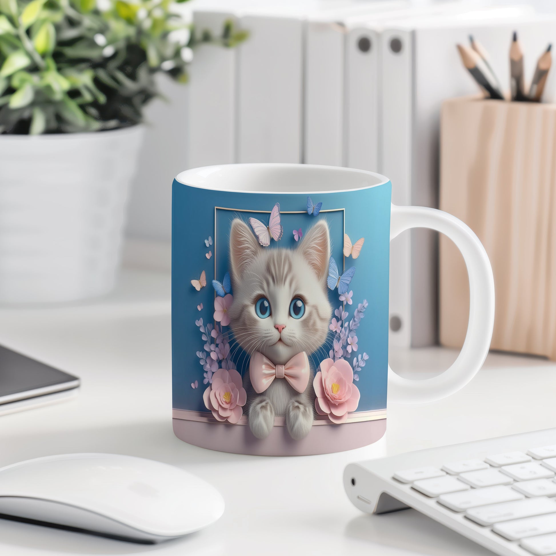 Tento keramický hrnek zaujme jemným designem roztomilé kočičky s velkýma modrýma očima a růžovou mašlí. Je ideální pro milovníky koček a skvělým dárkem pro přátele či rodinu. Materiál: keramika. Objem: 330 ml. Vhodné do myčky i mikrovlnky. Používání tohoto hrnku přináší radost a útulnost do každého dne.
