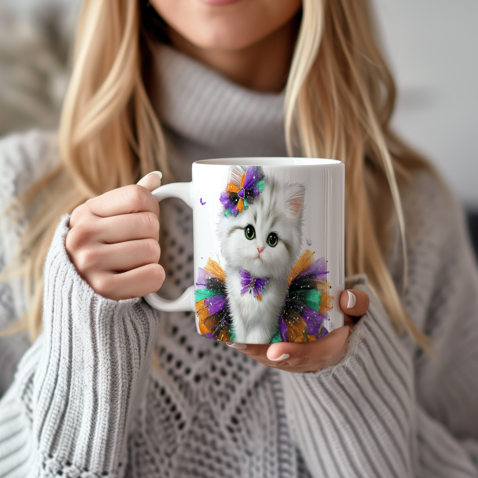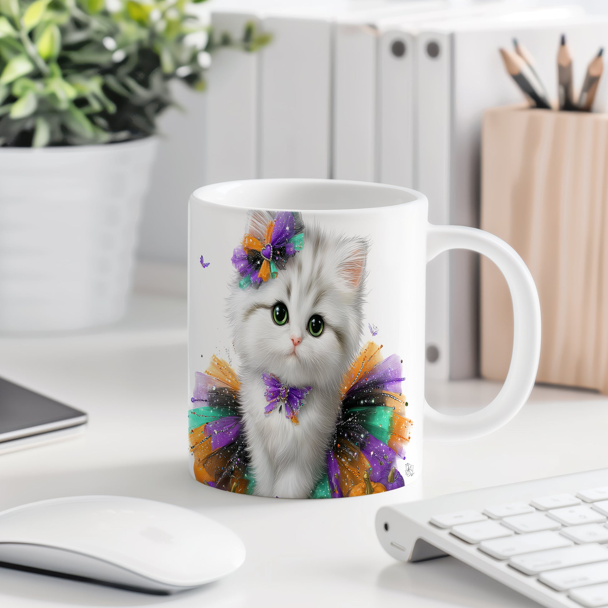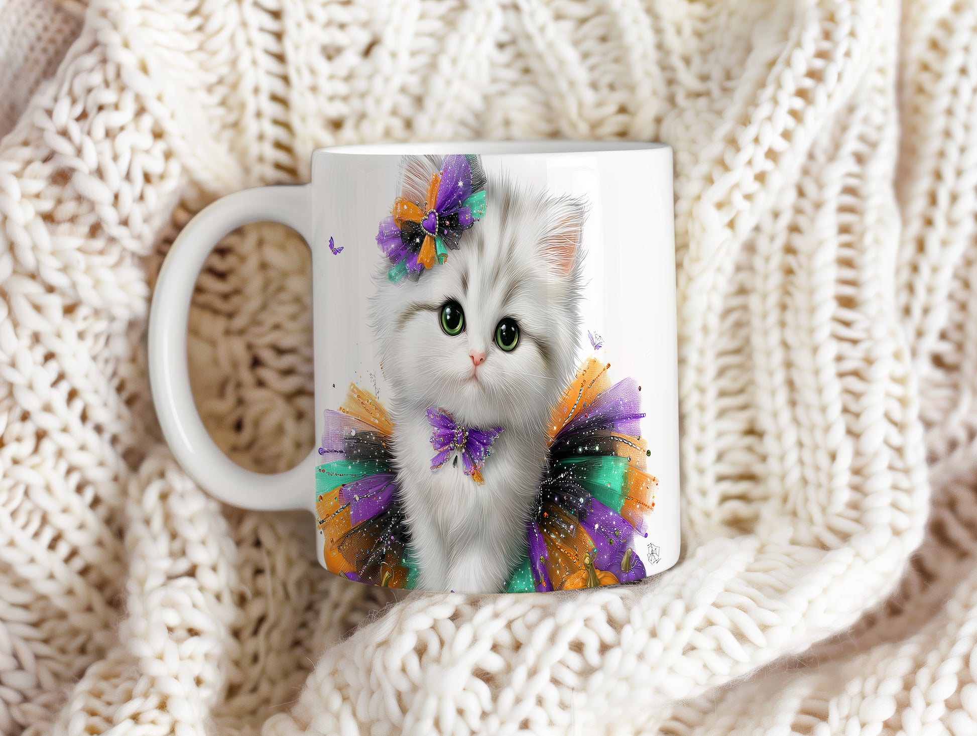 Hrnek s roztomilou kočičkou v extravagantním outfitu
