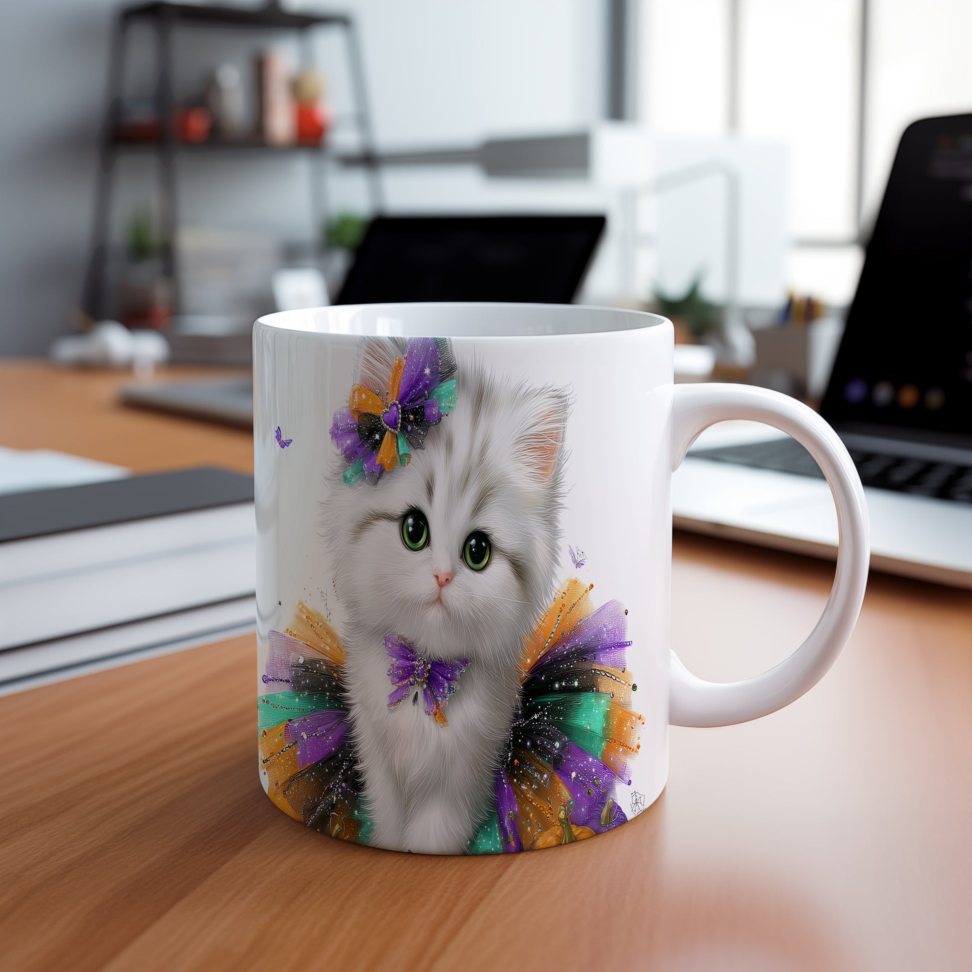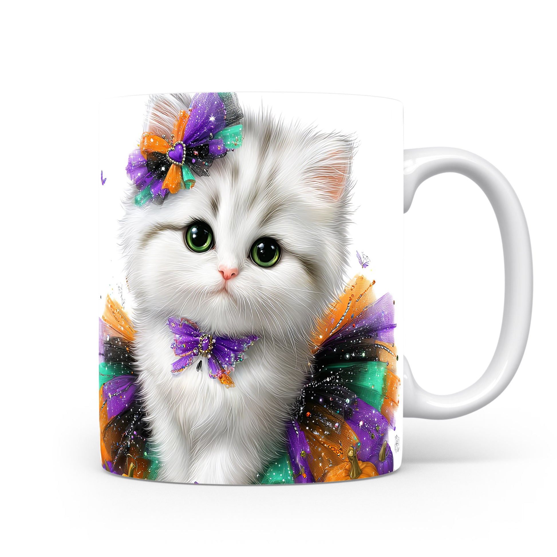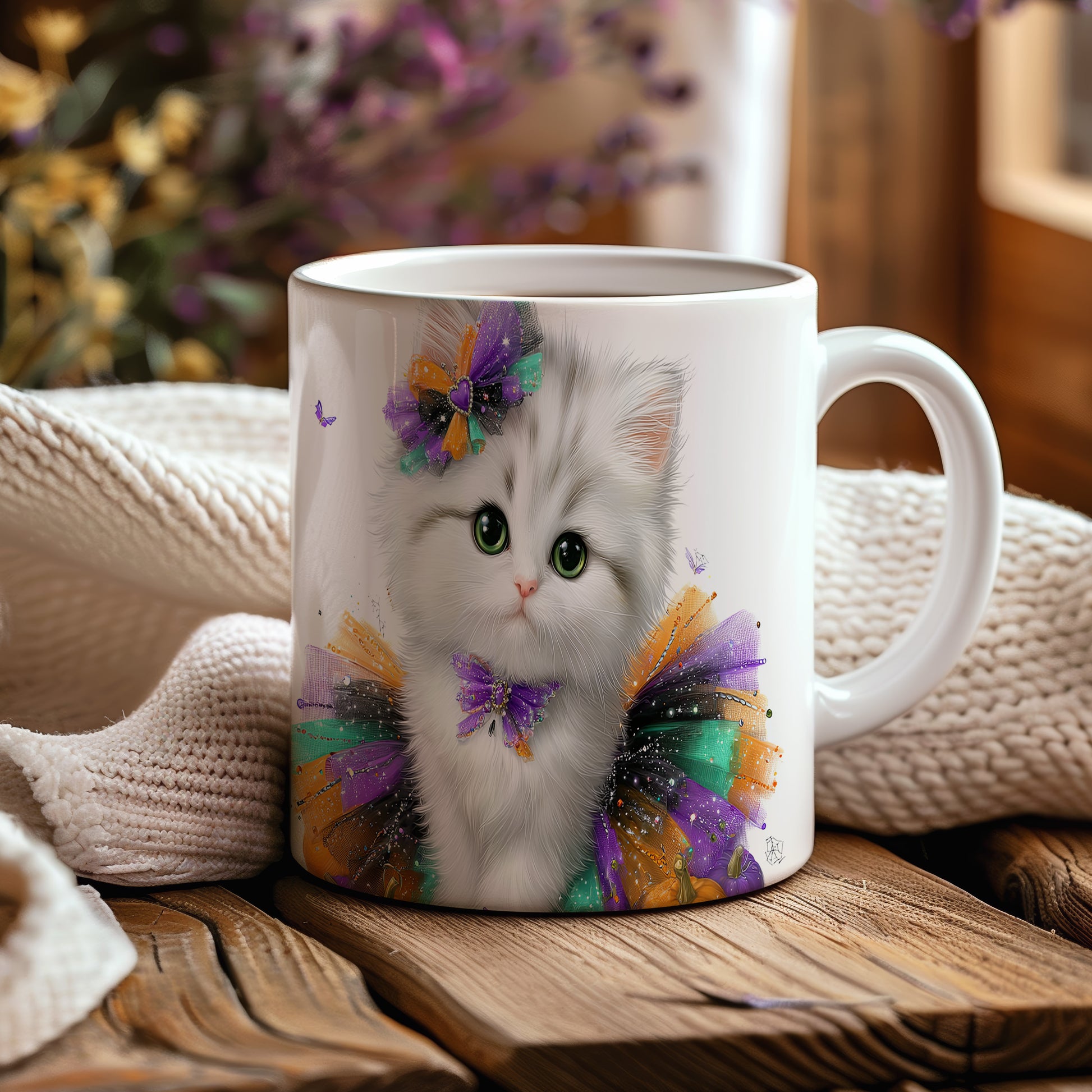 Hrnek s roztomilou kočičkou v extravagantním outfitu