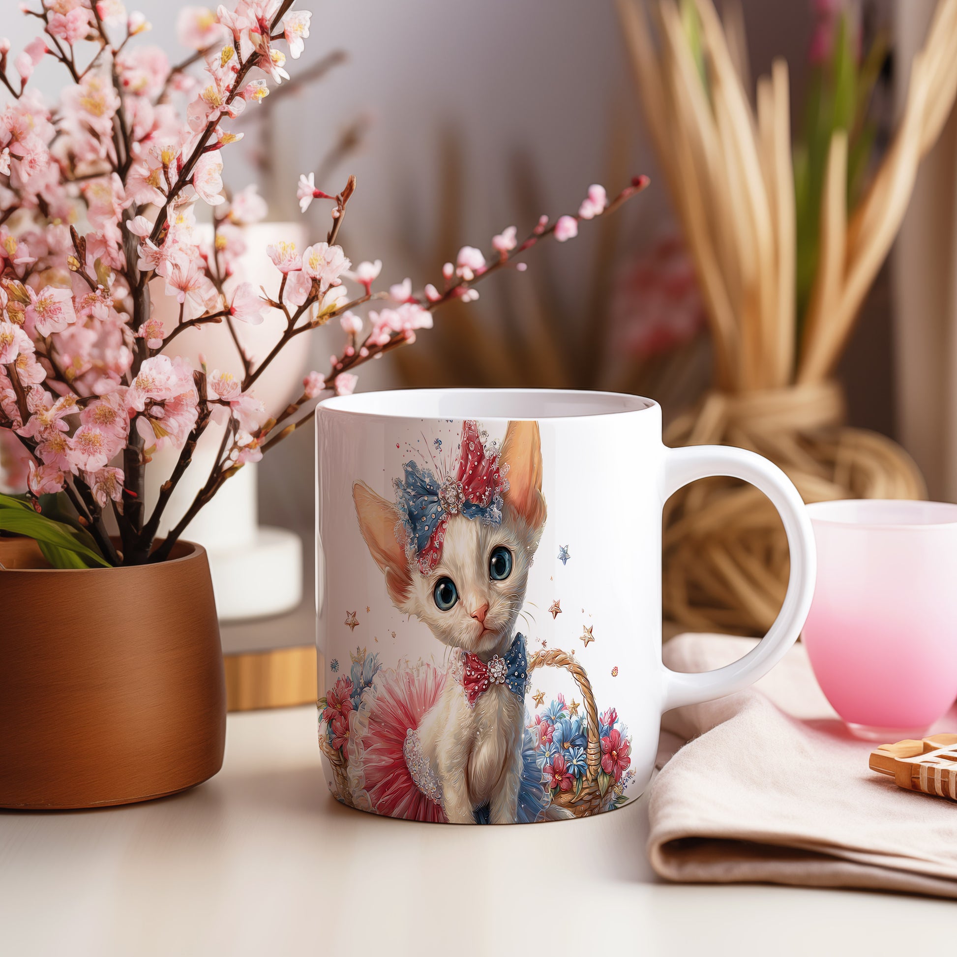 Hrnek s roztomilou kočičkou v pastelových tónech – digitální ilustrací