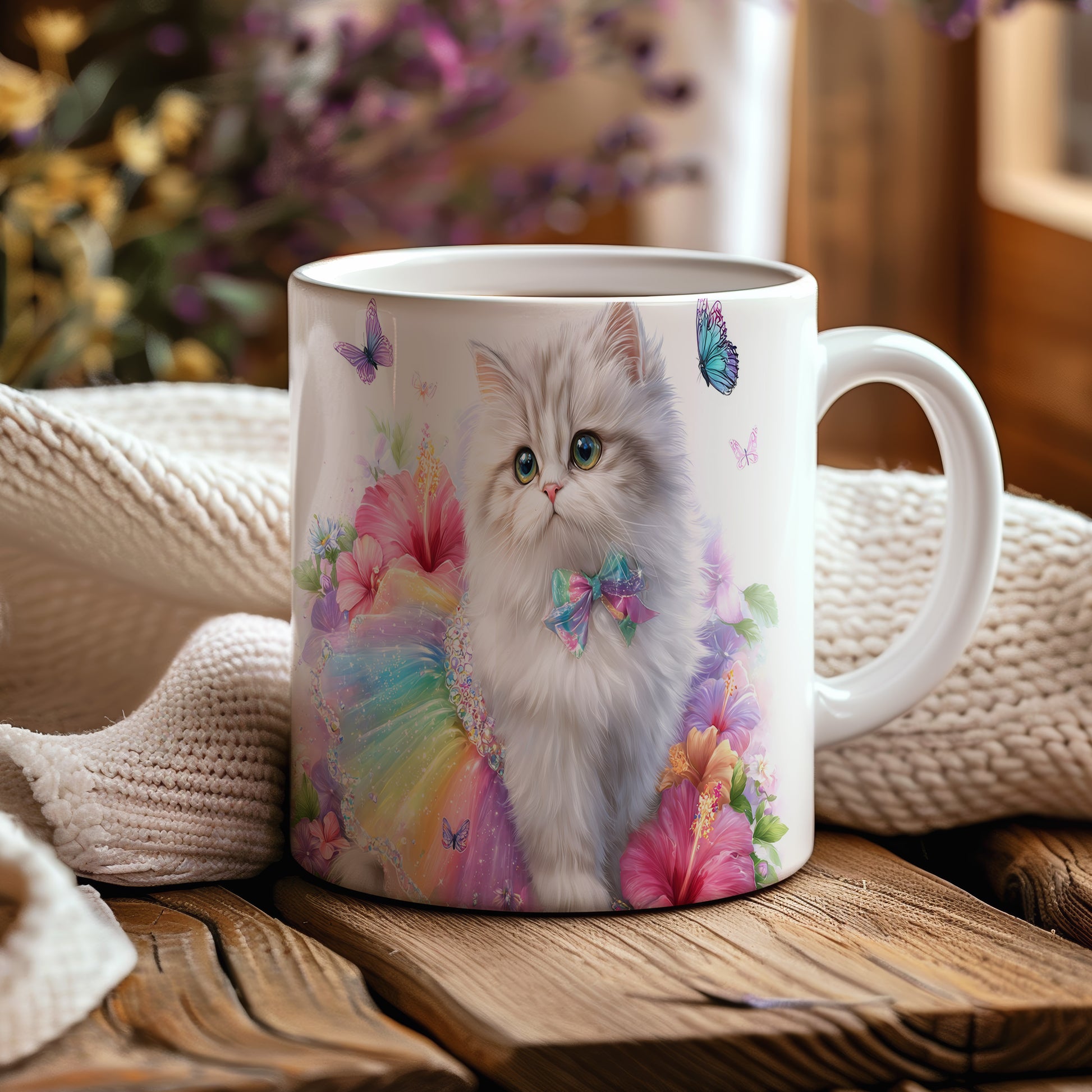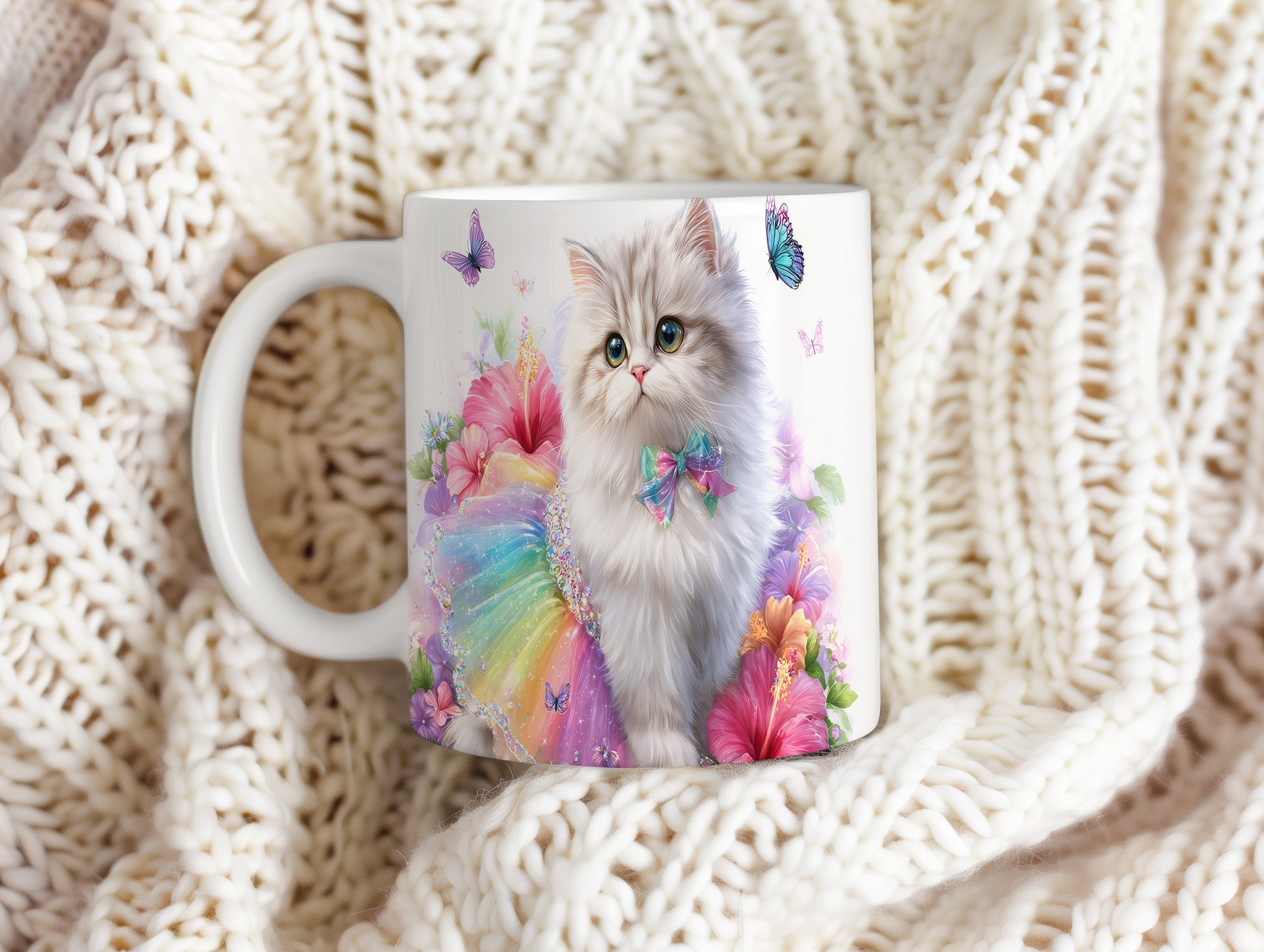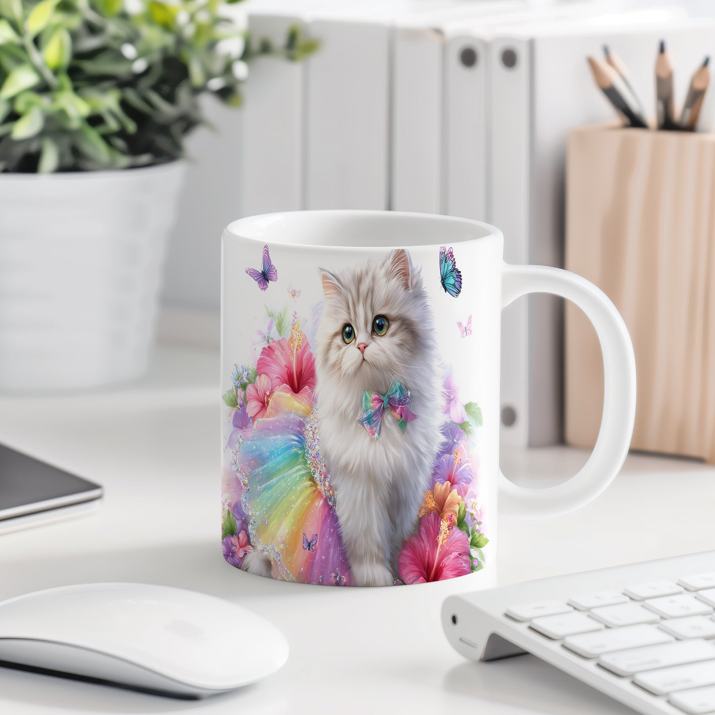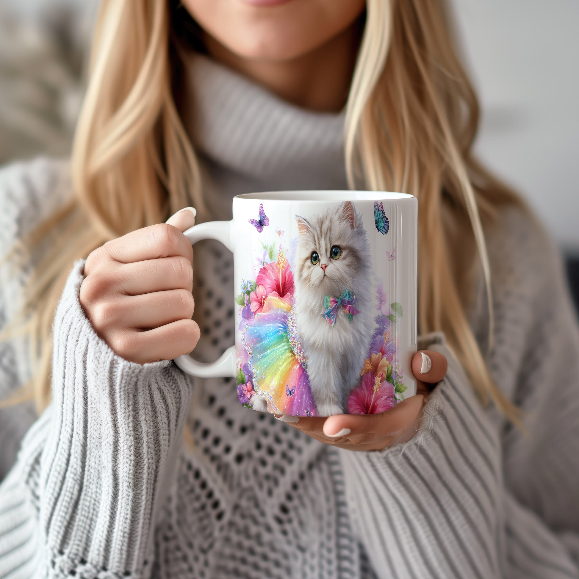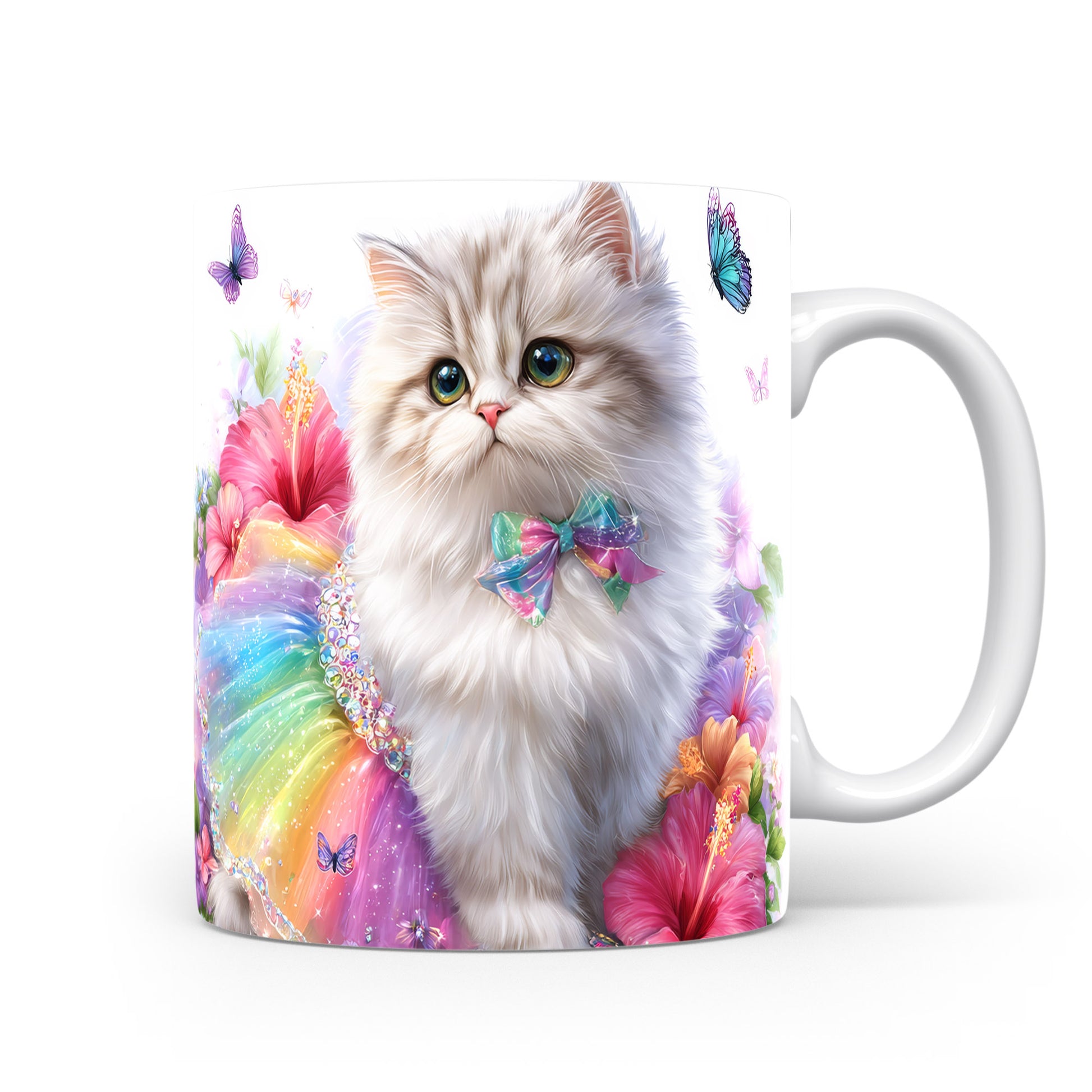 Tento hrnek zobrazuje roztomilou kočku s velkýma očima a barevnými květinami. Je ideální pro milovníky koček a všechny, kdo mají rádi hravé motivy. Skvělý tip na dárek pro přátele nebo rodinu. Materiál: keramika. Objem: 330 ml. Vhodné do myčky i mikrovlnky. Používání tohoto hrnku přináší radost a zábavu při každém doušku.