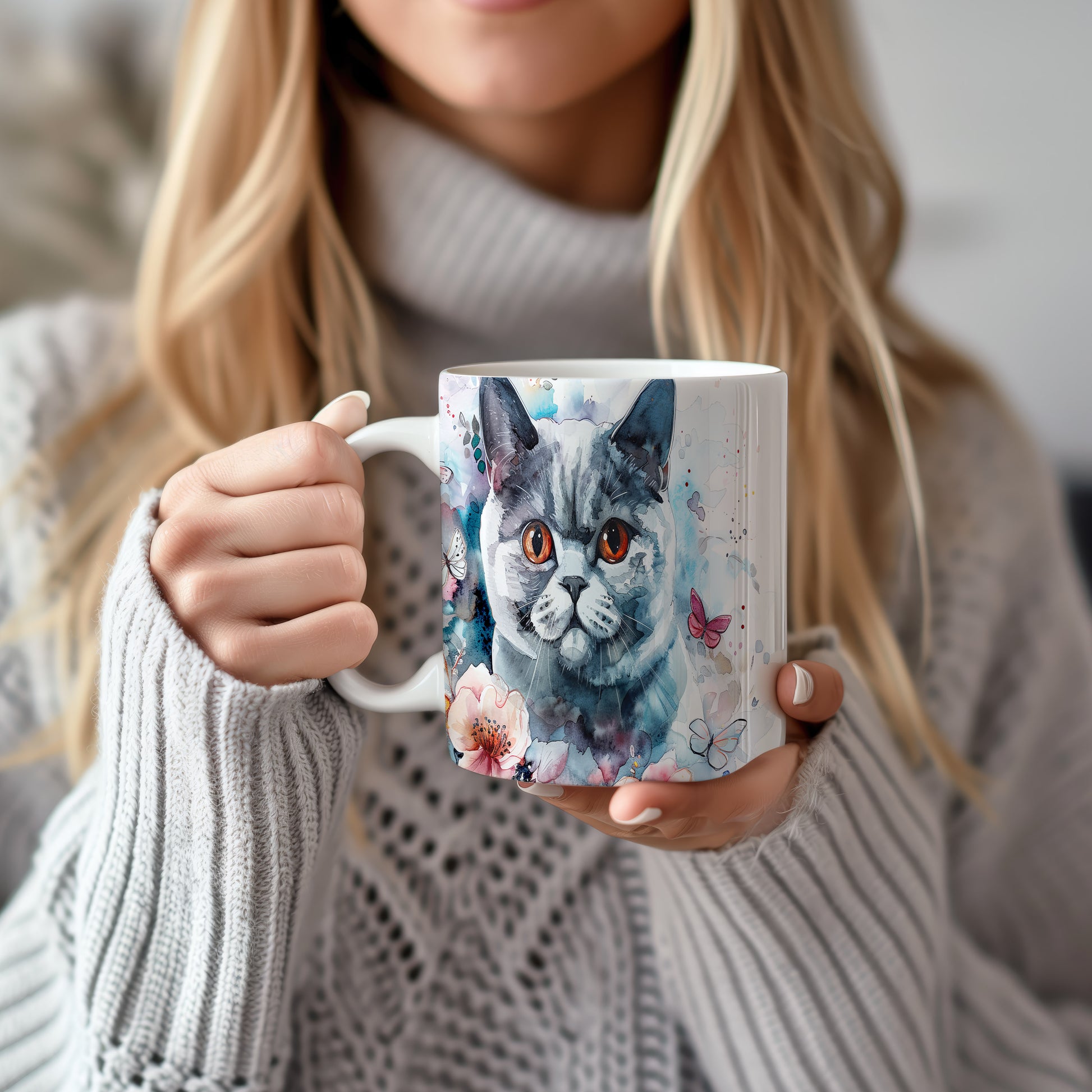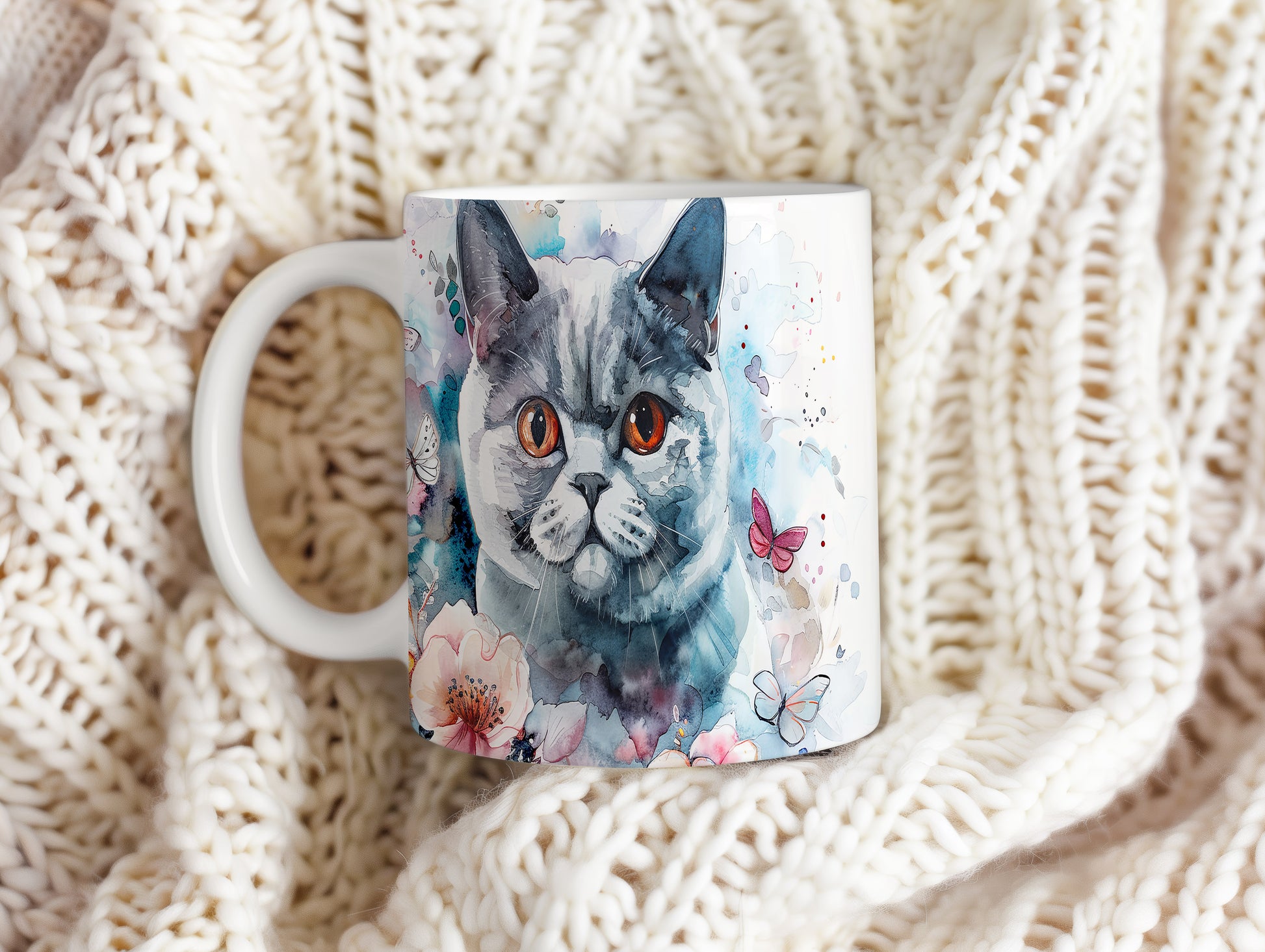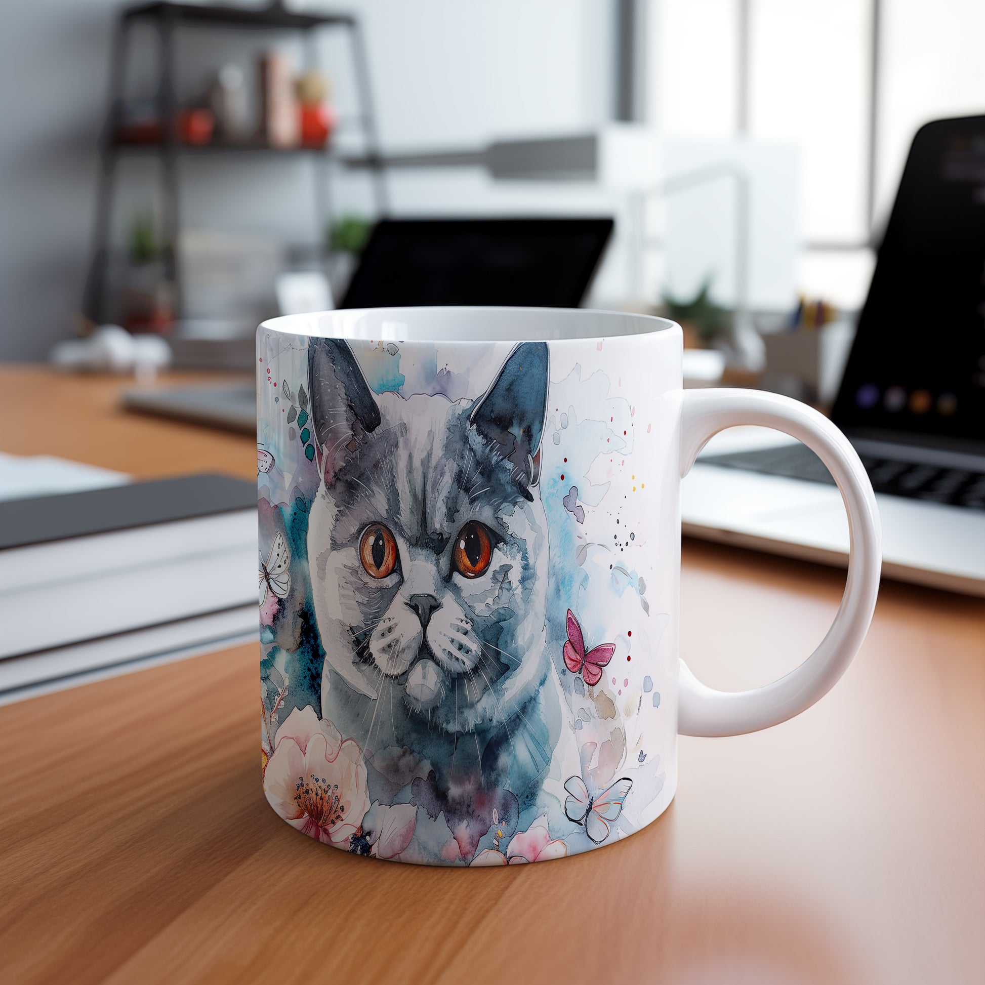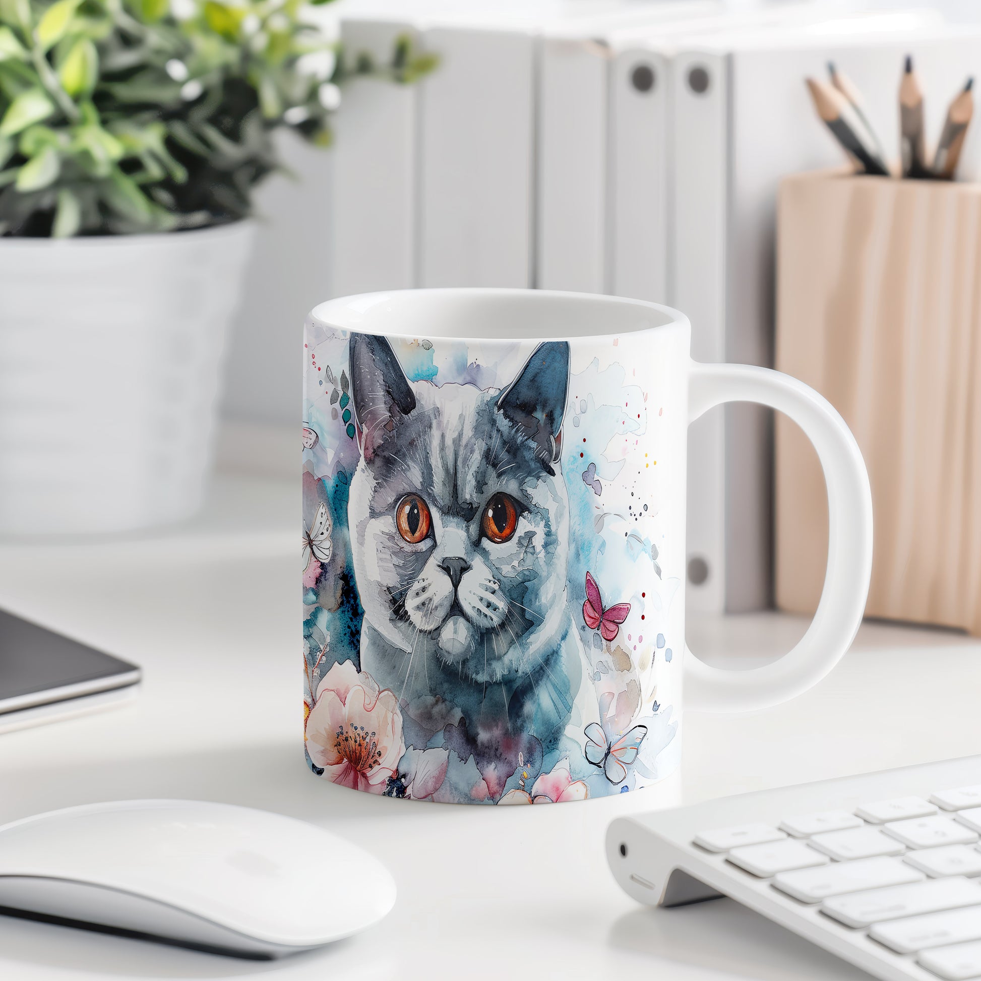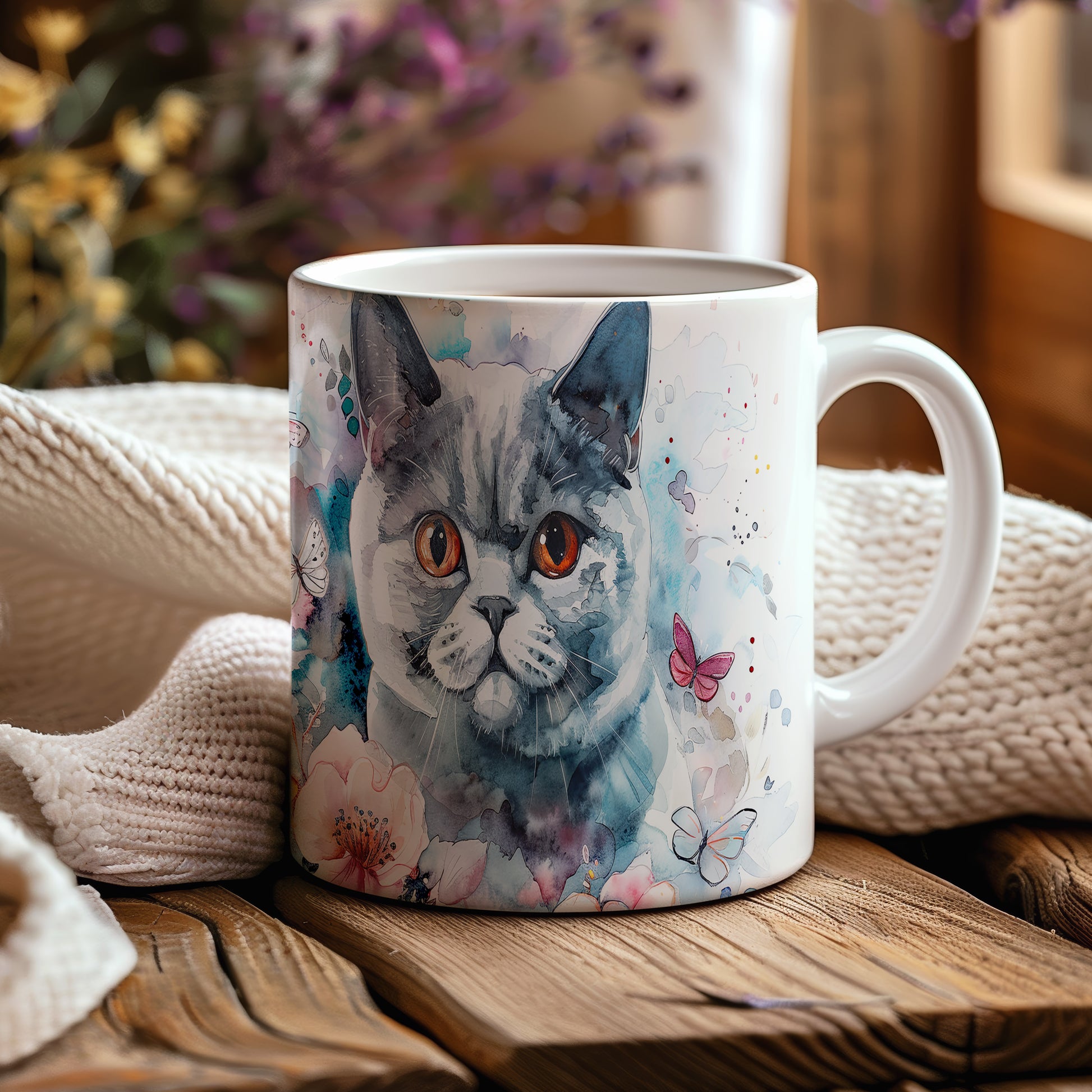 Tento hrnek zobrazuje roztomilou kočku s výraznýma oranžovýma očima a květinovými motivy. Je ideální pro milovníky koček a přírody, skvělý tip na dárek pro přátele nebo rodinu. Materiál: keramika. Objem: 330 ml. Vhodné do myčky i mikrovlnky. Při každém doušku vám přinese radost a útulnost.