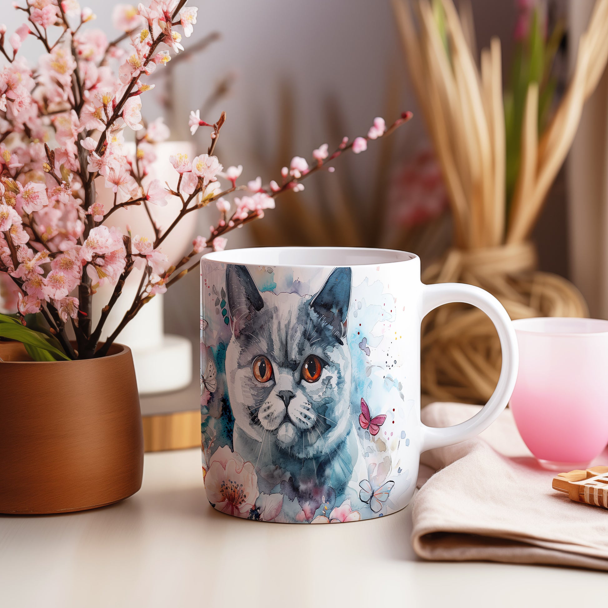 Hrnek s roztomilou kočkou a květinami – dárkovým tipem