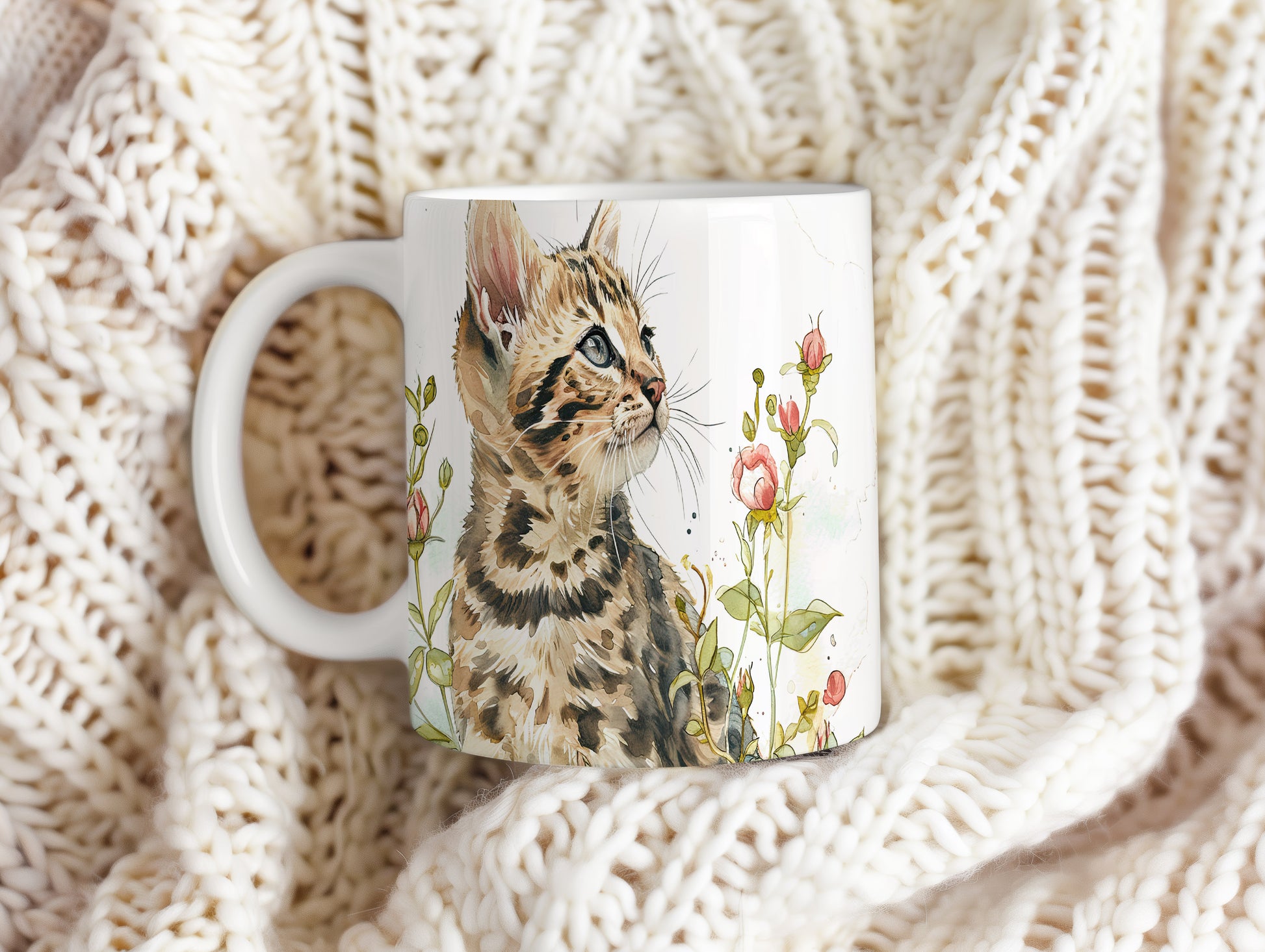 Hrnek s roztomilou kočkou a květinami – malířským vzhledem