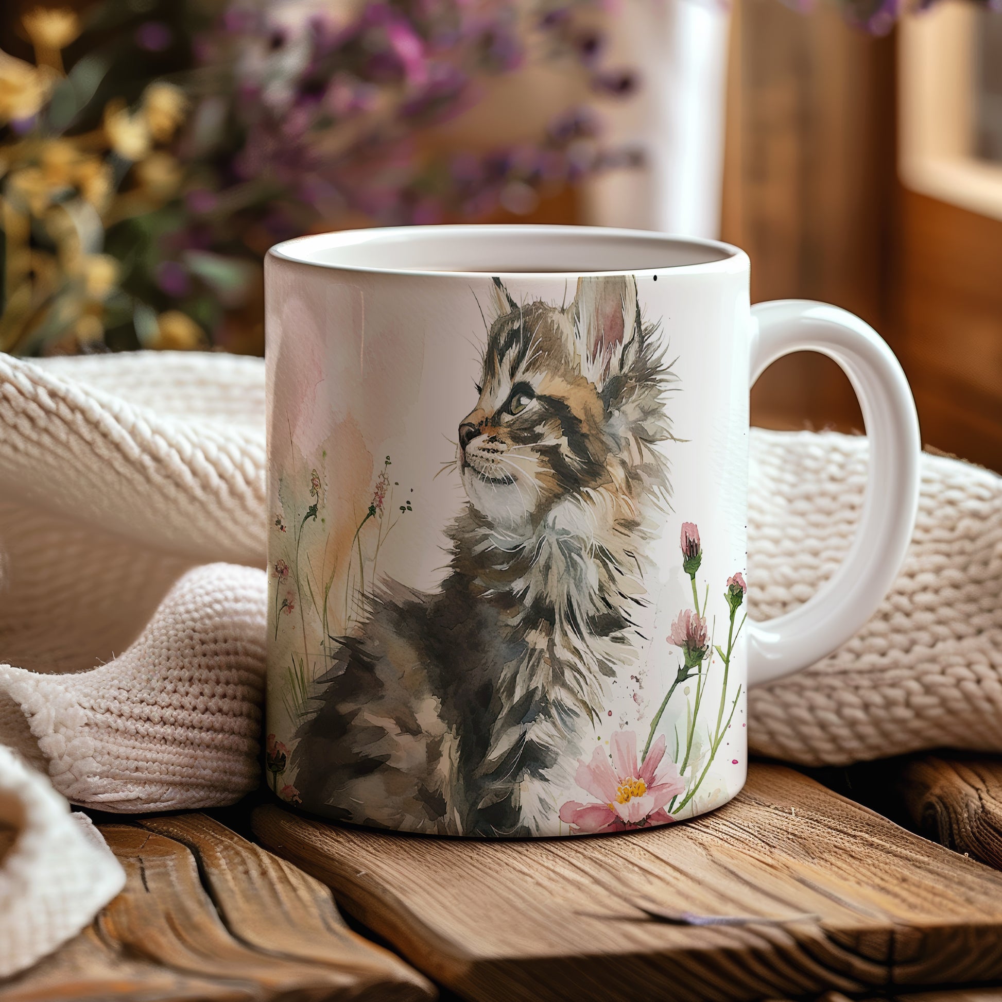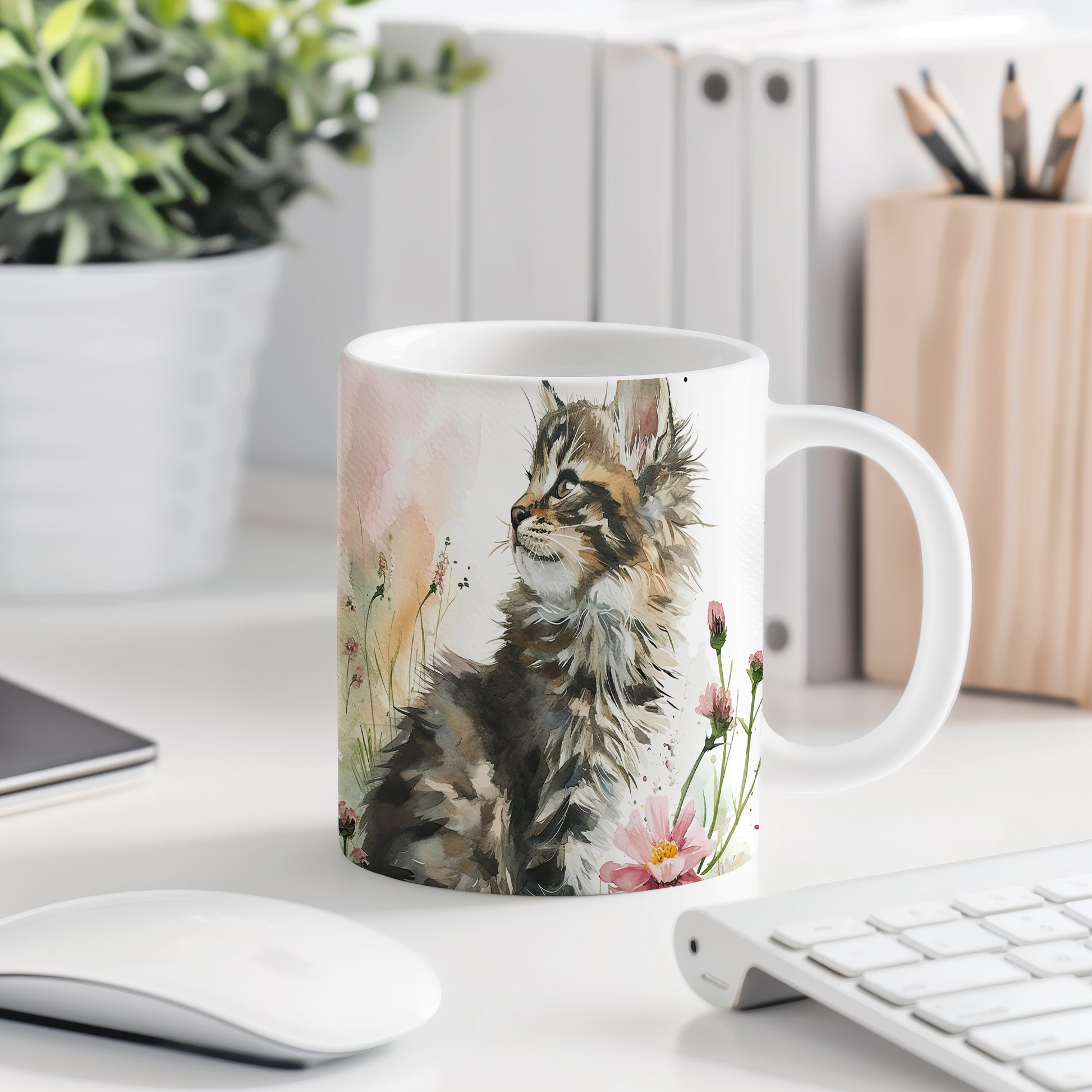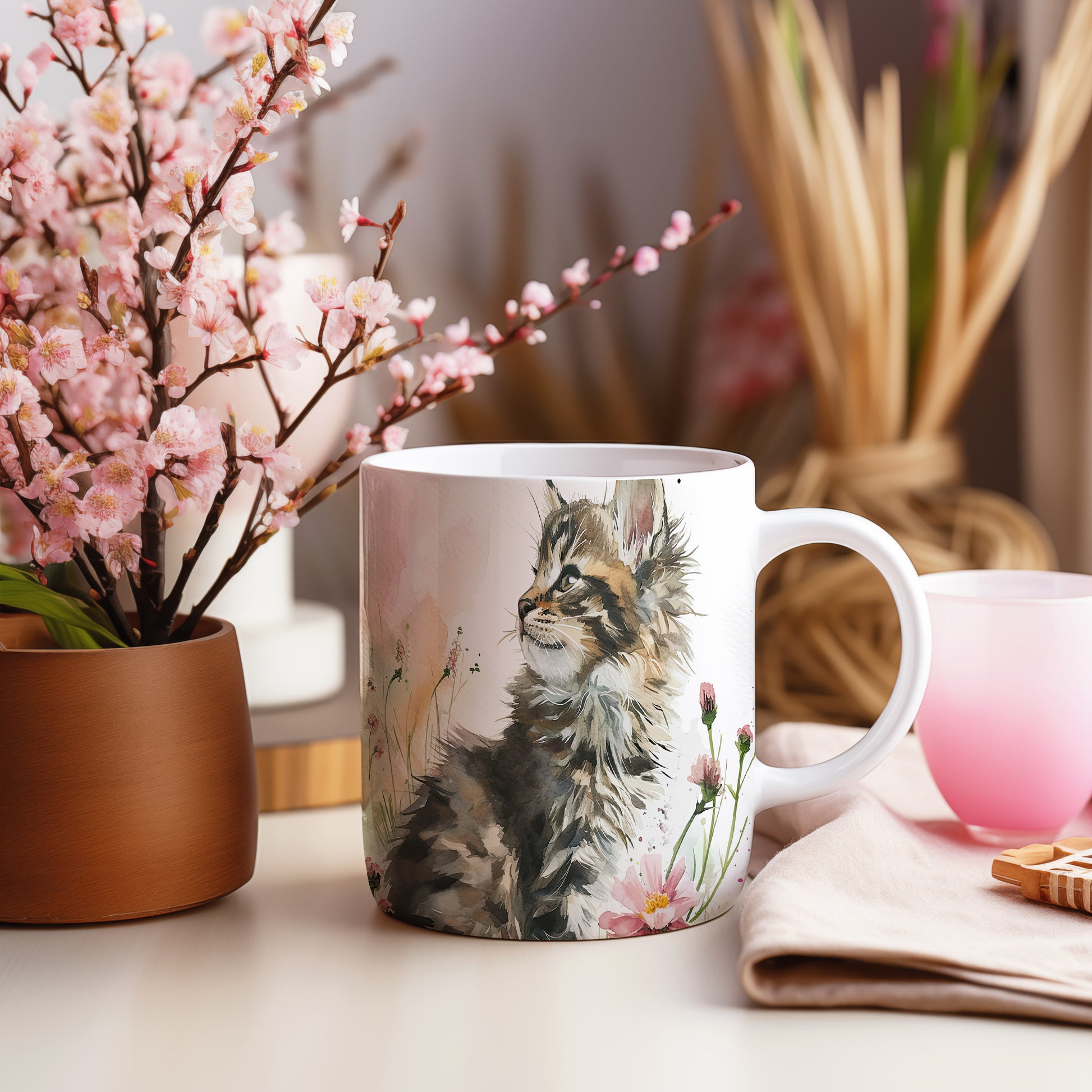 Hrnek s roztomilou kočkou a květinovým akvarelem