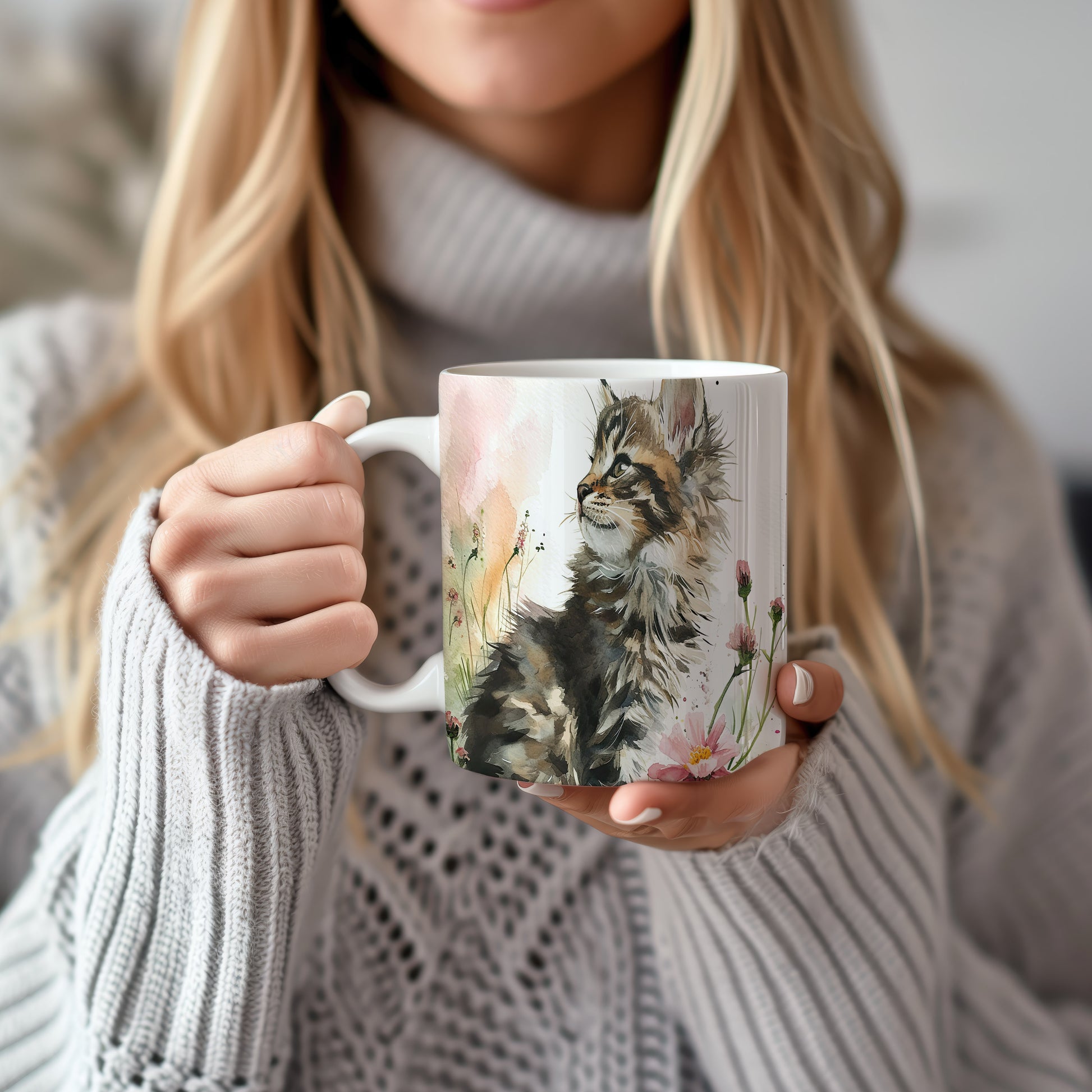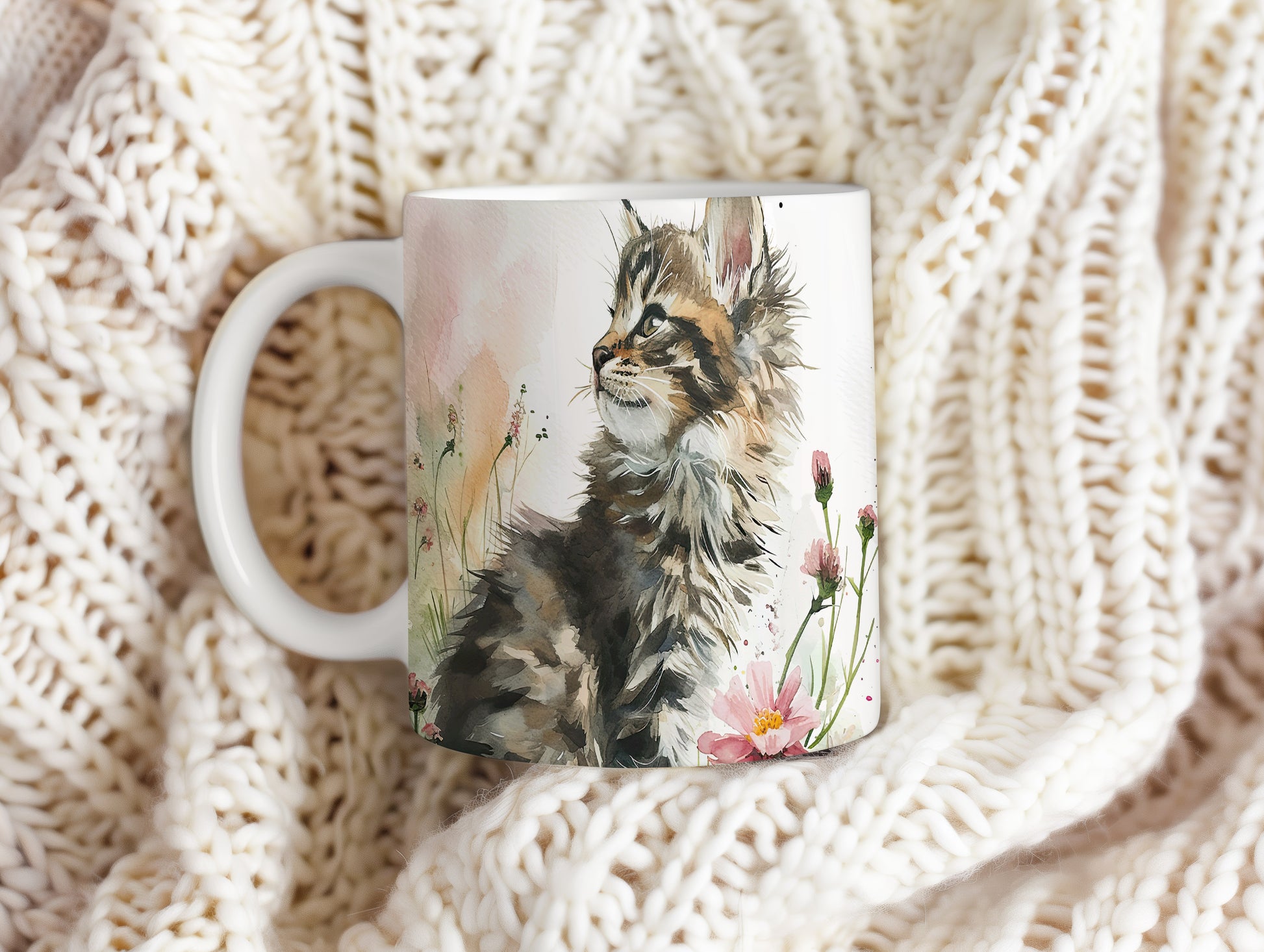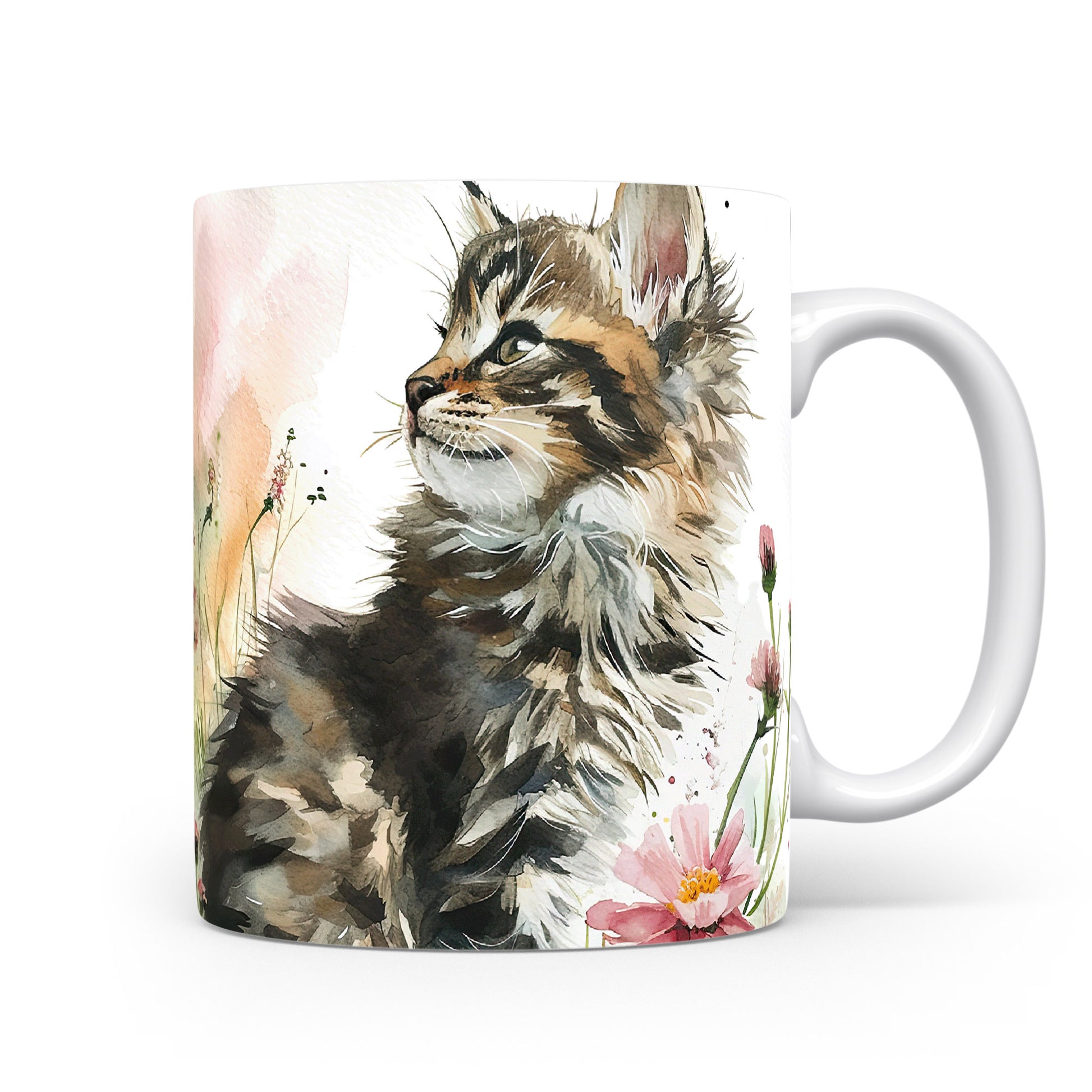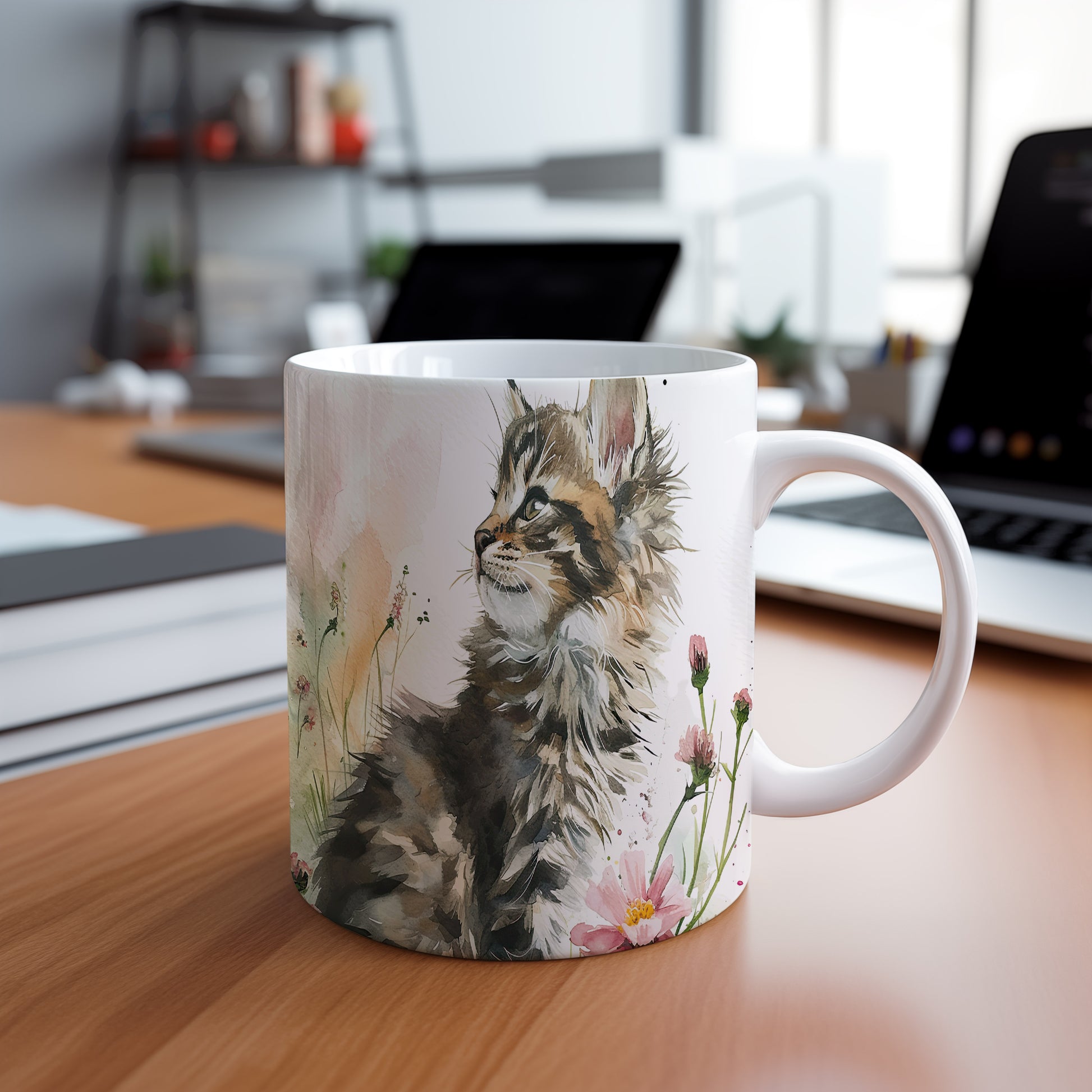 Hrnek s roztomilou kočkou a květinovým akvarelem