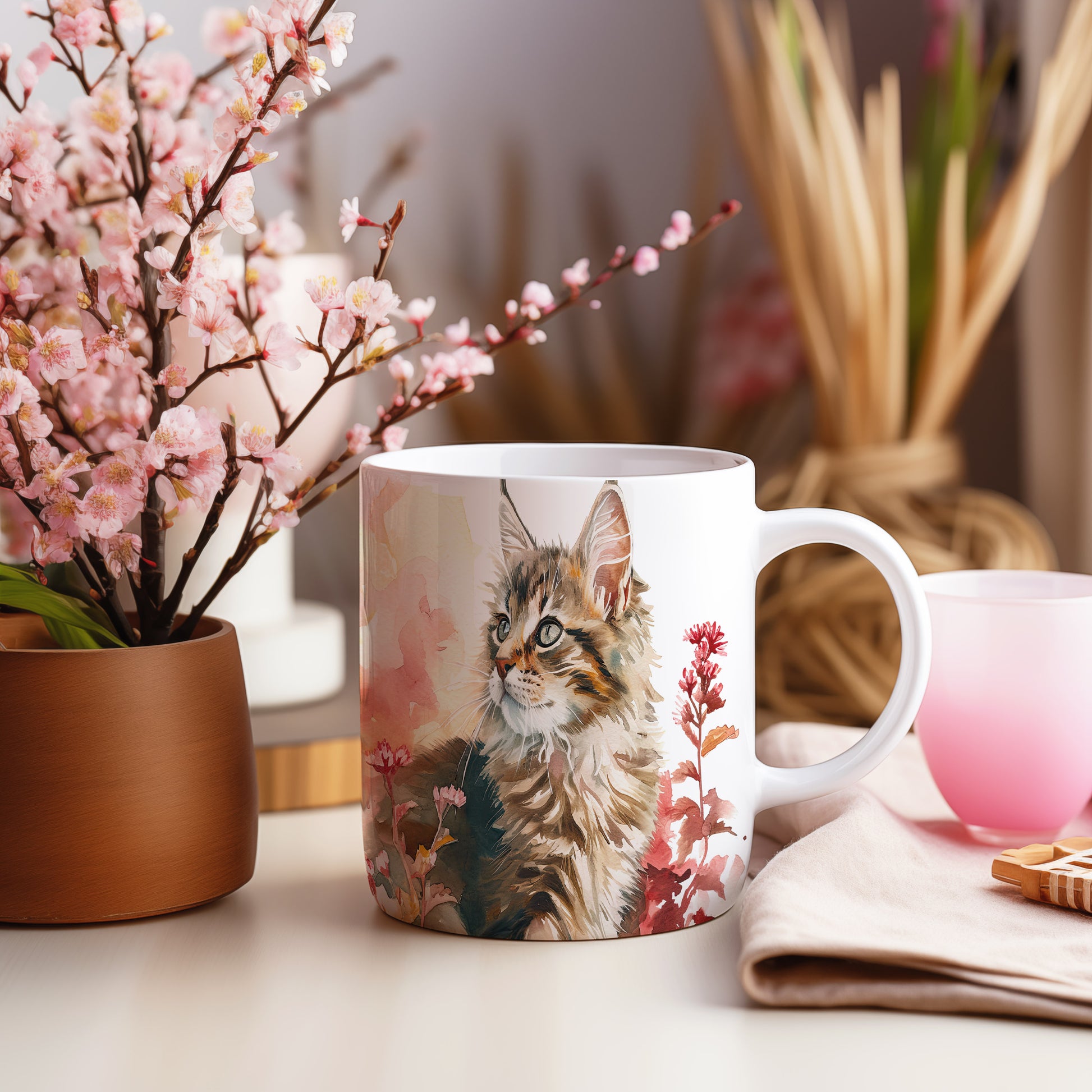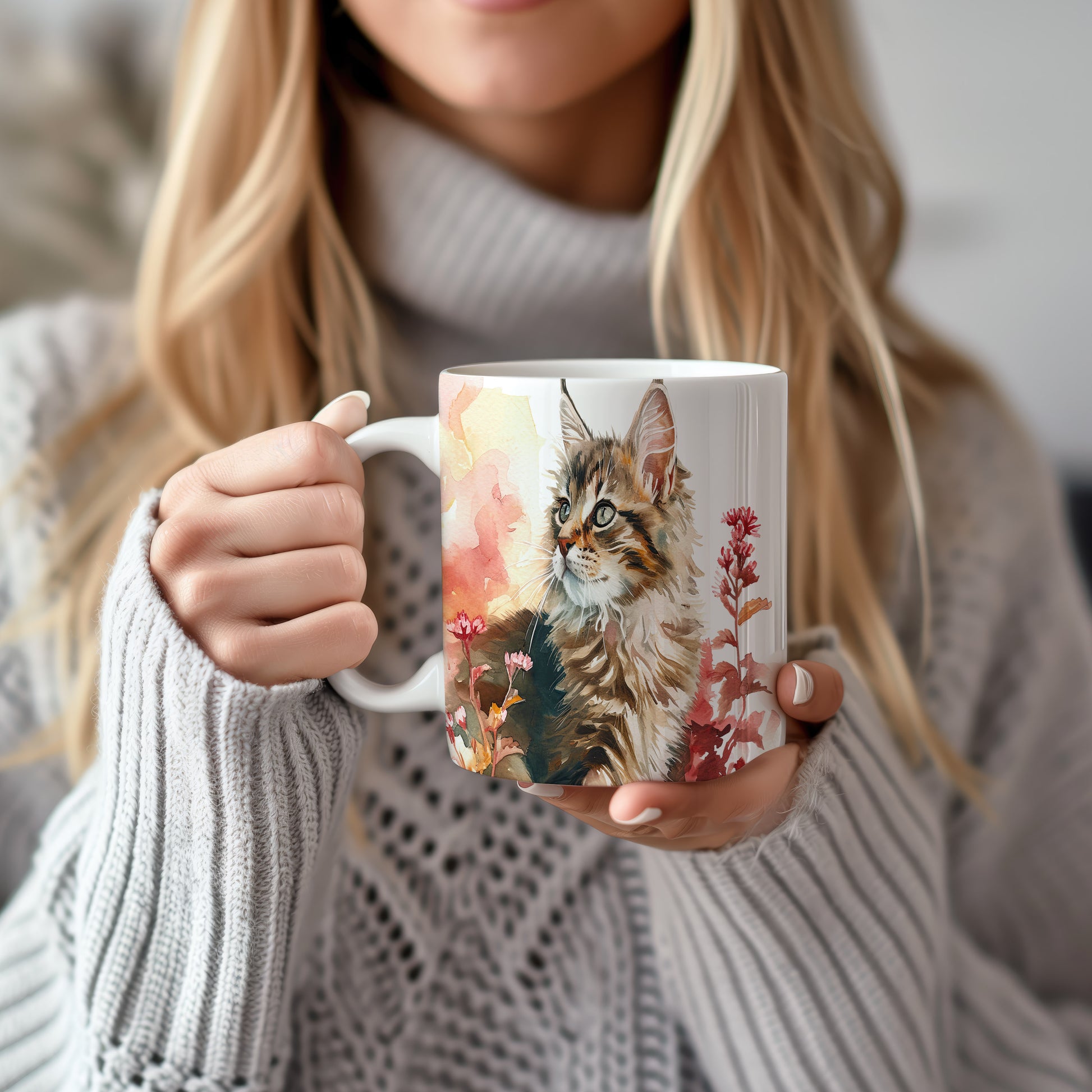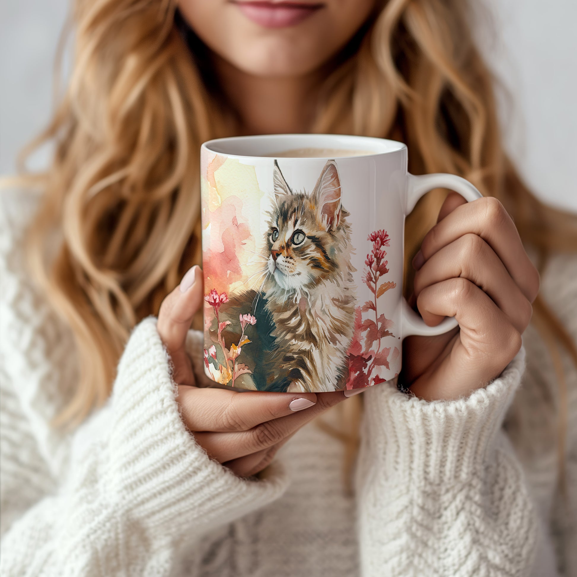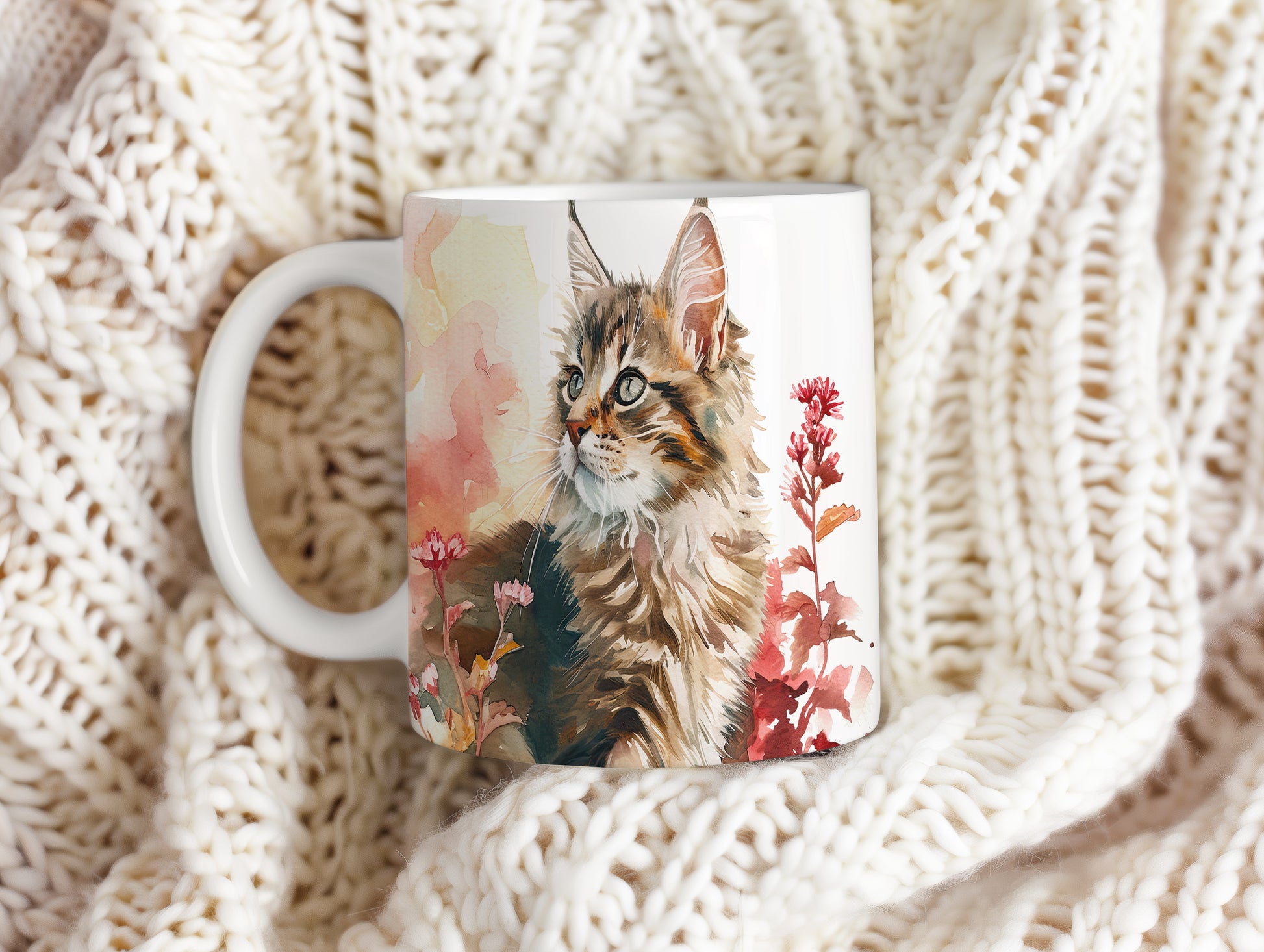Hrnek s roztomilou kočkou a květinovým akvarelem v hnědých tónech