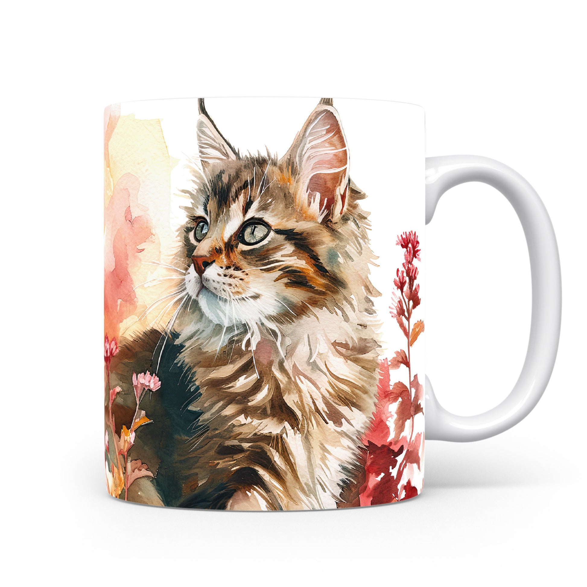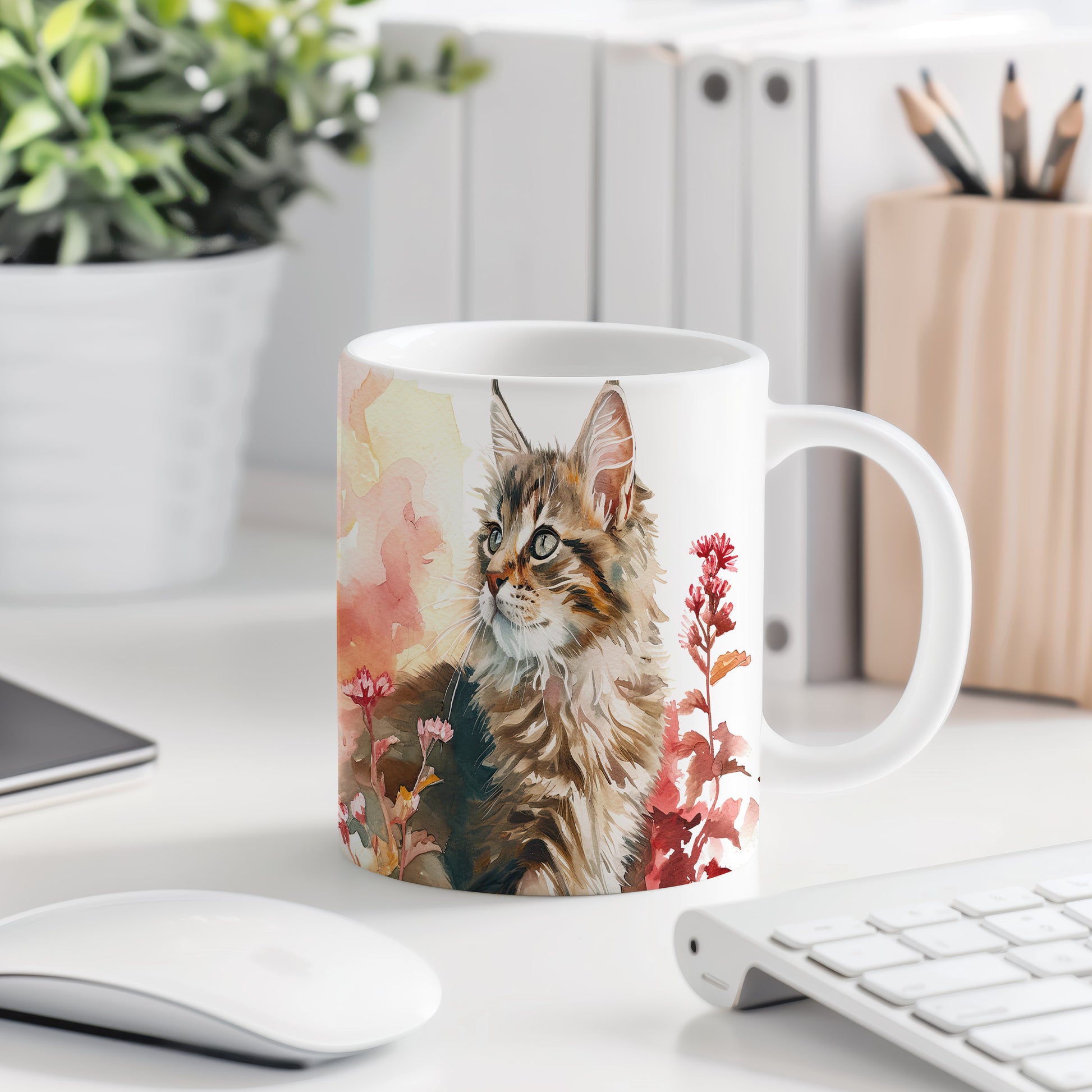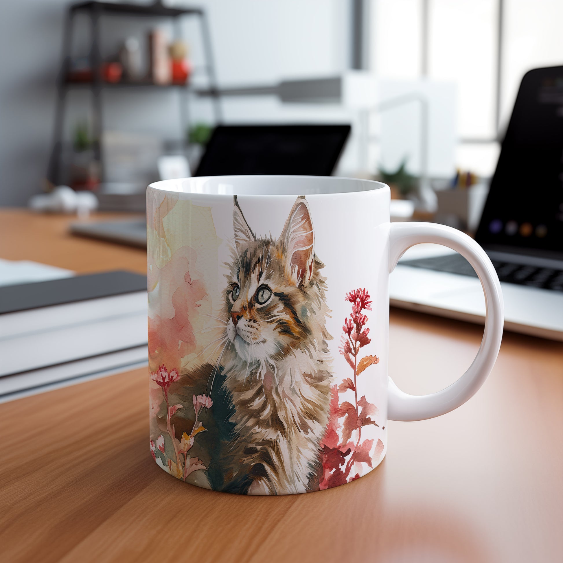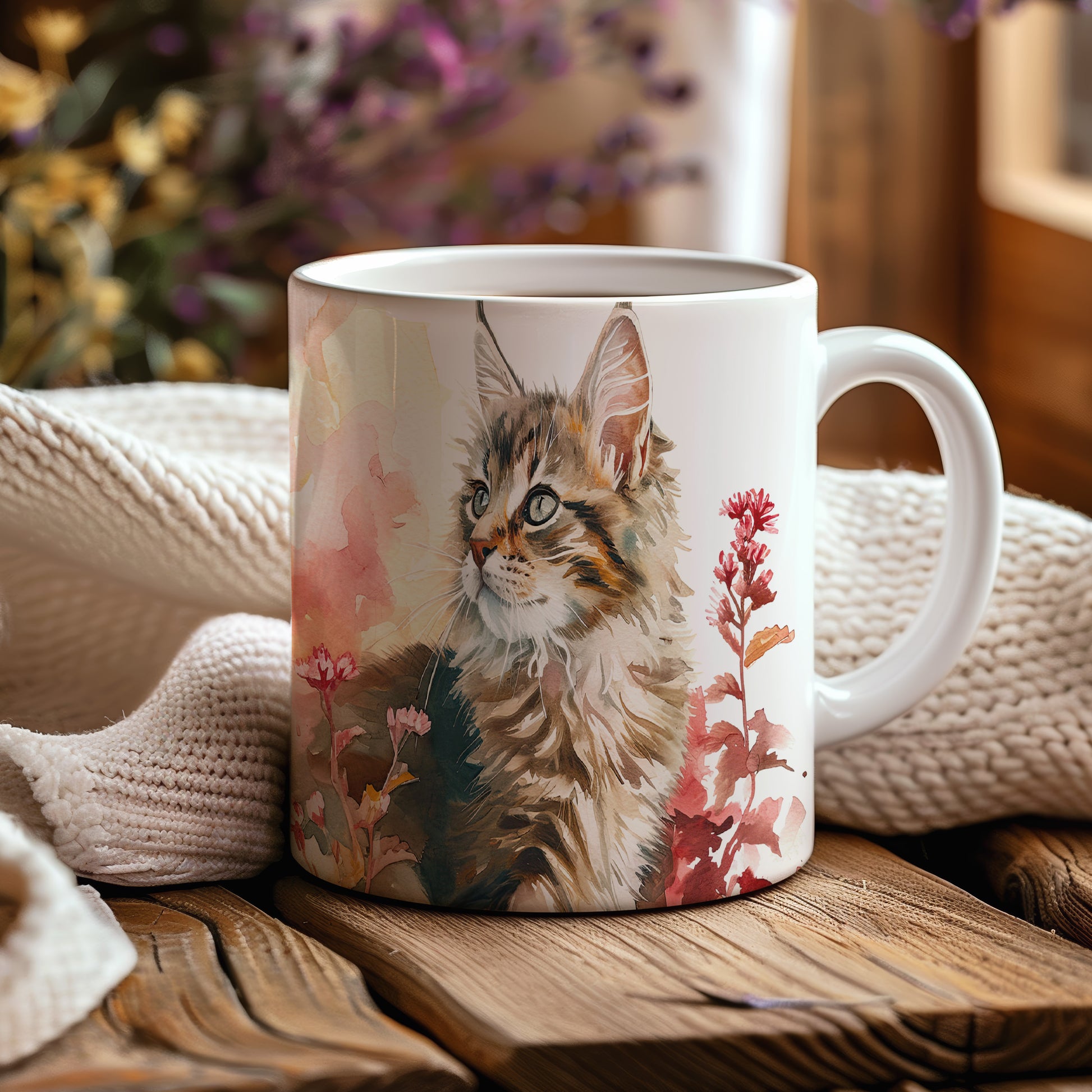 Hrnek s roztomilou kočkou a květinovým akvarelem v hnědých tónech