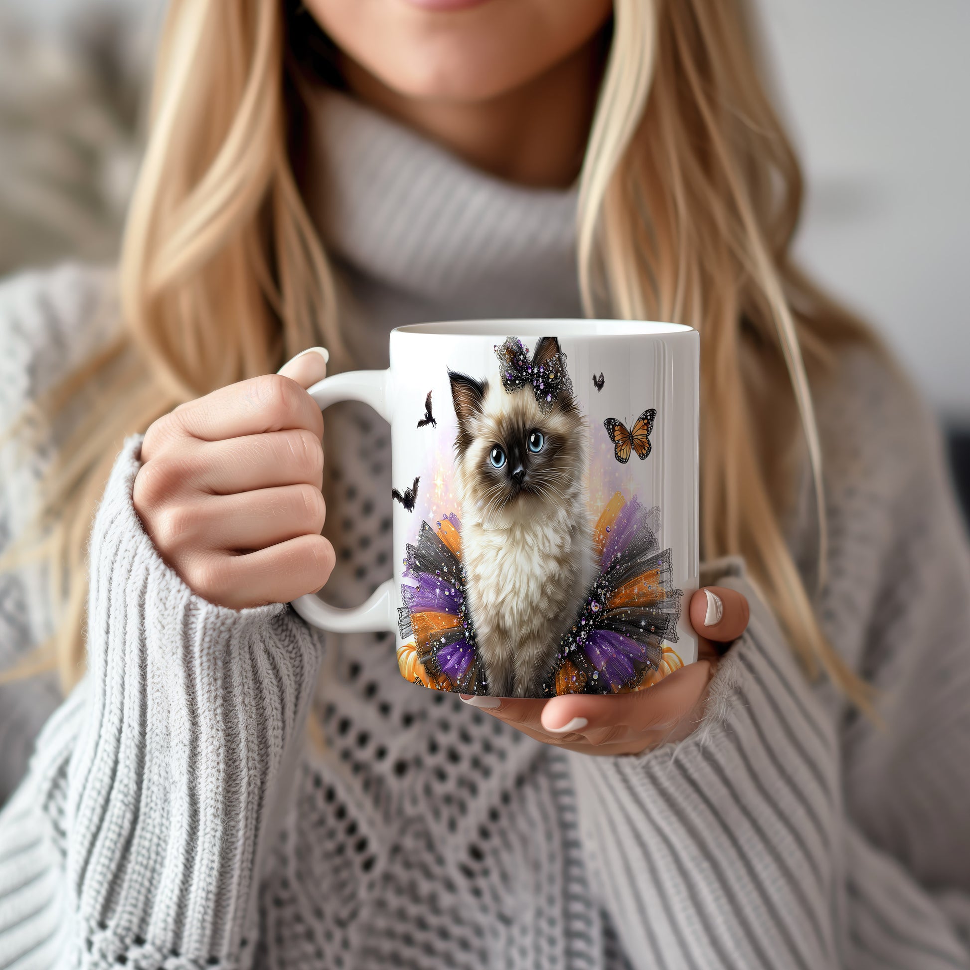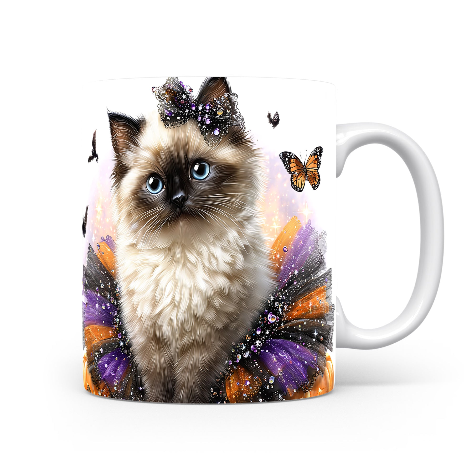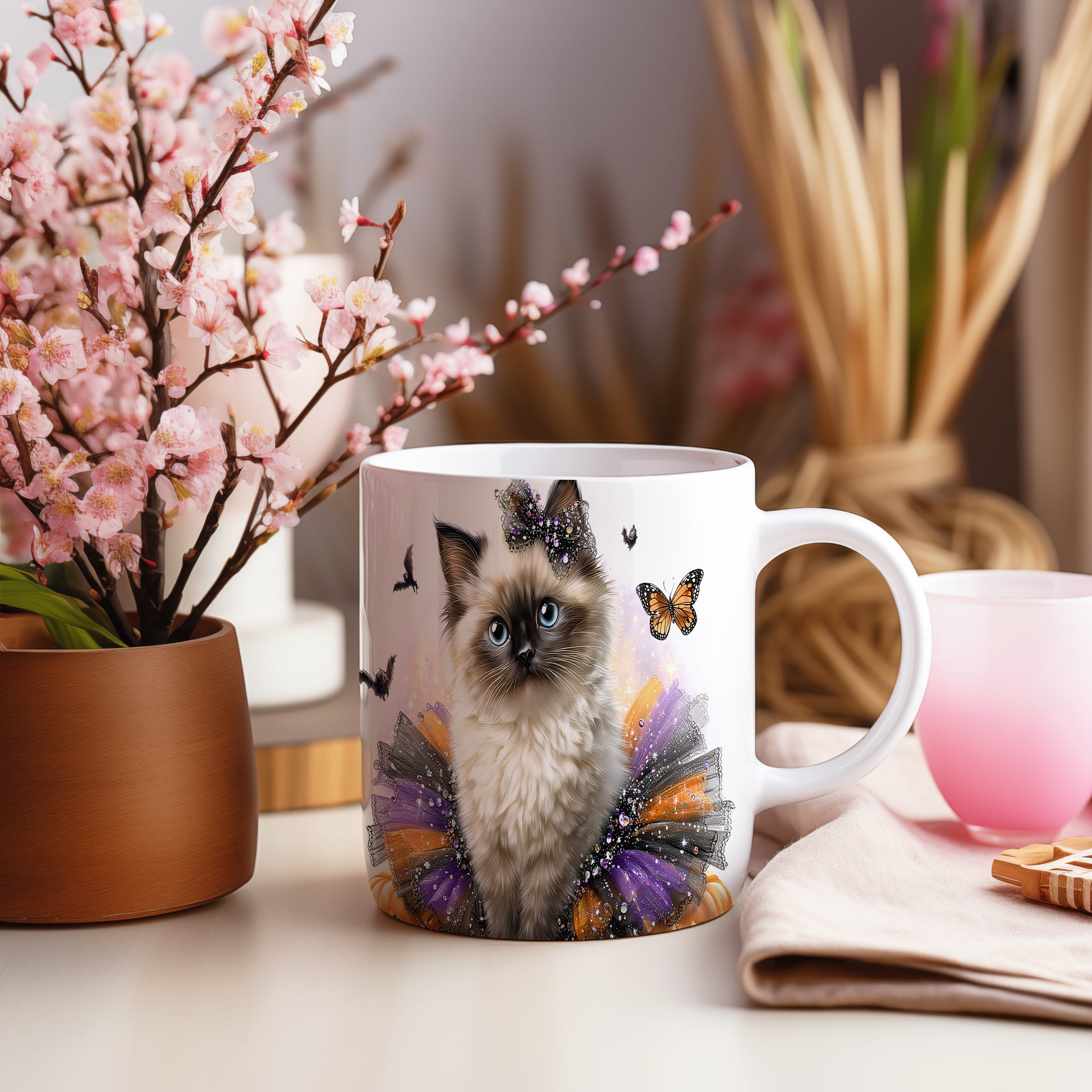 Tento hrnek zobrazuje roztomilou kočku s mašlí a barevnými motýlky. Je ideální pro milovníky koček a skvělým dárkem pro přátele nebo rodinu. Materiál: keramika. Objem: 330 ml. Vhodné do myčky i mikrovlnky. Používání tohoto hrnku přináší radost a zábavu při každém doušku.