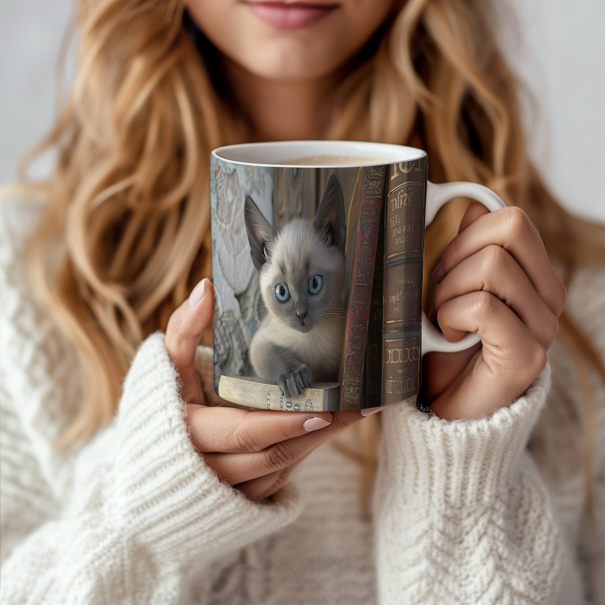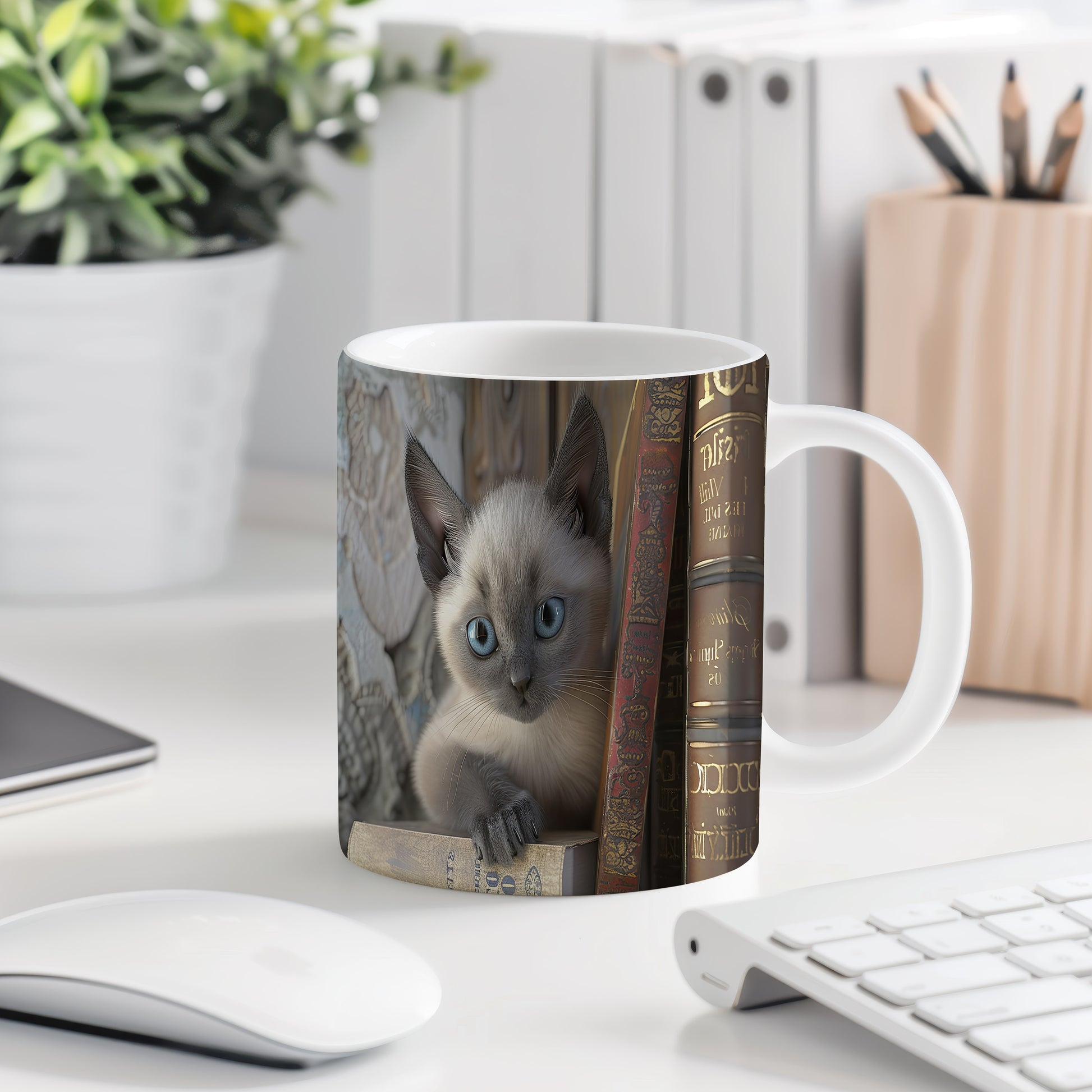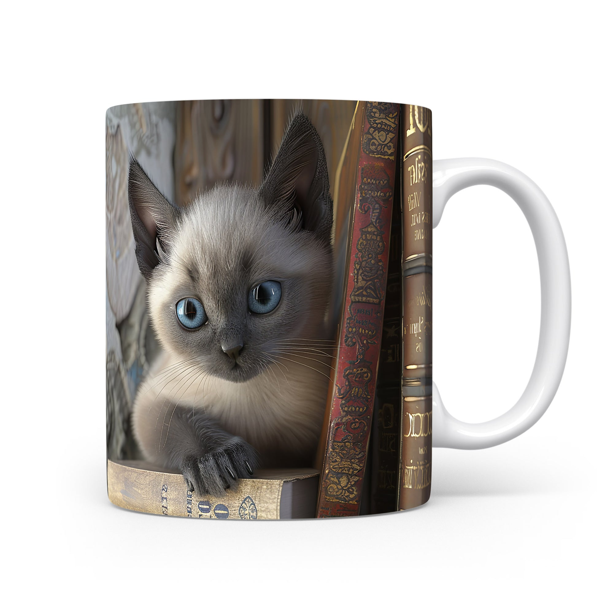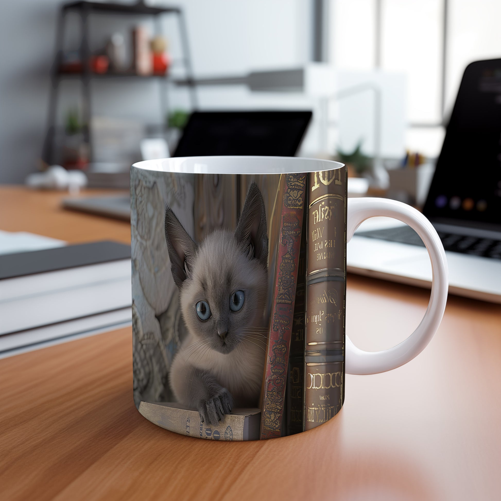 Tento keramický hrnek s realistickou ilustrací roztomilé kočky mezi knihami je ideální pro všechny milovníky koček a literatury. Skvělý tip na dárek pro přátele nebo rodinu, kteří si rádi vychutnávají kávu nebo čaj při čtení. Materiál: keramika. Objem: 330 ml. Vhodné do myčky i mikrovlnky. Užívejte si chvíle pohody s tímto stylovým hrnkem.