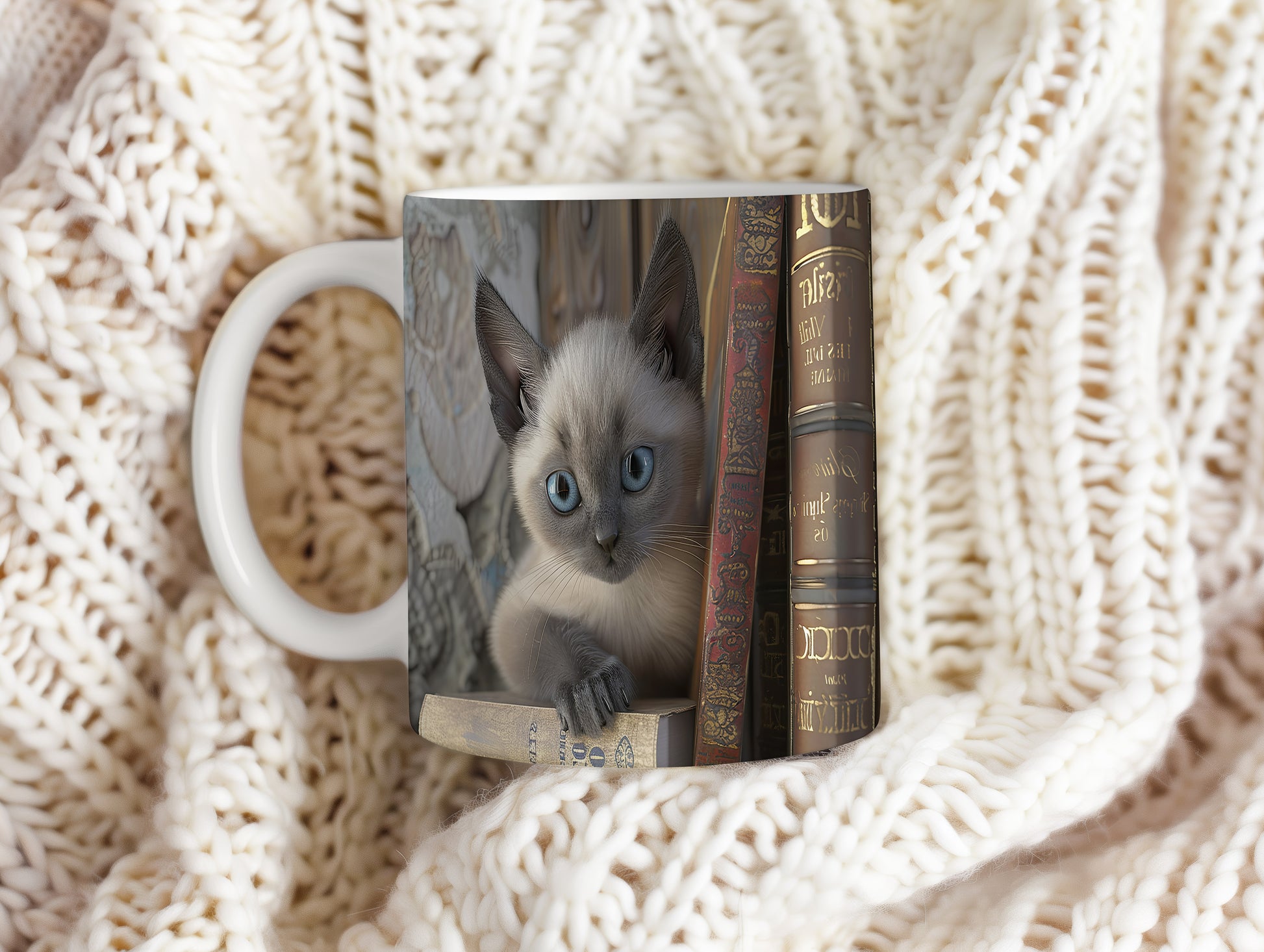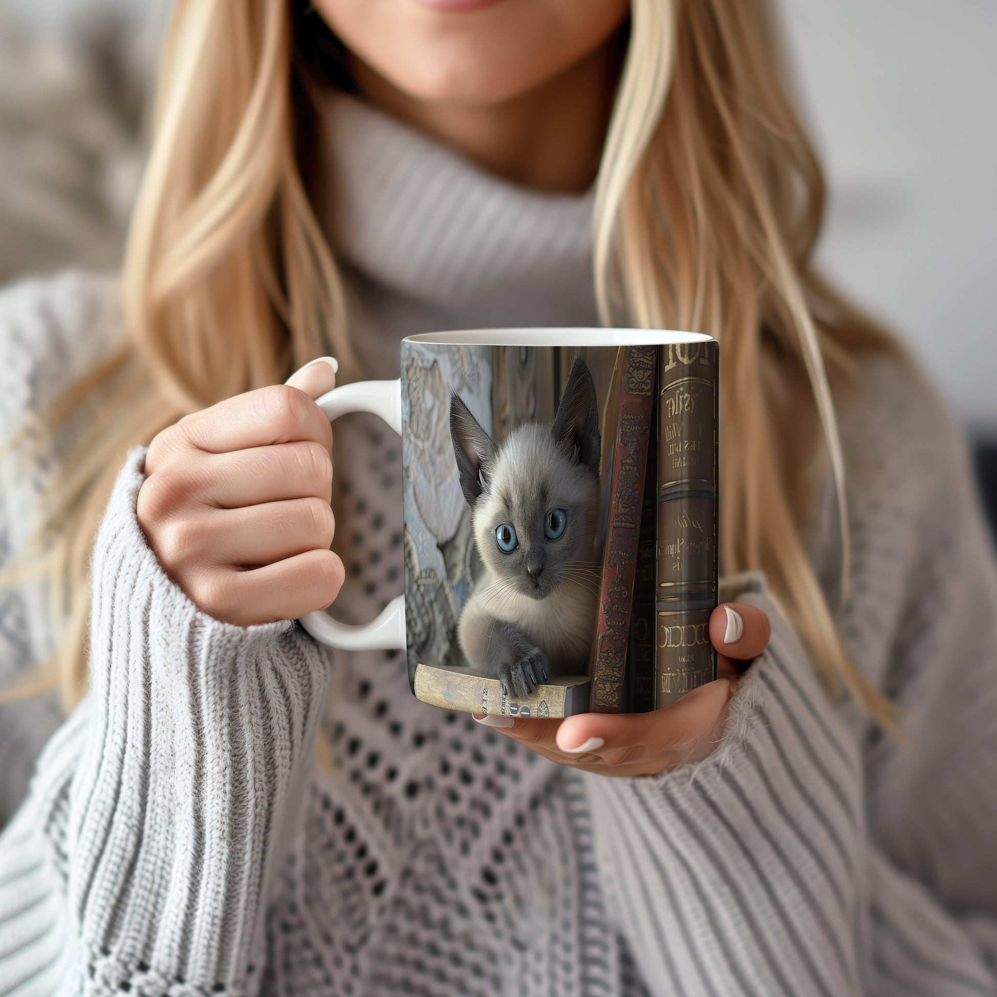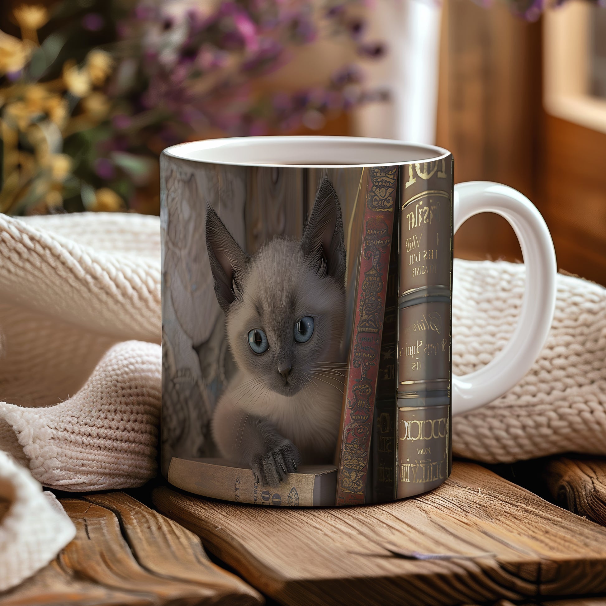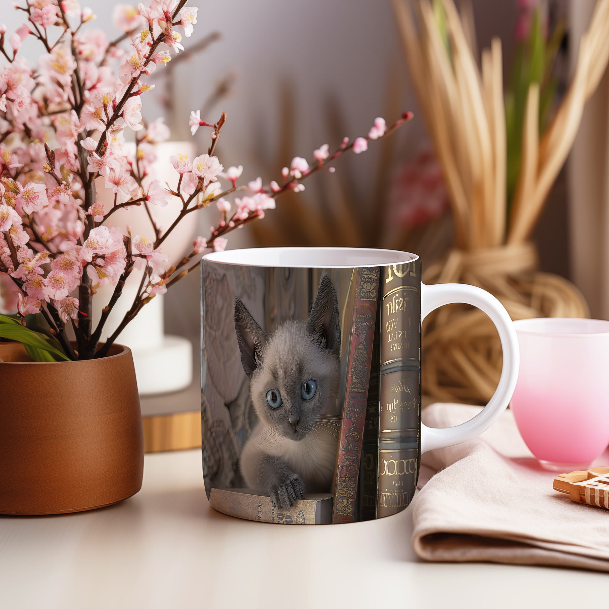 Tento keramický hrnek s realistickou ilustrací roztomilé kočky mezi knihami je ideální pro všechny milovníky koček a literatury. Skvělý tip na dárek pro přátele nebo rodinu, kteří si rádi vychutnávají kávu nebo čaj při čtení. Materiál: keramika. Objem: 330 ml. Vhodné do myčky i mikrovlnky. Užívejte si chvíle pohody s tímto stylovým hrnkem.