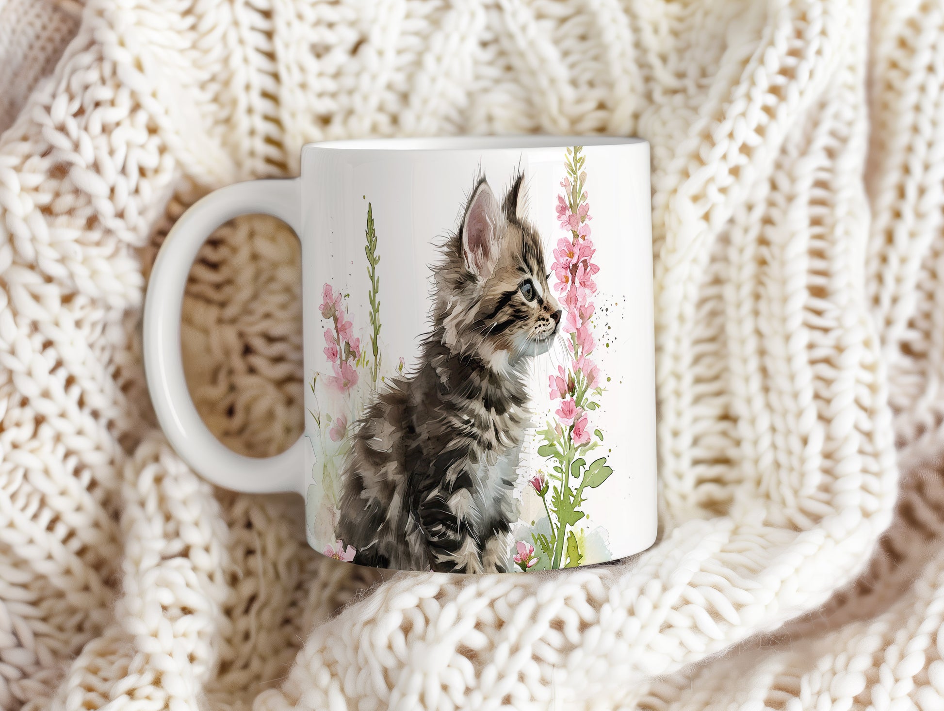 Hrnek s roztomilou kočkou mezi květinami – černým akcentem