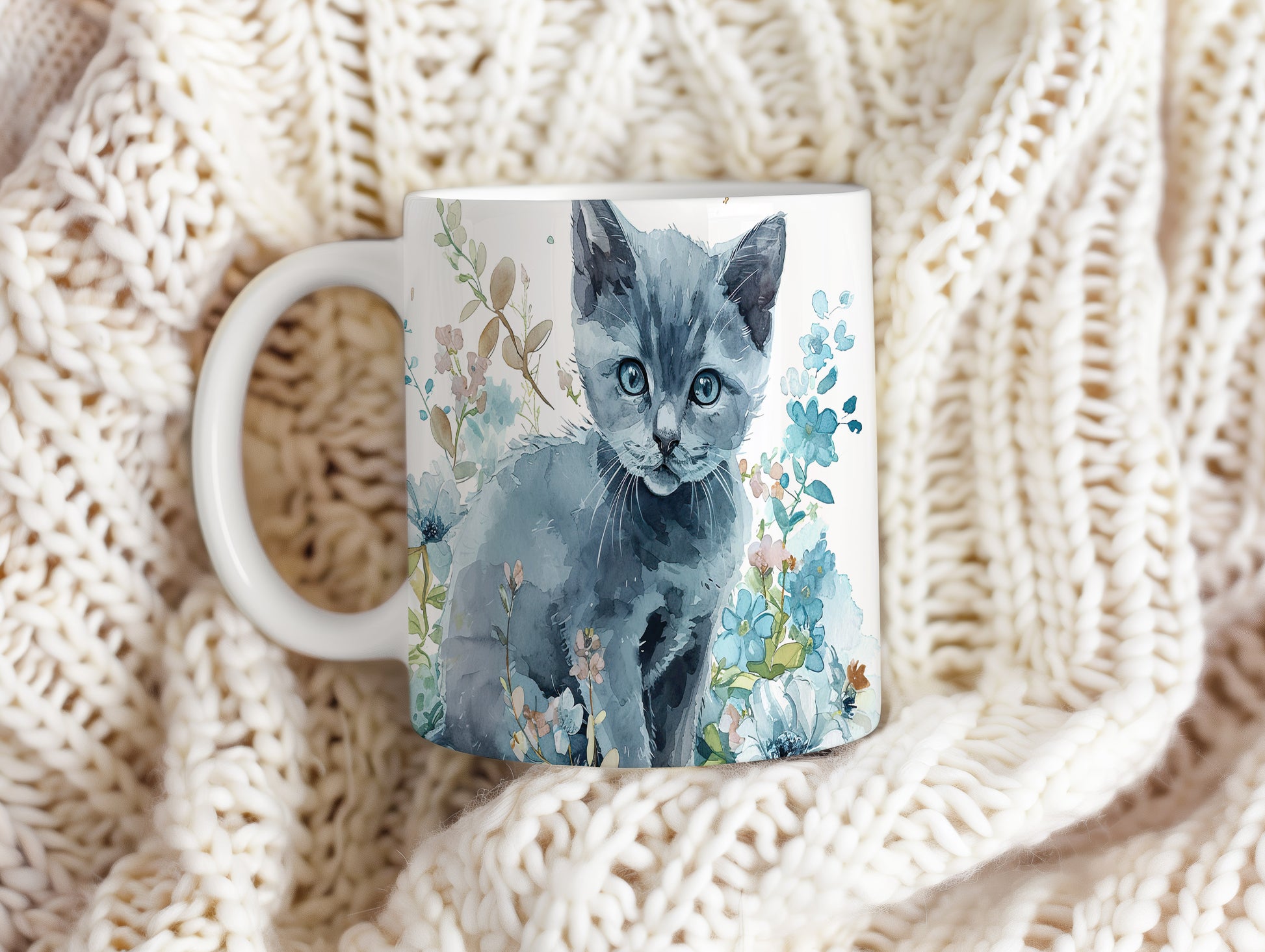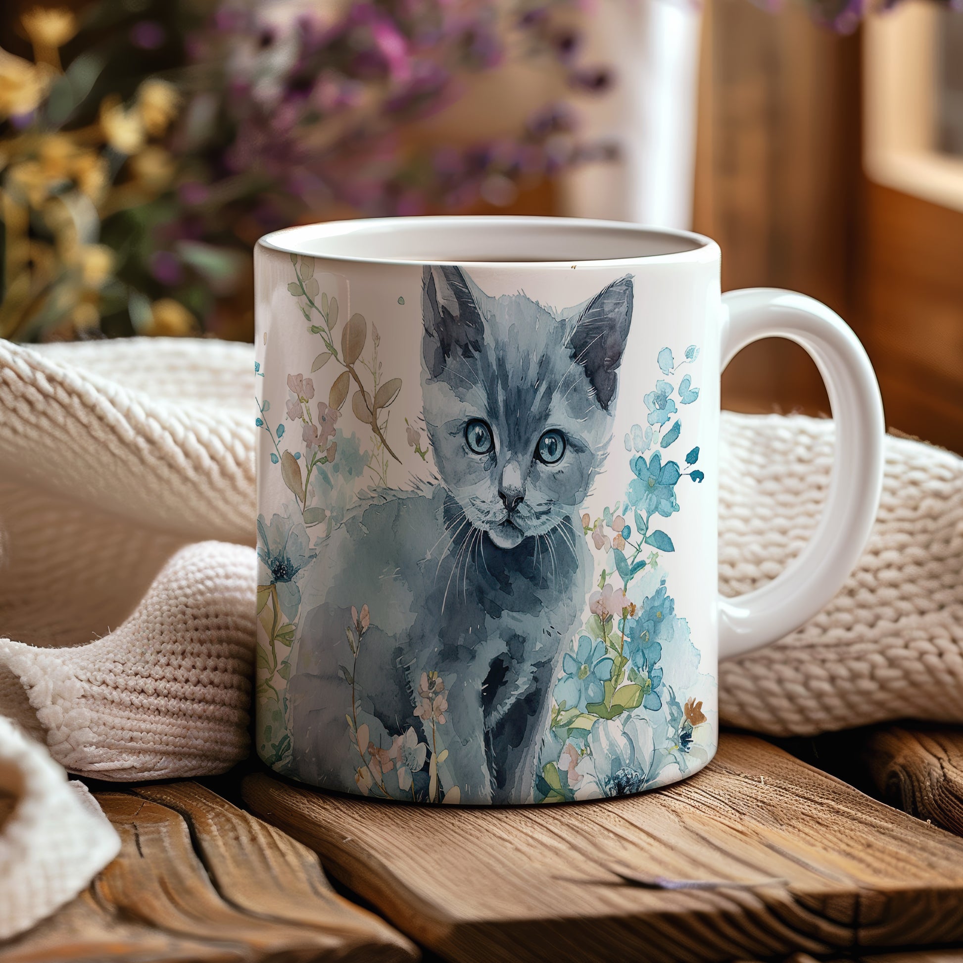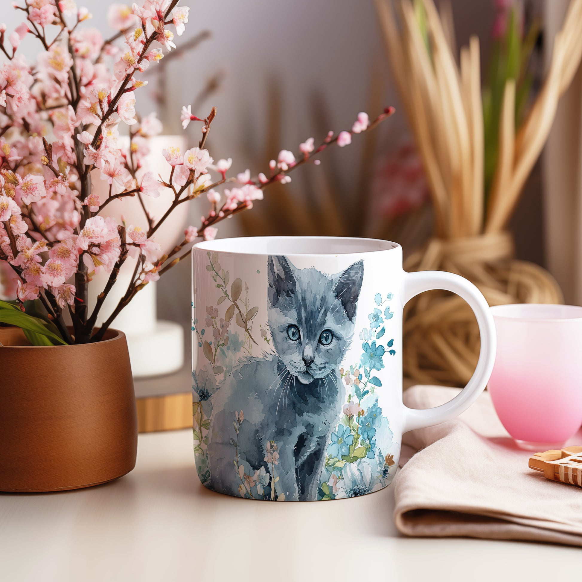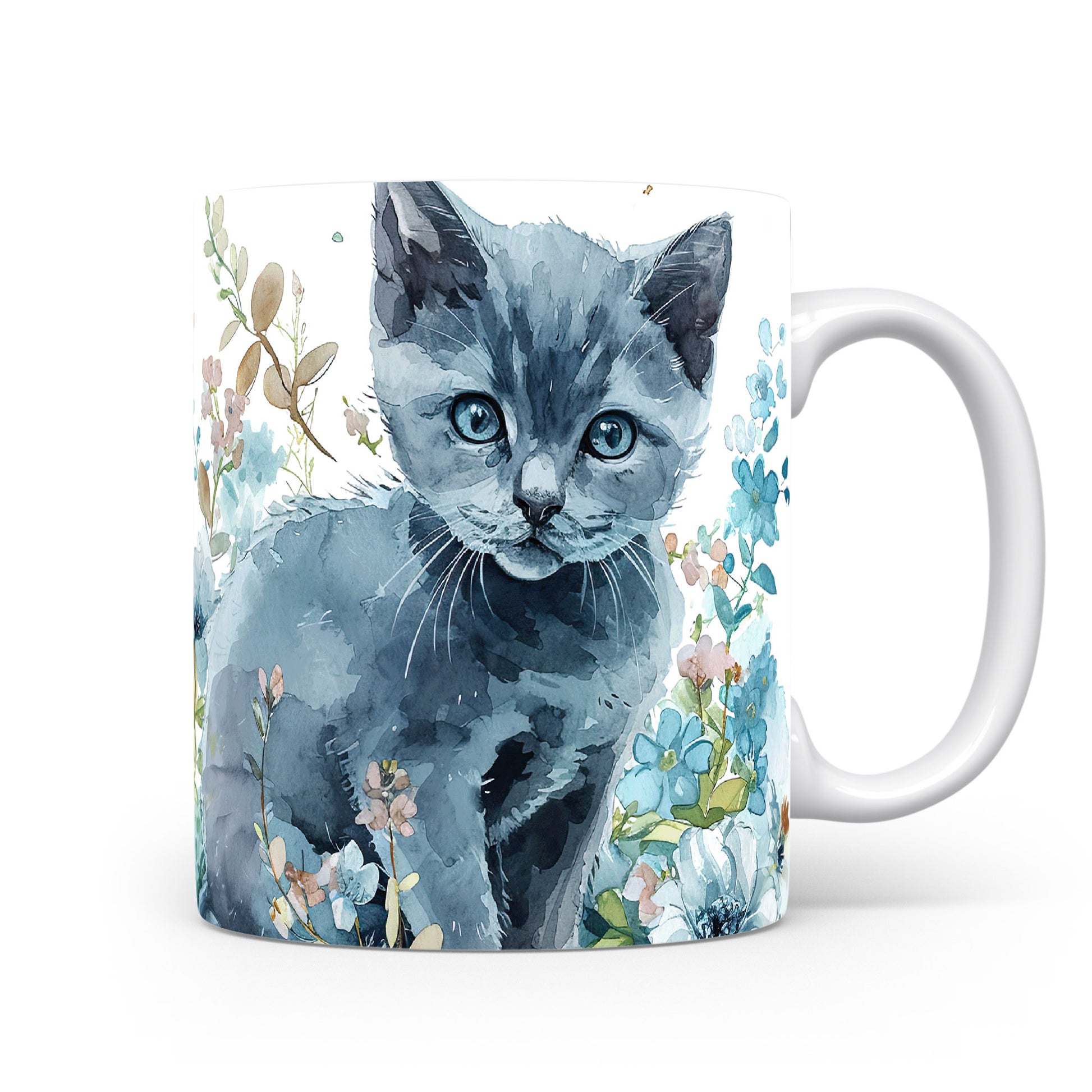 Hrnek s roztomilou kočkou mezi květinami – modrými detaily